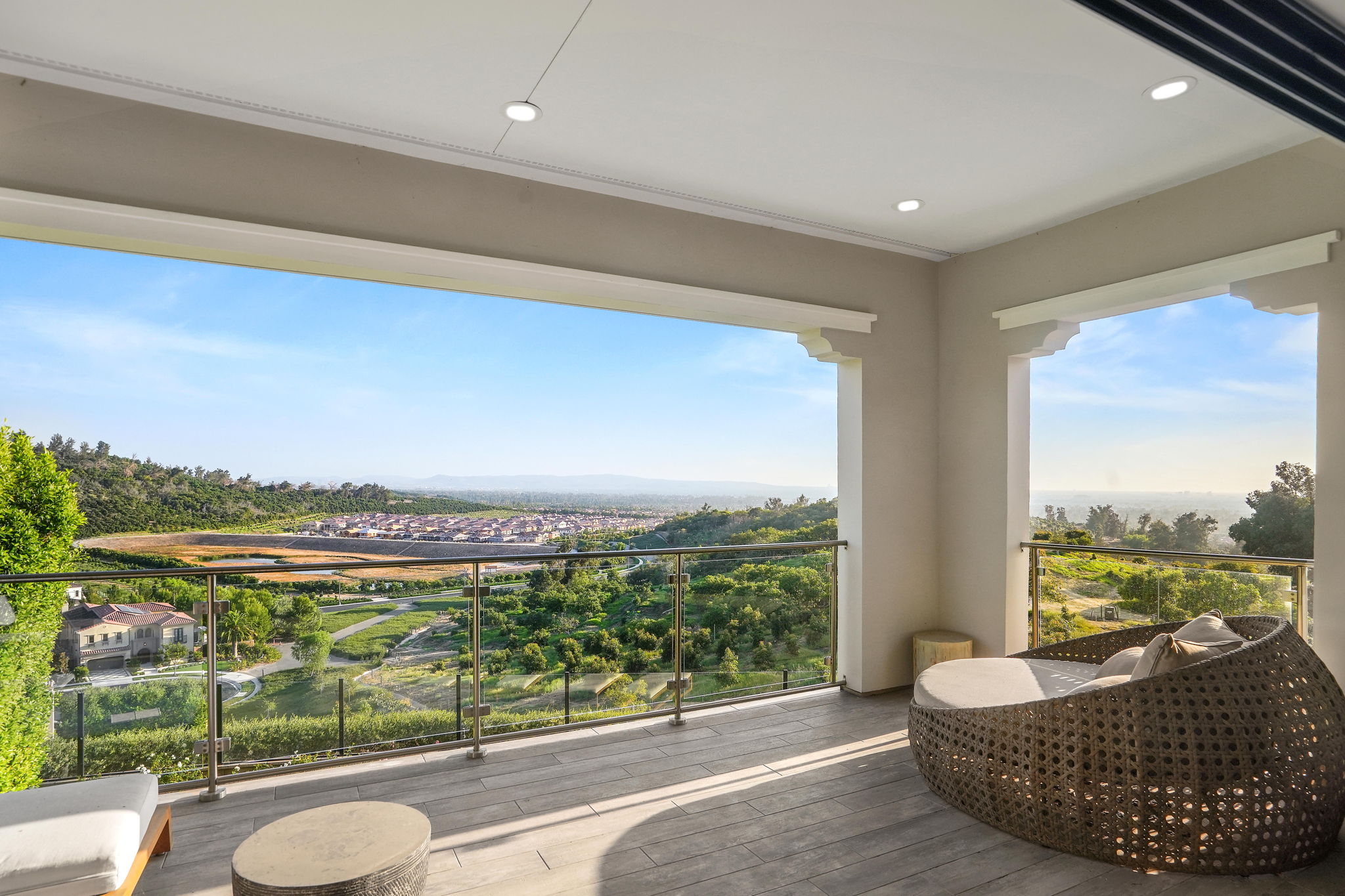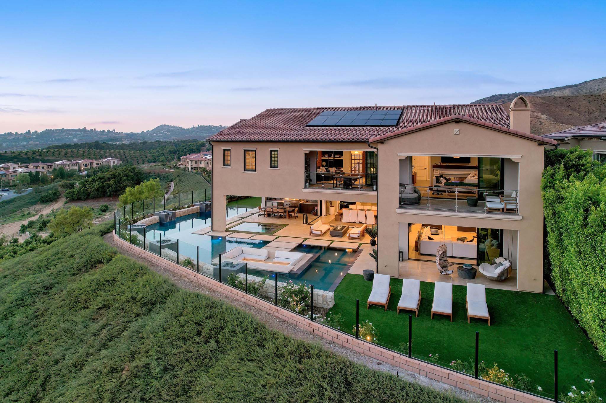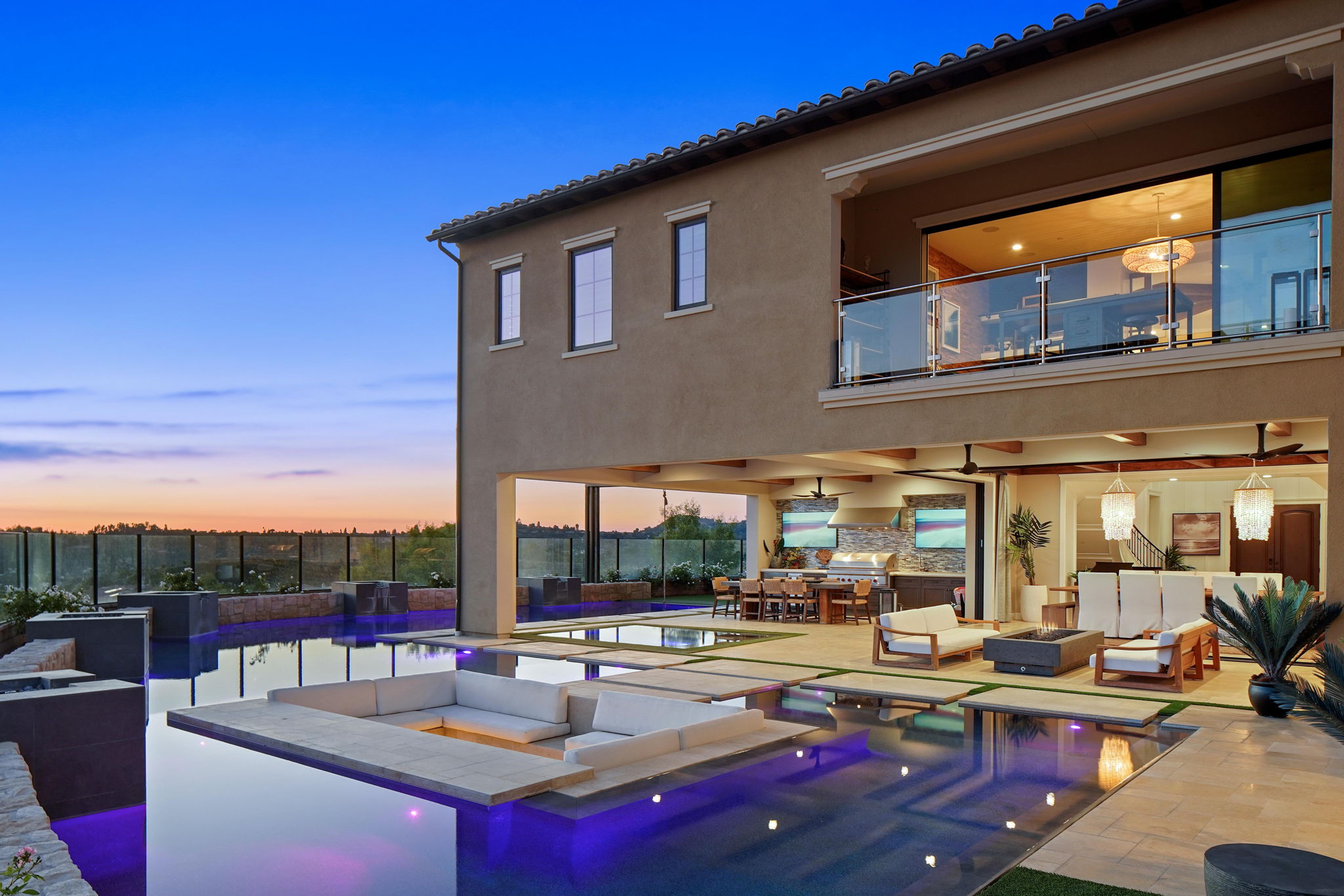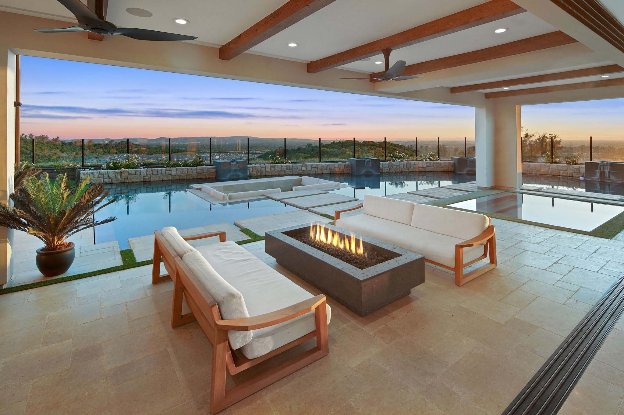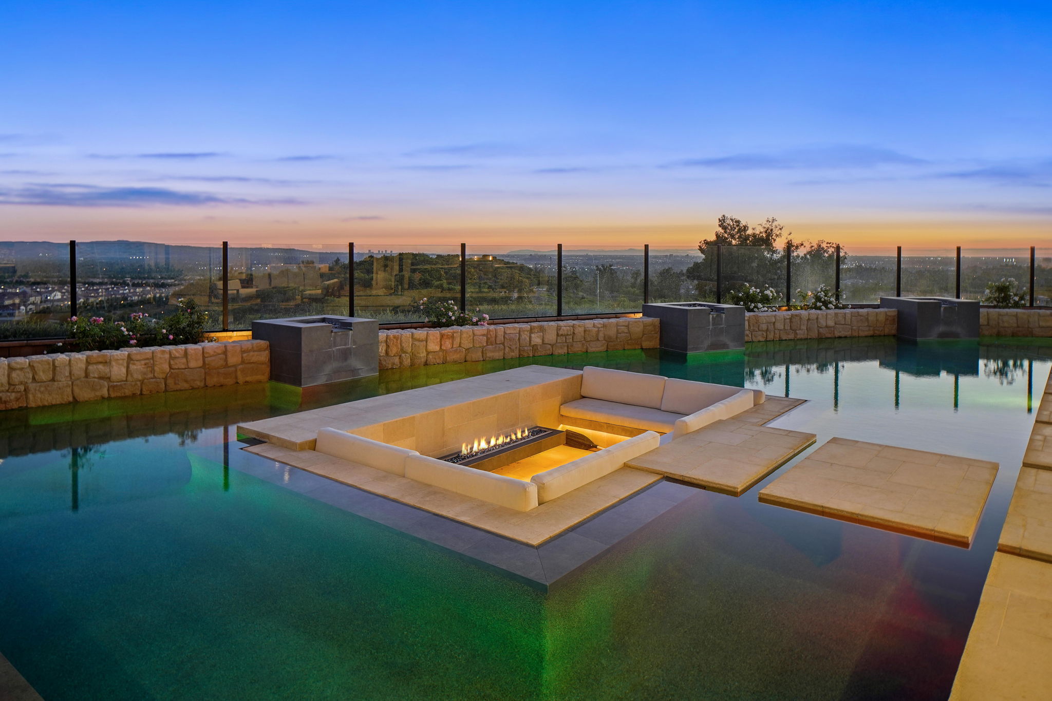 Arguably the most impressive property ever built in Irvine. An exceptional offering that combines the ultimate in interior finishes and exterior amenities, all located within the prestigious 24-hour gated community of The Grove at Orchard Hills. Recently built in 2019 on a corner lot with only one neighbor, the home impresses with a soaring foyer with dual curved staircases framed by incredible panoramic city and canyon views. Rustic exposed wood-beamed ceilings highlight the open living and dining areas, with sliding floor-to-ceiling allowing a plethora of natural light. An unparalleled transition of indoor/outdoor living, the current owners spent $1.5 million on a one-of-a-kind entertainer's yard boasting a conversation pit with built-in fireplace surrounded by a massive wrap-around infinity-edge resort-style pool and spa, multiple fire features, grassy yard, outdoor kitchen, and multiple lounging areas. The chef's kitchen is replete with dual islands with built-in breakfast bar seating and top-of-the-line Wolf appliances. Upstairs the oversized primary retreat showcases a see-through dual-sided fireplace with separate living area, stunning coffered ceilings, private balcony, and a spa-like ensuite bathroom with double vanity sinks and large custom walk-in closet. 4 additional guest bedrooms with ensuite baths and ample space, all of which are centered by a generous bonus room and covered view deck. Experience the utmost in contemporary living within a convenient location, top-rated schools, unmatched quality and design, and high-efficiency upgrades including solar panels. 4-car garage.