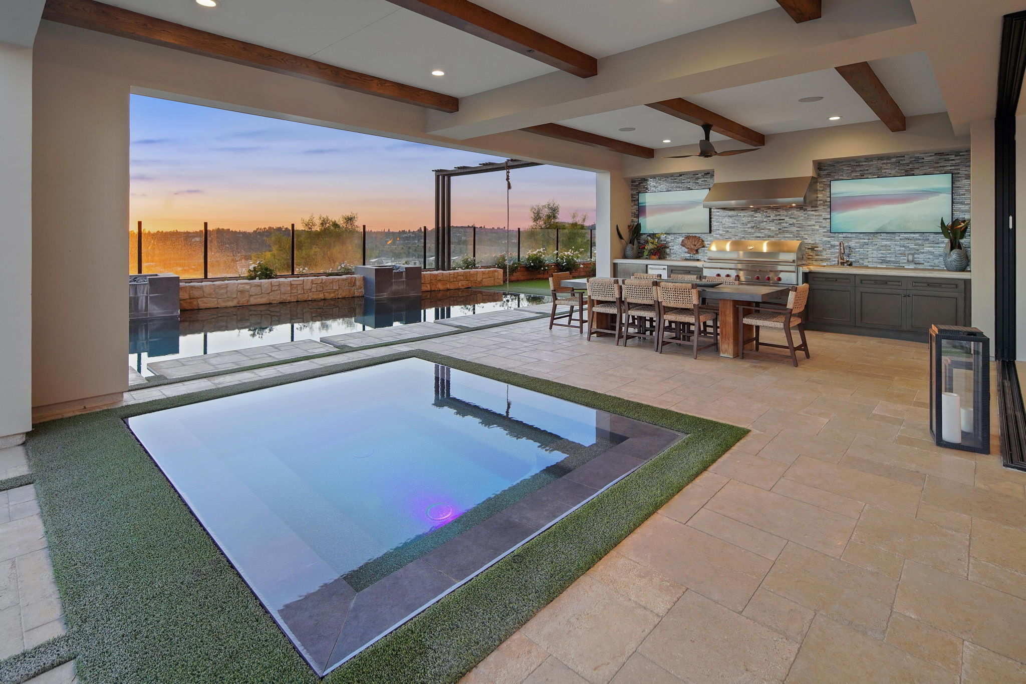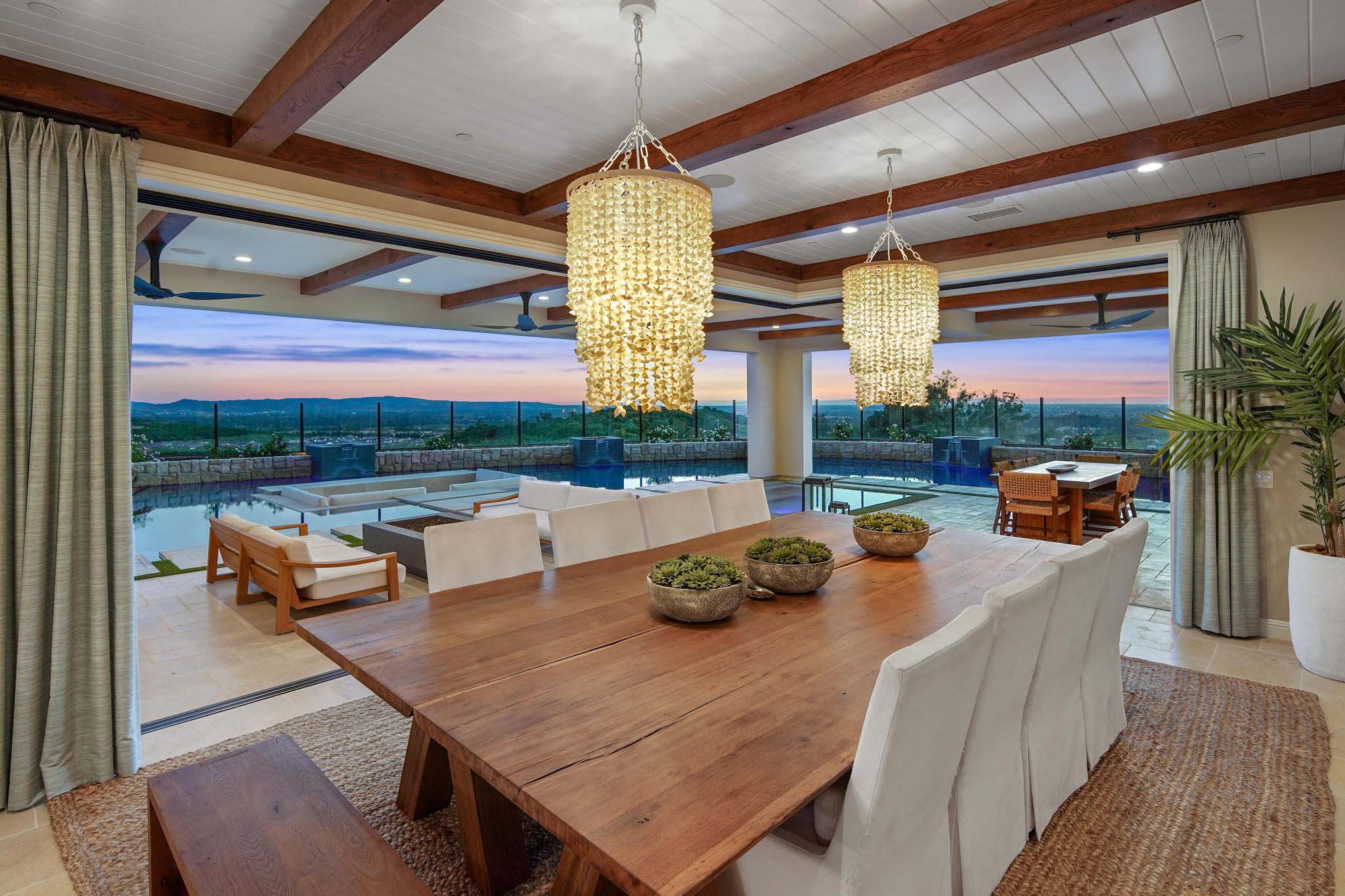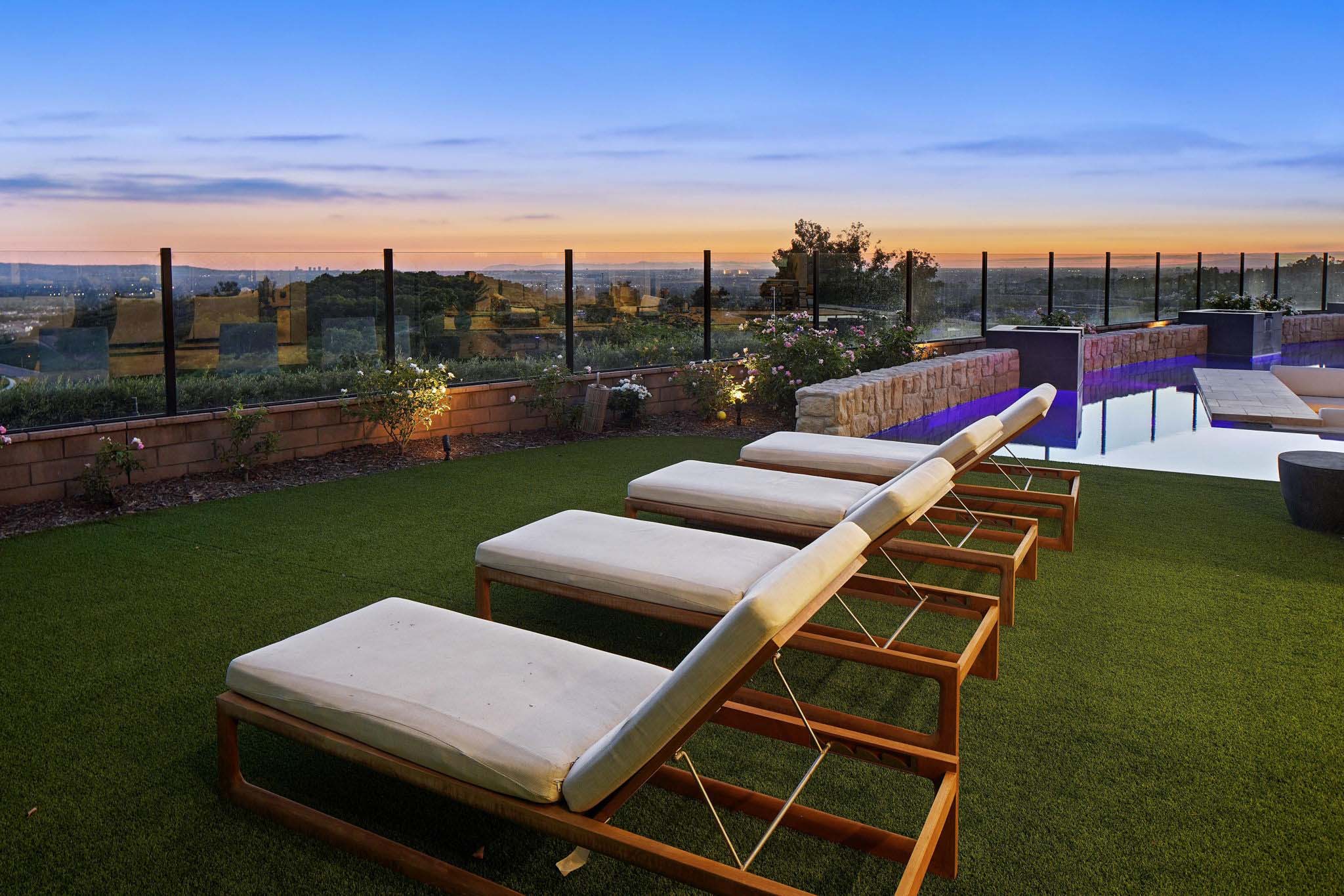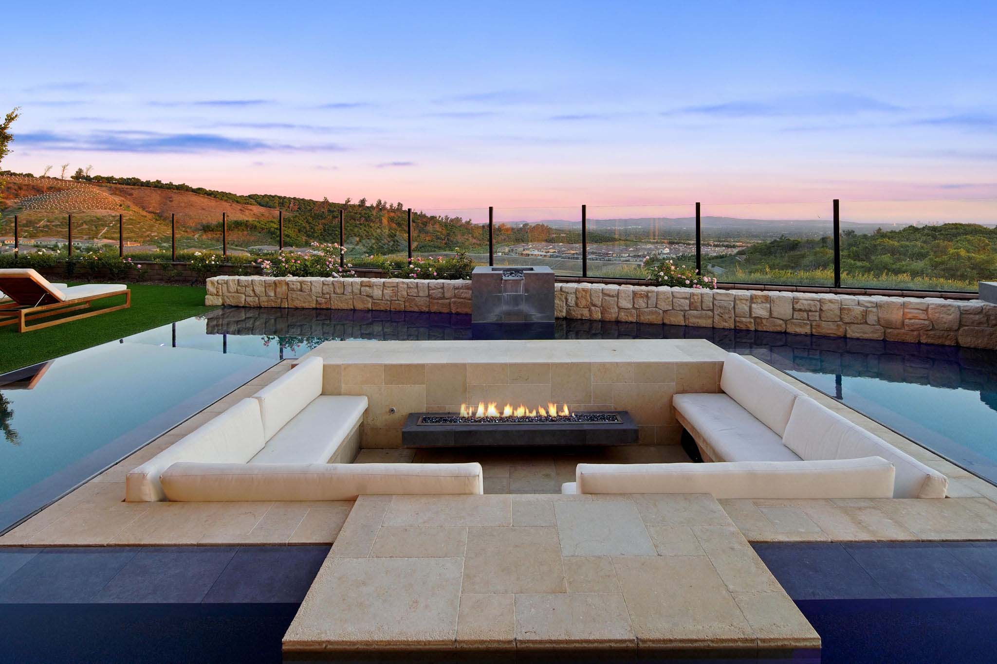 Arguably the most impressive property ever built in Irvine. An exceptional offering that combines the ultimate in interior finishes and exterior amenities, all located within the prestigious 24-hour gated community of The Grove at Orchard Hills. Recently built in 2019 on a corner lot with only one neighbor, the home impresses with a soaring foyer with dual curved staircases framed by incredible panoramic city and canyon views. Rustic exposed wood-beamed ceilings highlight the open living and dining areas, with sliding floor-to-ceiling allowing a plethora of natural light. An unparalleled transition of indoor/outdoor living, the current owners spent $1.5 million on a one-of-a-kind entertainer's yard boasting a conversation pit with built-in fireplace surrounded by a massive wrap-around infinity-edge resort-style pool and spa, multiple fire features, grassy yard, outdoor kitchen, and multiple lounging areas. The chef's kitchen is replete with dual islands with built-in breakfast bar seating and top-of-the-line Wolf appliances. Upstairs the oversized primary retreat showcases a see-through dual-sided fireplace with separate living area, stunning coffered ceilings, private balcony, and a spa-like ensuite bathroom with double vanity sinks and large custom walk-in closet. 4 additional guest bedrooms with ensuite baths and ample space, all of which are centered by a generous bonus room and covered view deck. Experience the utmost in contemporary living within a convenient location, top-rated schools, unmatched quality and design, and high-efficiency upgrades including solar panels. 4-car garage.