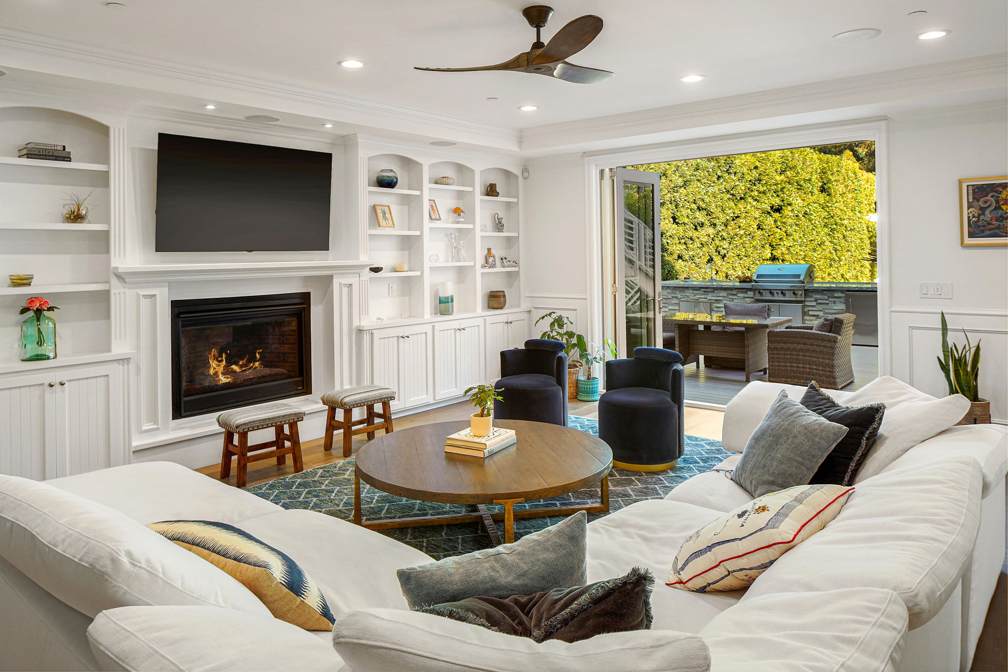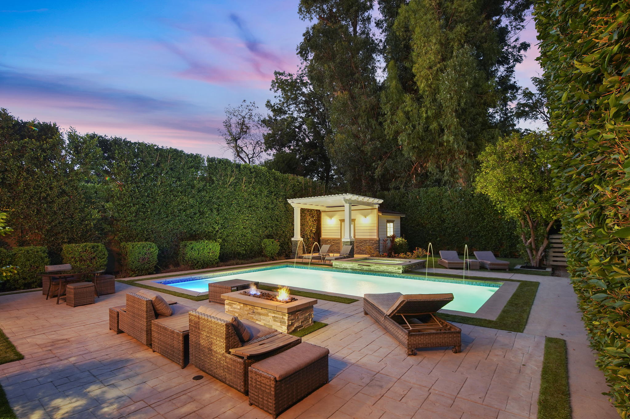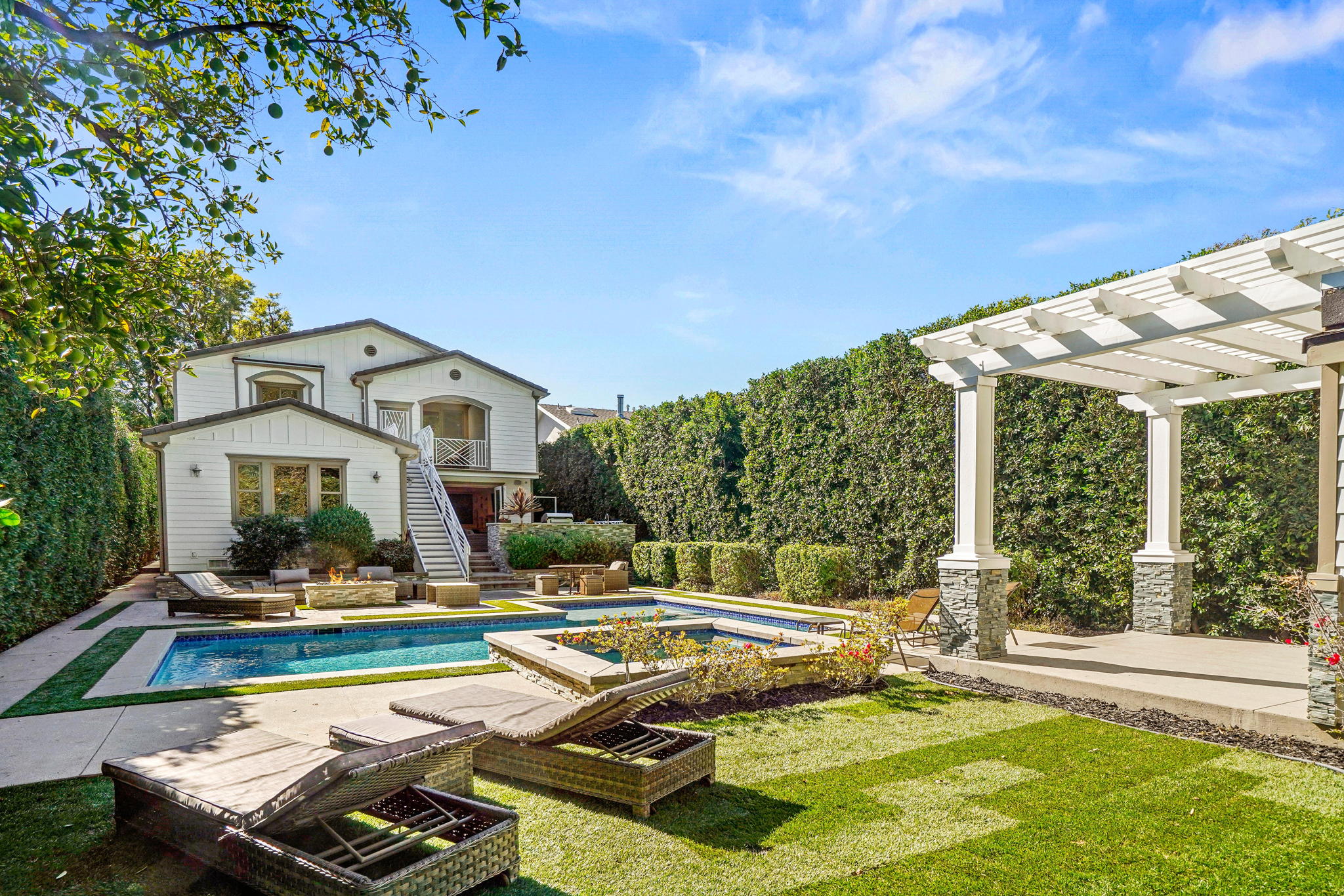 Nestled in prime Sherman Oaks just south of Ventura Blvd., this Cape Cod estate sits tucked away behind private gates and a lush front yard. Enter through the grand foyer boasting double-height ceilings, into the beautiful home replete with stunning white oak floors and custom built-in finishes and fixtures throughout. Large windows allow for abundant natural light to stream into the living room with a fireplace. There is ample space to cook and eat in the chefs kitchen with a center island and breakfast nook, which includes modern stainless steel appliances. The primary suite boasts a fireplace and expansive en-suite bathroom with a separate soaking tub and walk-in shower, as well as a double vanity. Enjoy the pool and spa in the private backyard with cabana, fire pit, and dining area perfect for relaxing or entertaining. New solar system, converted gym, automated smart home Crestron system, and gated driveway parking with 2-car garage complete this impressive offering.