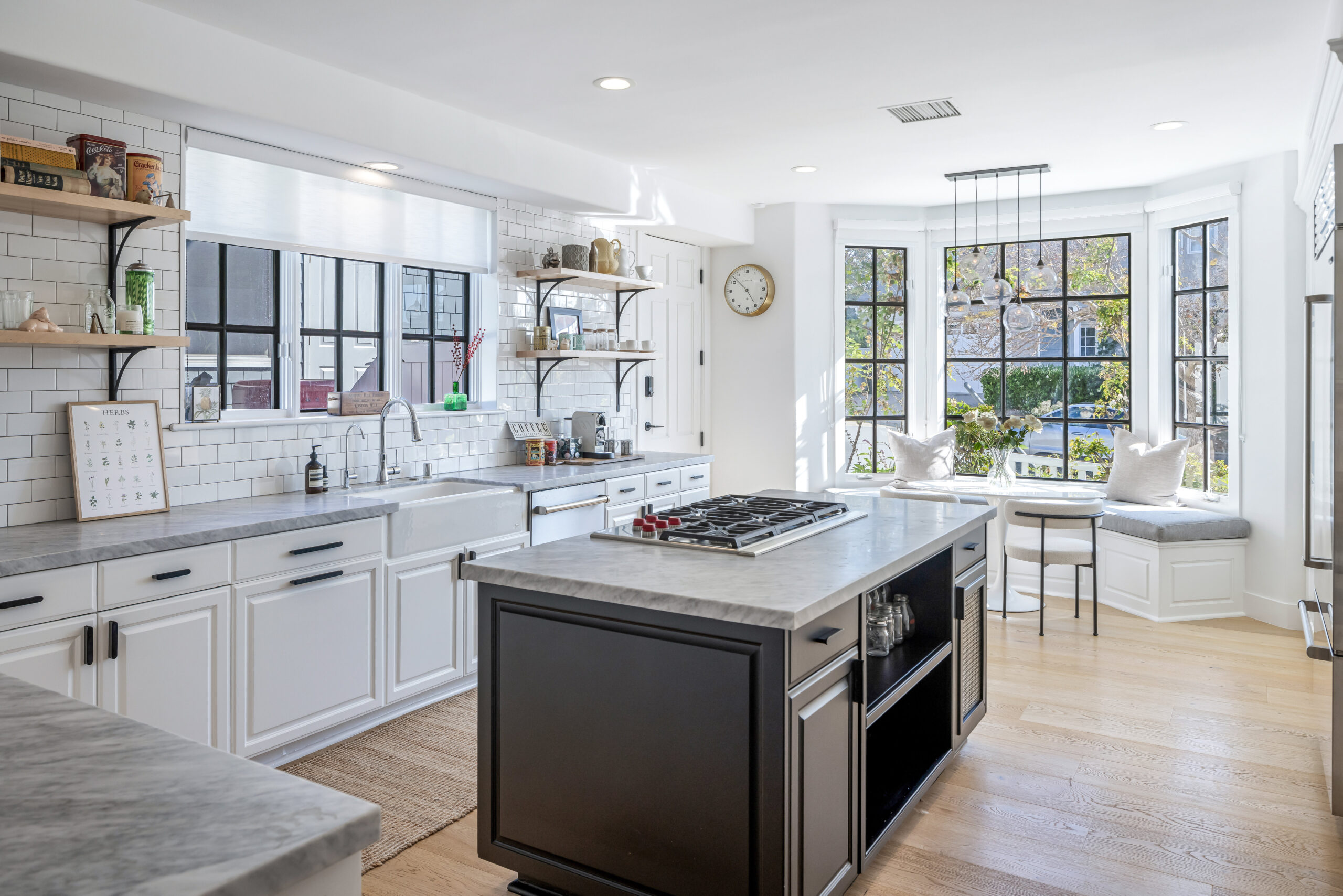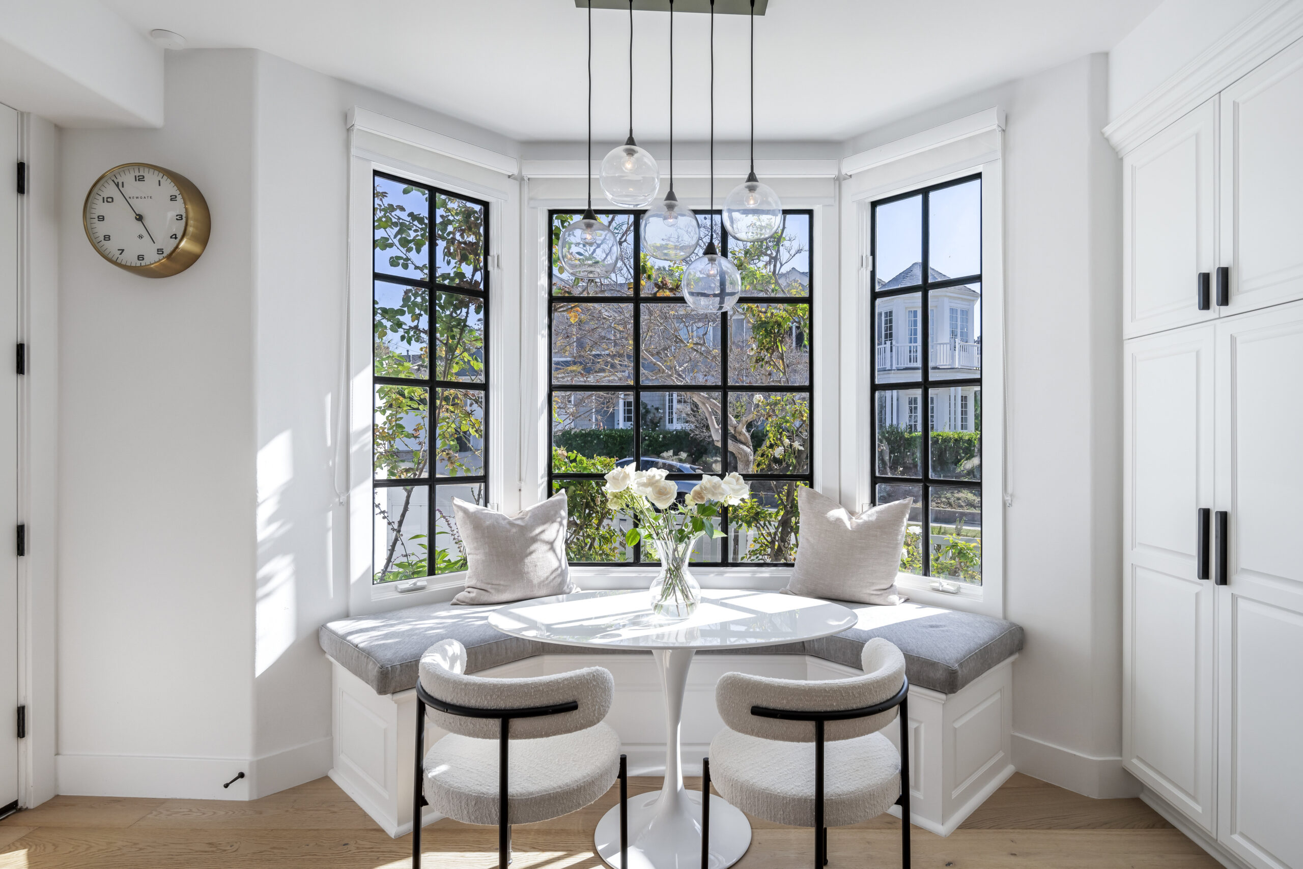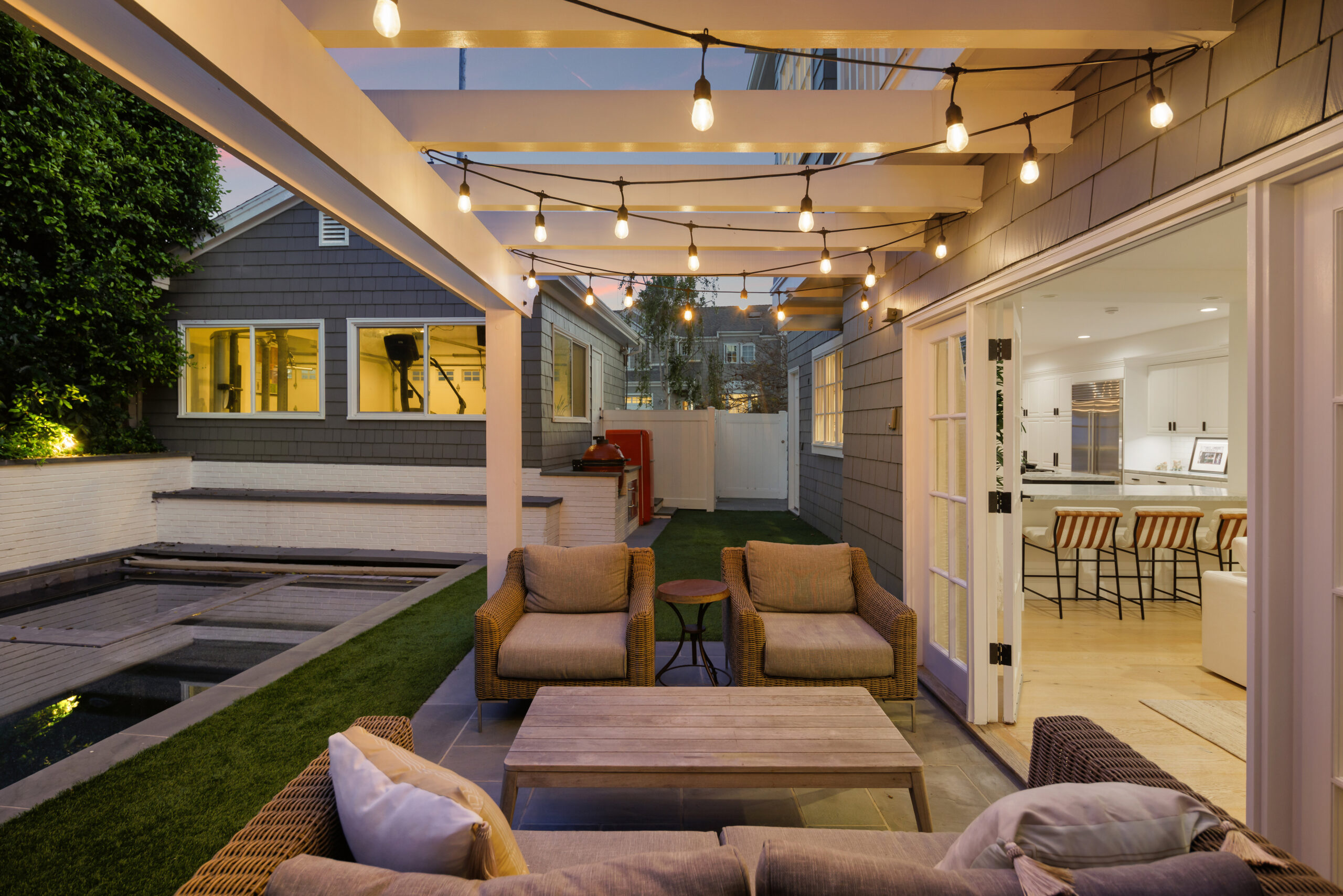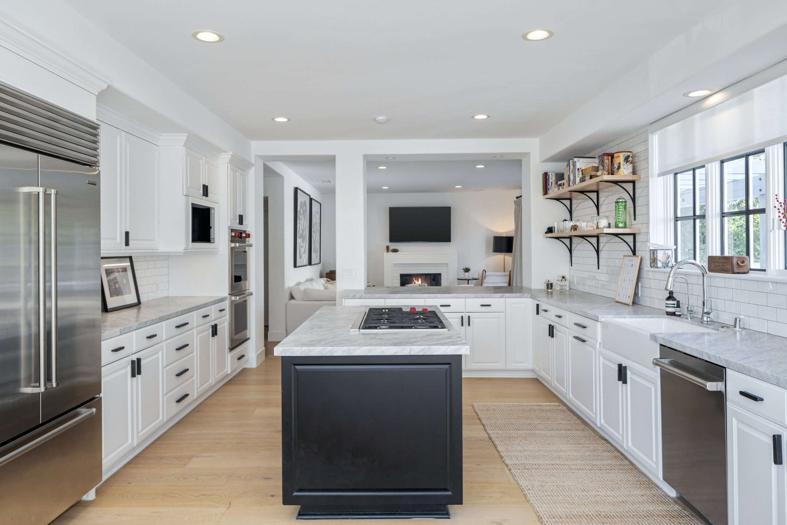 The heart of this exquisite home is the gourmet open-concept kitchen. It boasts sleek open shelving, an expansive center island, a custom built-in banquette, and additional countertop seating. This culinary haven seamlessly flows into a cozy family room that opens to a secluded, tranquil backyard. This outdoor oasis includes a newly constructed pergola, a pool and spa with a captivating waterfall feature and electric cover, a BBQ area complete with a fridge, and an outdoor shower—creating an idyllic setting for alfresco dining and relaxation.