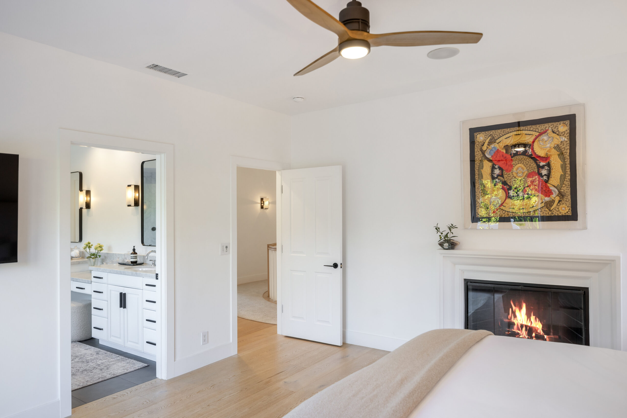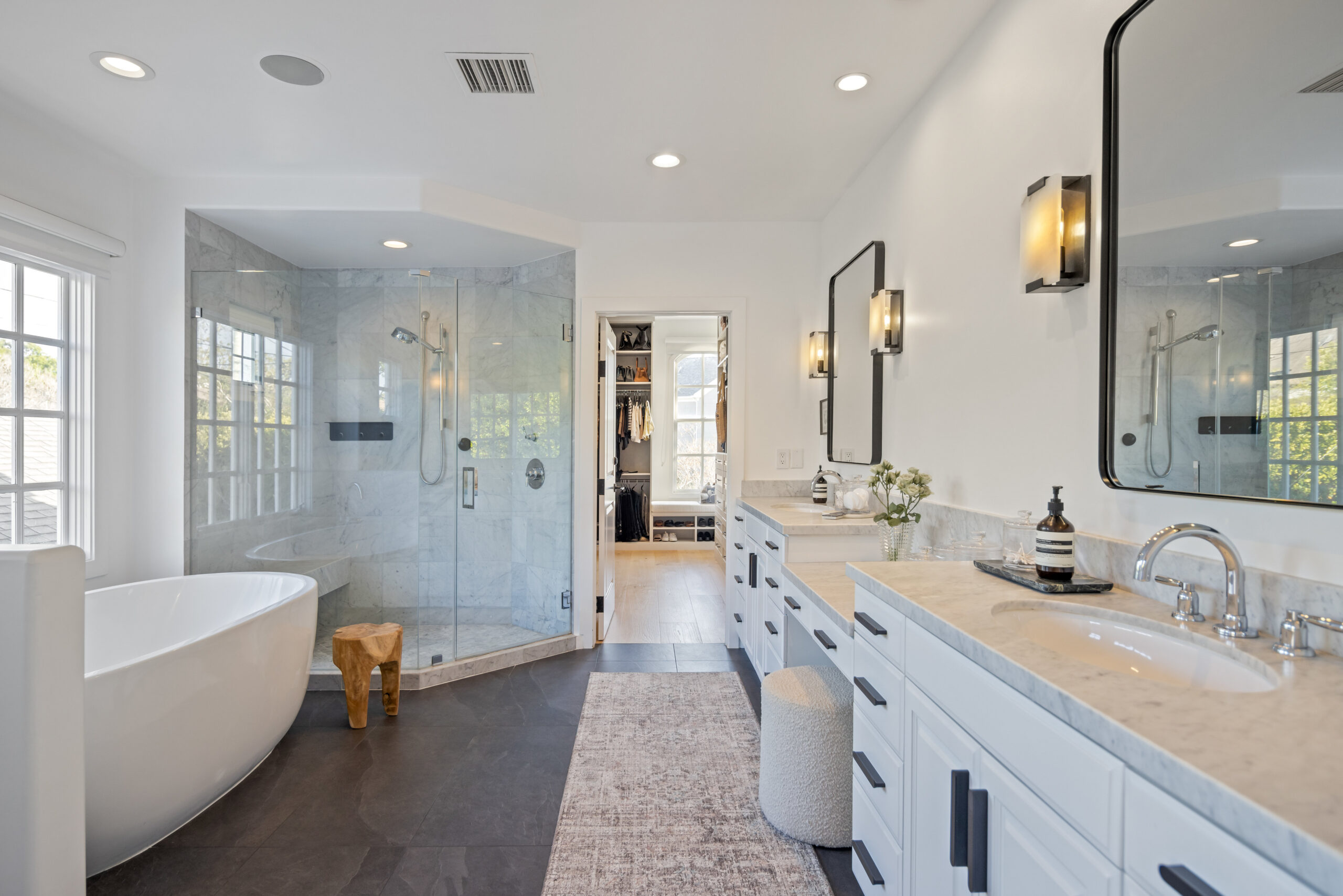 Ascending the elegant cascading staircase, you'll find three generously sized en suite bedrooms, a convenient laundry room, and a versatile bonus playroom. The primary suite is a true sanctuary featuring wide French doors that open up to the backyard, allowing natural light to flood in and creating an open and airy ambiance. This luxurious suite also includes a cozy fireplace, a spacious walk-in custom closet, and a newly remodeled, modern bathroom equipped with an oversized dual vanity, a large walk-in shower, and a standalone modern bathtub, offering a spa-like retreat within your own home.