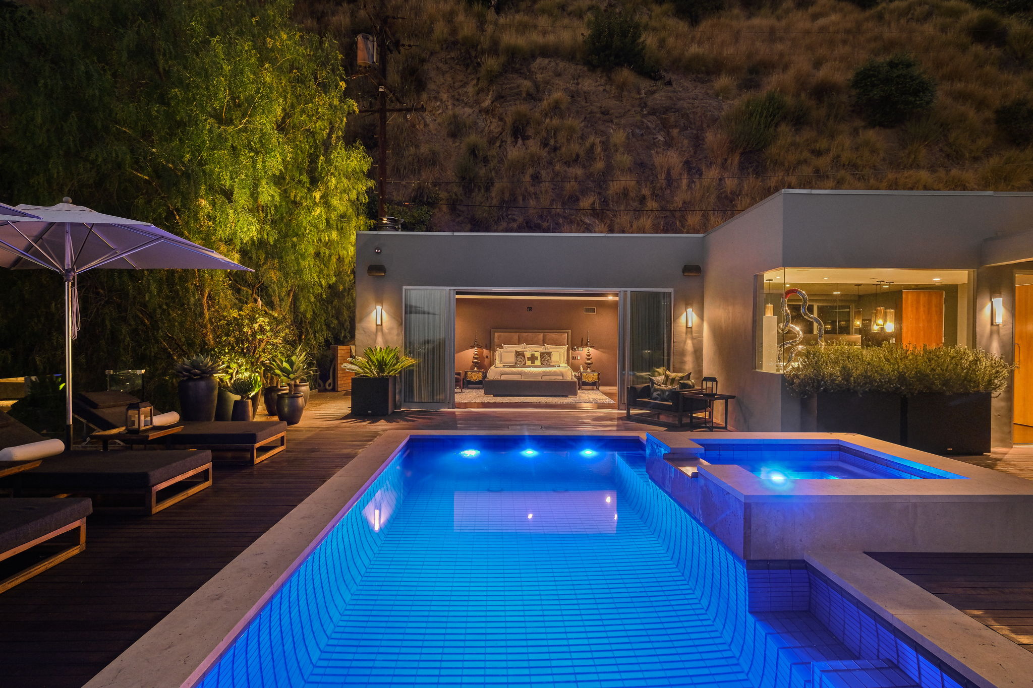 Set behind a long privately gated driveway above the Sunset Strip, this contemporary jewel box features jetliner views of the entire city. On almost one acre of land, this four-bedroom, four-bathroom estate creates the perfect indoor/outdoor lifestyle with seamless access to the gorgeous pool, spa, and massive entertainment deck replete with outdoor BBQ, multiple gas fireplaces, and shaded patio. The interior boasts an open floor plan with sliding Fleetwood doors and dramatic views, dining area, plus a chef's kitchen with beautiful wooden cabinetry, Miele/Wolf appliances, and large wine cooler. The luxurious owner's suite opens to the pool/spa and has its own fireplace with built-in library shelving, oversized drop-down theater projection screen, and a resort-like bathroom with separate steam shower and walk-in closet. Two additional bedrooms and one attached en-suite guest unit with separate entrance. 2-car garage with motor court/sport court offering additional parking up to 6 cars.
