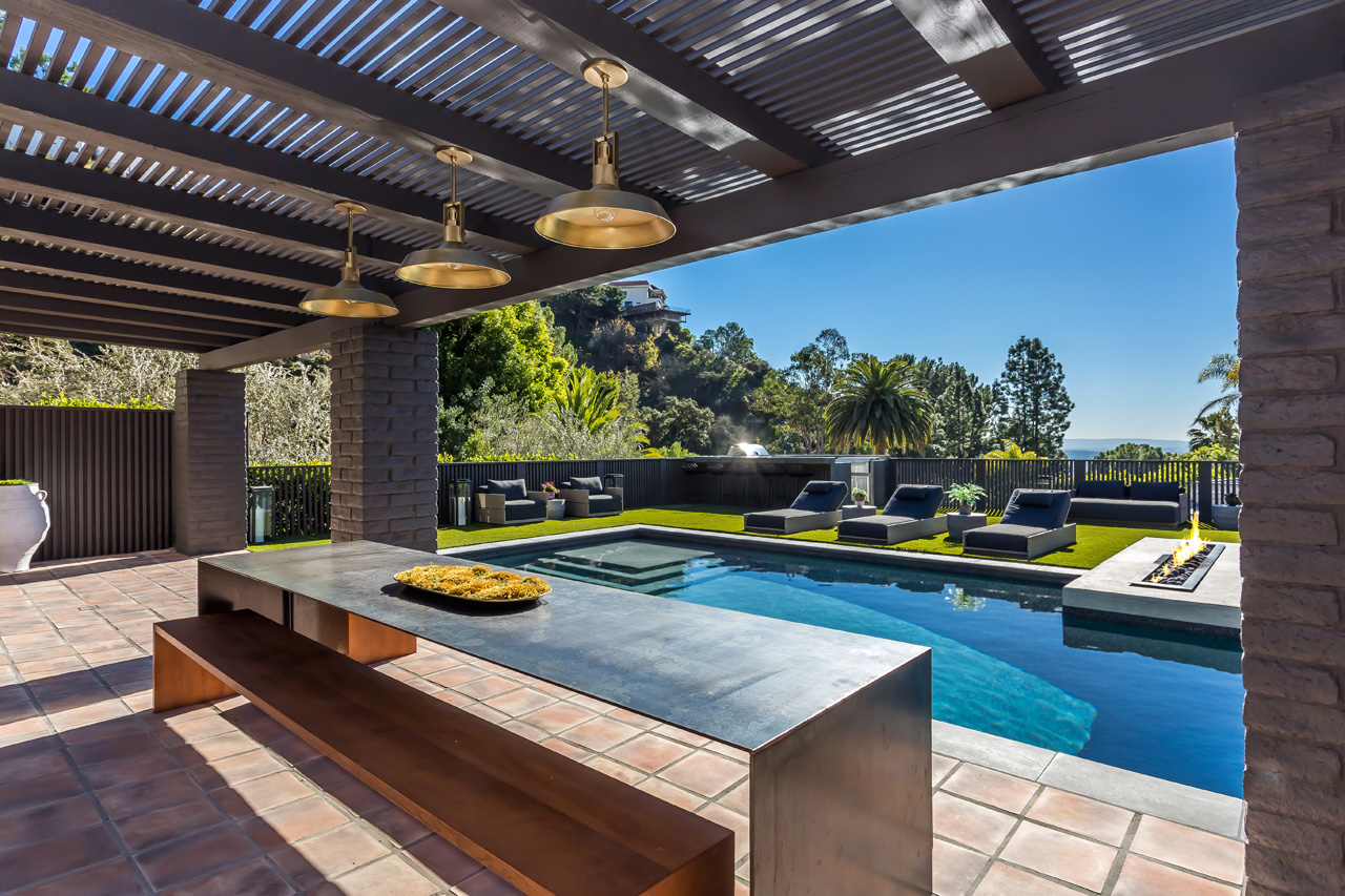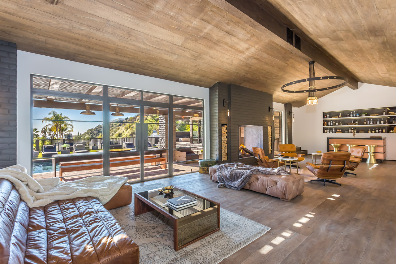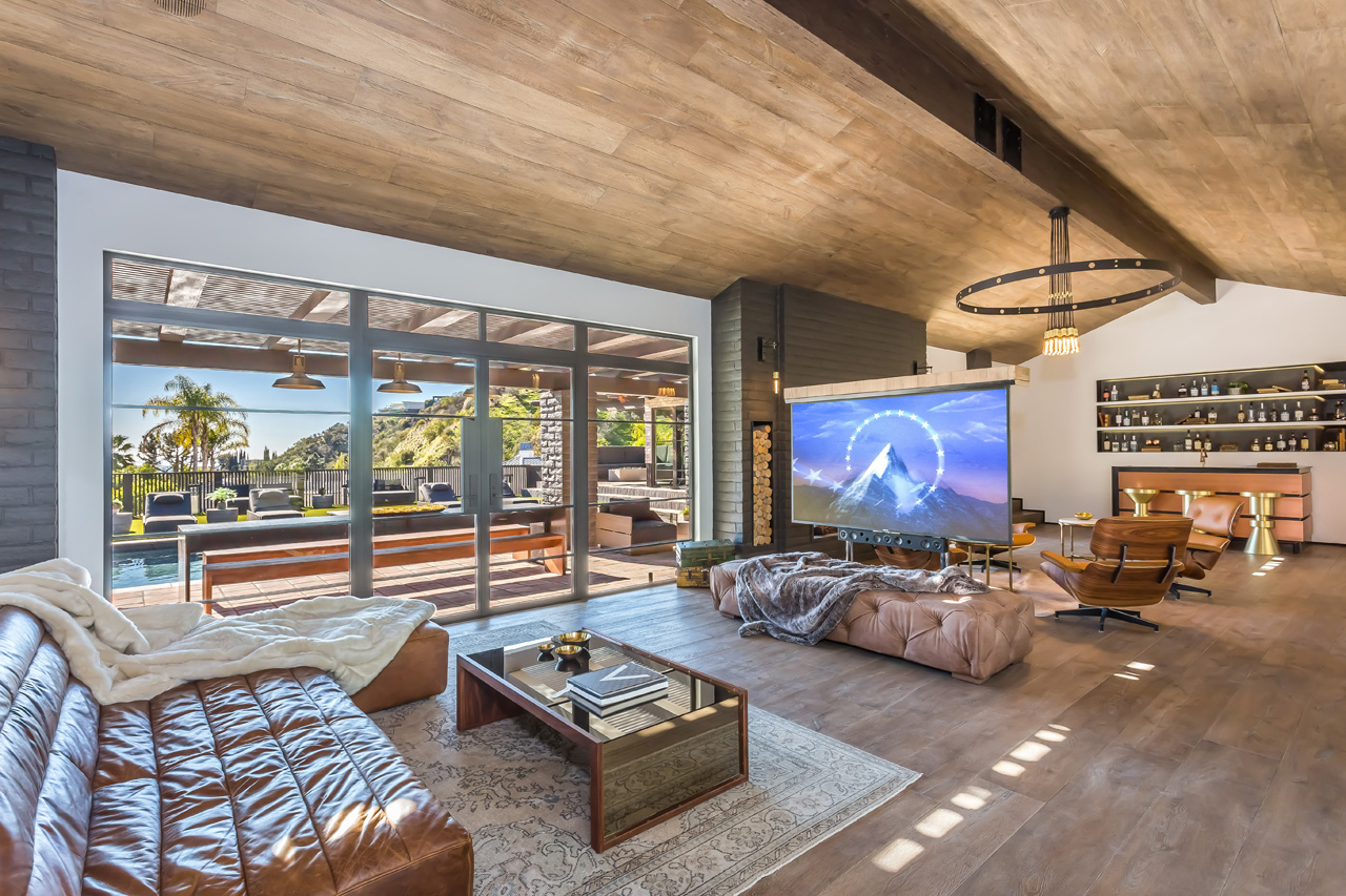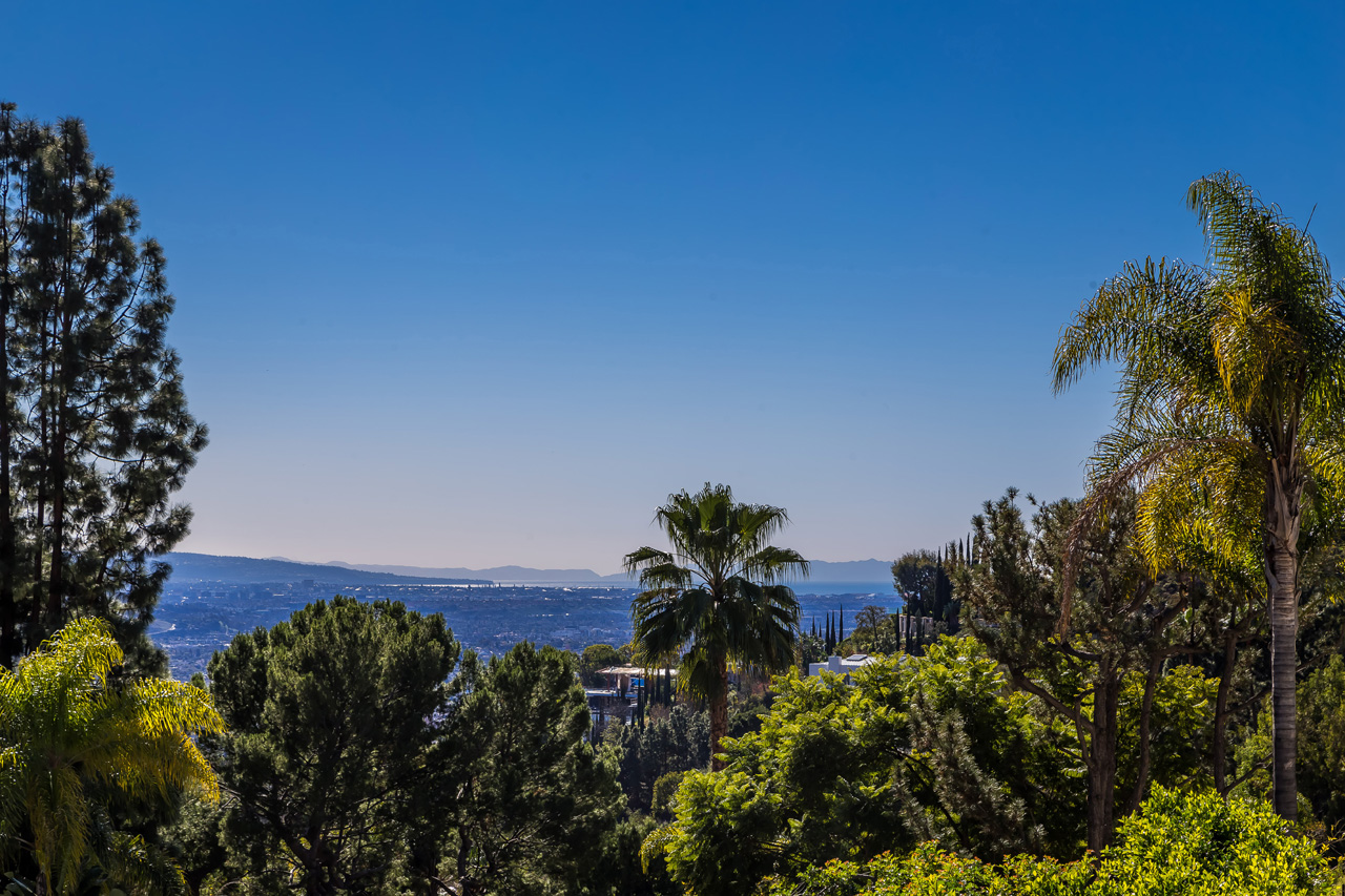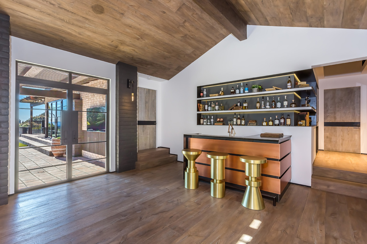 The most exquisitely conceived single-story estate with city/ocean/canyon views on one of the most sought after streets in the Hills. The owner spent more than $4.5M to remodel the home for himself, crafting a timeless masterpiece with soaring wood-lined vaulted ceilings, a master bedroom that turns into a movie theater, private library with a working bell-tower clock, master bath with 15 ft. dual-shower and unlacquered brass fixtures, custom sauna, copper outdoor tub, countertops and vanities made from solid steel, custom built and suede-lined walk-in closets, a hidden 85" living room TV that comes up from a concrete bunker under the house, floating stairs to a wine cellar, copper/steel custom bar with recessed steel and leather niches, four fireplaces, outdoor BBQ/bar, LED lighting and smart home technology throughout. An unrivaled chef's kitchen replete with Gaggenau appliances, Leicht imported German cabinetry, and Mavam coffee maker. Lighting throughout from Buster + Punch, London.