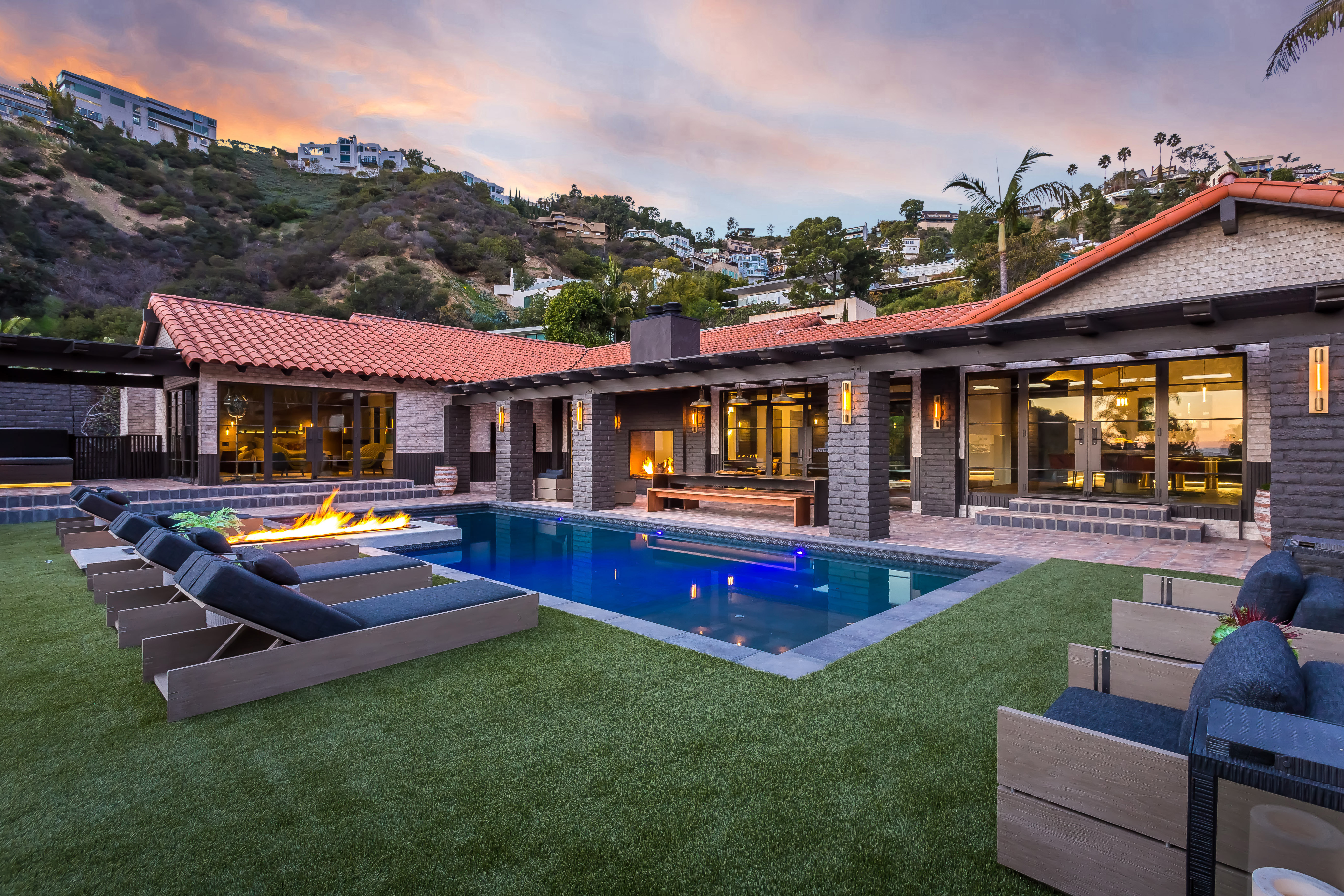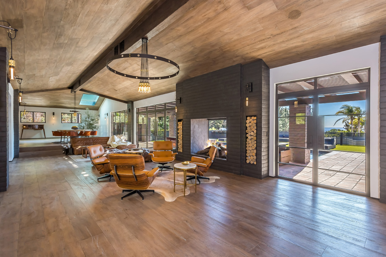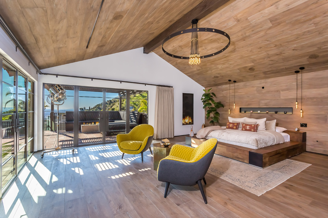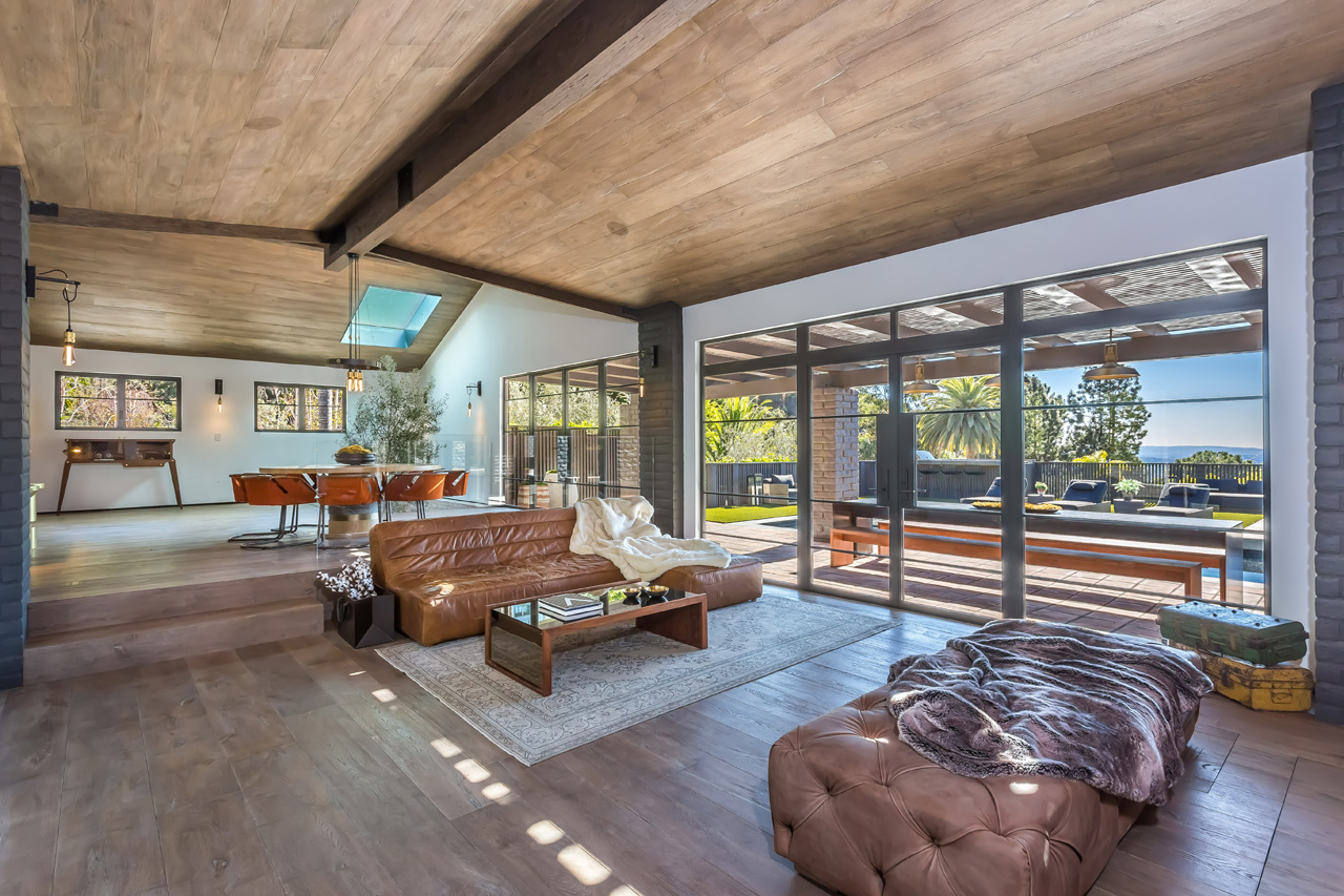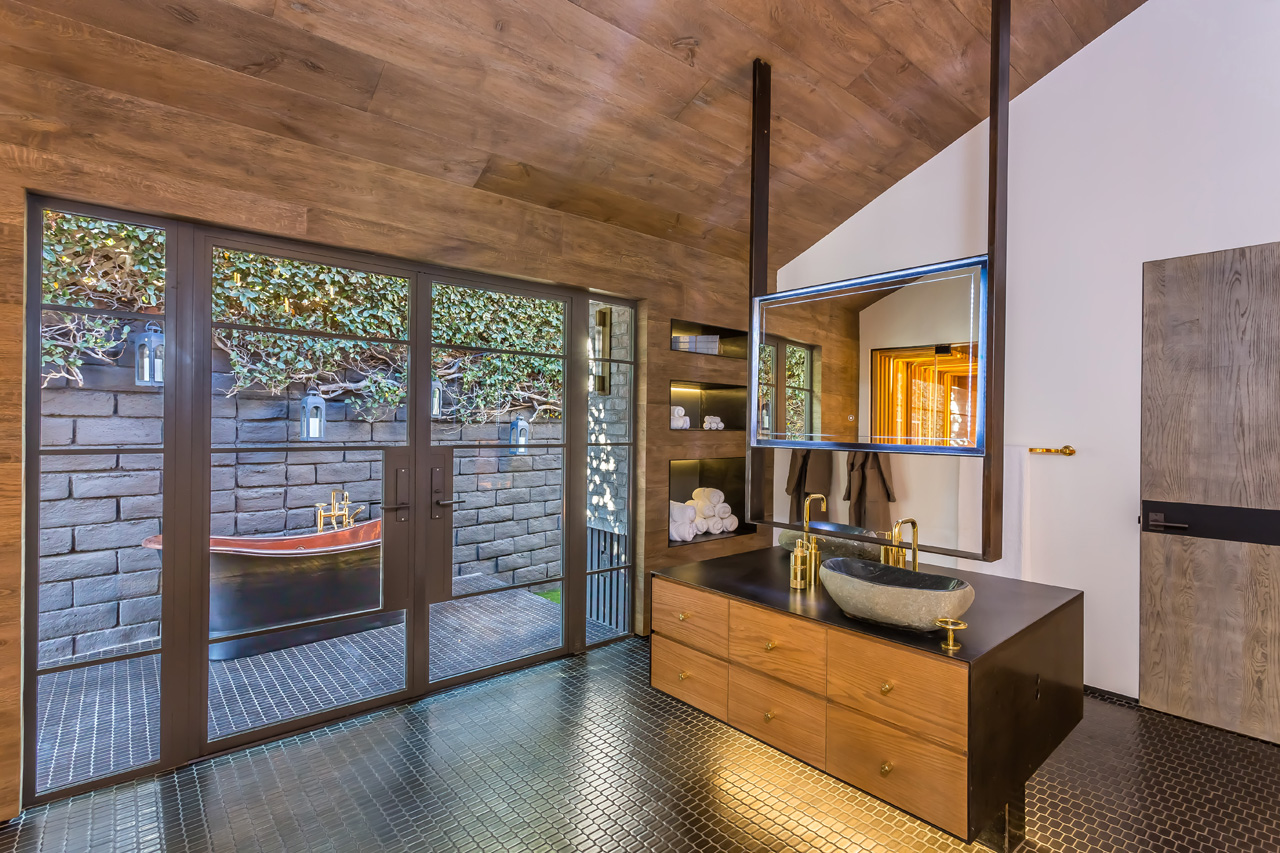 The most exquisitely conceived single-story estate with city/ocean/canyon views on one of the most sought after streets in the Hills. The owner spent more than $4.5M to remodel the home for himself, crafting a timeless masterpiece with soaring wood-lined vaulted ceilings, a master bedroom that turns into a movie theater, private library with a working bell-tower clock, master bath with 15 ft. dual-shower and unlacquered brass fixtures, custom sauna, copper outdoor tub, countertops and vanities made from solid steel, custom built and suede-lined walk-in closets, a hidden 85" living room TV that comes up from a concrete bunker under the house, floating stairs to a wine cellar, copper/steel custom bar with recessed steel and leather niches, four fireplaces, outdoor BBQ/bar, LED lighting and smart home technology throughout. An unrivaled chef's kitchen replete with Gaggenau appliances, Leicht imported German cabinetry, and Mavam coffee maker. Lighting throughout from Buster + Punch, London.