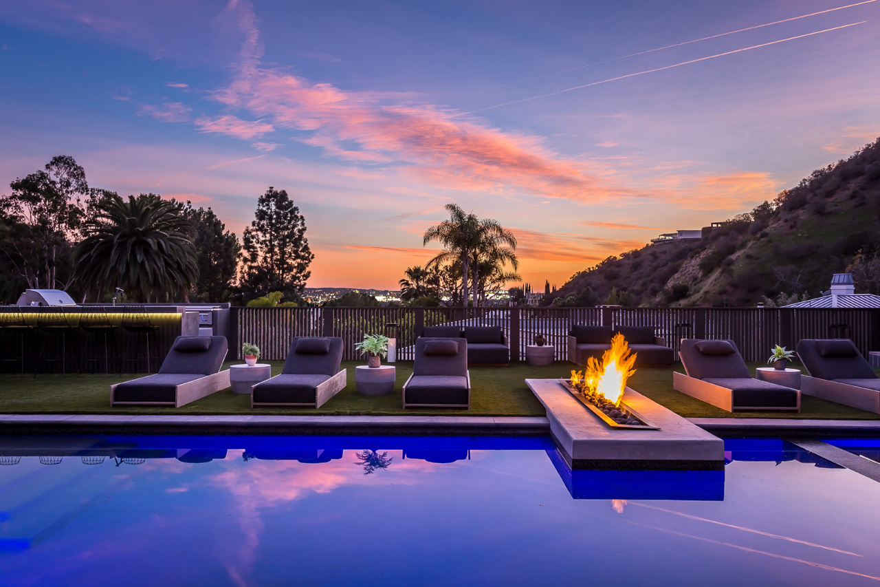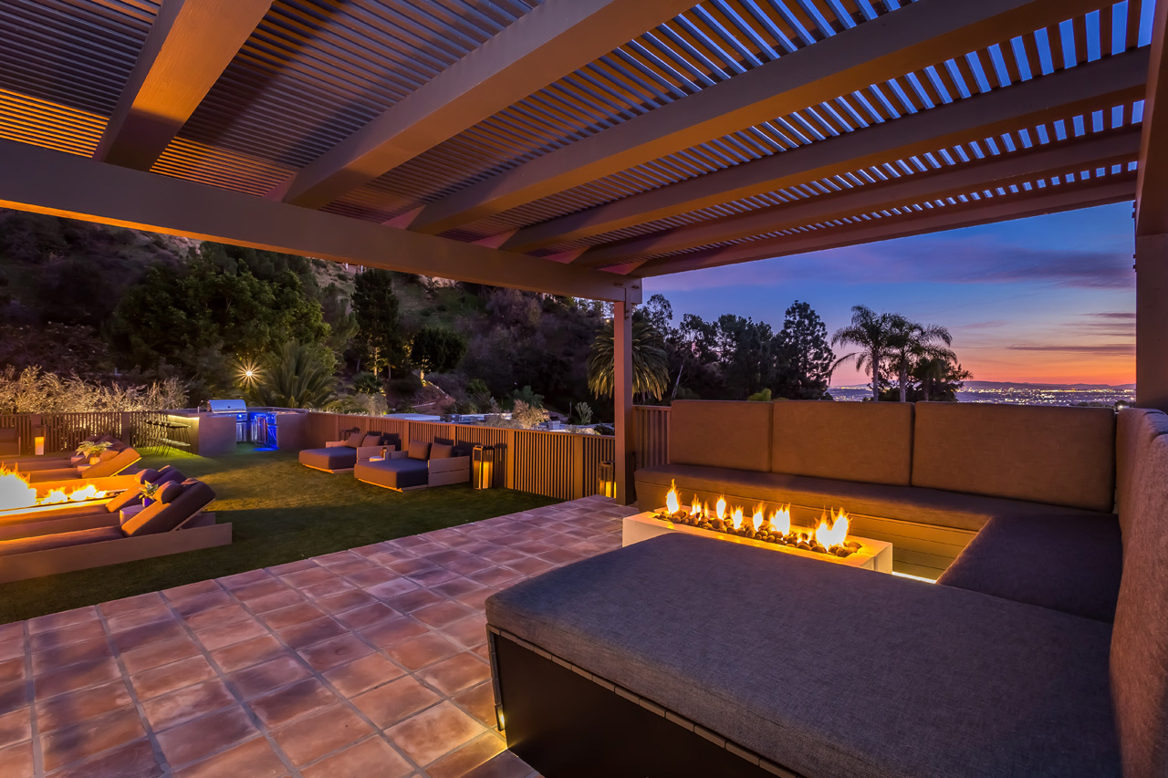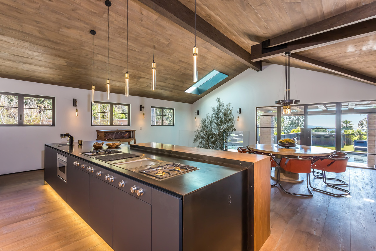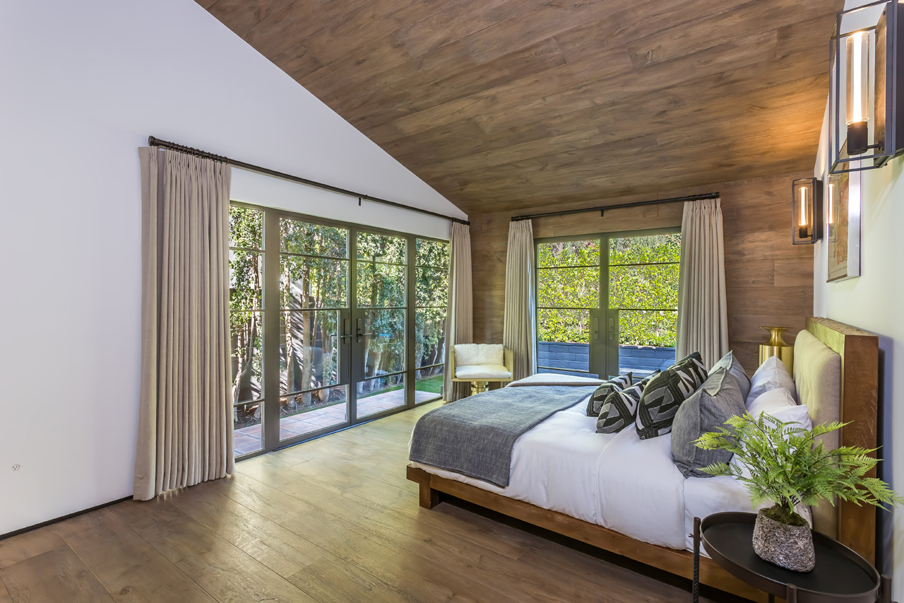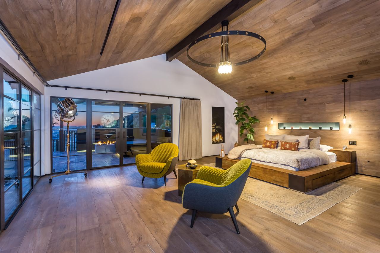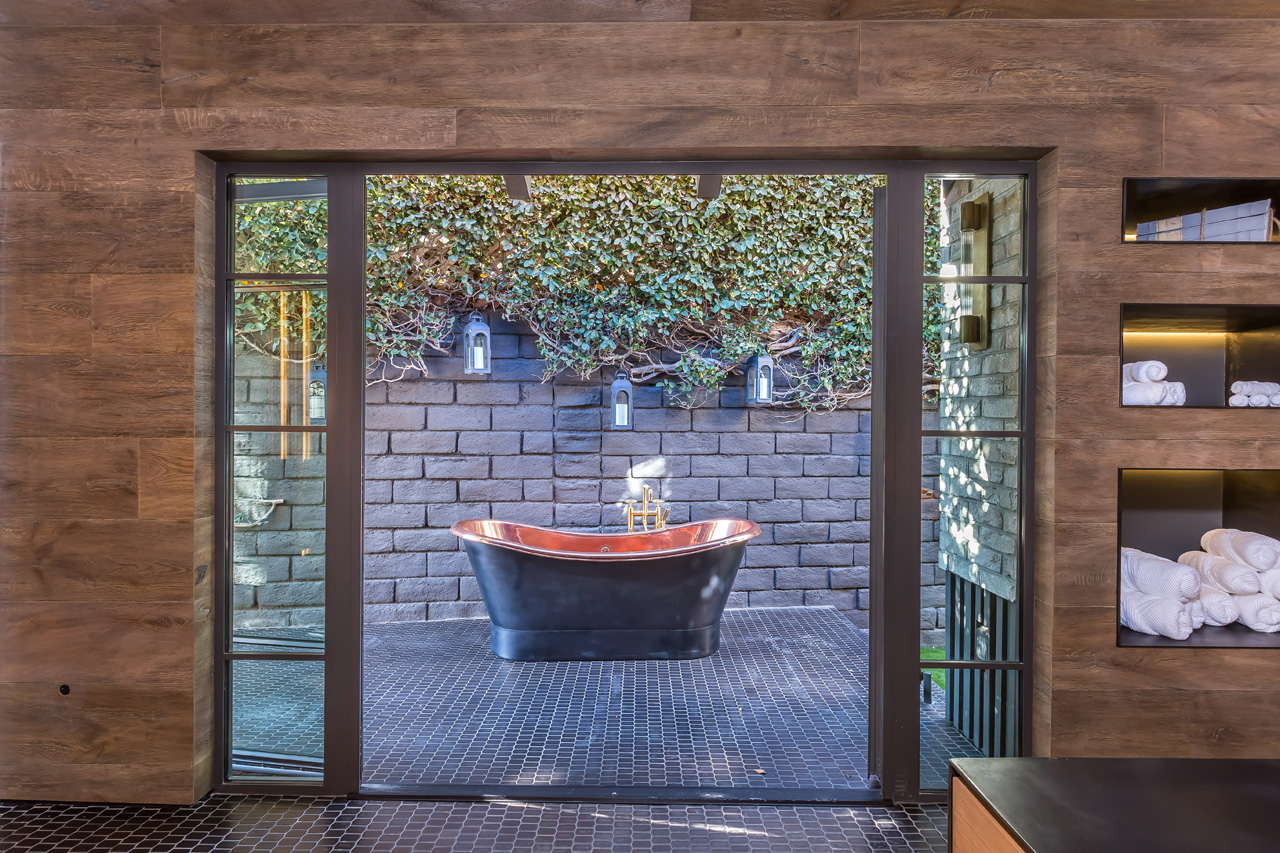 The most exquisitely conceived single-story estate with city/ocean/canyon views on one of the most sought after streets in the Hills. The owner spent more than $4.5M to remodel the home for himself, crafting a timeless masterpiece with soaring wood-lined vaulted ceilings, a master bedroom that turns into a movie theater, private library with a working bell-tower clock, master bath with 15 ft. dual-shower and unlacquered brass fixtures, custom sauna, copper outdoor tub, countertops and vanities made from solid steel, custom built and suede-lined walk-in closets, a hidden 85" living room TV that comes up from a concrete bunker under the house, floating stairs to a wine cellar, copper/steel custom bar with recessed steel and leather niches, four fireplaces, outdoor BBQ/bar, LED lighting and smart home technology throughout. An unrivaled chef's kitchen replete with Gaggenau appliances, Leicht imported German cabinetry, and Mavam coffee maker. Lighting throughout from Buster + Punch, London.