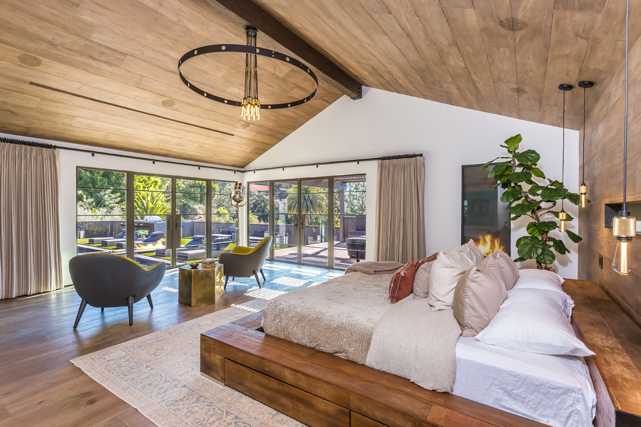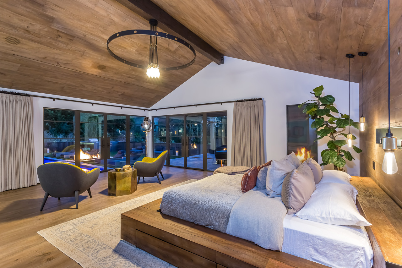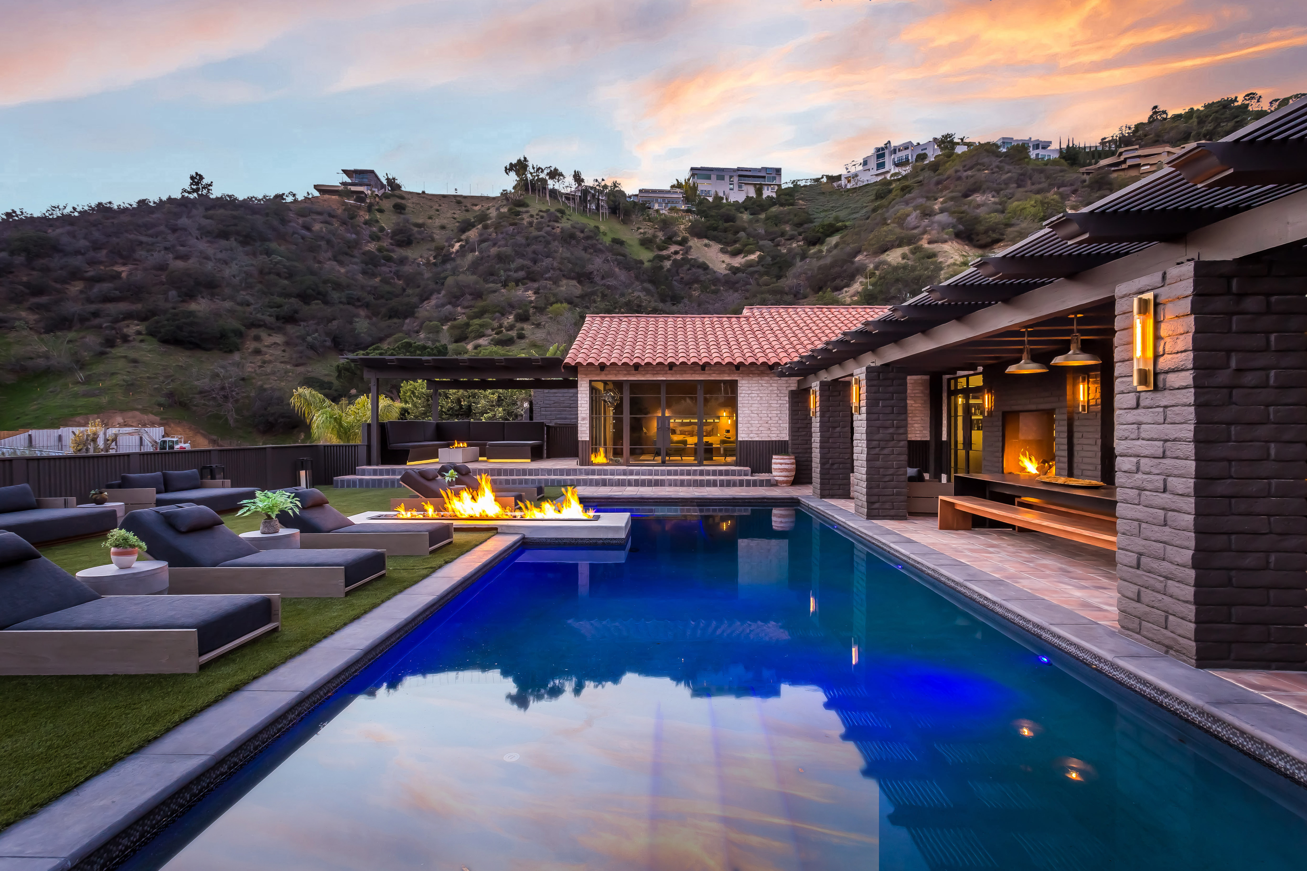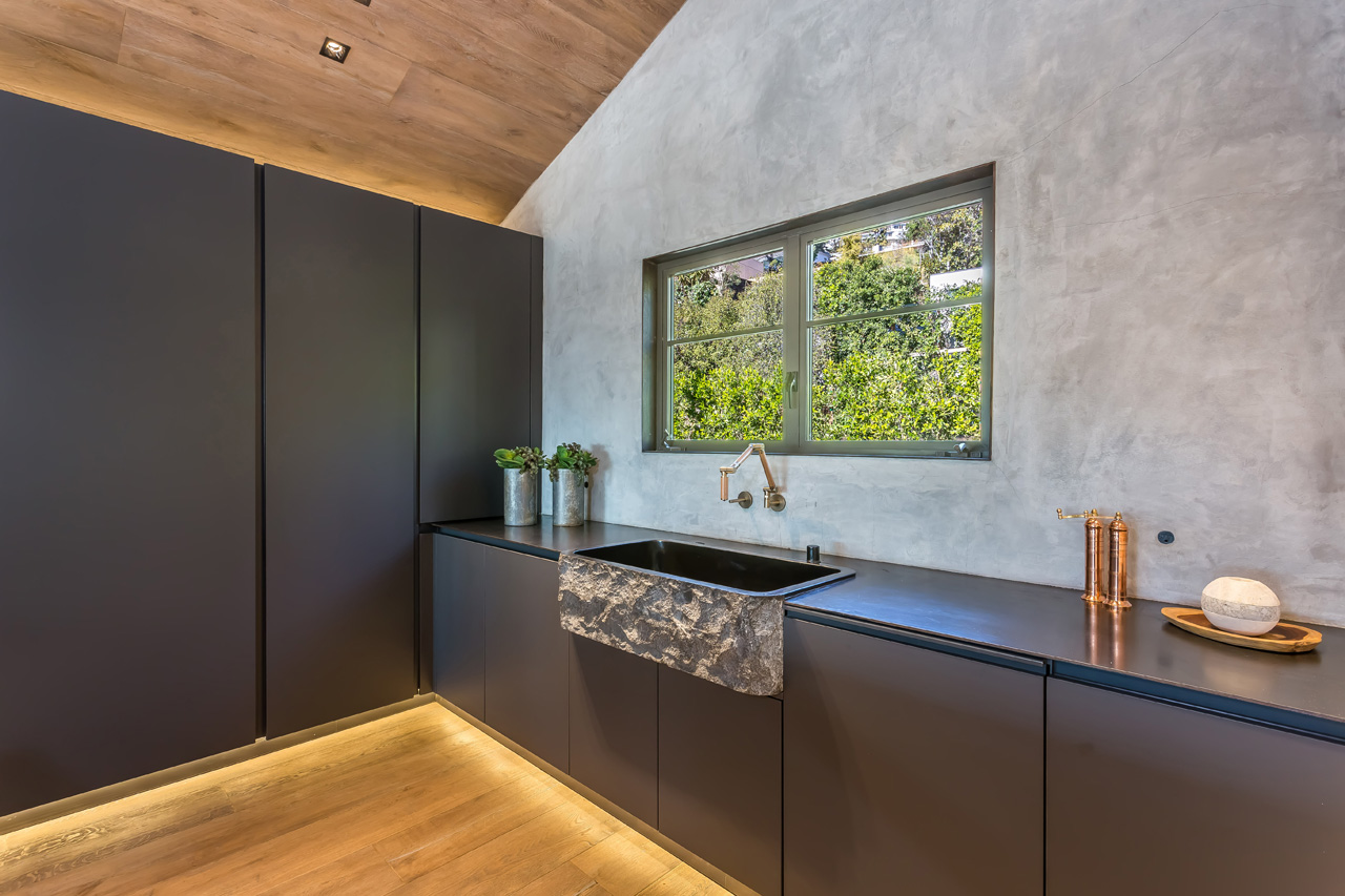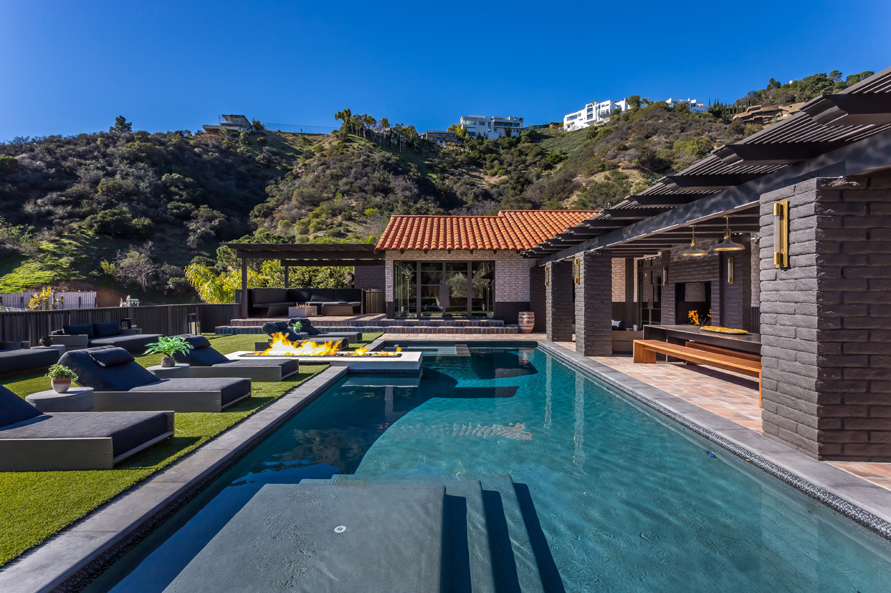 The most exquisitely conceived single-story estate with city/ocean/canyon views on one of the most sought after streets in the Hills. The owner spent more than $4.5M to remodel the home for himself, crafting a timeless masterpiece with soaring wood-lined vaulted ceilings, a master bedroom that turns into a movie theater, private library with a working bell-tower clock, master bath with 15 ft. dual-shower and unlacquered brass fixtures, custom sauna, copper outdoor tub, countertops and vanities made from solid steel, custom built and suede-lined walk-in closets, a hidden 85" living room TV that comes up from a concrete bunker under the house, floating stairs to a wine cellar, copper/steel custom bar with recessed steel and leather niches, four fireplaces, outdoor BBQ/bar, LED lighting and smart home technology throughout. An unrivaled chef's kitchen replete with Gaggenau appliances, Leicht imported German cabinetry, and Mavam coffee maker. Lighting throughout from Buster + Punch, London.