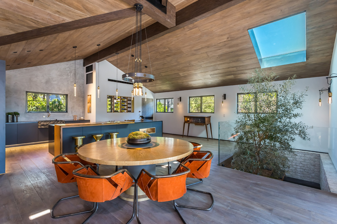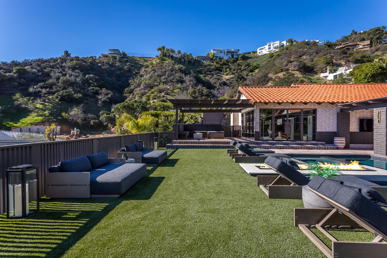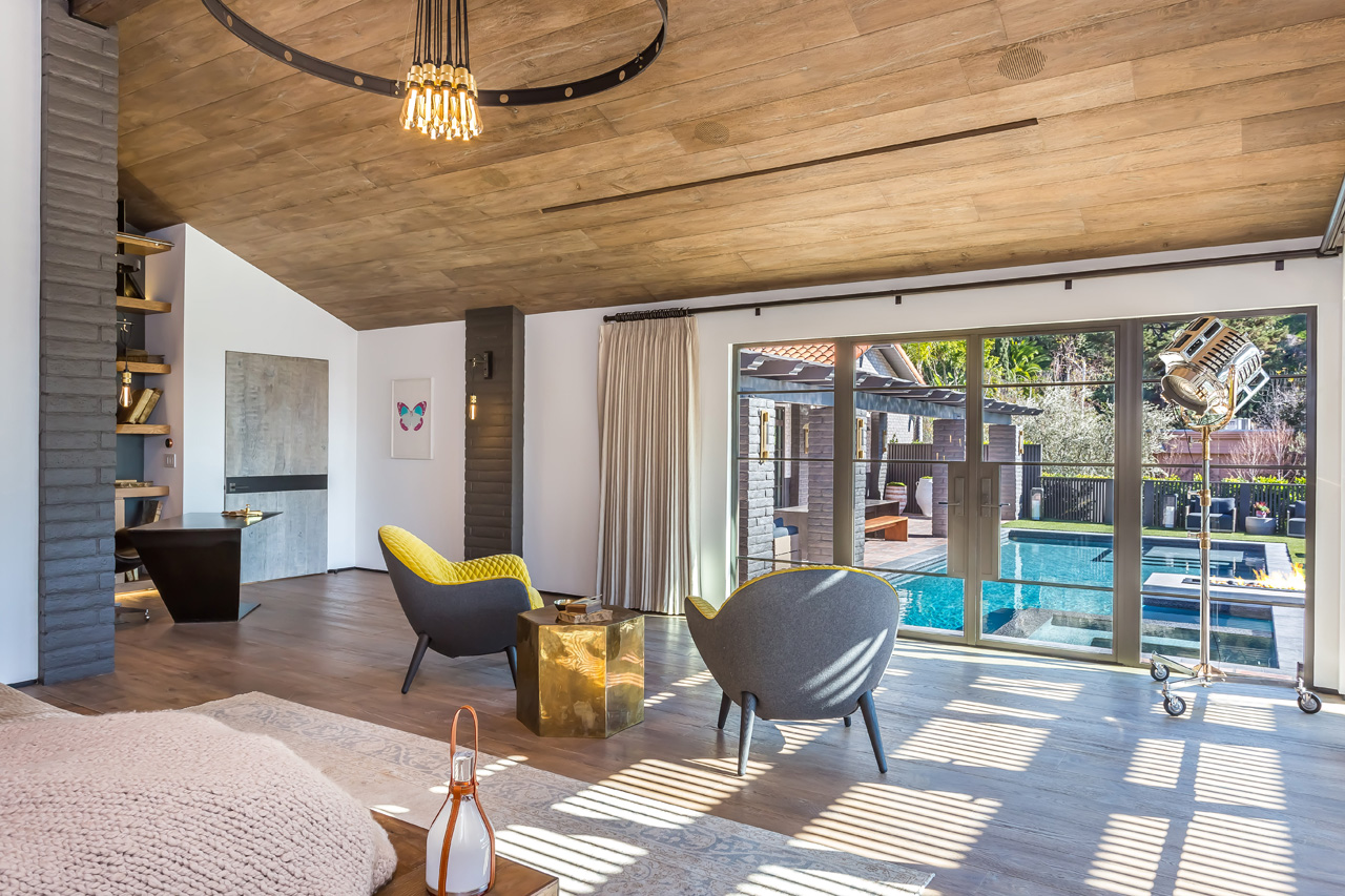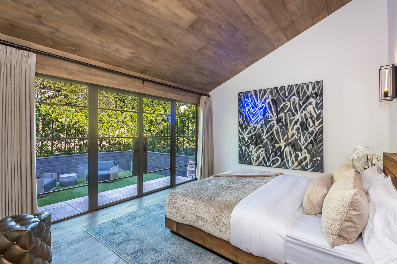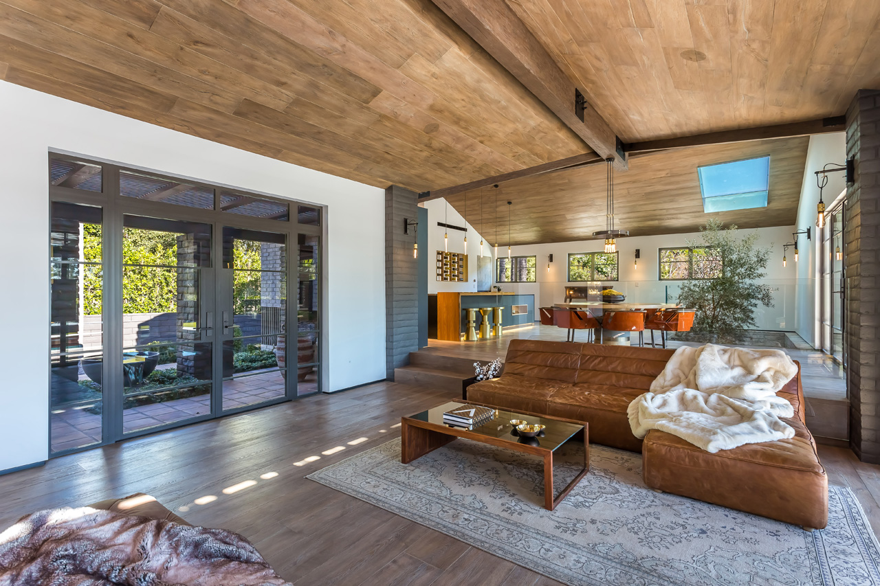 The most exquisitely conceived single-story estate with city/ocean/canyon views on one of the most sought after streets in the Hills. The owner spent more than $4.5M to remodel the home for himself, crafting a timeless masterpiece with soaring wood-lined vaulted ceilings, a master bedroom that turns into a movie theater, private library with a working bell-tower clock, master bath with 15 ft. dual-shower and unlacquered brass fixtures, custom sauna, copper outdoor tub, countertops and vanities made from solid steel, custom built and suede-lined walk-in closets, a hidden 85" living room TV that comes up from a concrete bunker under the house, floating stairs to a wine cellar, copper/steel custom bar with recessed steel and leather niches, four fireplaces, outdoor BBQ/bar, LED lighting and smart home technology throughout. An unrivaled chef's kitchen replete with Gaggenau appliances, Leicht imported German cabinetry, and Mavam coffee maker. Lighting throughout from Buster + Punch, London.