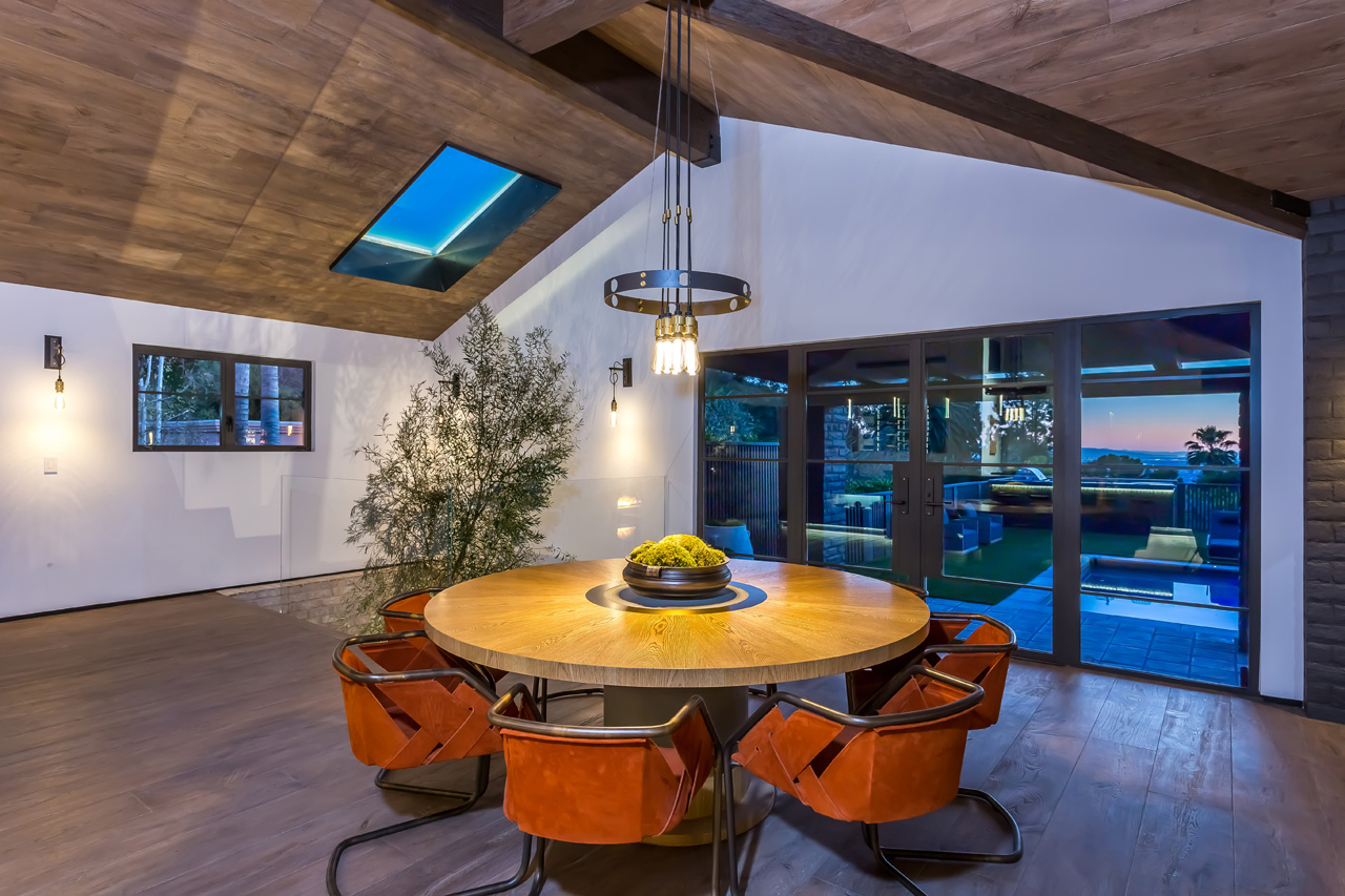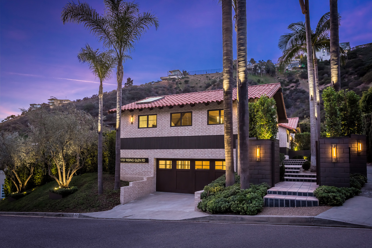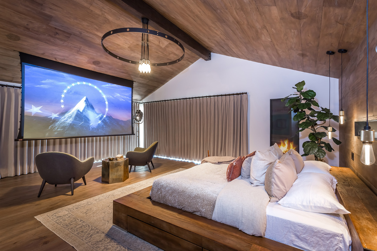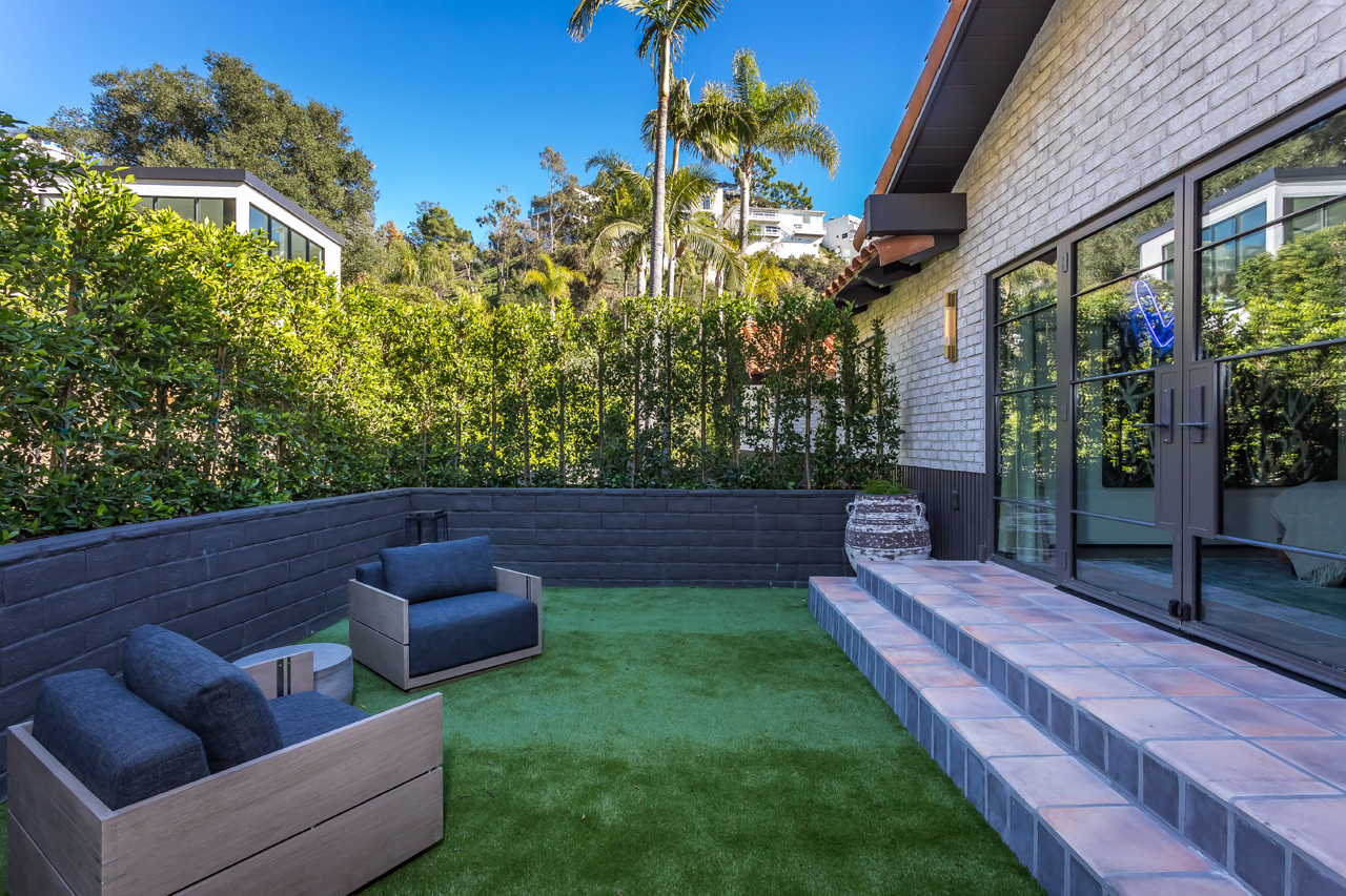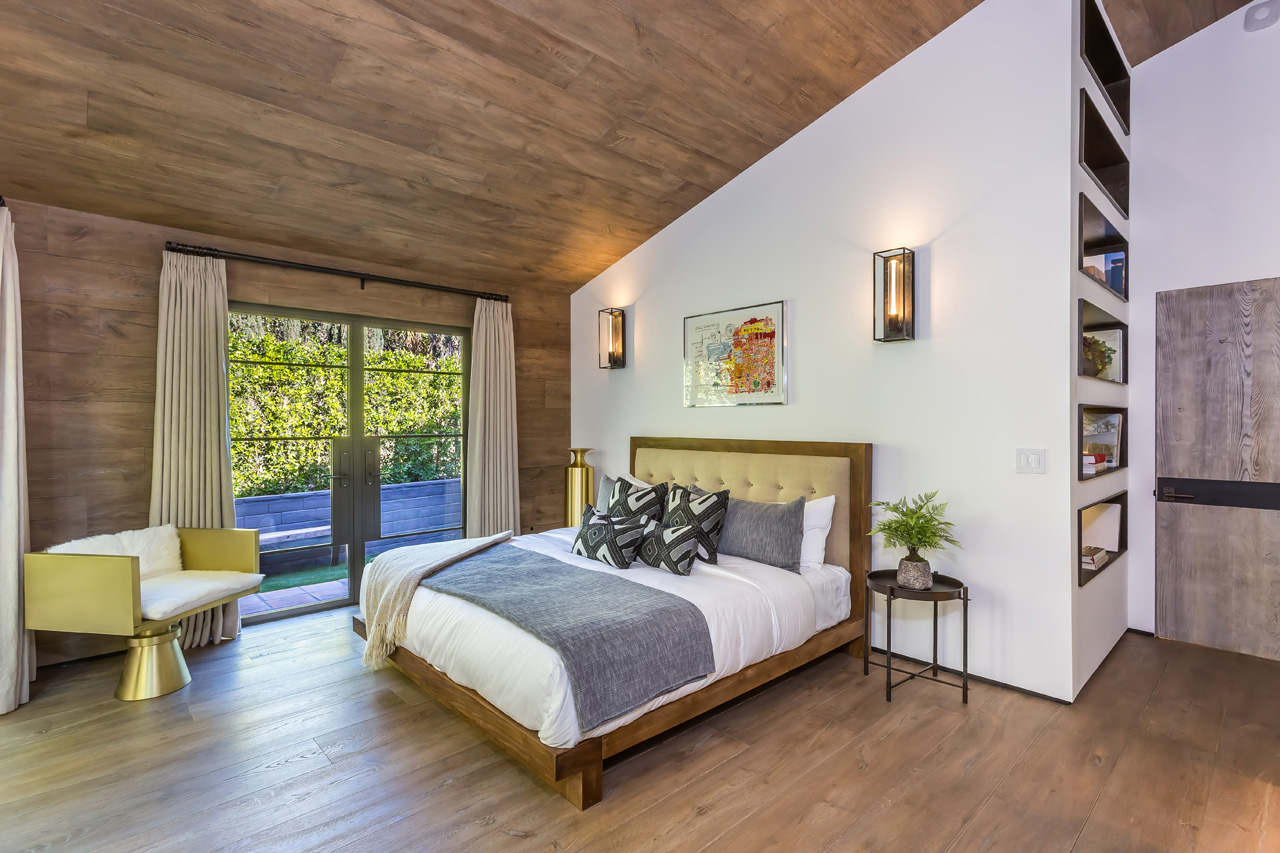 The most exquisitely conceived single-story estate with city/ocean/canyon views on one of the most sought after streets in the Hills. The owner spent more than $4.5M to remodel the home for himself, crafting a timeless masterpiece with soaring wood-lined vaulted ceilings, a master bedroom that turns into a movie theater, private library with a working bell-tower clock, master bath with 15 ft. dual-shower and unlacquered brass fixtures, custom sauna, copper outdoor tub, countertops and vanities made from solid steel, custom built and suede-lined walk-in closets, a hidden 85" living room TV that comes up from a concrete bunker under the house, floating stairs to a wine cellar, copper/steel custom bar with recessed steel and leather niches, four fireplaces, outdoor BBQ/bar, LED lighting and smart home technology throughout. An unrivaled chef's kitchen replete with Gaggenau appliances, Leicht imported German cabinetry, and Mavam coffee maker. Lighting throughout from Buster + Punch, London.