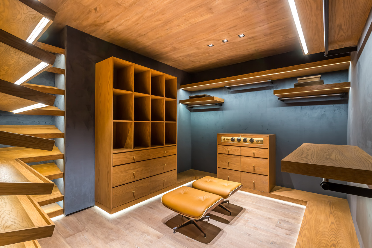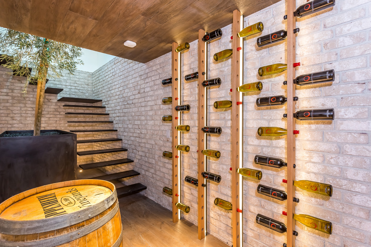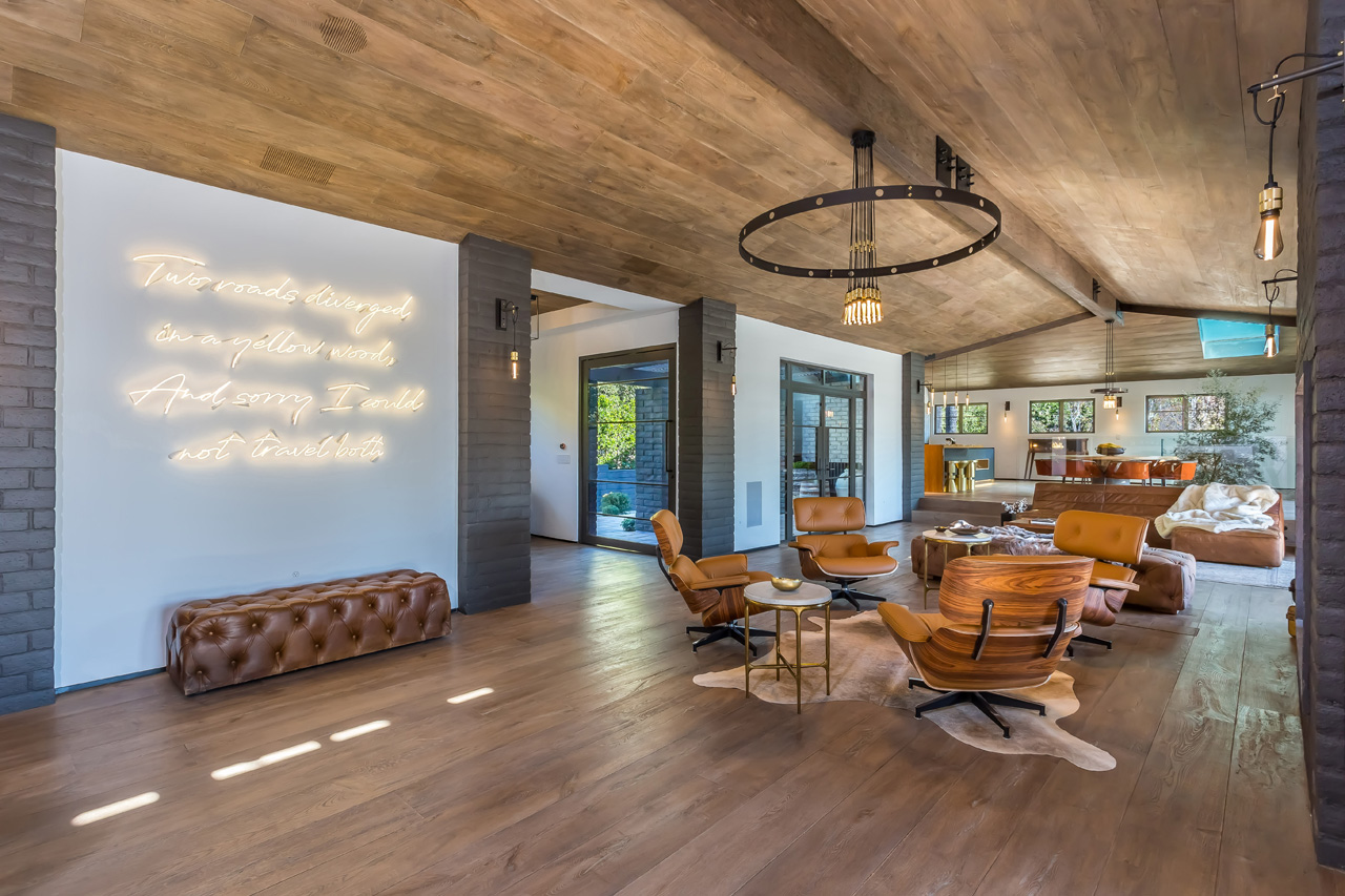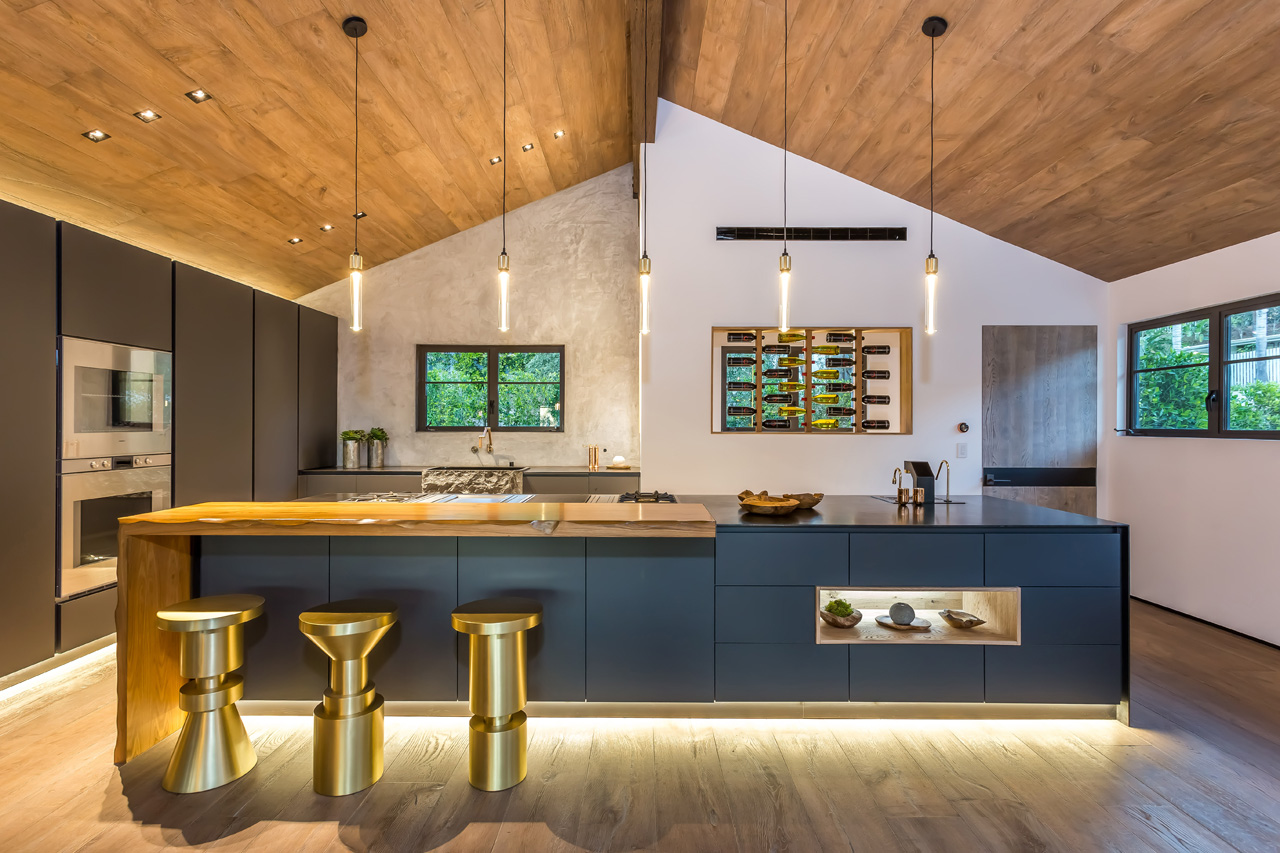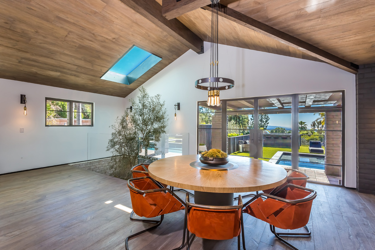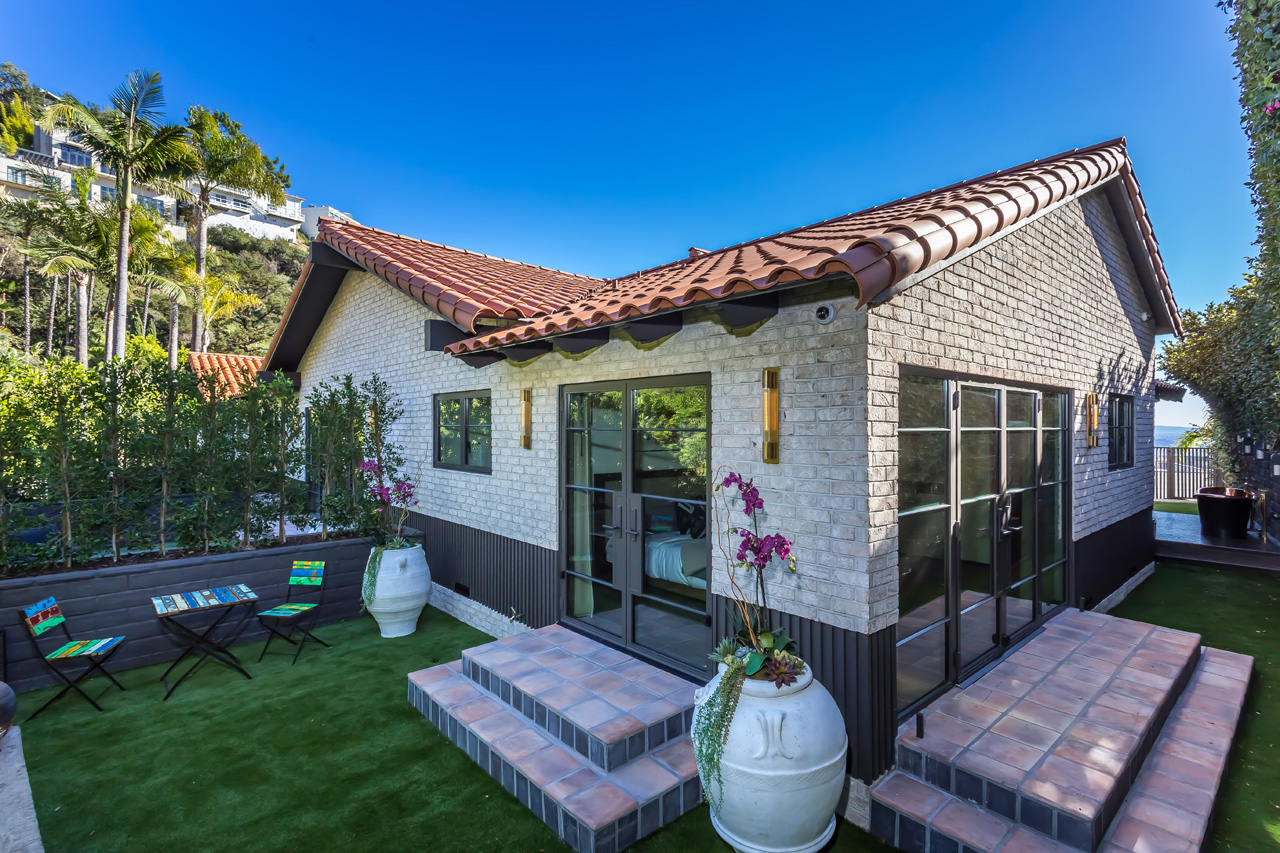 The most exquisitely conceived single-story estate with city/ocean/canyon views on one of the most sought after streets in the Hills. The owner spent more than $4.5M to remodel the home for himself, crafting a timeless masterpiece with soaring wood-lined vaulted ceilings, a master bedroom that turns into a movie theater, private library with a working bell-tower clock, master bath with 15 ft. dual-shower and unlacquered brass fixtures, custom sauna, copper outdoor tub, countertops and vanities made from solid steel, custom built and suede-lined walk-in closets, a hidden 85" living room TV that comes up from a concrete bunker under the house, floating stairs to a wine cellar, copper/steel custom bar with recessed steel and leather niches, four fireplaces, outdoor BBQ/bar, LED lighting and smart home technology throughout. An unrivaled chef's kitchen replete with Gaggenau appliances, Leicht imported German cabinetry, and Mavam coffee maker. Lighting throughout from Buster + Punch, London.