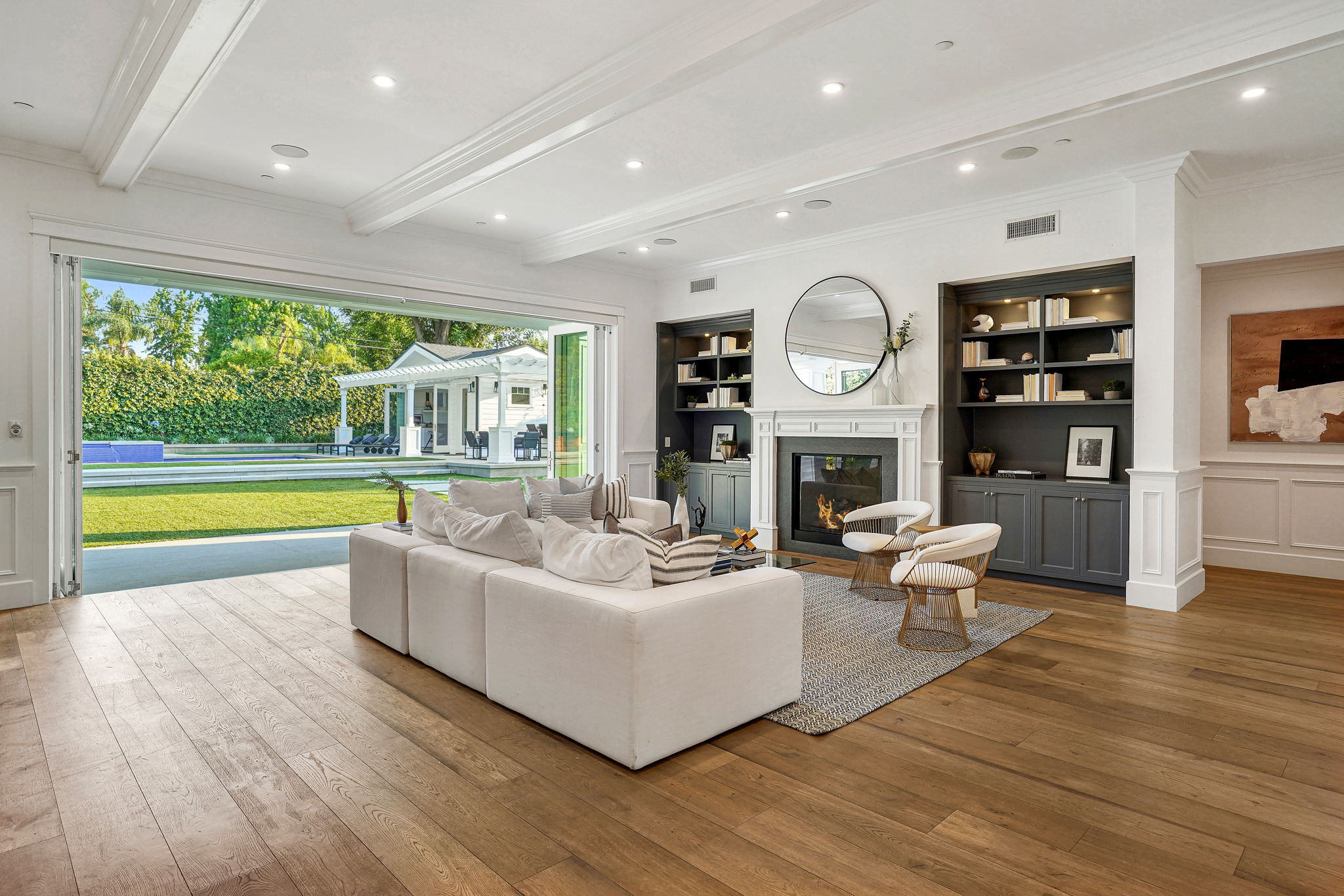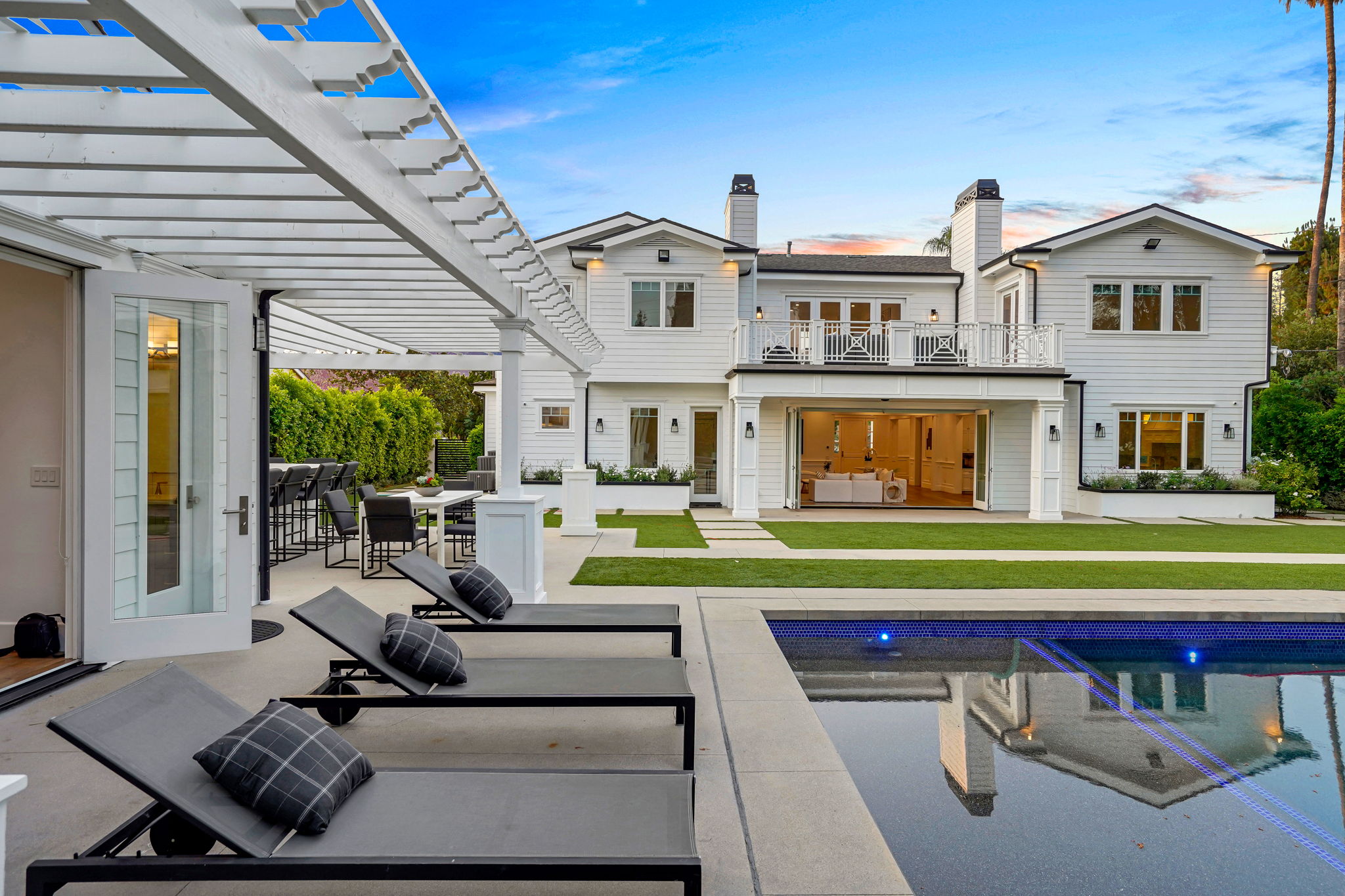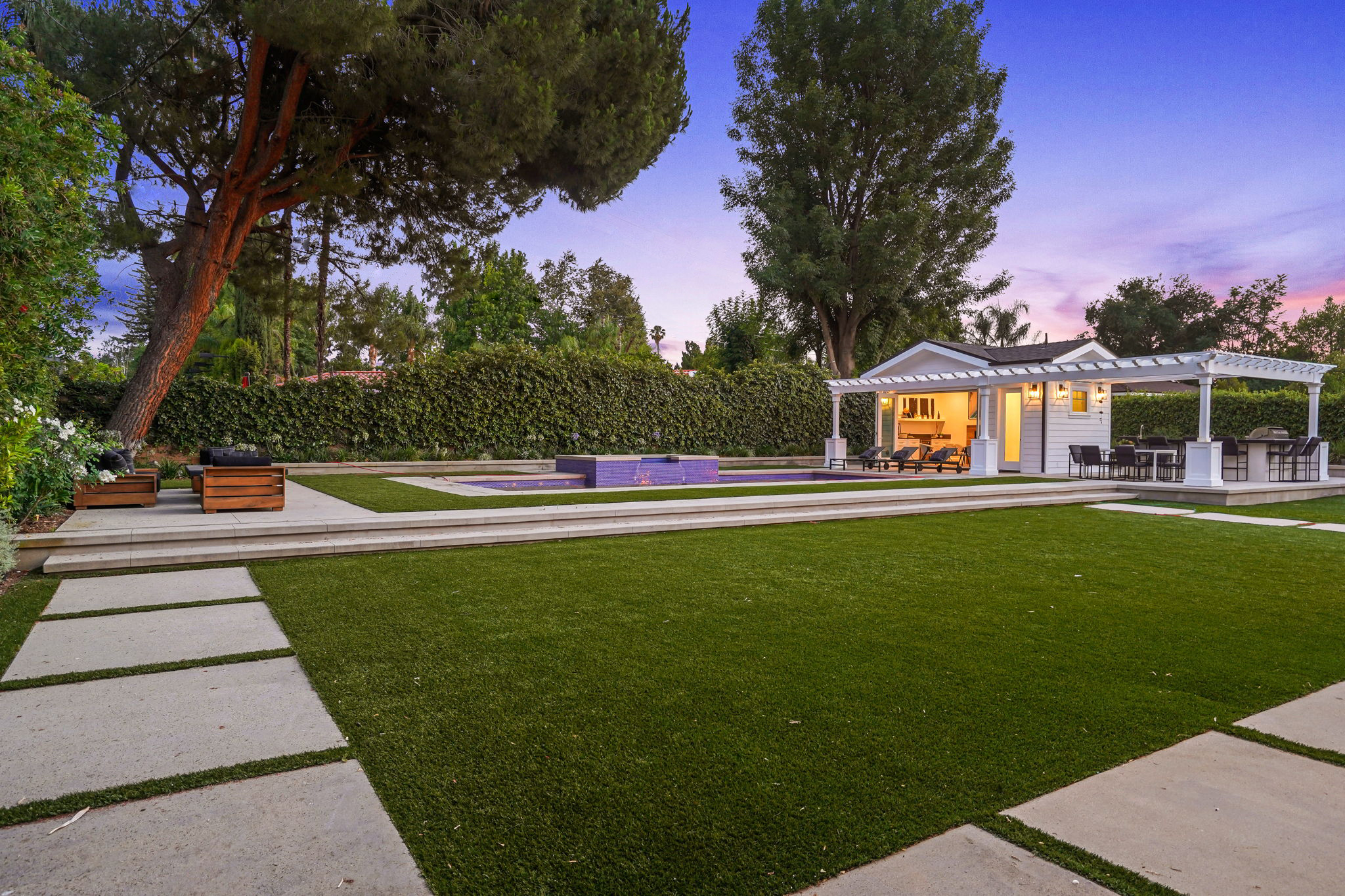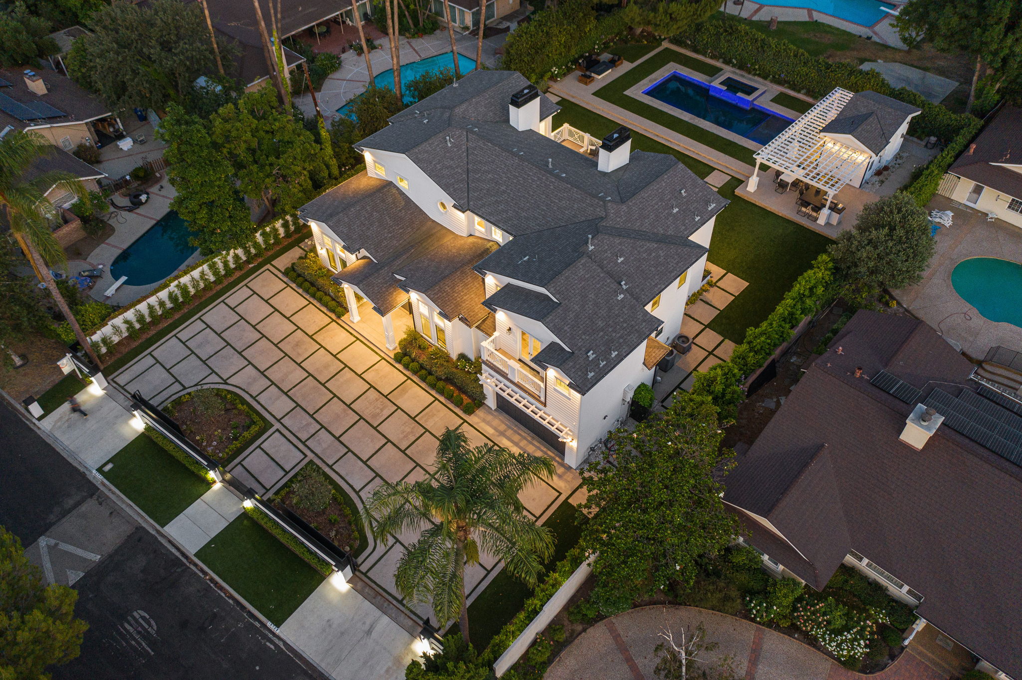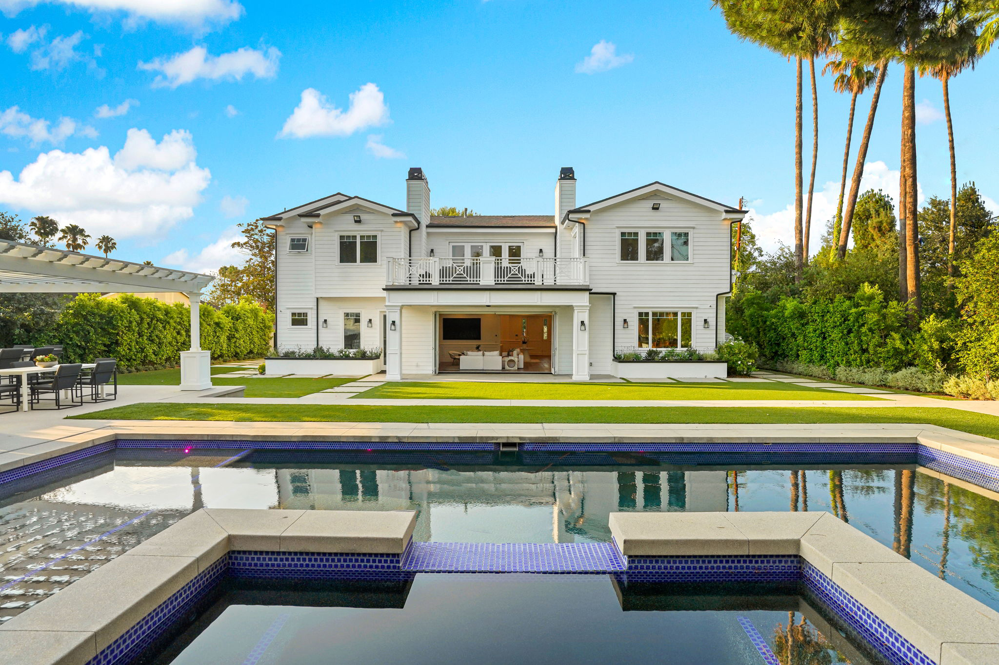 This masterfully designed 5,800 sq. ft. Cape Cod style estate sits on nearly 1/2 an acre behind private gates South of the Blvd. A private circular driveway welcomes you to a light filled home with refined details throughout. The formal living and dining areas lead through a sliding glass door to a massive grassy backyard and fire pit, with an outdoor cabana and BBQ area, creating an ideal flow for indoor/outdoor entertaining with large saltwater pool and spa. The gourmet chef’s kitchen includes 2 center-islands, custom cabinets and Thermador stainless steel appliances with adjacent Butler’s area/pantry and wine room. The 1st floor boasts an eye-catching theater along with 1-bedroom suite, with backyard access. The 2nd floor offers 4-bedroom suites with walk-in closets and bathrooms. The grand owners suite includes a walk-in closet, fireplace and a spacious bathroom with porcelain floors, marble shower, a free-standing tub and double vanity dressing area. The owners suite also impresses with designer details such as crown molding, hardwood flooring and high cathedral ceiling with French doors leading to a large balcony facing the back yard. Smart Home system controls - lighting, temperature & security cameras. Zoned for desirable schools and within close proximity to Ventura Boulevard with an easy 101 & 405 commute to anywhere in LA.