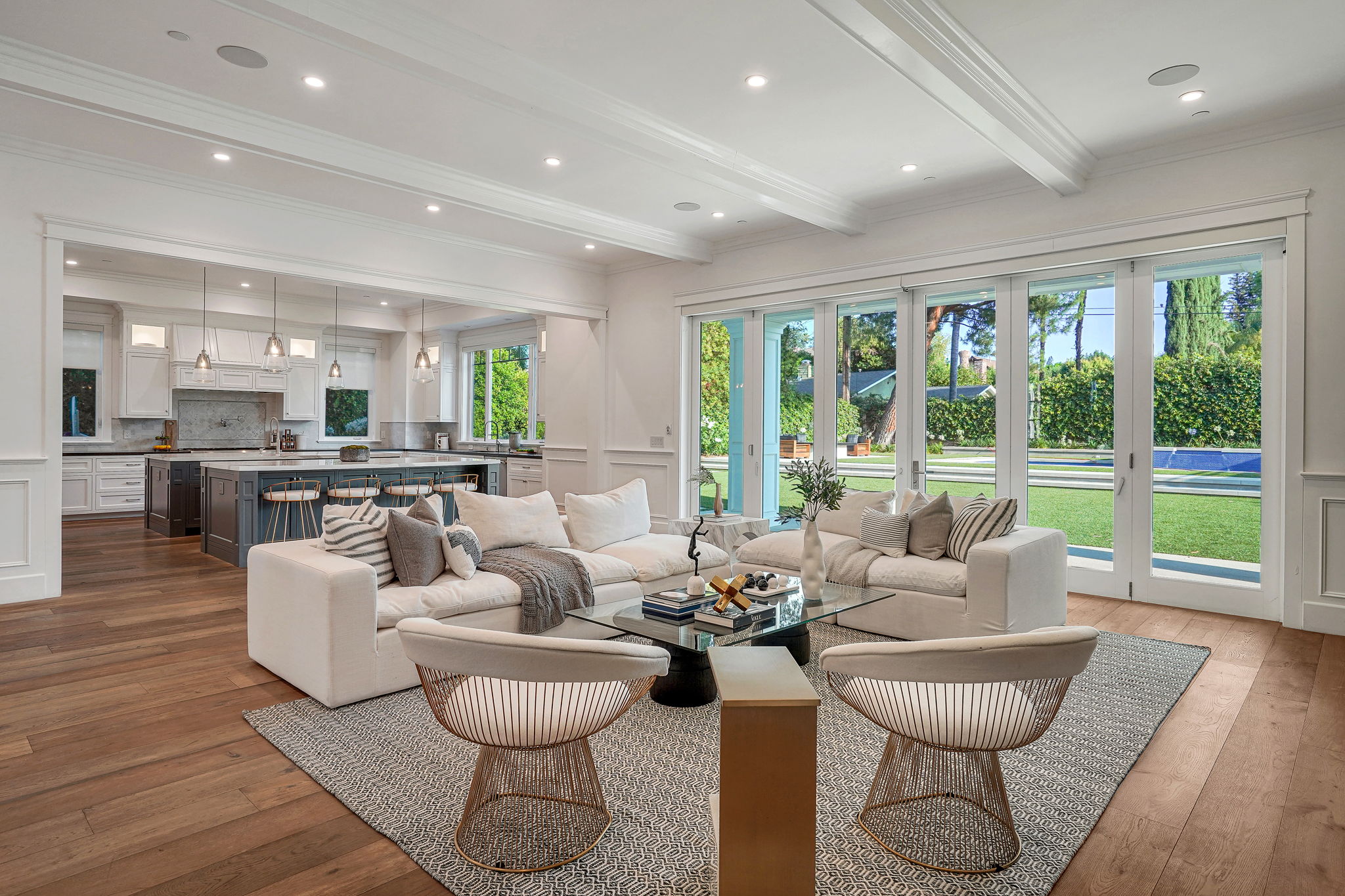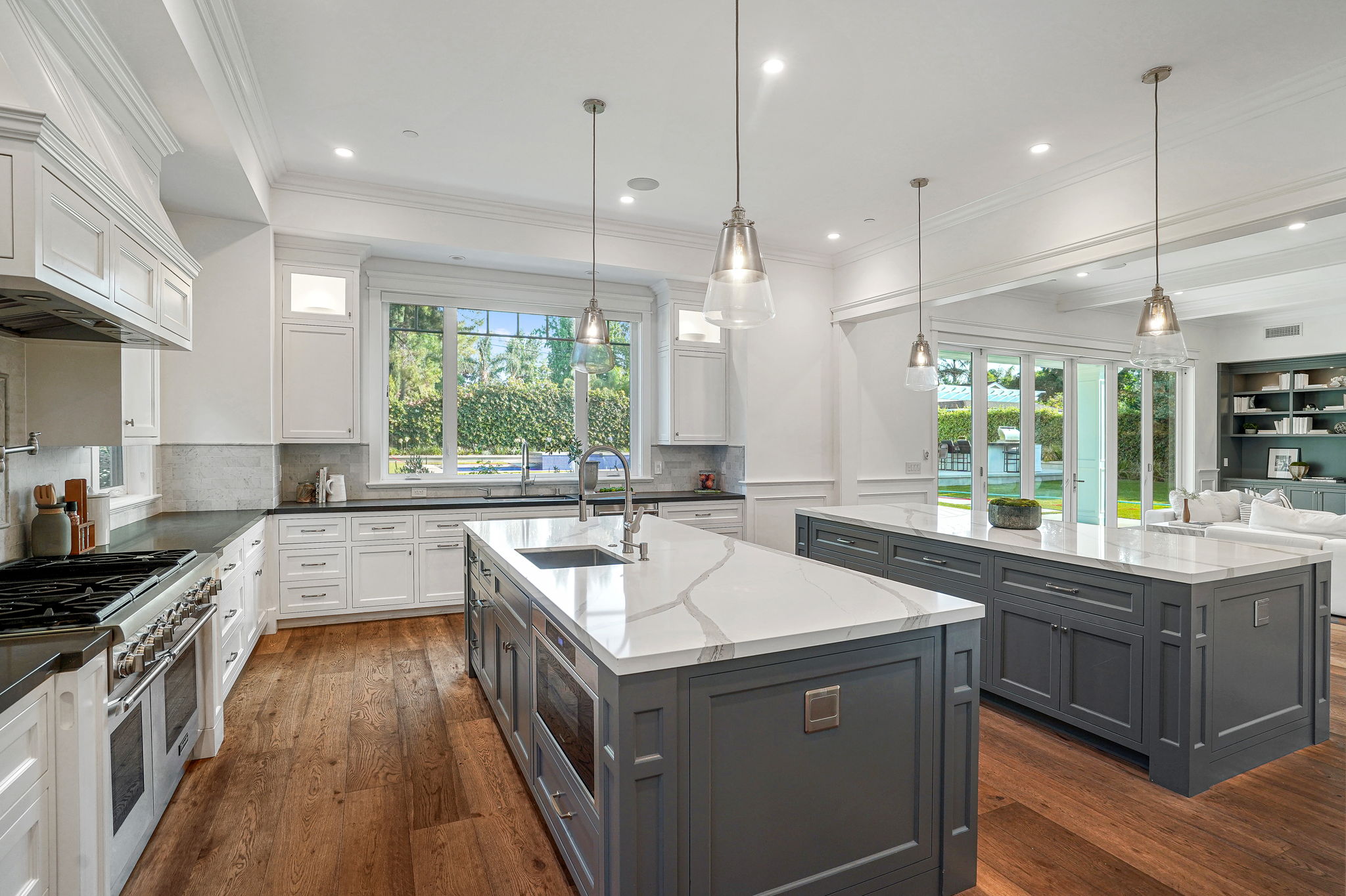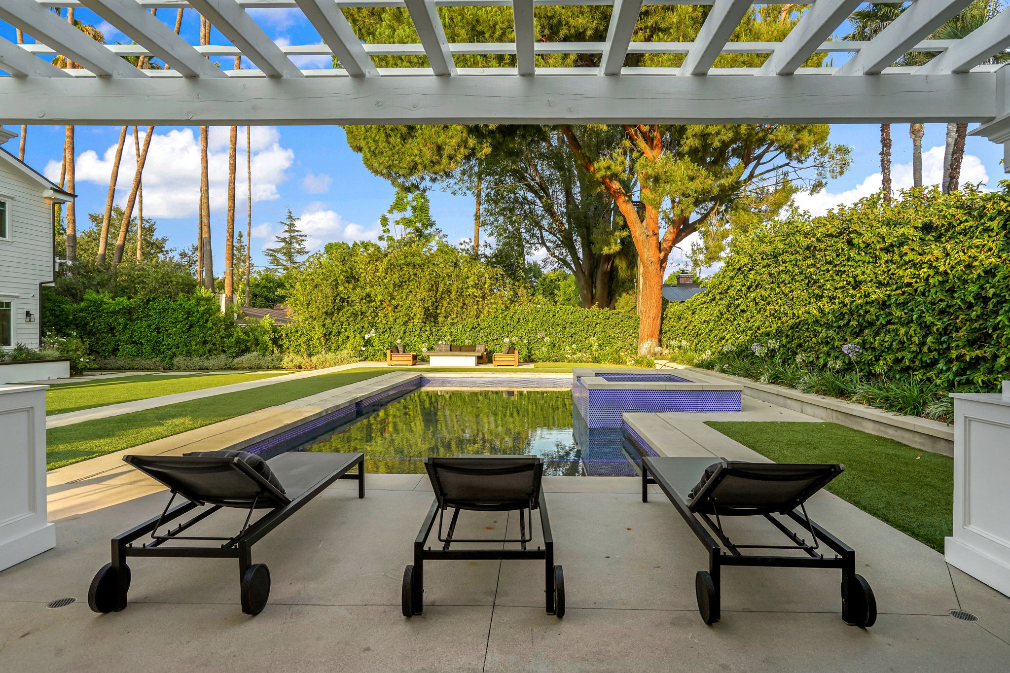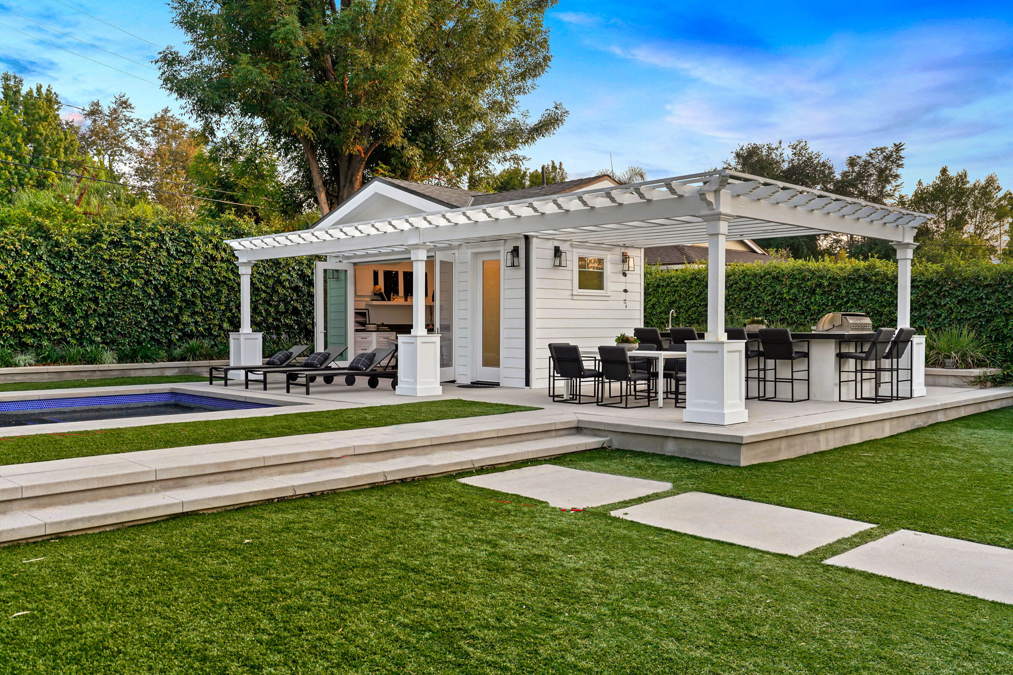 This masterfully designed 5,800 sq. ft. Cape Cod style estate sits on nearly 1/2 an acre behind private gates South of the Blvd. A private circular driveway welcomes you to a light filled home with refined details throughout. The formal living and dining areas lead through a sliding glass door to a massive grassy backyard and fire pit, with an outdoor cabana and BBQ area, creating an ideal flow for indoor/outdoor entertaining with large saltwater pool and spa. The gourmet chef’s kitchen includes 2 center-islands, custom cabinets and Thermador stainless steel appliances with adjacent Butler’s area/pantry and wine room. The 1st floor boasts an eye-catching theater along with 1-bedroom suite, with backyard access. The 2nd floor offers 4-bedroom suites with walk-in closets and bathrooms. The grand owners suite includes a walk-in closet, fireplace and a spacious bathroom with porcelain floors, marble shower, a free-standing tub and double vanity dressing area. The owners suite also impresses with designer details such as crown molding, hardwood flooring and high cathedral ceiling with French doors leading to a large balcony facing the back yard. Smart Home system controls - lighting, temperature & security cameras. Zoned for desirable schools and within close proximity to Ventura Boulevard with an easy 101 & 405 commute to anywhere in LA.