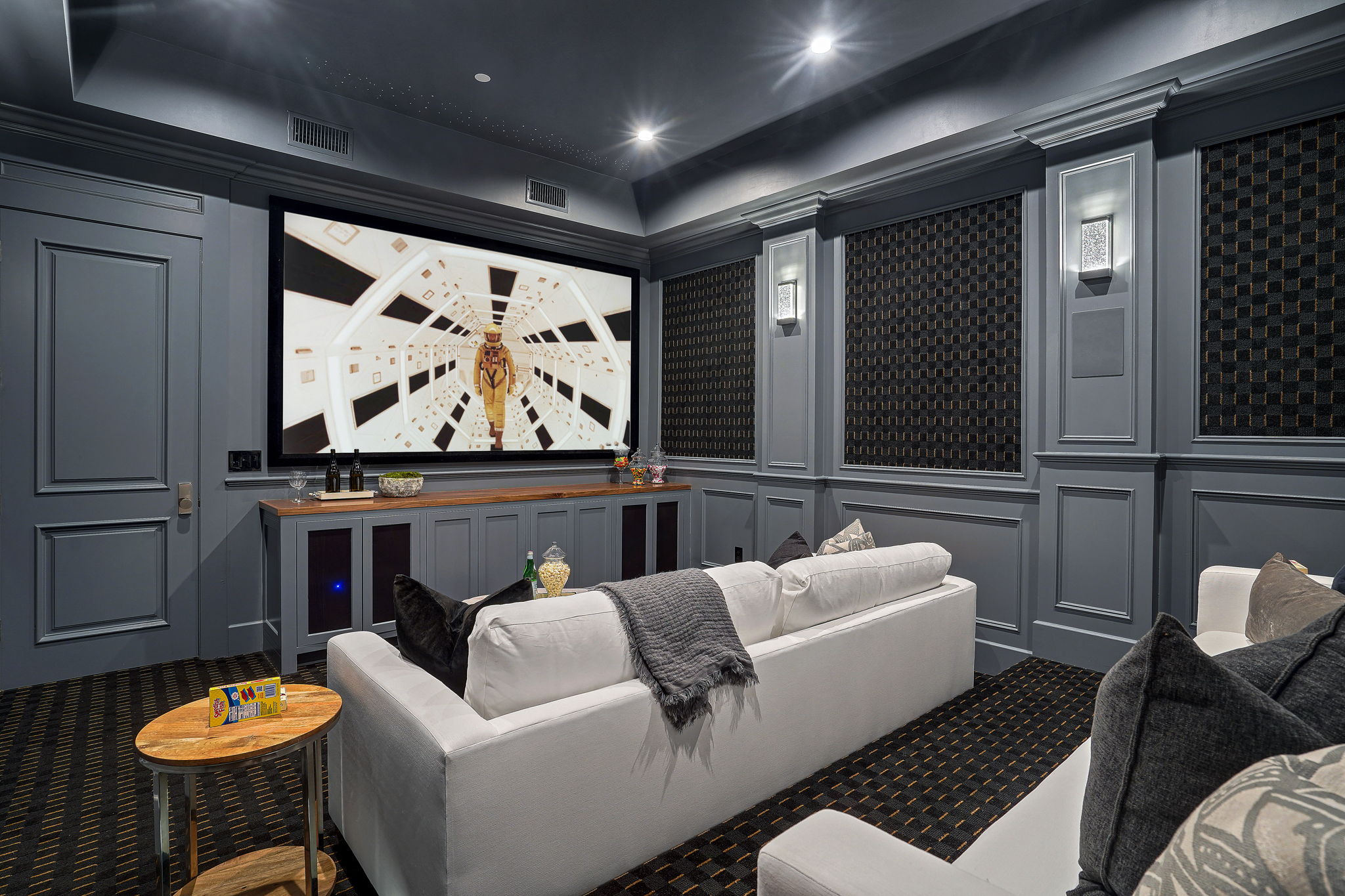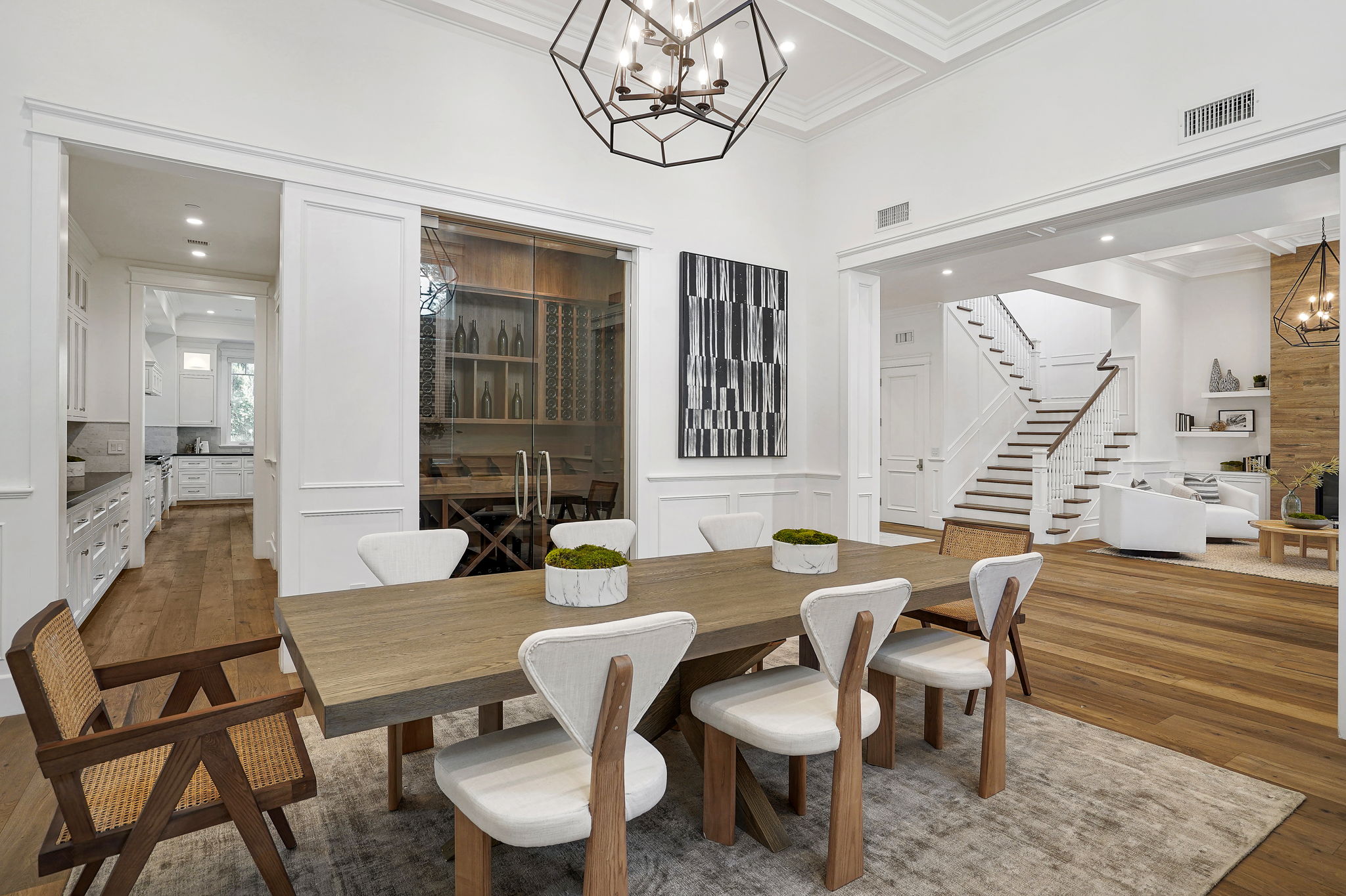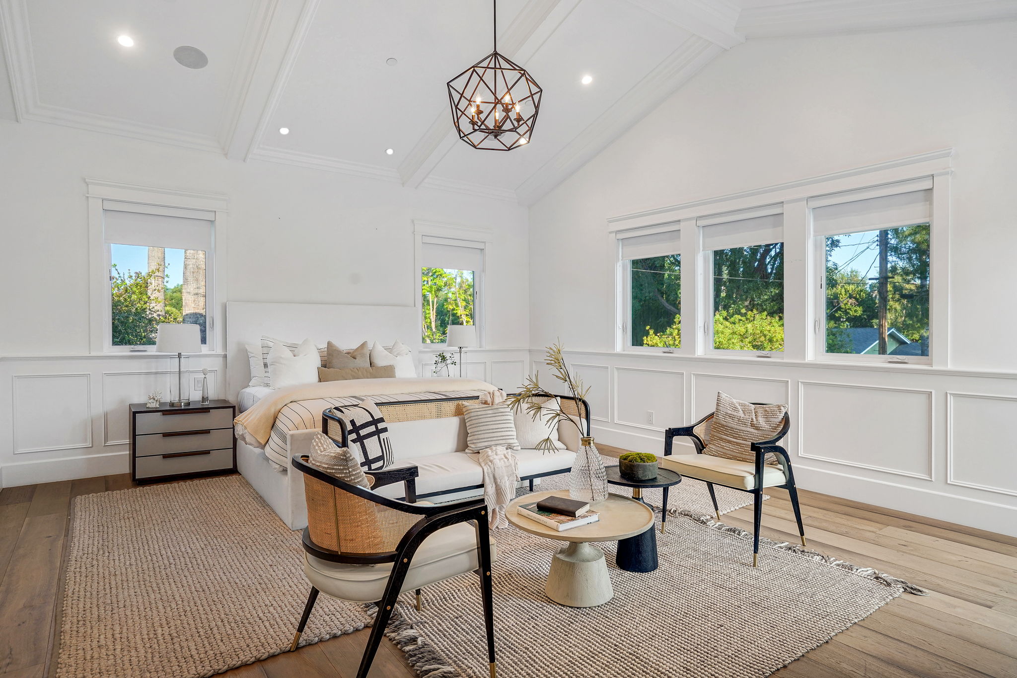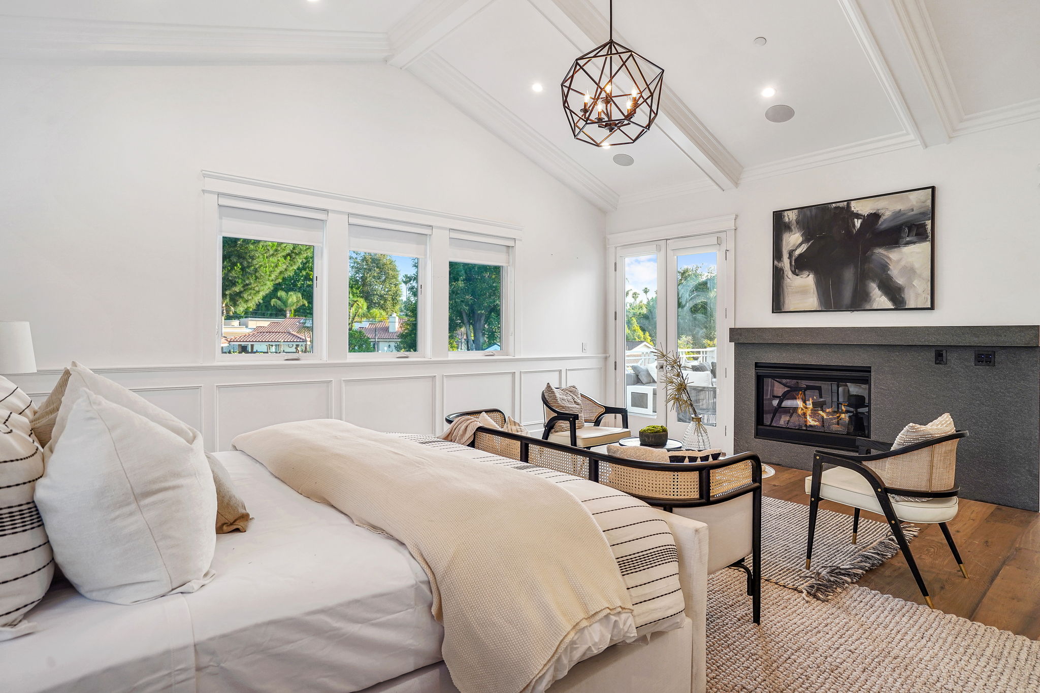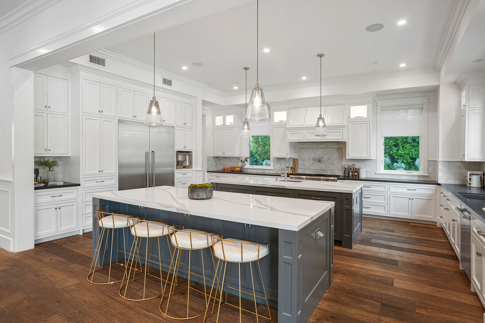 This masterfully designed 5,800 sq. ft. Cape Cod style estate sits on nearly 1/2 an acre behind private gates South of the Blvd. A private circular driveway welcomes you to a light filled home with refined details throughout. The formal living and dining areas lead through a sliding glass door to a massive grassy backyard and fire pit, with an outdoor cabana and BBQ area, creating an ideal flow for indoor/outdoor entertaining with large saltwater pool and spa. The gourmet chef’s kitchen includes 2 center-islands, custom cabinets and Thermador stainless steel appliances with adjacent Butler’s area/pantry and wine room. The 1st floor boasts an eye-catching theater along with 1-bedroom suite, with backyard access. The 2nd floor offers 4-bedroom suites with walk-in closets and bathrooms. The grand owners suite includes a walk-in closet, fireplace and a spacious bathroom with porcelain floors, marble shower, a free-standing tub and double vanity dressing area. The owners suite also impresses with designer details such as crown molding, hardwood flooring and high cathedral ceiling with French doors leading to a large balcony facing the back yard. Smart Home system controls - lighting, temperature & security cameras. Zoned for desirable schools and within close proximity to Ventura Boulevard with an easy 101 & 405 commute to anywhere in LA.