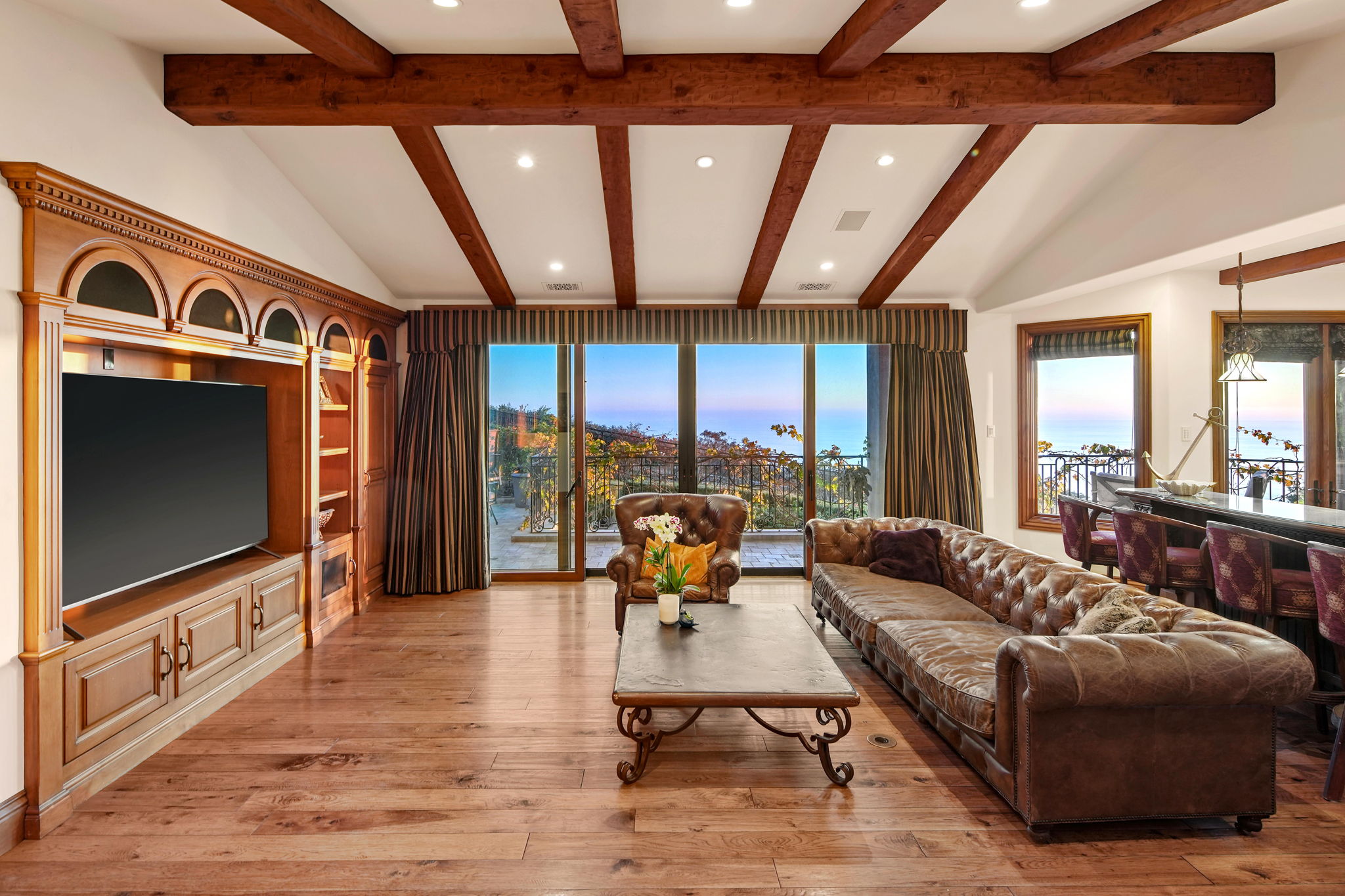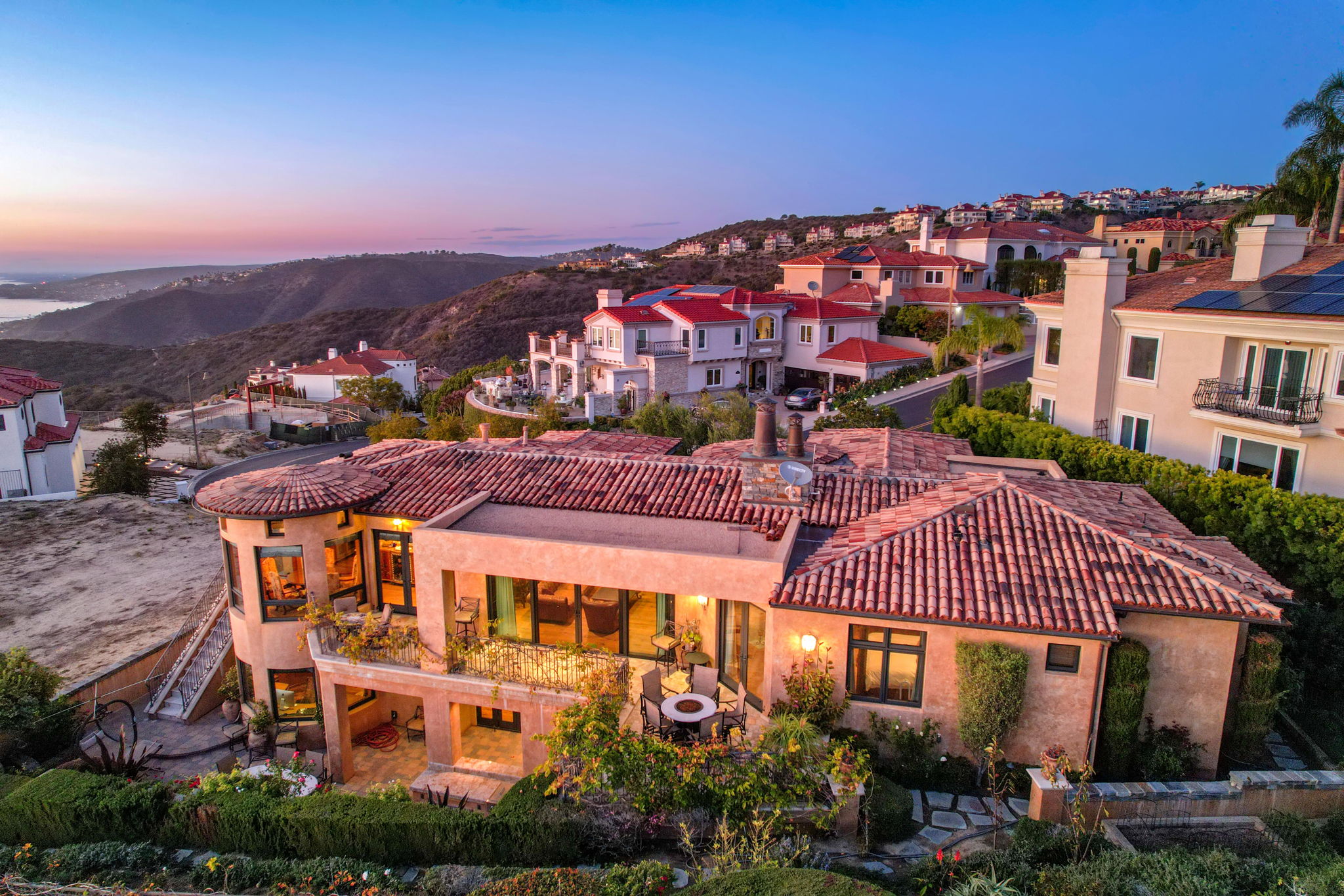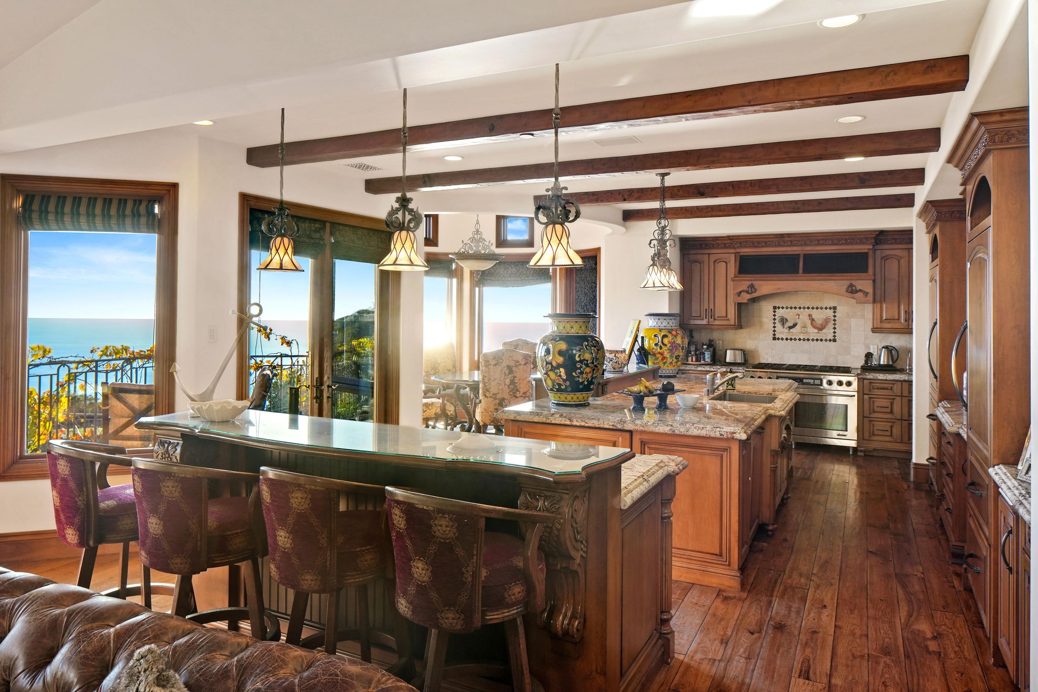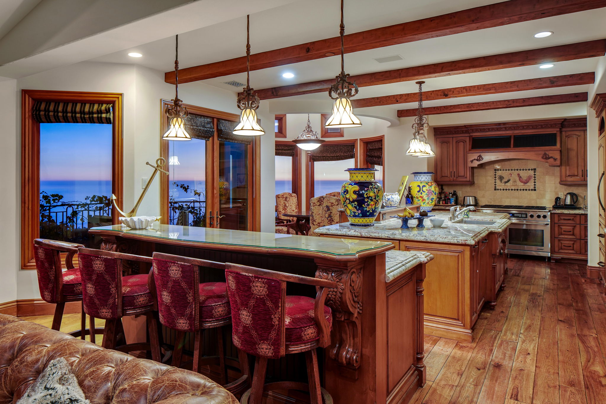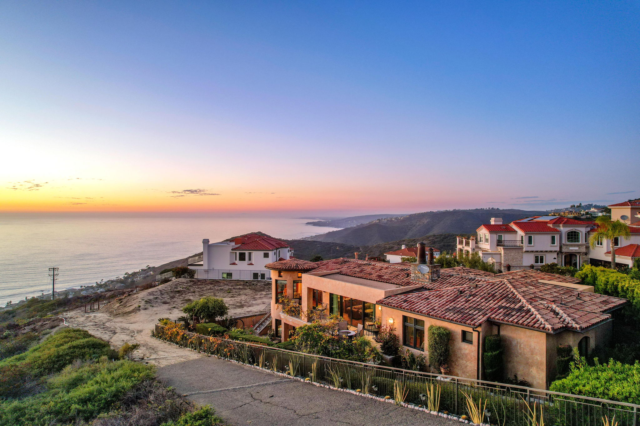 Located within the private and exclusive guard-gated community of Laguna Sur, this exquisite 5,052 sq. ft. home offers 4 beds, 6 baths, unparalleled luxury finishes throughout, and sweeping unobstructed ocean views. Built using only the finest materials worked by old-world master craftsmen, this home is an entertainer's dream featuring an impressive 8 ft. tall glass and wrought iron door, inviting you into the spacious open floor plan with beamed ceilings. Adjacent to the formal dining room, the gourmet kitchen comes replete with an oversized island, serving bar, granite countertops, custom cabinetry with artisan glass work, Miele and Subzero appliances, and a cozy breakfast nook with views of the ocean. The spacious primary suite boasts a fireplace, a private terrace with ocean views, custom built-in cabinets, and a large bathroom with a hot tub and double vanity. The grand media room has a 120" screen and an upgraded sound system. The stately office has walls covered in warm-toned paneled wood. Other features include a beautiful wrought iron spiral staircase, a large elevator, and solid hickory planked flooring and alder wood crown molding/baseboards throughout. The outdoor terrace enjoys breathtaking ocean views and provides all you need to live the dreamy California Coastal Lifestyle.