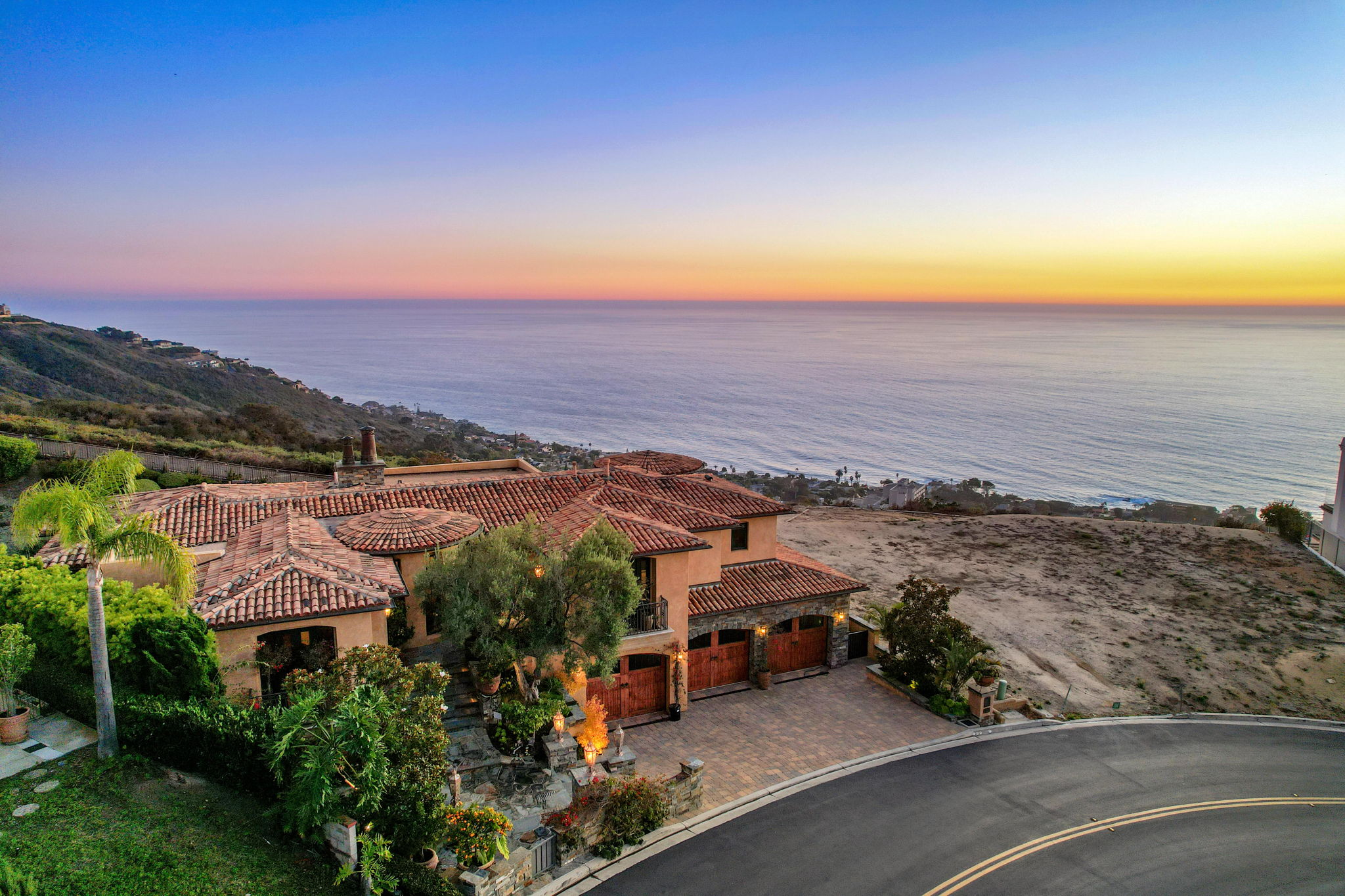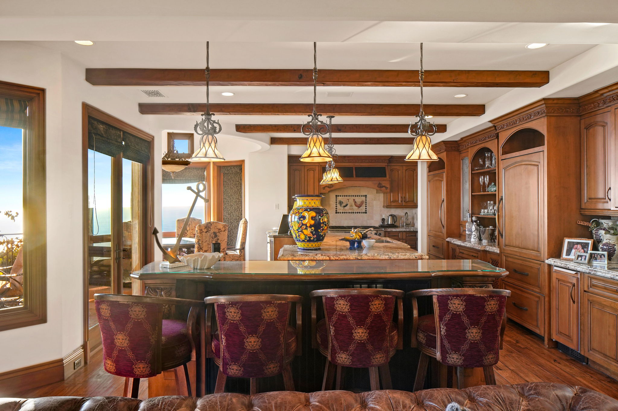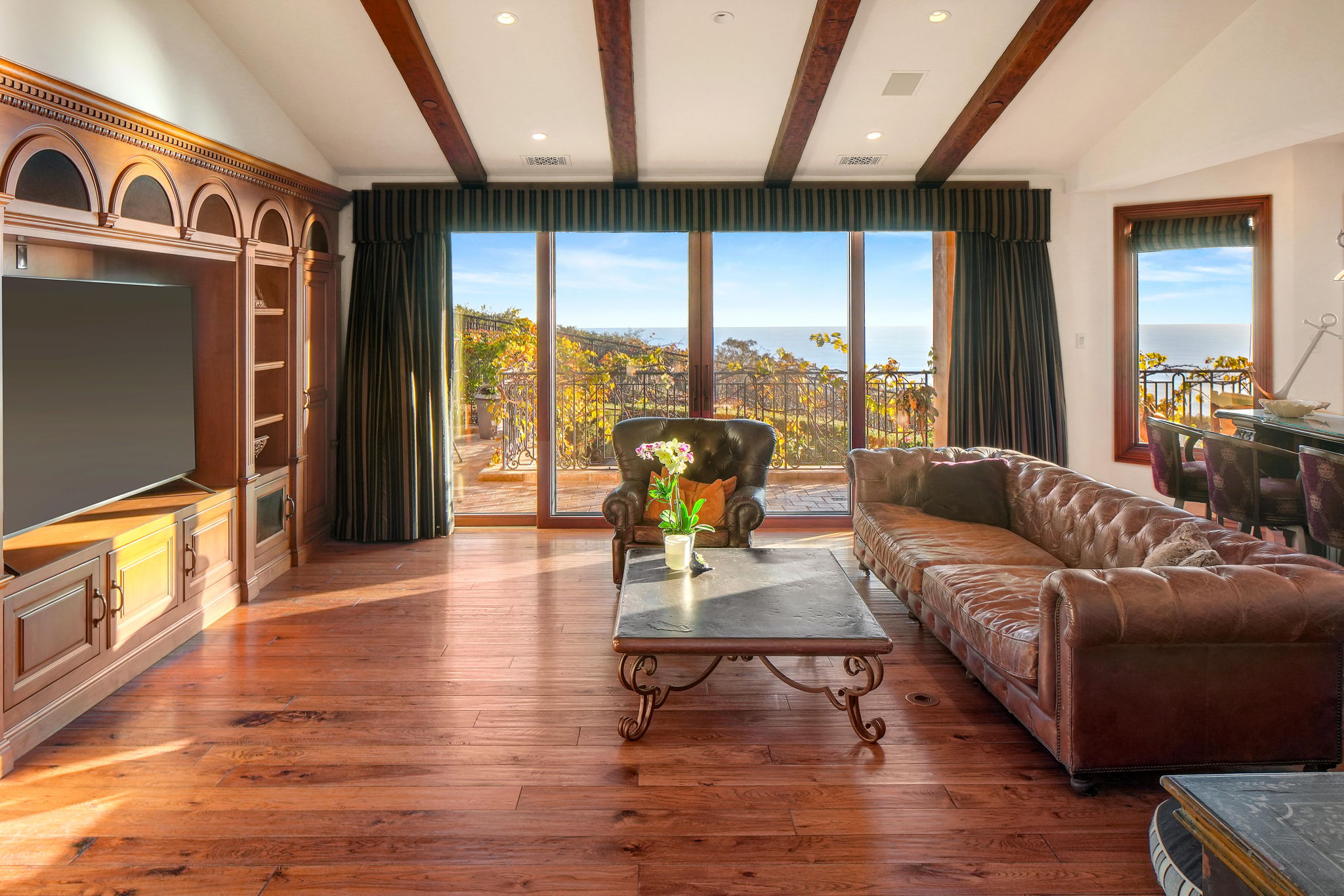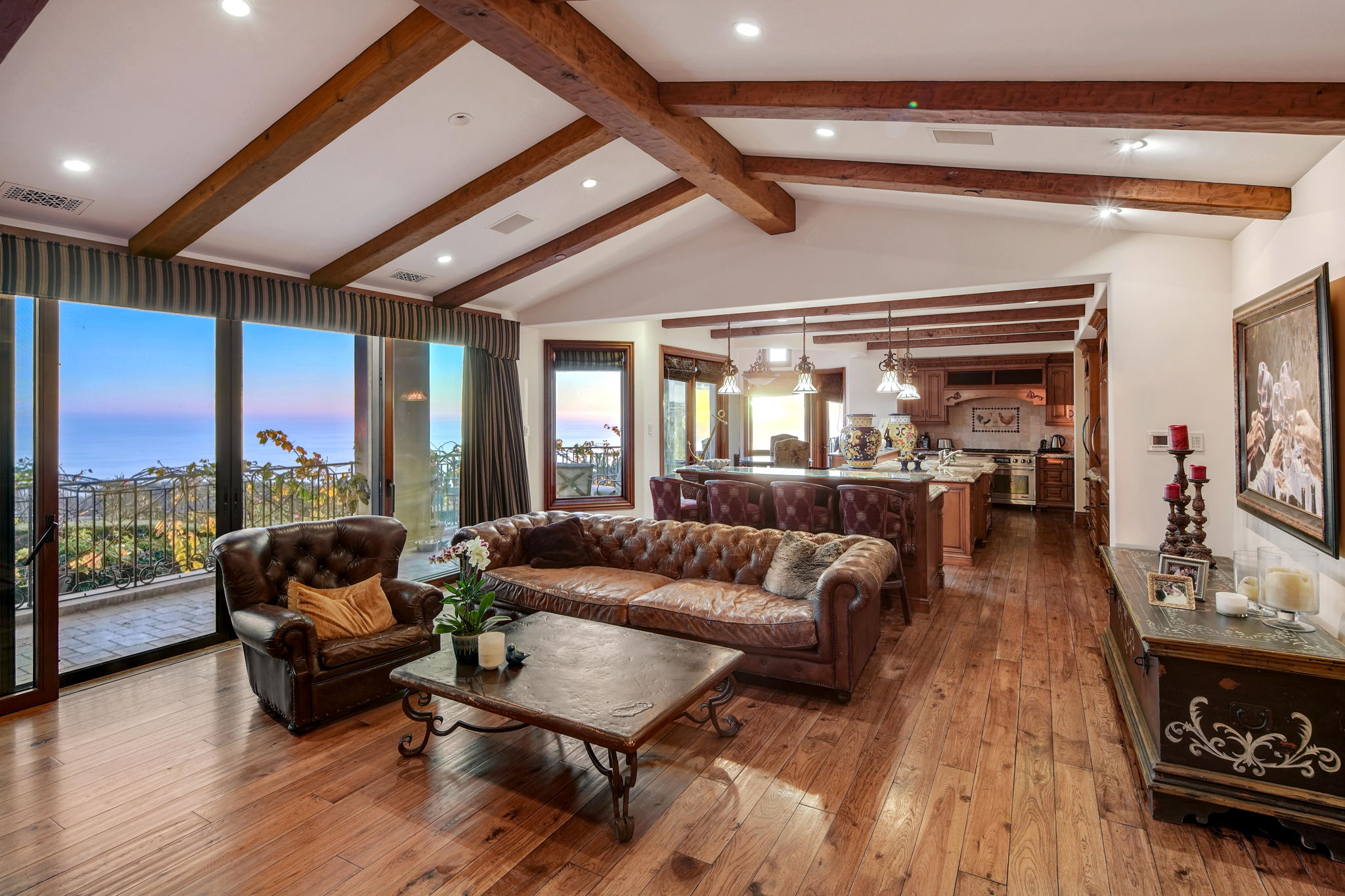 Located within the private and exclusive guard-gated community of Laguna Sur, this exquisite 5,052 sq. ft. home offers 4 beds, 6 baths, unparalleled luxury finishes throughout, and sweeping unobstructed ocean views. Built using only the finest materials worked by old-world master craftsmen, this home is an entertainer's dream featuring an impressive 8 ft. tall glass and wrought iron door, inviting you into the spacious open floor plan with beamed ceilings. Adjacent to the formal dining room, the gourmet kitchen comes replete with an oversized island, serving bar, granite countertops, custom cabinetry with artisan glass work, Miele and Subzero appliances, and a cozy breakfast nook with views of the ocean. The spacious primary suite boasts a fireplace, a private terrace with ocean views, custom built-in cabinets, and a large bathroom with a hot tub and double vanity. The grand media room has a 120" screen and an upgraded sound system. The stately office has walls covered in warm-toned paneled wood. Other features include a beautiful wrought iron spiral staircase, a large elevator, and solid hickory planked flooring and alder wood crown molding/baseboards throughout. The outdoor terrace enjoys breathtaking ocean views and provides all you need to live the dreamy California Coastal Lifestyle.