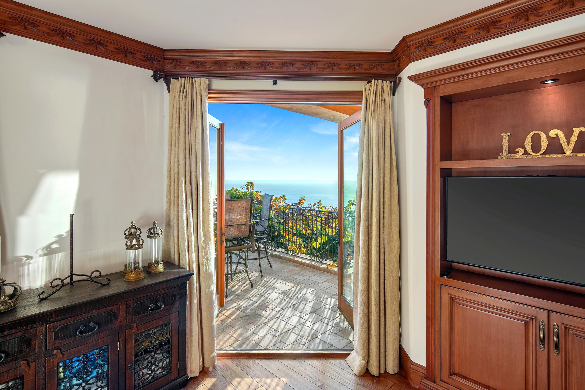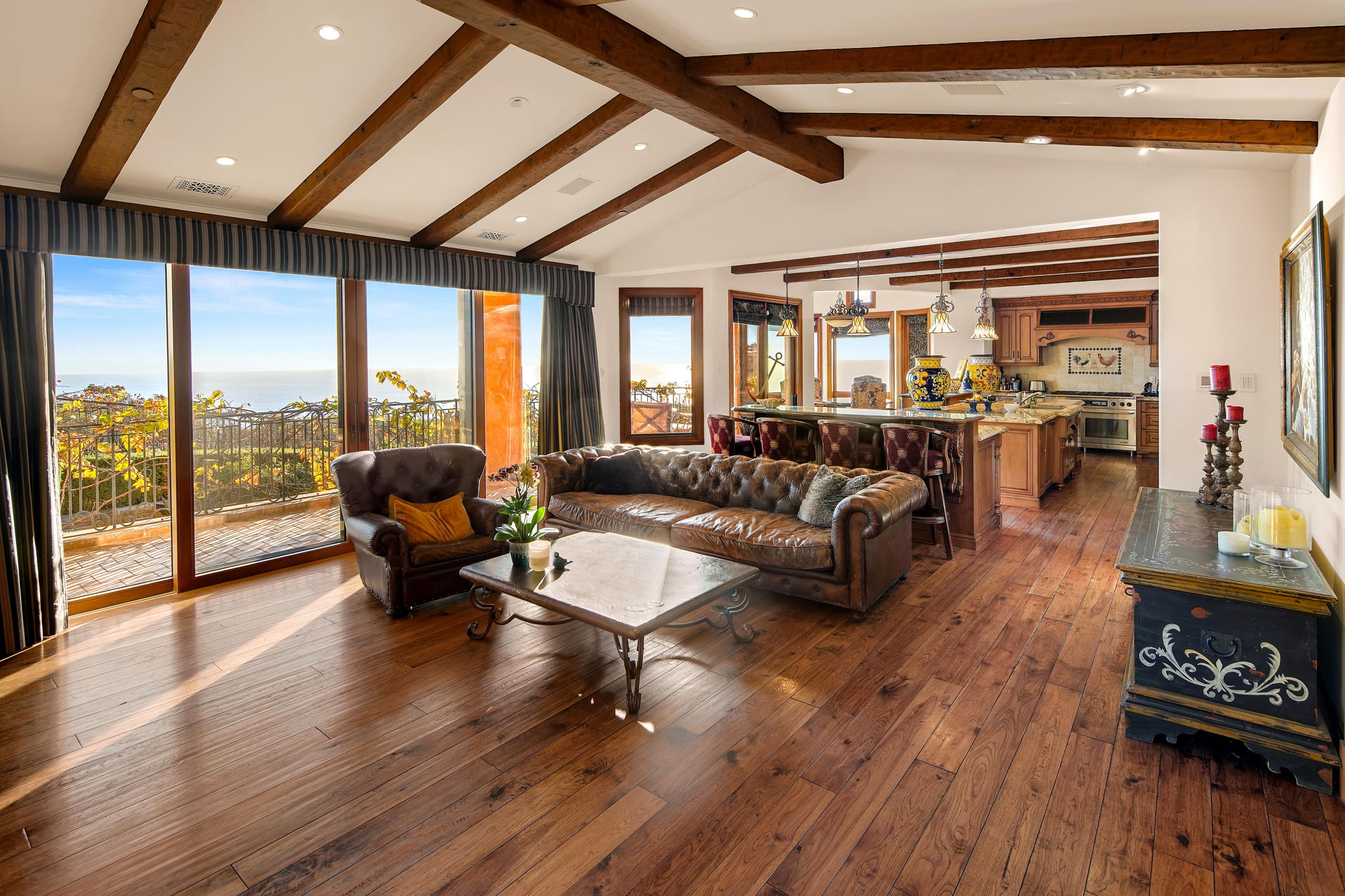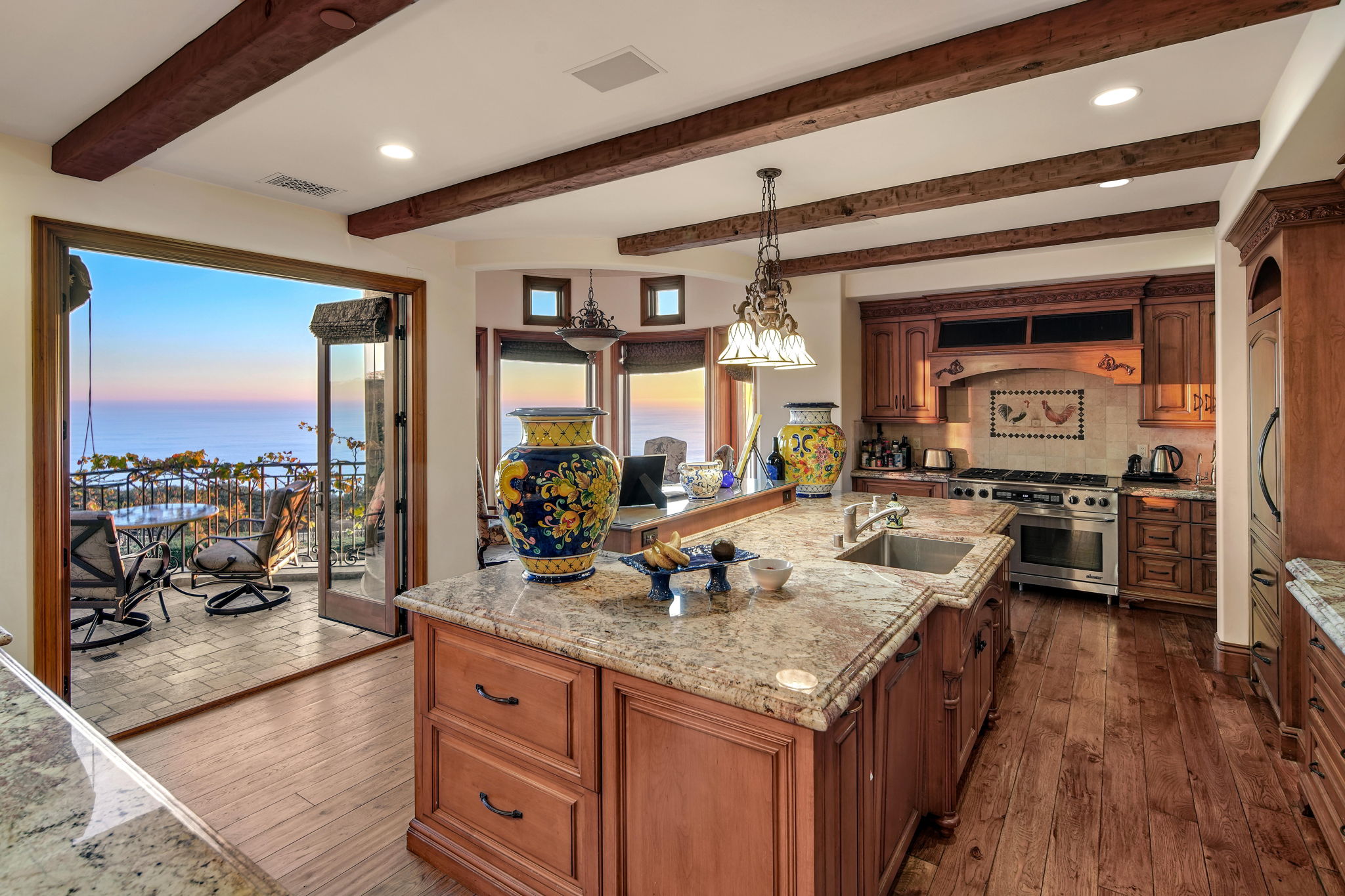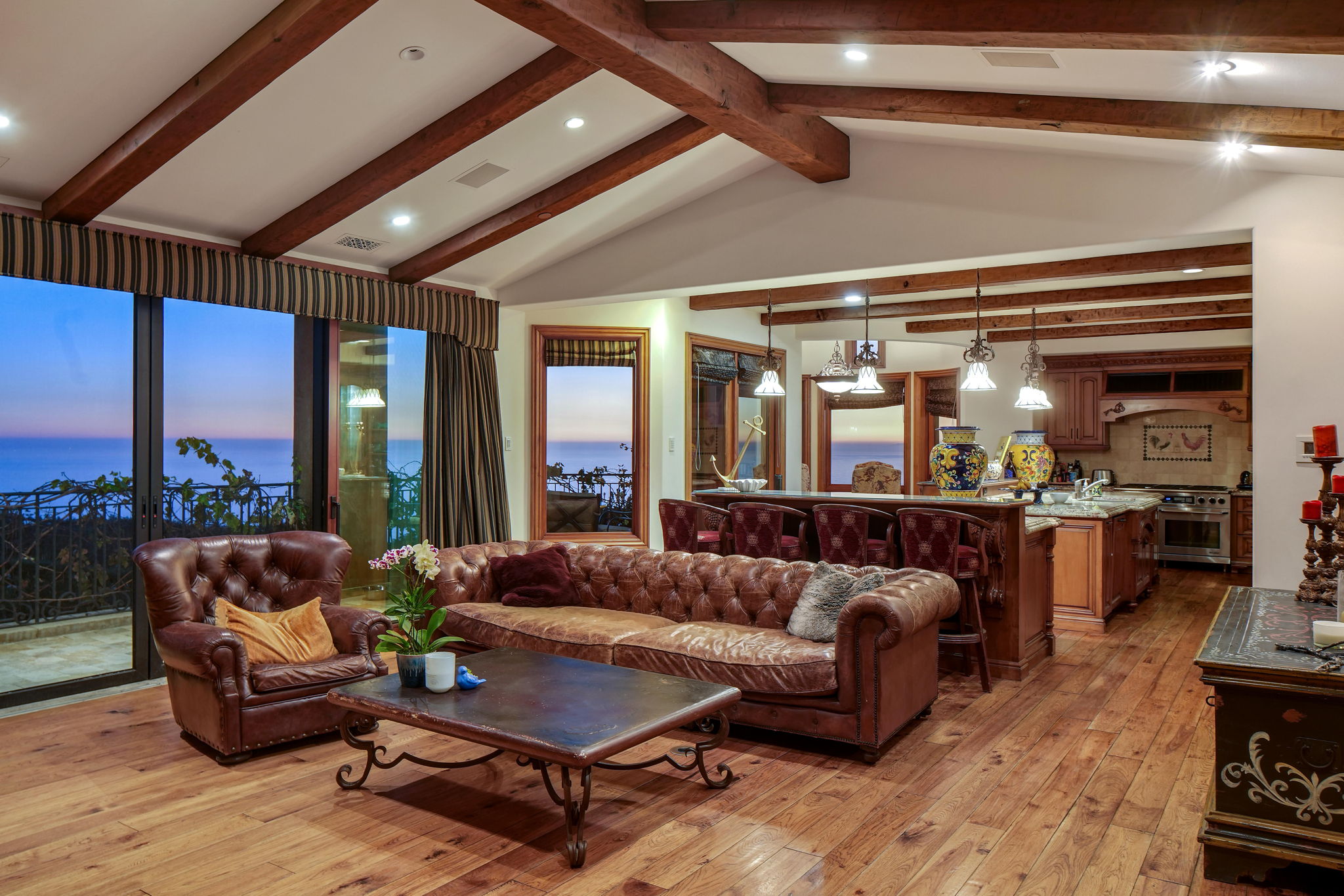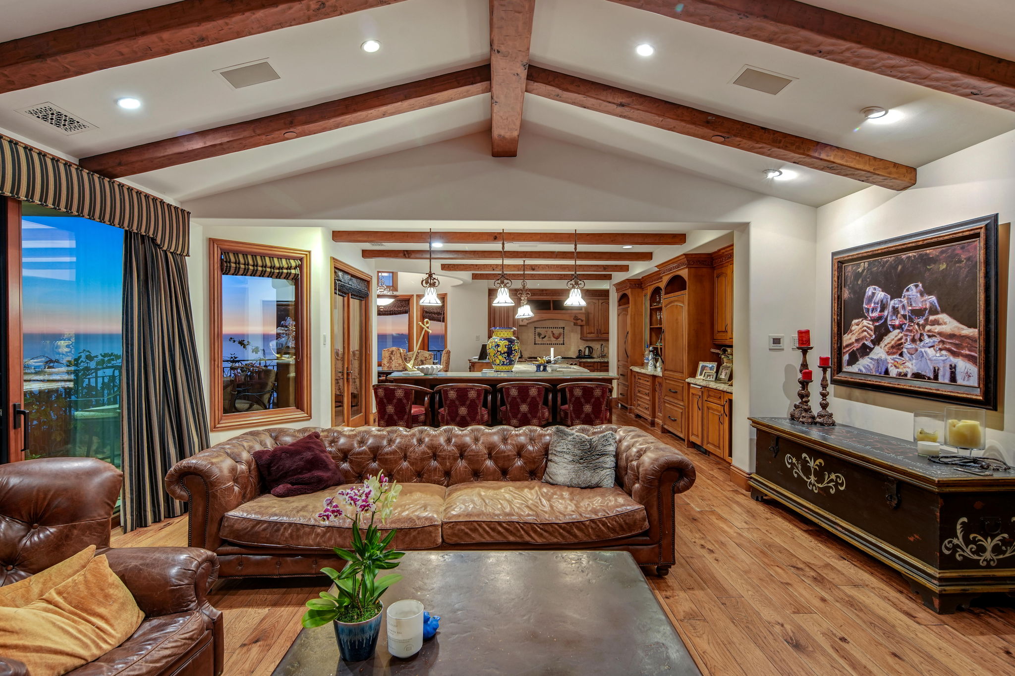Located within the private and exclusive guard-gated community of Laguna Sur, this exquisite 5,052 sq. ft. home offers 4 beds, 6 baths, unparalleled luxury finishes throughout, and sweeping unobstructed ocean views. Built using only the finest materials worked by old-world master craftsmen, this home is an entertainer's dream featuring an impressive 8 ft. tall glass and wrought iron door, inviting you into the spacious open floor plan with beamed ceilings. Adjacent to the formal dining room, the gourmet kitchen comes replete with an oversized island, serving bar, granite countertops, custom cabinetry with artisan glass work, Miele and Subzero appliances, and a cozy breakfast nook with views of the ocean. The spacious primary suite boasts a fireplace, a private terrace with ocean views, custom built-in cabinets, and a large bathroom with a hot tub and double vanity. The grand media room has a 120" screen and an upgraded sound system. The stately office has walls covered in warm-toned paneled wood. Other features include a beautiful wrought iron spiral staircase, a large elevator, and solid hickory planked flooring and alder wood crown molding/baseboards throughout. The outdoor terrace enjoys breathtaking ocean views and provides all you need to live the dreamy California Coastal Lifestyle.