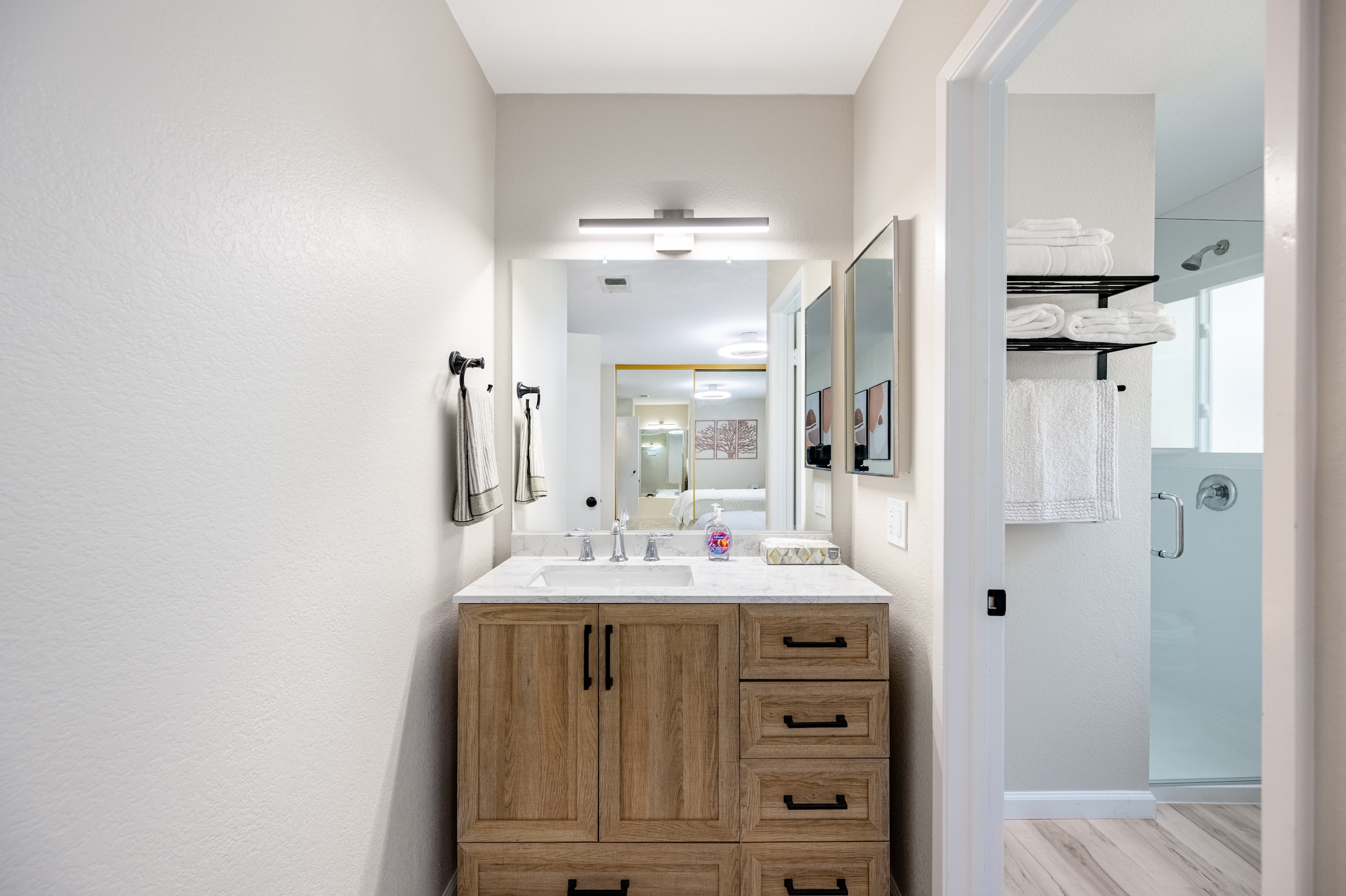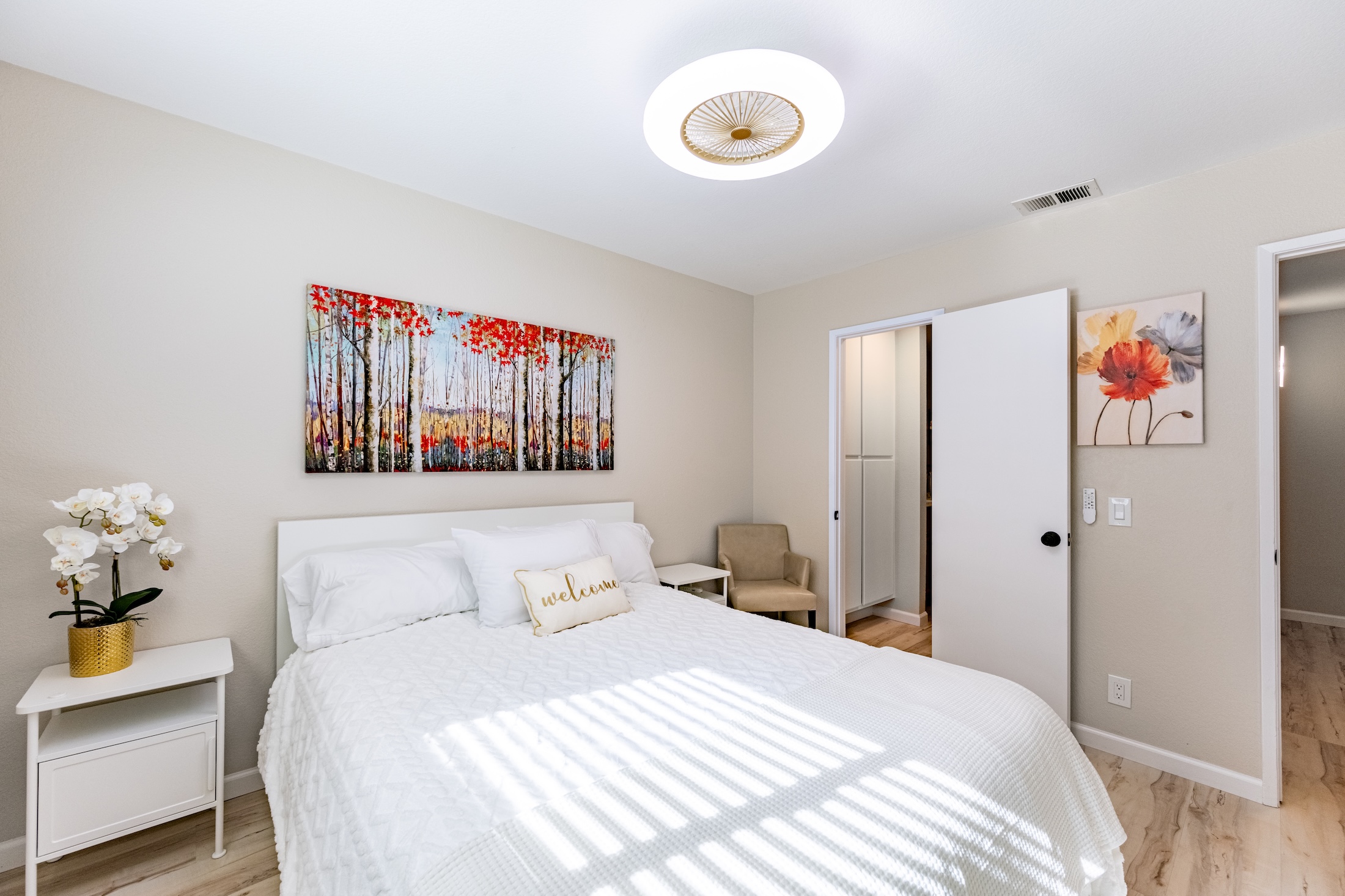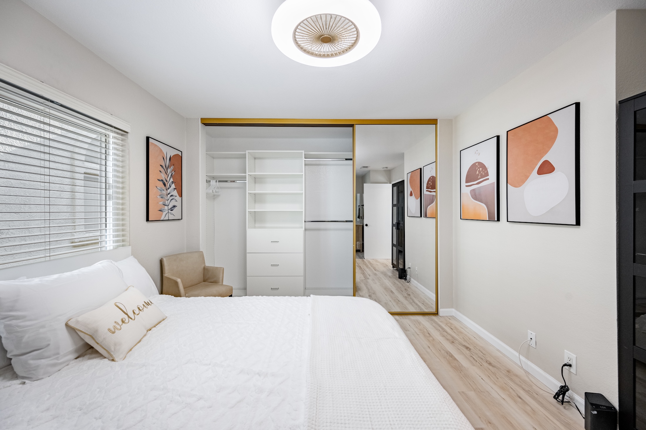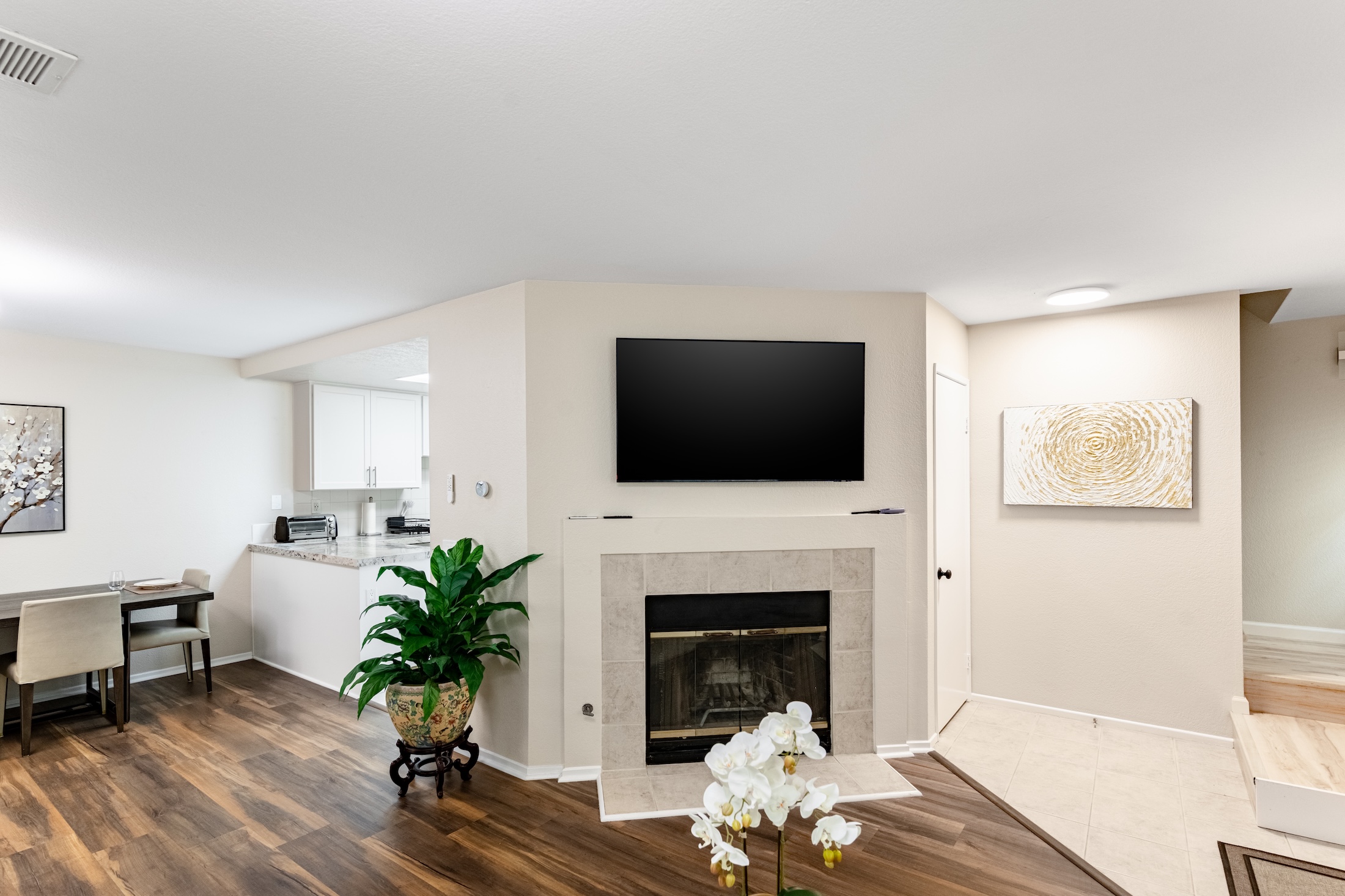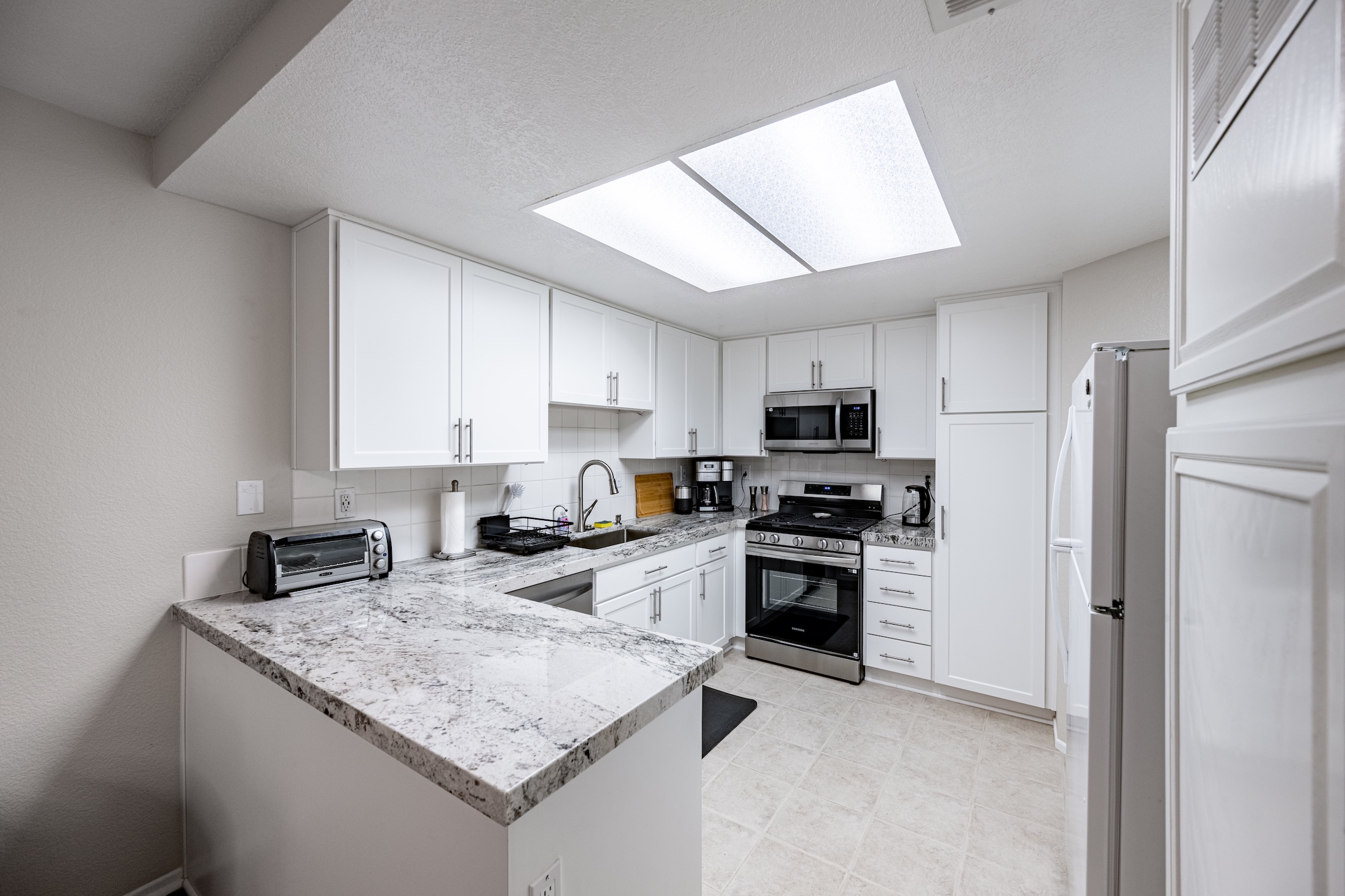 Fully Renovated 2-Bedroom, 2.5-Bathroom Condo with Modern Upgrades. Welcome to this beautifully renovated condominium, featuring two primary suites, spacious and inviting living room with a cozy fireplace, beautiful dining area adjacent to the kitchen, and an array of thoughtful upgrades. This move-in-ready home has been completely gutted and redone, with brand-new flooring, windows, granite countertops, baseboards, designer paint, sinks, bathtubs, showers, vanities, appliances, plumbing, toilets, light fixtures, and much more. The only original elements are the entry and kitchen tiles, as well as the sturdy cabinet frames—everything else is brand new. Each primary suite includes its own private bathroom that has been completely renovated. The modern kitchen features new granite countertops, appliances, including a stove, dishwasher, garbage disposal, and microwave. The spacious laundry area, located conveniently on the second floor in the closet, which includes a brand new washer and dryer. Designed for comfort and efficiency, this home features a smart AC/heating system that can be adjusted online or via a wall-mounted device, as well as ceiling fans in every room to help with air circulation. The bathroom and kitchen vents are newly replaced and up to code, with timers installed on the bathroom light fixtures and vents for added convenience. Enjoy the private patio, perfect for BBQs and entertaining guests. The home also includes an attached two-car garage with a built-in storage unit. All furniture, décor, and kitchen essentials are available for purchase, making this a truly turn-key home. Whether you’re looking for a fresh start or a beautifully upgraded space, this condo offers modern living at its finest. Don’t miss this incredible opportunity!