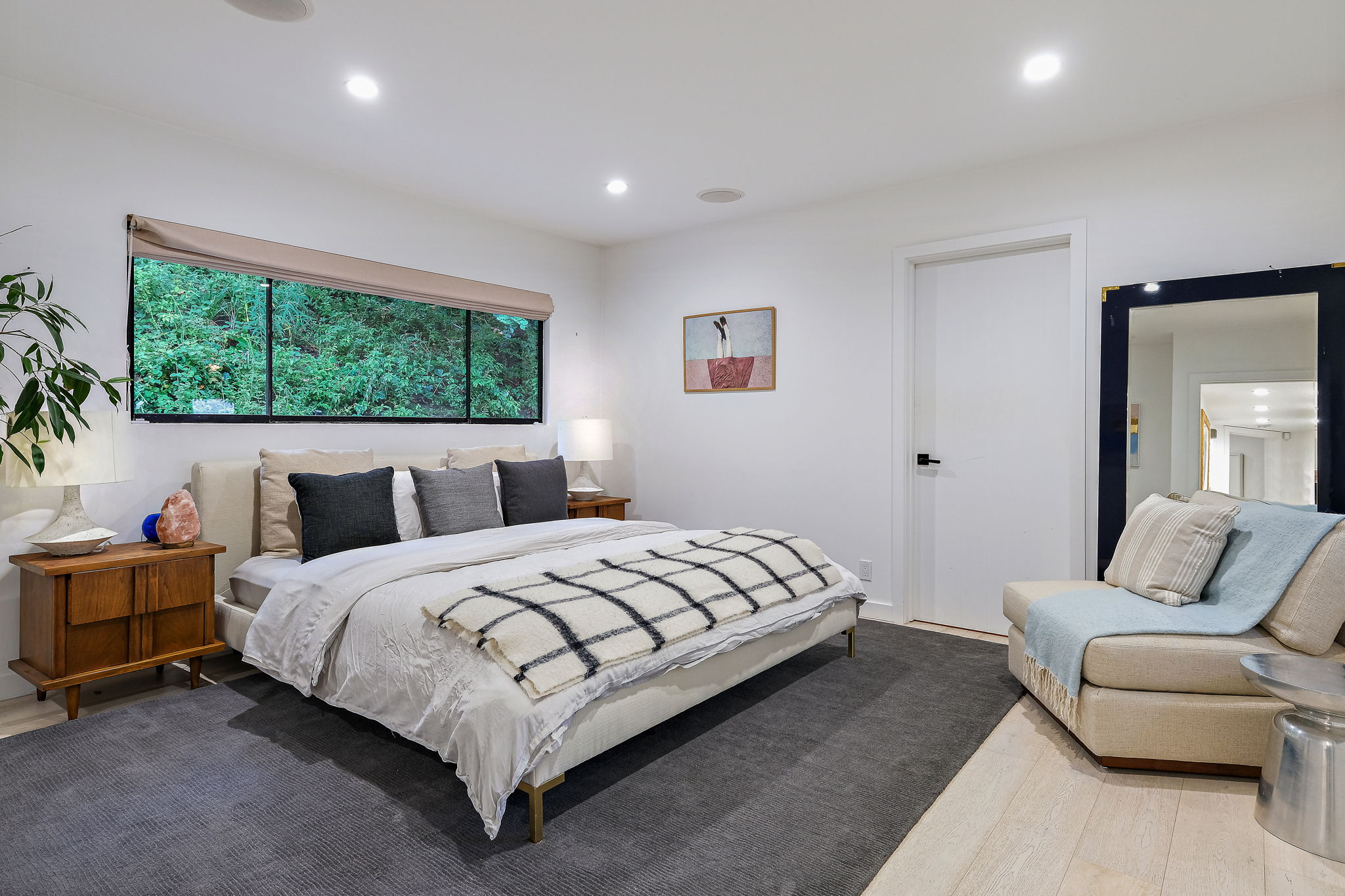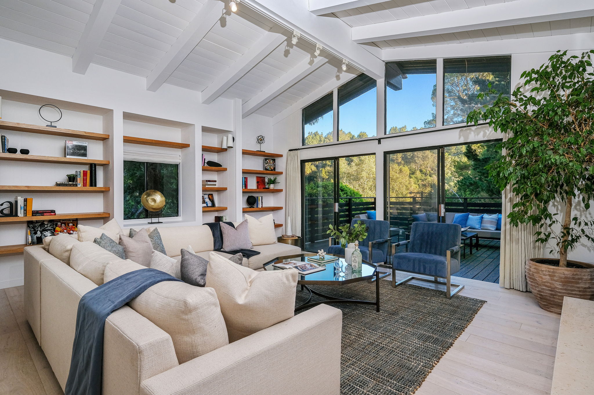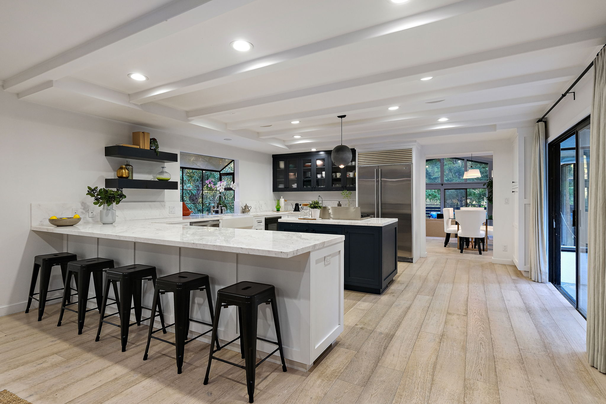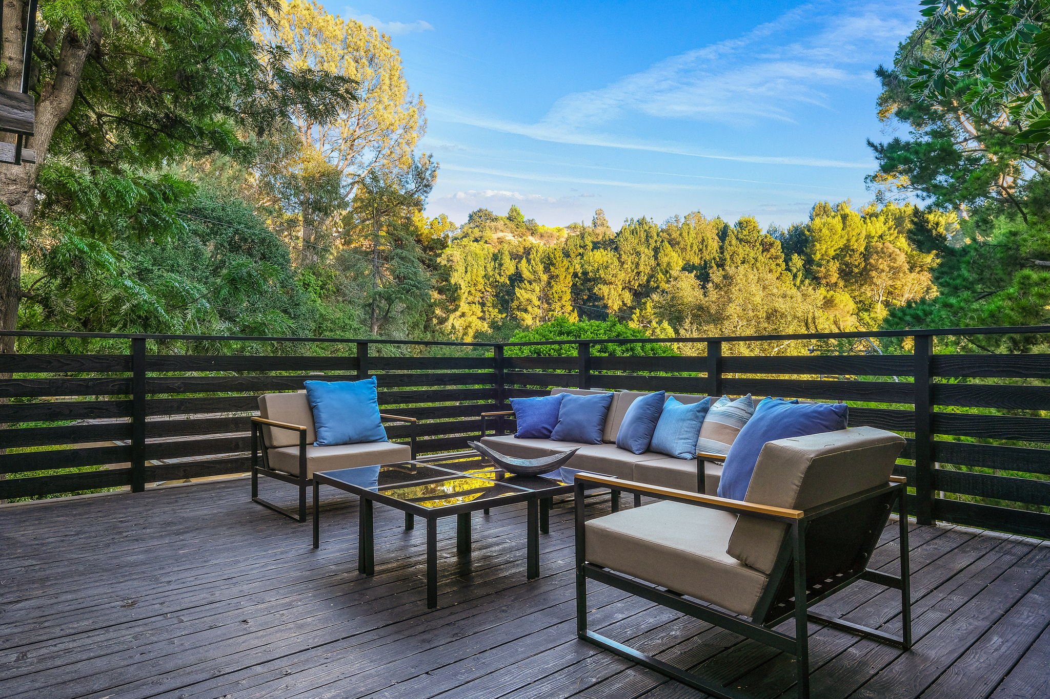 Nestled on a private cul-de-sac just adjacent to Trousdale Estates, this single-story contemporary home exudes charm and style. Boasting a plethora of natural light, the living area has a stunning vaulted wood-beam ceiling and overlooks green canyon views with access to a grassy yard and spacious outdoor deck via sliding glass doors, perfect for entertaining. The gourmet chef’s kitchen is replete with a rustic farmhouse sink and gorgeous white marble countertops extending to the built-in breakfast bar. A generously sized owner's suite features a massive walk-in closet and a luxurious resort-like bathroom with double vanity sinks, soaking tub, and separate shower. The property also has an additional separate guest studio which can be used as a bedroom, office, studio, or gym.