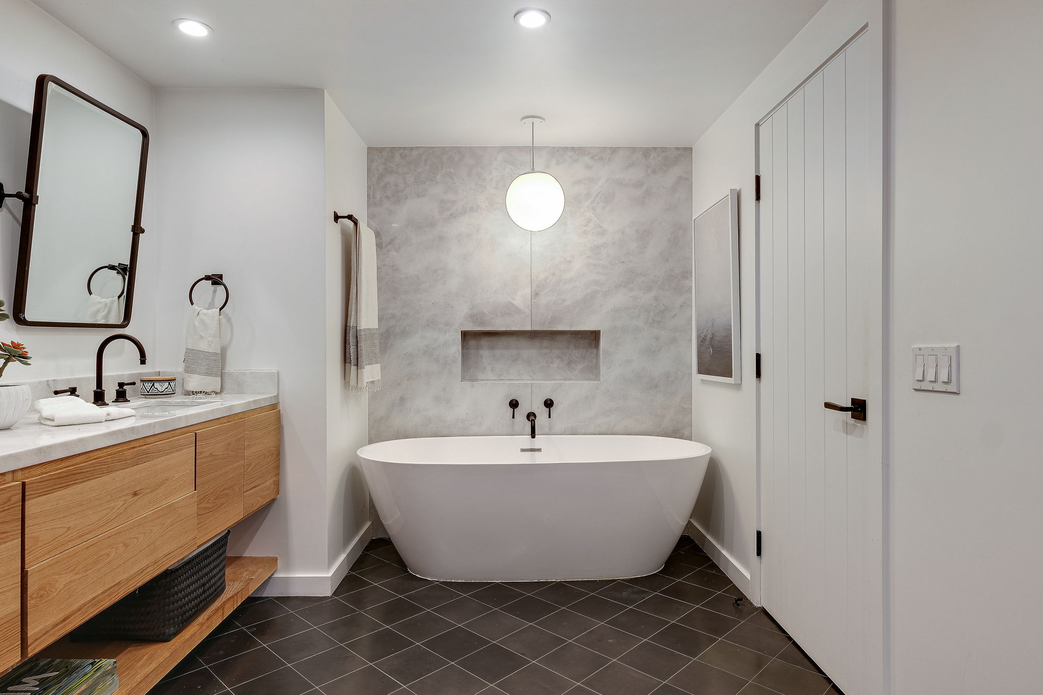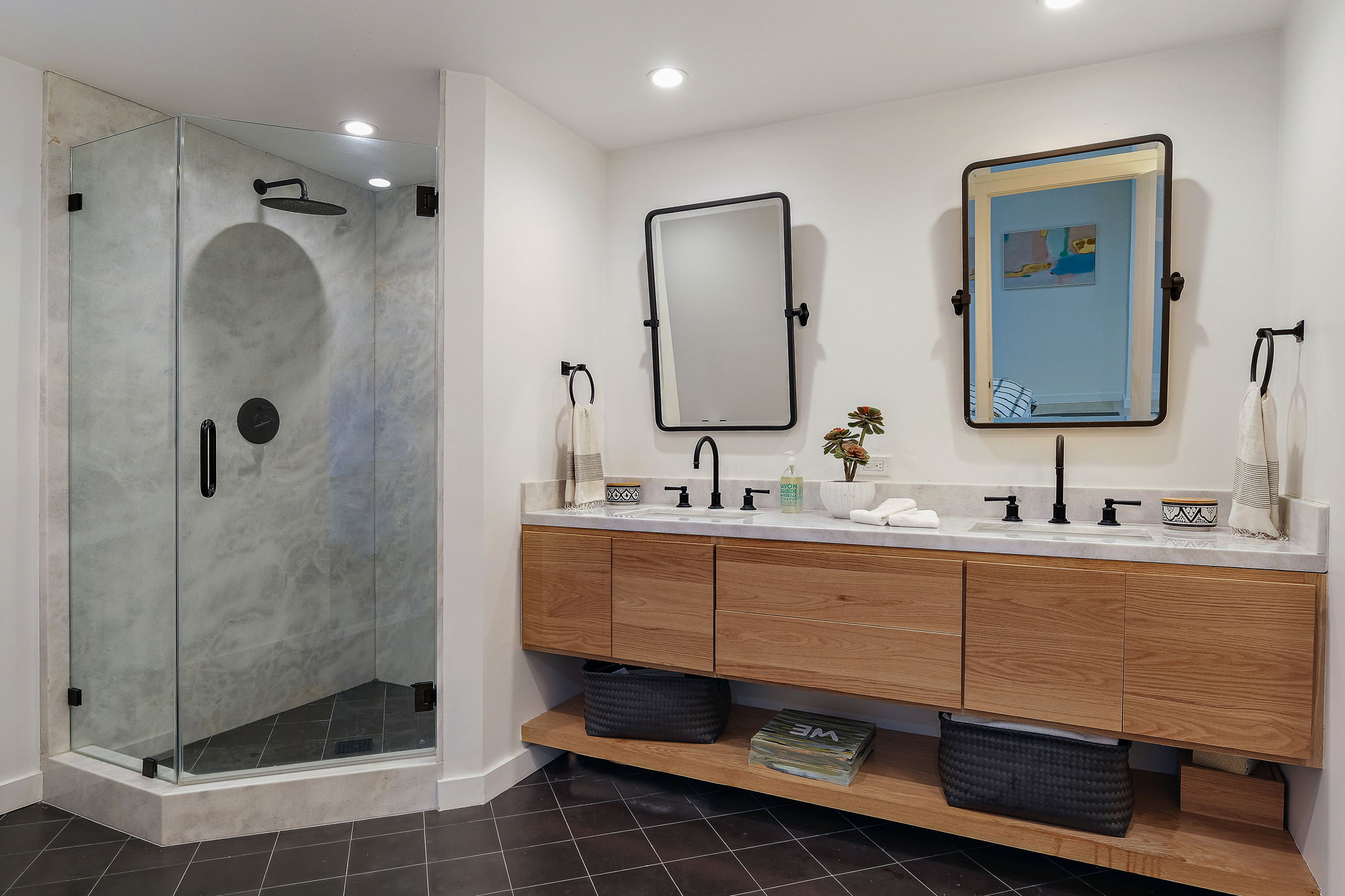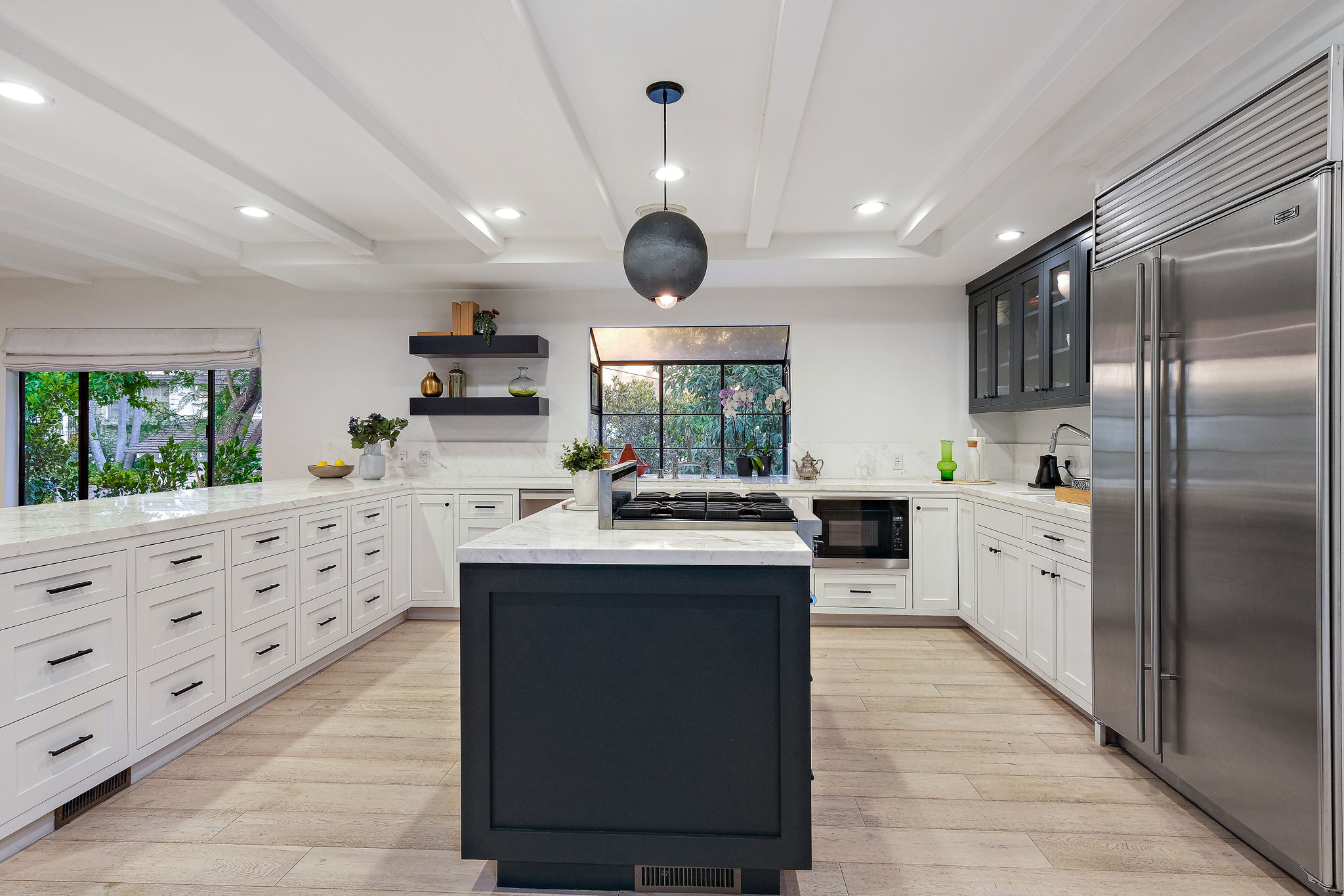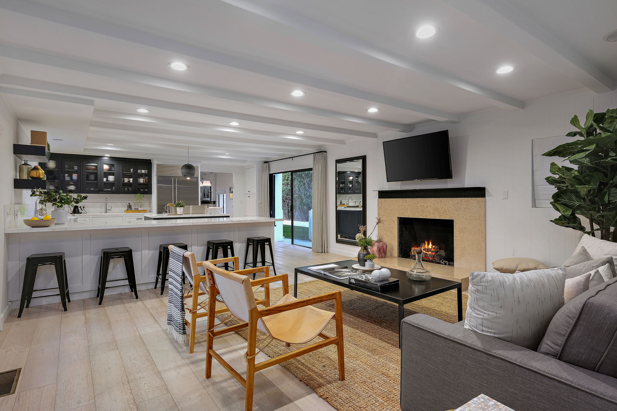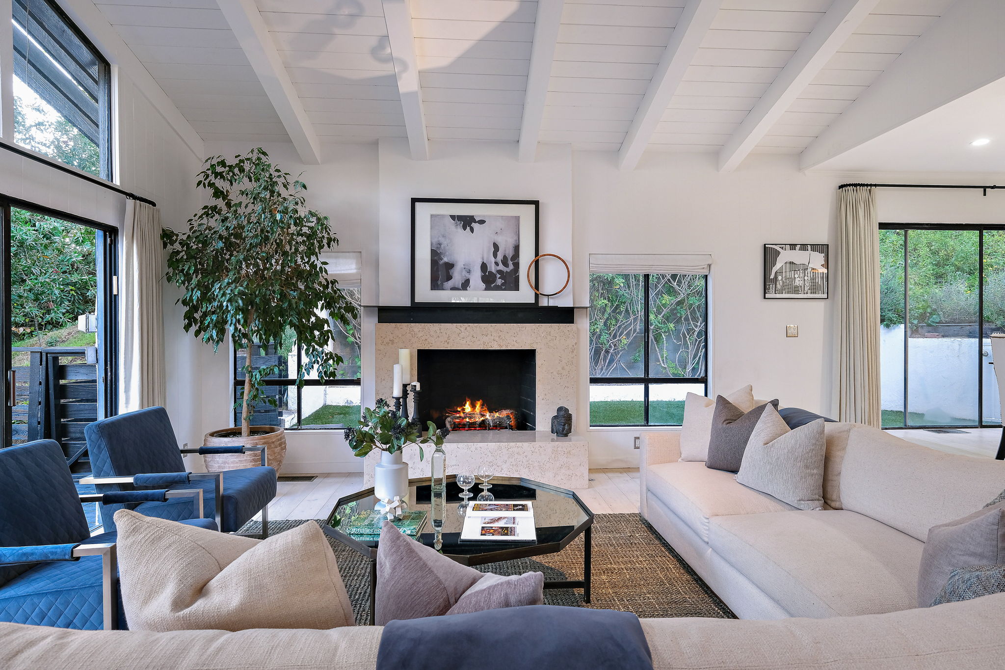 Nestled on a private cul-de-sac just adjacent to Trousdale Estates, this single-story contemporary home exudes charm and style. Boasting a plethora of natural light, the living area has a stunning vaulted wood-beam ceiling and overlooks green canyon views with access to a grassy yard and spacious outdoor deck via sliding glass doors, perfect for entertaining. The gourmet chef’s kitchen is replete with a rustic farmhouse sink and gorgeous white marble countertops extending to the built-in breakfast bar. A generously sized owner's suite features a massive walk-in closet and a luxurious resort-like bathroom with double vanity sinks, soaking tub, and separate shower. The property also has an additional separate guest studio which can be used as a bedroom, office, studio, or gym.