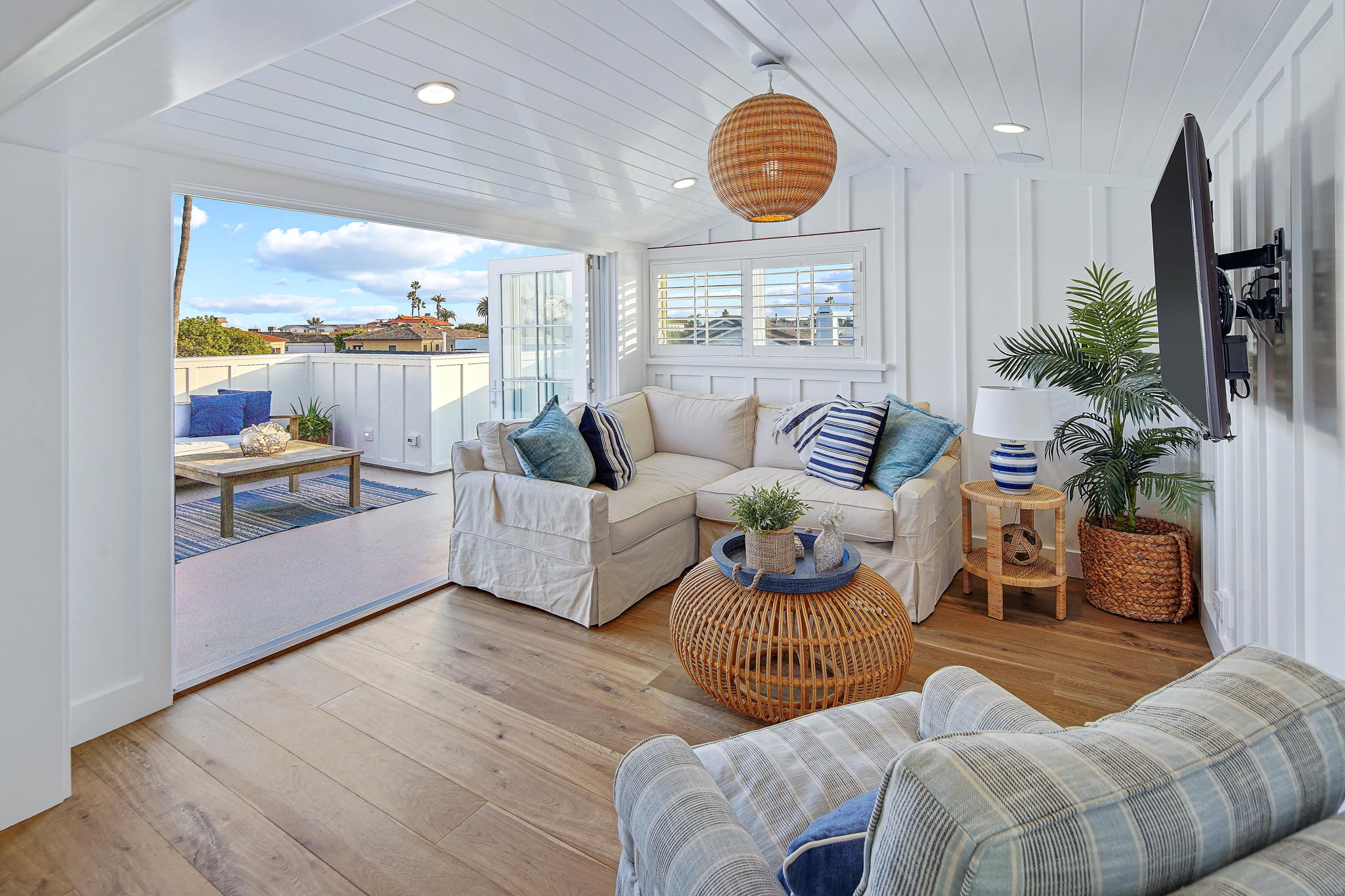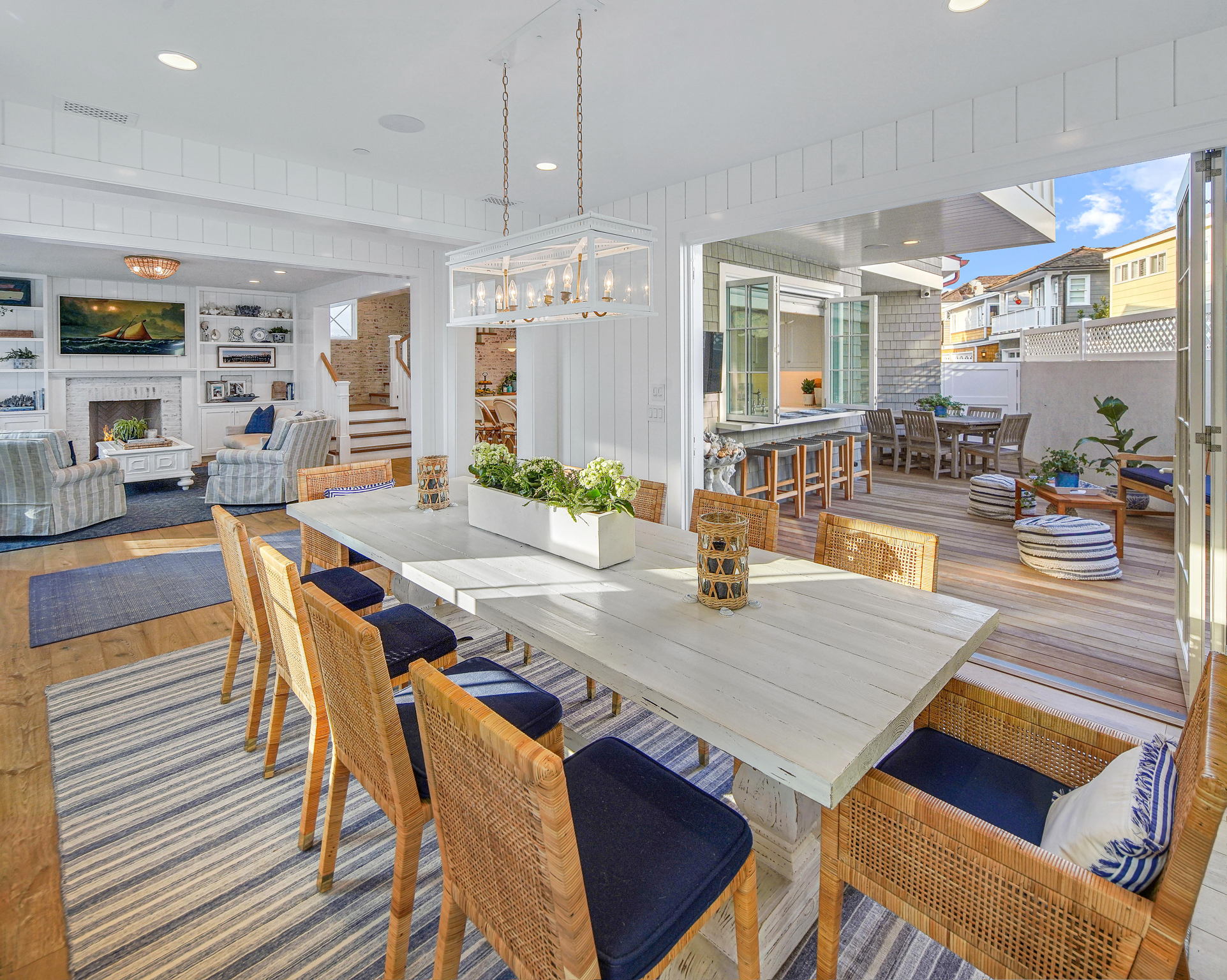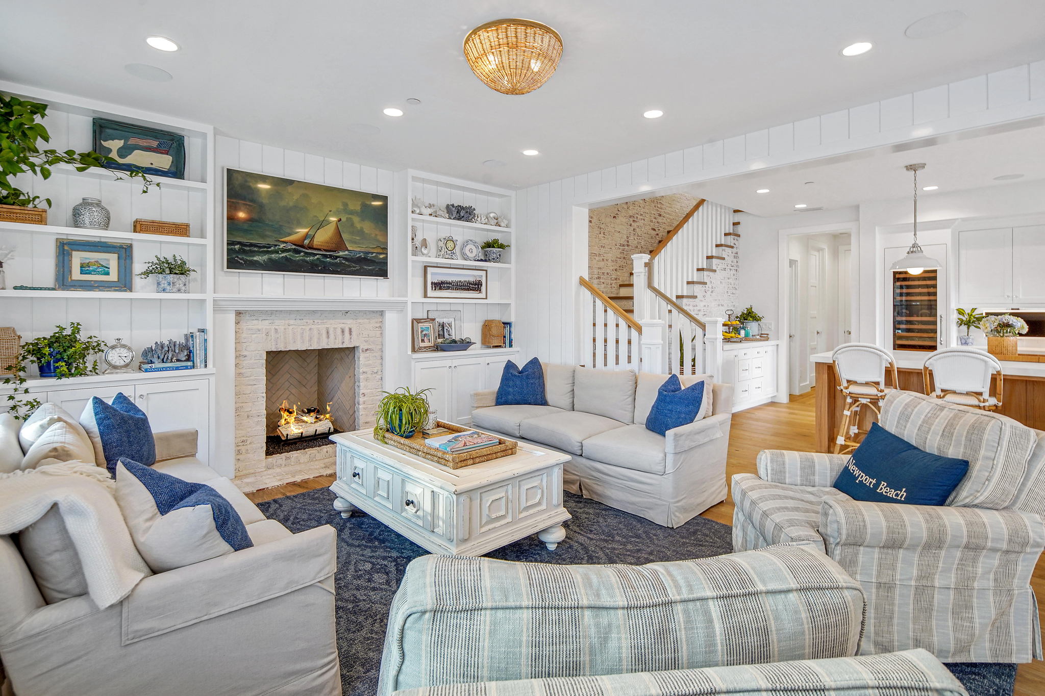 Ideally situated at the serene intersection of beachside bliss and bayfront beauty, 2132 Seville embodies coastal luxury at its finest. This distinguished residence, meticulously crafted by Graystone Builders, commands attention with its grand presence on a corner lot boasting approximately 60 feet of coveted frontage. Stepping inside, guests are welcomed into a haven of Hamptons-inspired elegance, where innovative craftsmanship and bespoke design converge. Vertical shiplap adorns the walls of the expansive living area, complemented by the warmth of authentic French Oak wood flooring underfoot. A cozy fireplace invites intimate gatherings, while custom-built shelving adds both functionality and style. The heart of the home, a chef's dream kitchen, beckons with honed quartz countertops, top-of-the-line appliances including a Sub-Zero fridge+freezer, Miele dishwasher, and a breathtaking BlueStar range. Bi-fold windows seamlessly merge indoor and outdoor spaces, inviting the gentle ocean breeze to mingle with culinary delights. Entertain with ease in the private outdoor oasis, complete with a built-in BBQ, Brazilian hardwood flooring, and a charming island bar opening to the kitchen. As day turns to night, set the perfect ambiance with the integrated sound system, enveloping both indoor and outdoor spaces in melodic harmony. Ascending the rustic brick-lined staircase, discover a sanctuary of comfort on the upper levels. Three spacious ensuite bedrooms await, each offering a retreat of tranquility and luxury. The master suite exudes sophistication, boasting a grand vaulted ceiling, dreamy blue accents, and a lavish bathroom sanctuary featuring a freestanding soaking tub and oversized shower. For elevated relaxation, ascend to the third floor where a fourth ensuite bedroom awaits, accompanied by a sprawling living area adorned with board & batten millwork. Step outside onto the scenic rooftop deck, offering panoramic views of the surrounding beauty, perfect for sunset soirées or stargazing under the night sky. Beyond its impeccable design and craftsmanship, this home provides the convenience of modern living with central vacuum on each floor, a powerful backup generator, and full audio and stereo throughout. Nestled within the coveted Balboa Peninsula Point, residents enjoy a lifestyle synonymous with coastal paradise. From world-class surfing at The Wedge to the enchanting Christmas Boat Parade and vibrant Fourth of July fireworks, every day is a celebration of seaside living. Don't miss this rare opportunity to make 2132 Seville your own, where every detail is a testament to unparalleled luxury and coastal elegance.