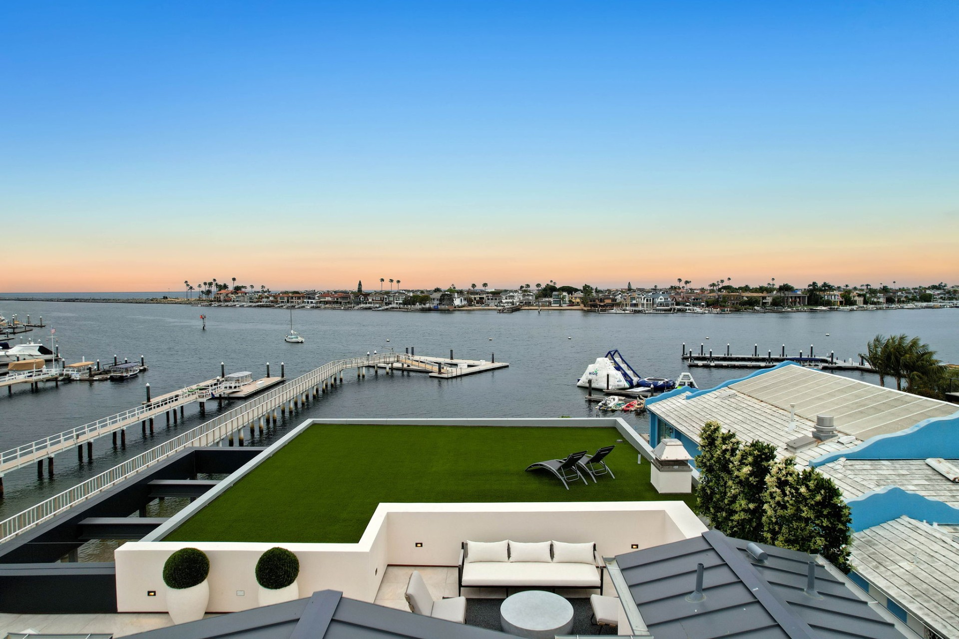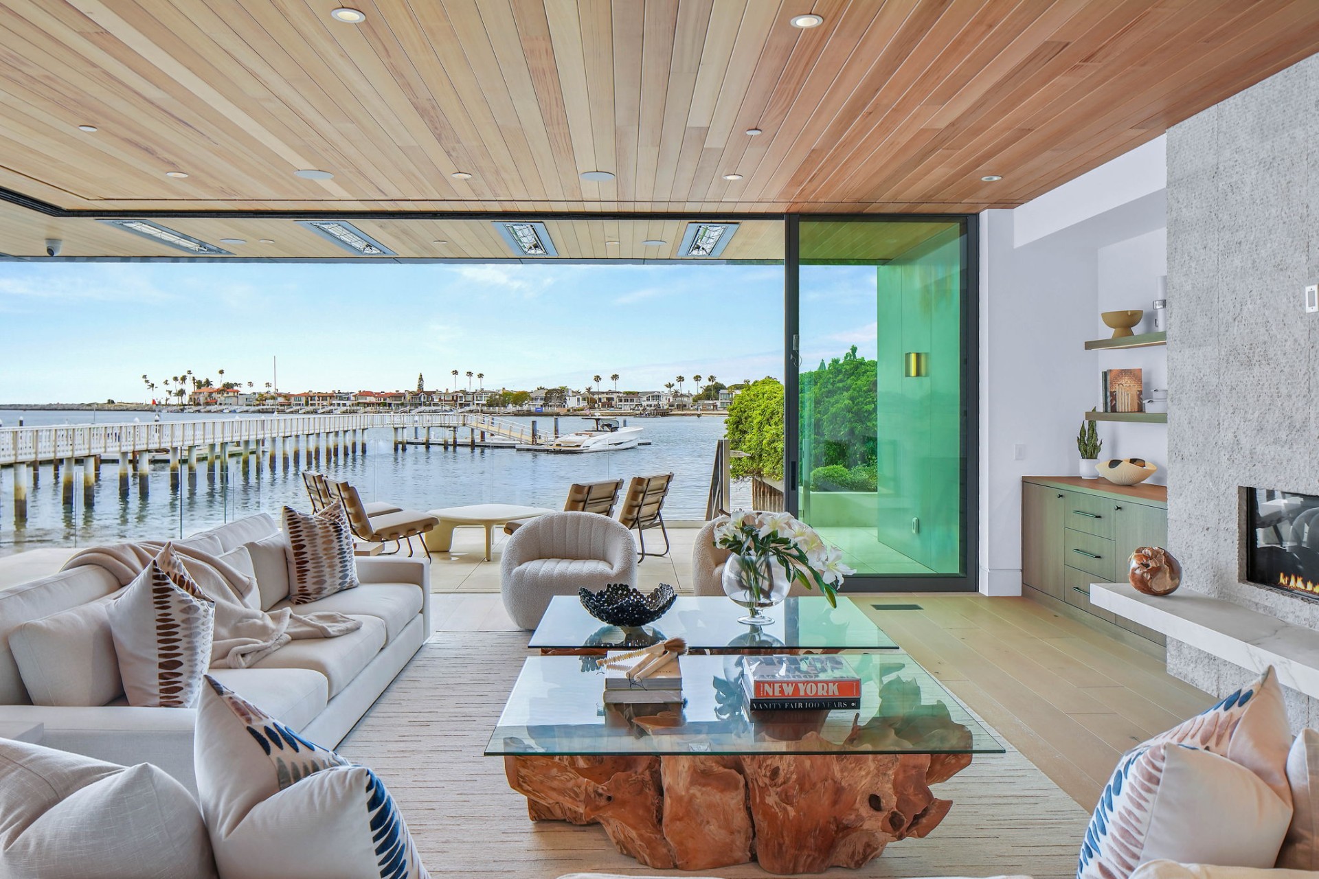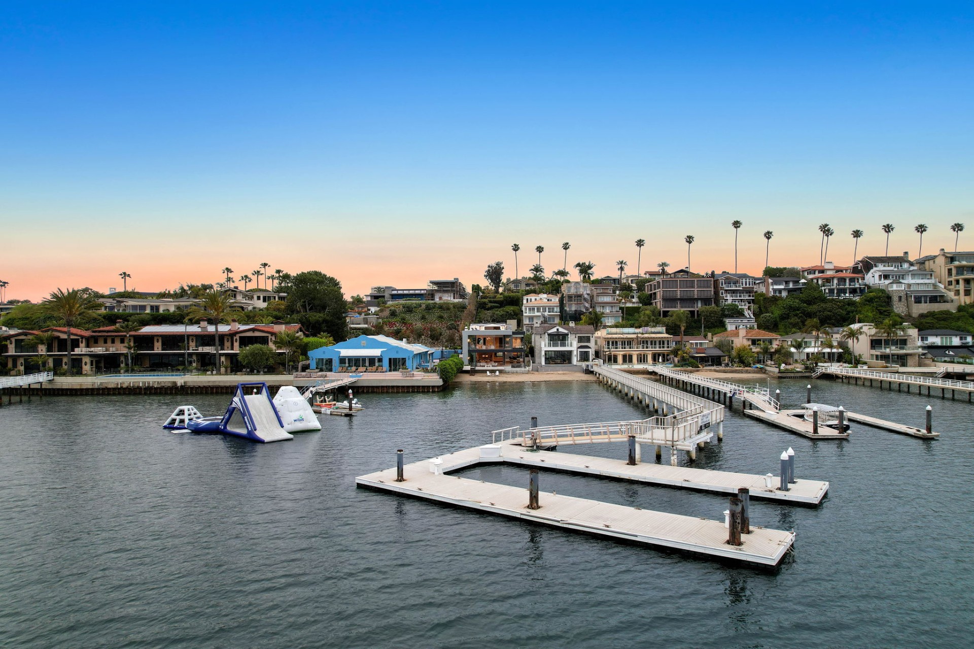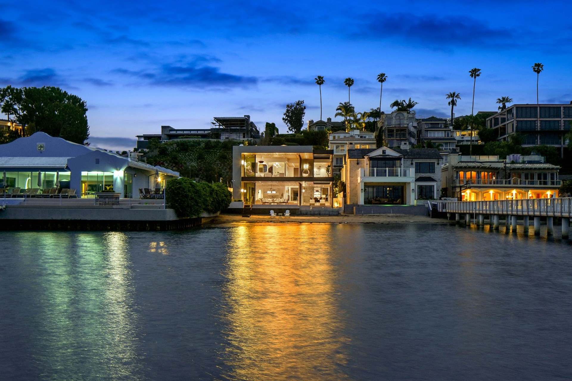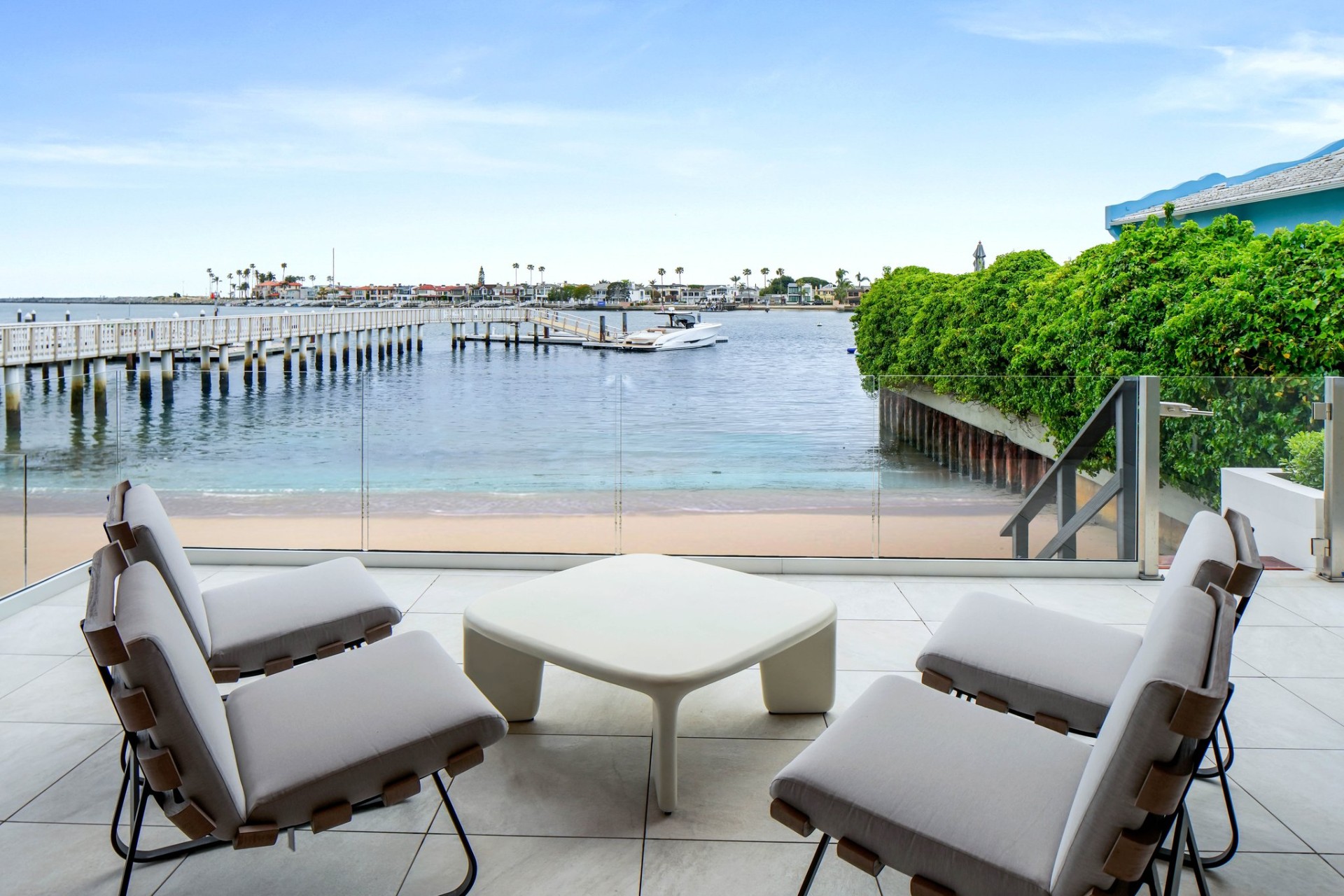 This newly constructed custom estate offers exclusive Corona Del Mar waterfront living with intricate design touches and a harmonious blend of natural stone and wood elements. Consisting of 5 ensuite bedrooms and 9 bathrooms and boasting approximately 50 feet of private beachfront, it caters to water enthusiasts and offers shared ownership of one of the longest private docks on the west coast, capable of accommodating multiple yachts up to 100ft in length. Upon arrival, you will be greeted by meticulously landscaped surroundings, a striking grand pivot door, and a double height foyer that sets the tone for the residence. Inside, the space boasts European wide plank bleached oak flooring by Gaetano, illuminated floating staircases, and expansive glass features that fill the approximately 9,129 square feet of interiors with an abundance of natural light. The property seamlessly connects to its surroundings through slide-away pocket doors that open onto a heated patio, a zero-edge saltwater pool and spa, and a courtyard featuring a built-in Lynx Grill. The kitchen features custom Honed Calcatta Vagli slab countertops and backsplash, a 55" La Canche designer stove imported from Paris, a butler's pantry, and stained white oak cabinetry. Convenience is paramount, with a Waupaca elevator servicing all four floors, including the lower level, which encompasses a media area, a dry bar, and temperature controlled wine room. Upstairs, the owner's suite presents a heated wraparound balcony with mesmerizing water views, a living space with a fireplace, and two spa-like bathrooms, each complemented by its own walk-in closet. The top level reveals a lounge area that opens onto a rooftop deck with grass and sweeping views of the Newport Beach Harbor offering limitless ocean-view entertaining. Equipped with cutting-edge technology, the property also includes a nearly 3,000 sq. ft., 6+ car garage with epoxy flooring. Expertly designed by Brandon Architects, Patterson Custom Homes, Harvard Investment Group, and Brooke Wagner Design.