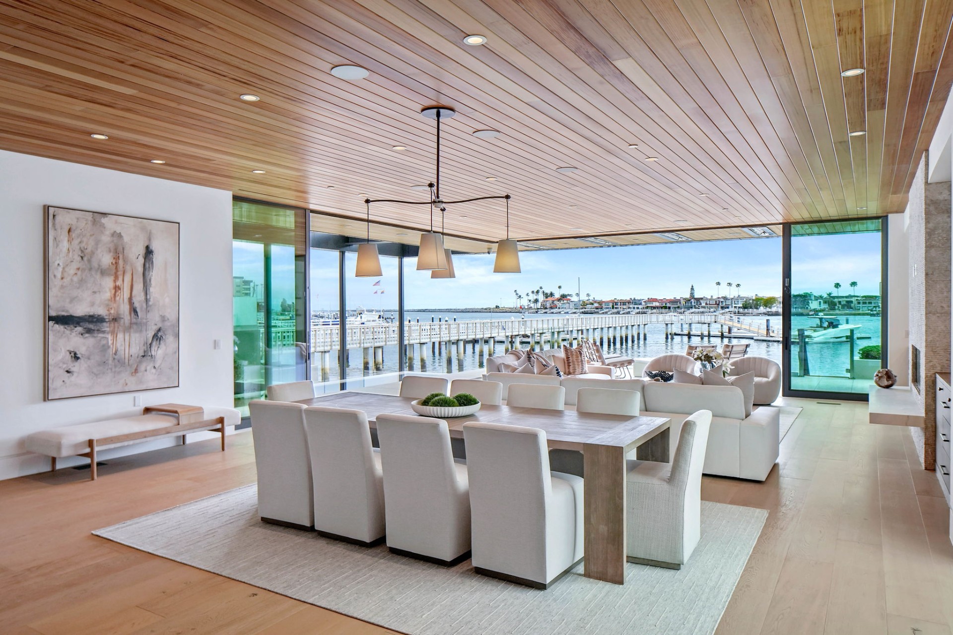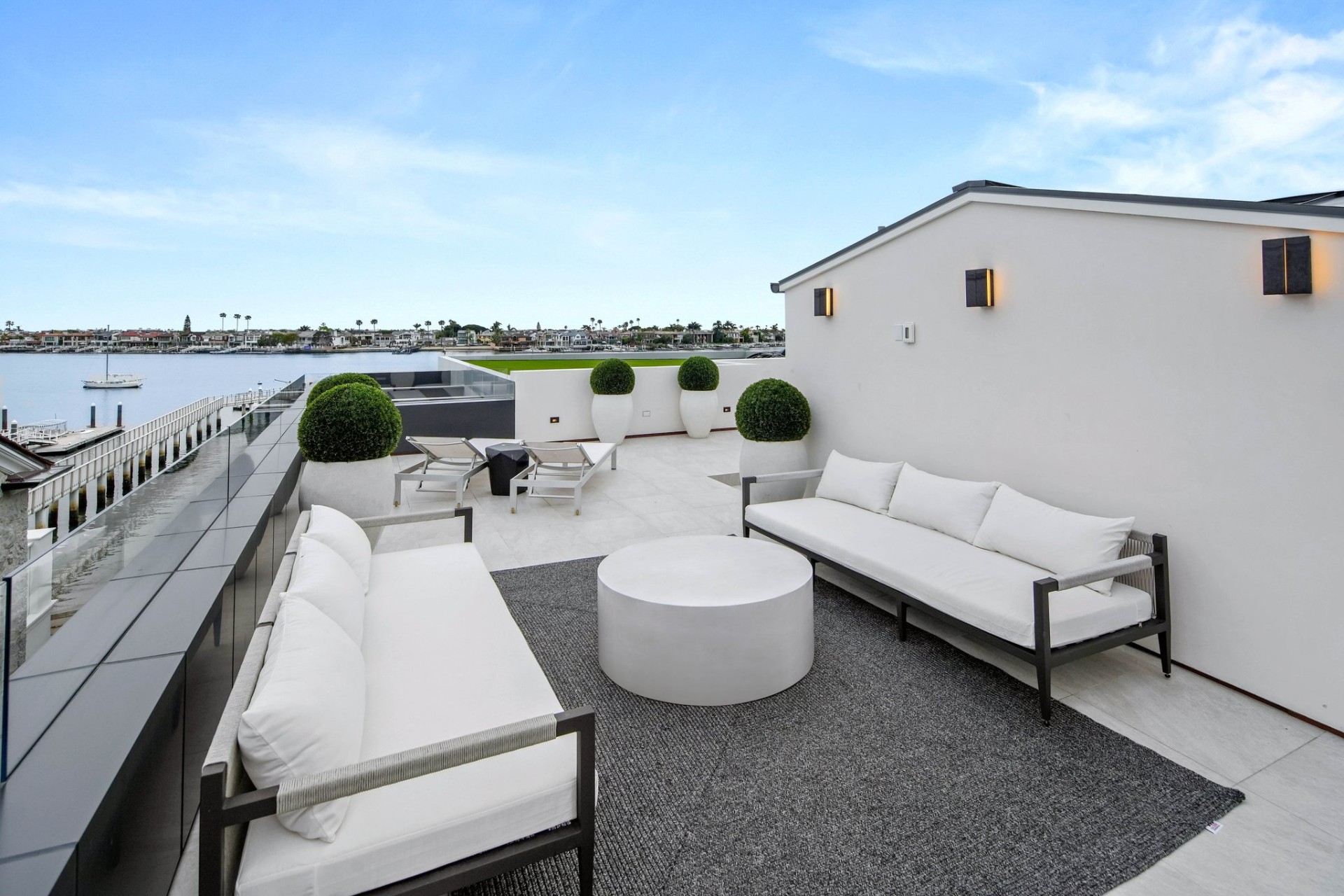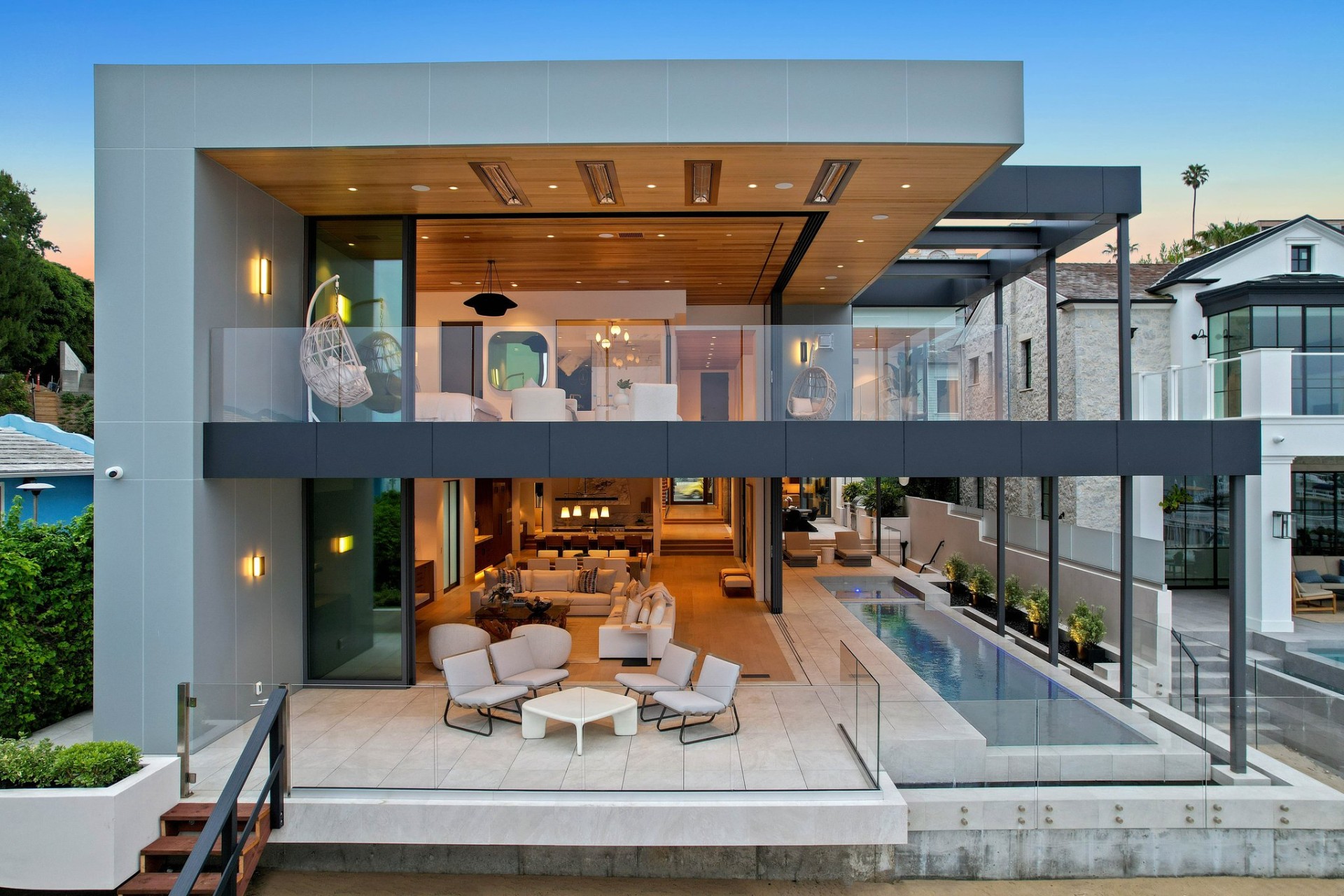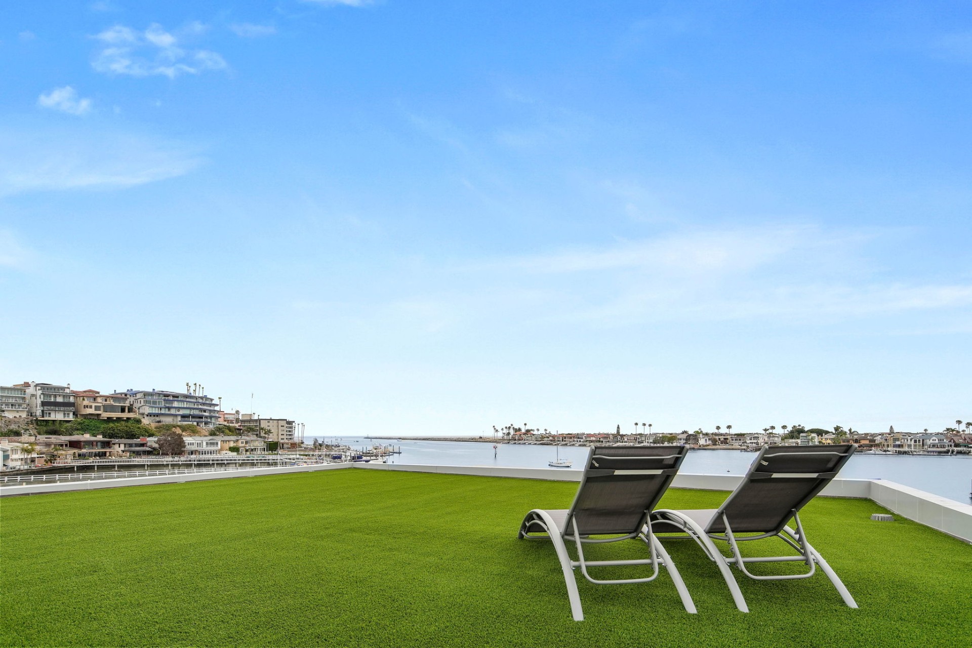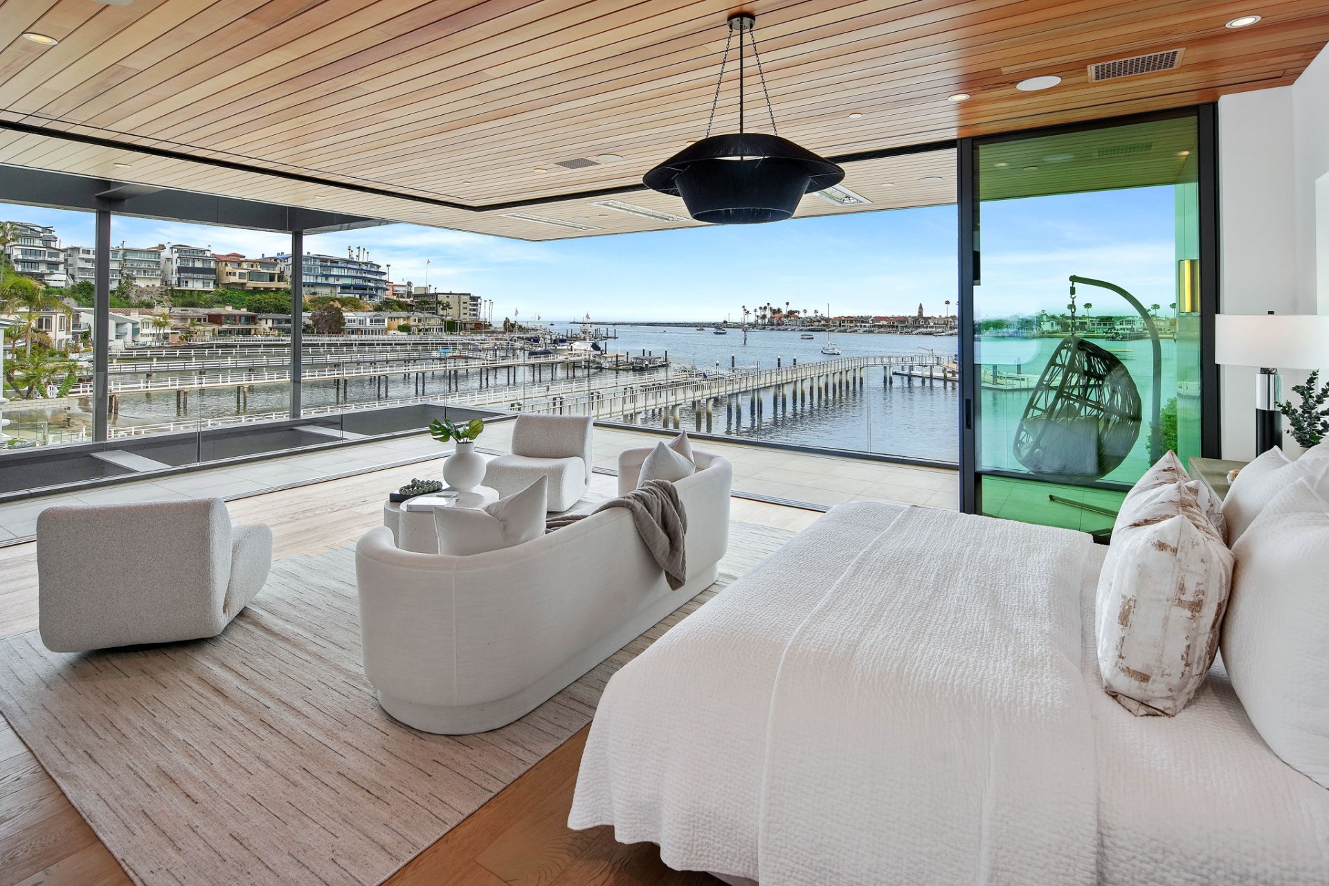 This newly constructed custom estate offers exclusive Corona Del Mar waterfront living with intricate design touches and a harmonious blend of natural stone and wood elements. Consisting of 5 ensuite bedrooms and 9 bathrooms and boasting approximately 50 feet of private beachfront, it caters to water enthusiasts and offers shared ownership of one of the longest private docks on the west coast, capable of accommodating multiple yachts up to 100ft in length. Upon arrival, you will be greeted by meticulously landscaped surroundings, a striking grand pivot door, and a double height foyer that sets the tone for the residence. Inside, the space boasts European wide plank bleached oak flooring by Gaetano, illuminated floating staircases, and expansive glass features that fill the approximately 9,129 square feet of interiors with an abundance of natural light. The property seamlessly connects to its surroundings through slide-away pocket doors that open onto a heated patio, a zero-edge saltwater pool and spa, and a courtyard featuring a built-in Lynx Grill. The kitchen features custom Honed Calcatta Vagli slab countertops and backsplash, a 55" La Canche designer stove imported from Paris, a butler's pantry, and stained white oak cabinetry. Convenience is paramount, with a Waupaca elevator servicing all four floors, including the lower level, which encompasses a media area, a dry bar, and temperature controlled wine room. Upstairs, the owner's suite presents a heated wraparound balcony with mesmerizing water views, a living space with a fireplace, and two spa-like bathrooms, each complemented by its own walk-in closet. The top level reveals a lounge area that opens onto a rooftop deck with grass and sweeping views of the Newport Beach Harbor offering limitless ocean-view entertaining. Equipped with cutting-edge technology, the property also includes a nearly 3,000 sq. ft., 6+ car garage with epoxy flooring. Expertly designed by Brandon Architects, Patterson Custom Homes, Harvard Investment Group, and Brooke Wagner Design.