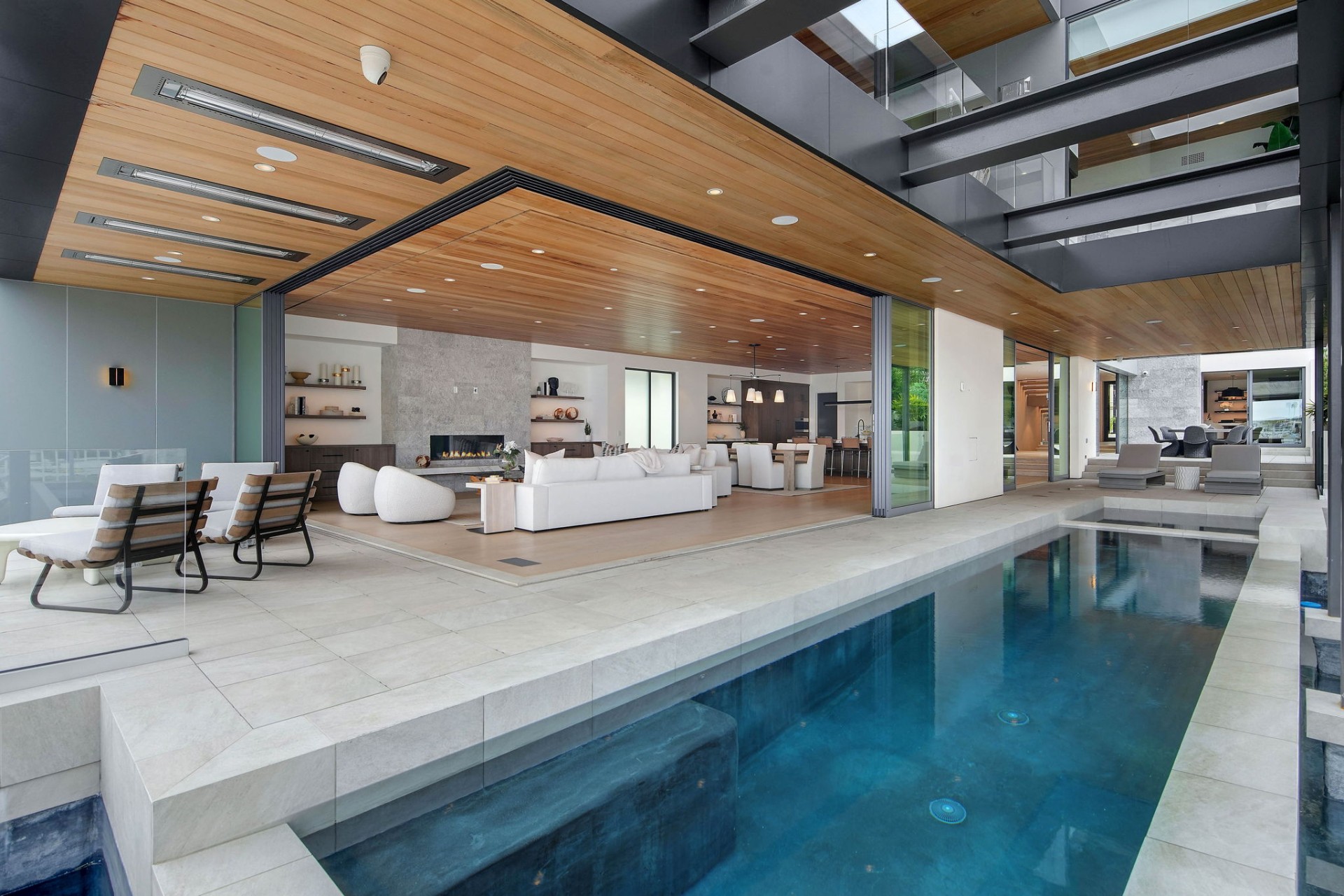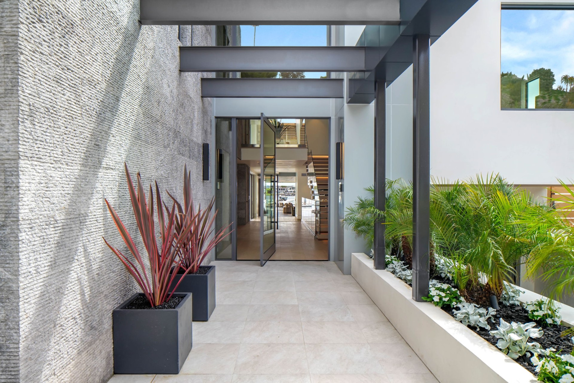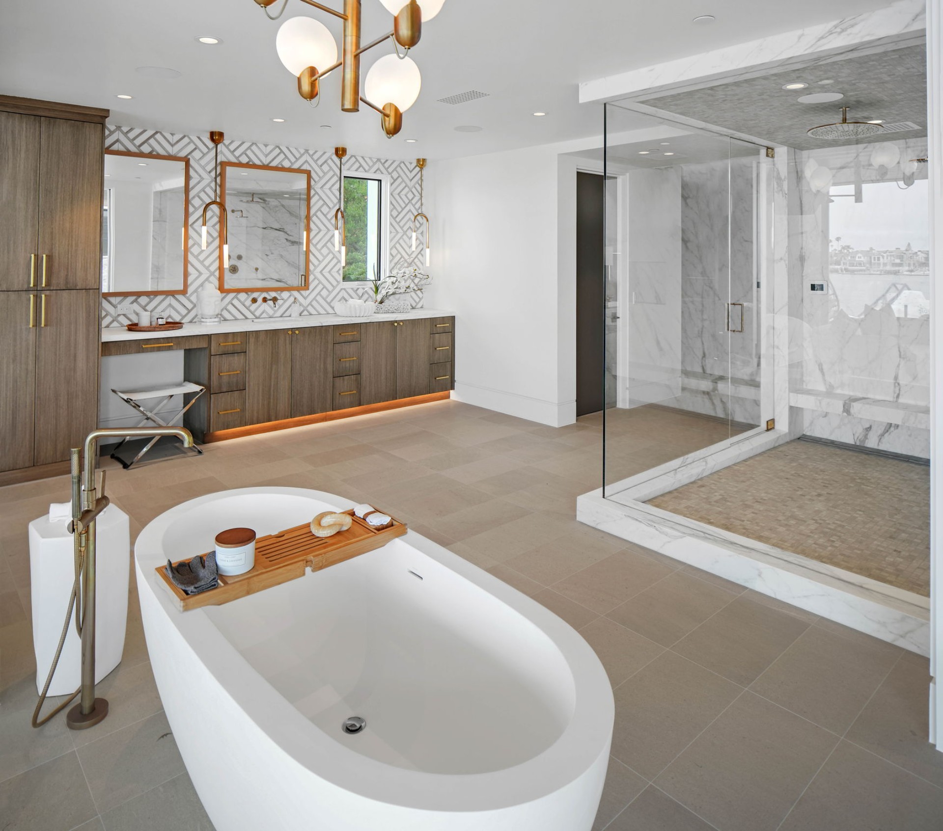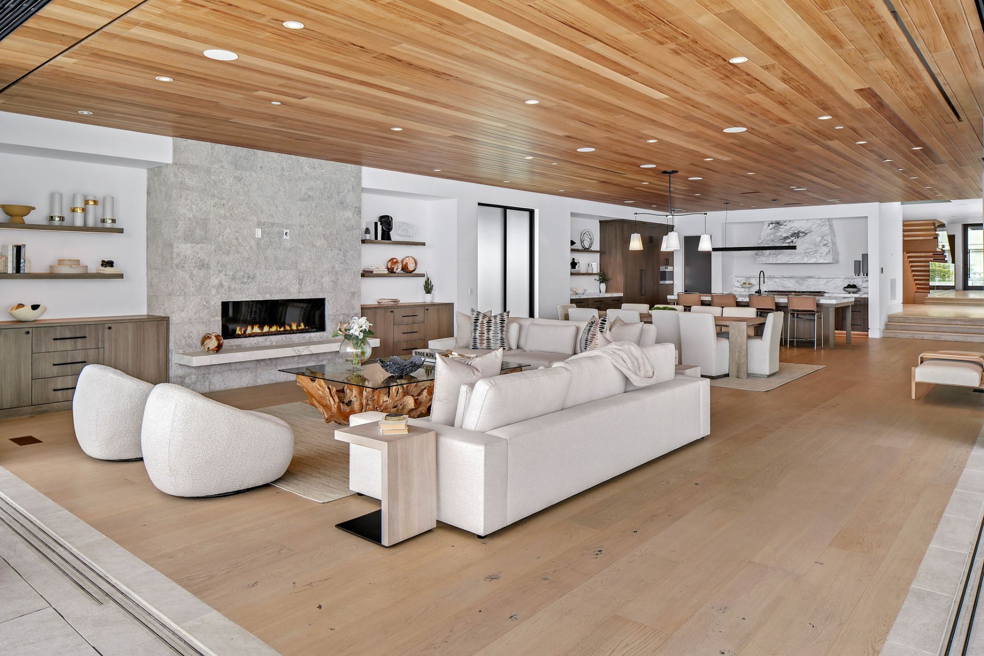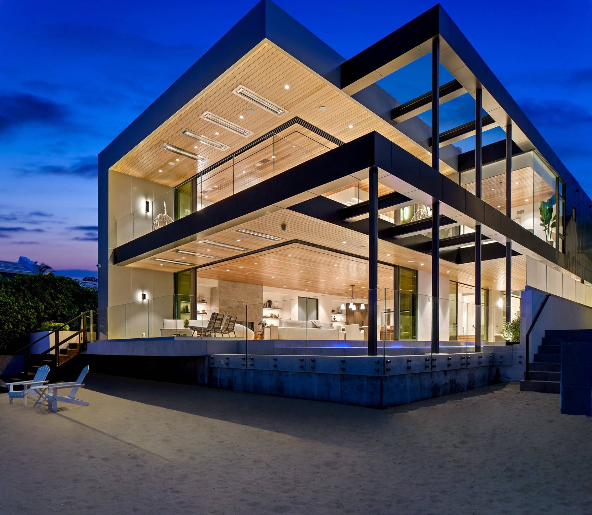 This newly constructed custom estate offers exclusive Corona Del Mar waterfront living with intricate design touches and a harmonious blend of natural stone and wood elements. Consisting of 5 ensuite bedrooms and 9 bathrooms and boasting approximately 50 feet of private beachfront, it caters to water enthusiasts and offers shared ownership of one of the longest private docks on the west coast, capable of accommodating multiple yachts up to 100ft in length. Upon arrival, you will be greeted by meticulously landscaped surroundings, a striking grand pivot door, and a double height foyer that sets the tone for the residence. Inside, the space boasts European wide plank bleached oak flooring by Gaetano, illuminated floating staircases, and expansive glass features that fill the approximately 9,129 square feet of interiors with an abundance of natural light. The property seamlessly connects to its surroundings through slide-away pocket doors that open onto a heated patio, a zero-edge saltwater pool and spa, and a courtyard featuring a built-in Lynx Grill. The kitchen features custom Honed Calcatta Vagli slab countertops and backsplash, a 55" La Canche designer stove imported from Paris, a butler's pantry, and stained white oak cabinetry. Convenience is paramount, with a Waupaca elevator servicing all four floors, including the lower level, which encompasses a media area, a dry bar, and temperature controlled wine room. Upstairs, the owner's suite presents a heated wraparound balcony with mesmerizing water views, a living space with a fireplace, and two spa-like bathrooms, each complemented by its own walk-in closet. The top level reveals a lounge area that opens onto a rooftop deck with grass and sweeping views of the Newport Beach Harbor offering limitless ocean-view entertaining. Equipped with cutting-edge technology, the property also includes a nearly 3,000 sq. ft., 6+ car garage with epoxy flooring. Expertly designed by Brandon Architects, Patterson Custom Homes, Harvard Investment Group, and Brooke Wagner Design.