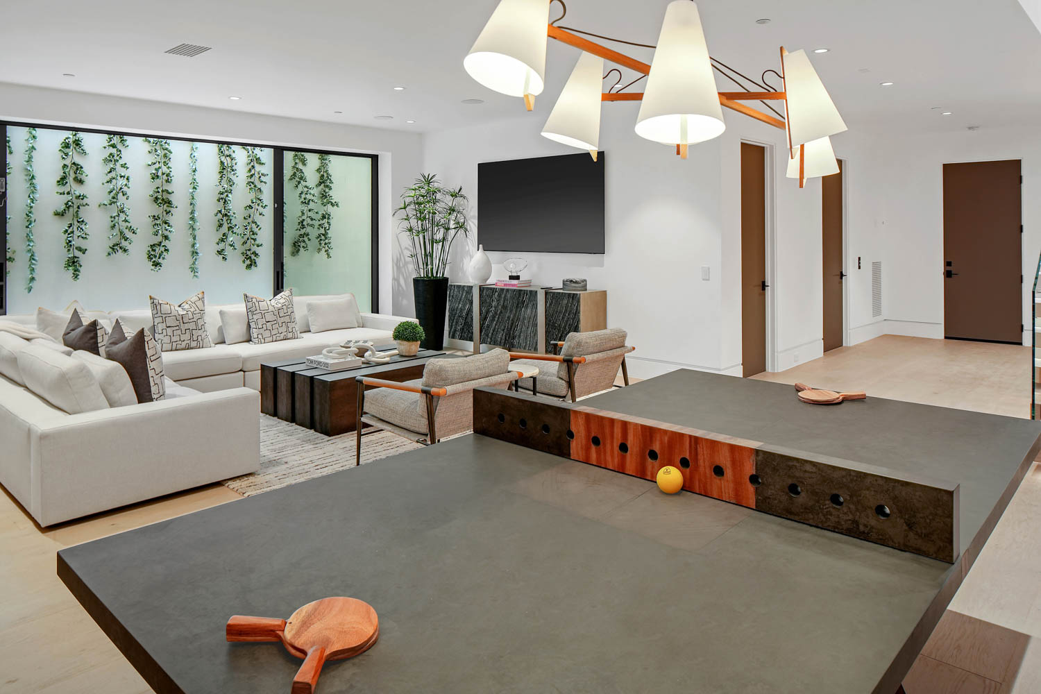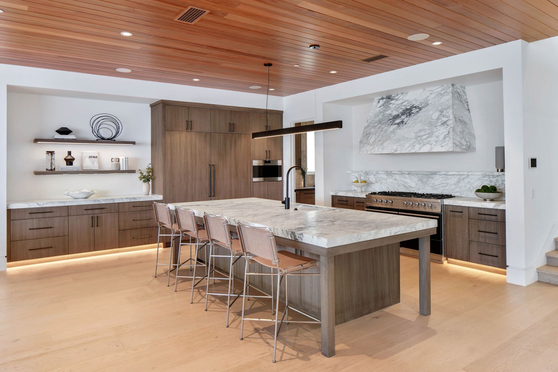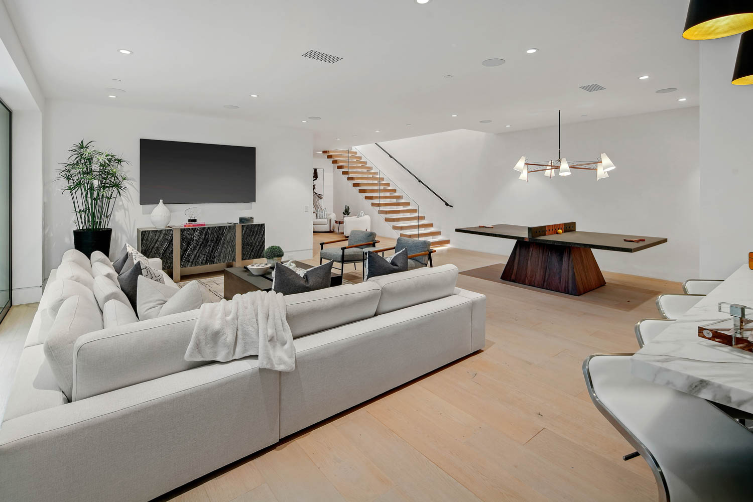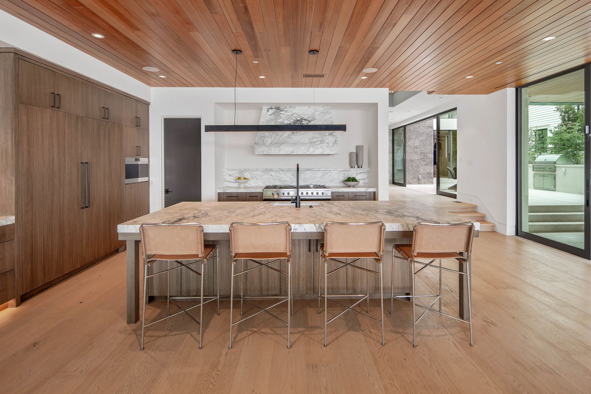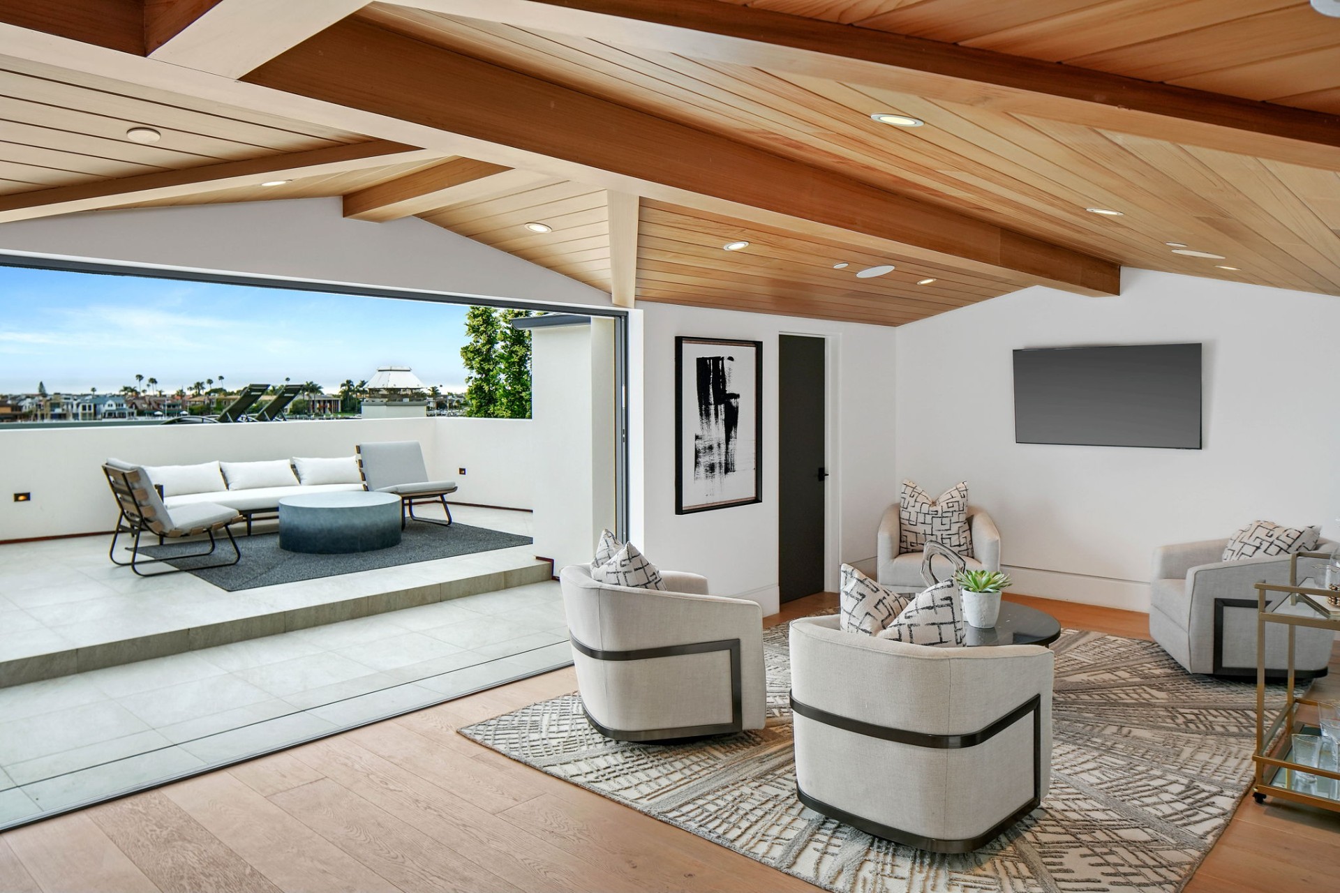 This newly constructed custom estate offers exclusive Corona Del Mar waterfront living with intricate design touches and a harmonious blend of natural stone and wood elements. Consisting of 5 ensuite bedrooms and 9 bathrooms and boasting approximately 50 feet of private beachfront, it caters to water enthusiasts and offers shared ownership of one of the longest private docks on the west coast, capable of accommodating multiple yachts up to 100ft in length. Upon arrival, you will be greeted by meticulously landscaped surroundings, a striking grand pivot door, and a double height foyer that sets the tone for the residence. Inside, the space boasts European wide plank bleached oak flooring by Gaetano, illuminated floating staircases, and expansive glass features that fill the approximately 9,129 square feet of interiors with an abundance of natural light. The property seamlessly connects to its surroundings through slide-away pocket doors that open onto a heated patio, a zero-edge saltwater pool and spa, and a courtyard featuring a built-in Lynx Grill. The kitchen features custom Honed Calcatta Vagli slab countertops and backsplash, a 55" La Canche designer stove imported from Paris, a butler's pantry, and stained white oak cabinetry. Convenience is paramount, with a Waupaca elevator servicing all four floors, including the lower level, which encompasses a media area, a dry bar, and temperature controlled wine room. Upstairs, the owner's suite presents a heated wraparound balcony with mesmerizing water views, a living space with a fireplace, and two spa-like bathrooms, each complemented by its own walk-in closet. The top level reveals a lounge area that opens onto a rooftop deck with grass and sweeping views of the Newport Beach Harbor offering limitless ocean-view entertaining. Equipped with cutting-edge technology, the property also includes a nearly 3,000 sq. ft., 6+ car garage with epoxy flooring. Expertly designed by Brandon Architects, Patterson Custom Homes, Harvard Investment Group, and Brooke Wagner Design.