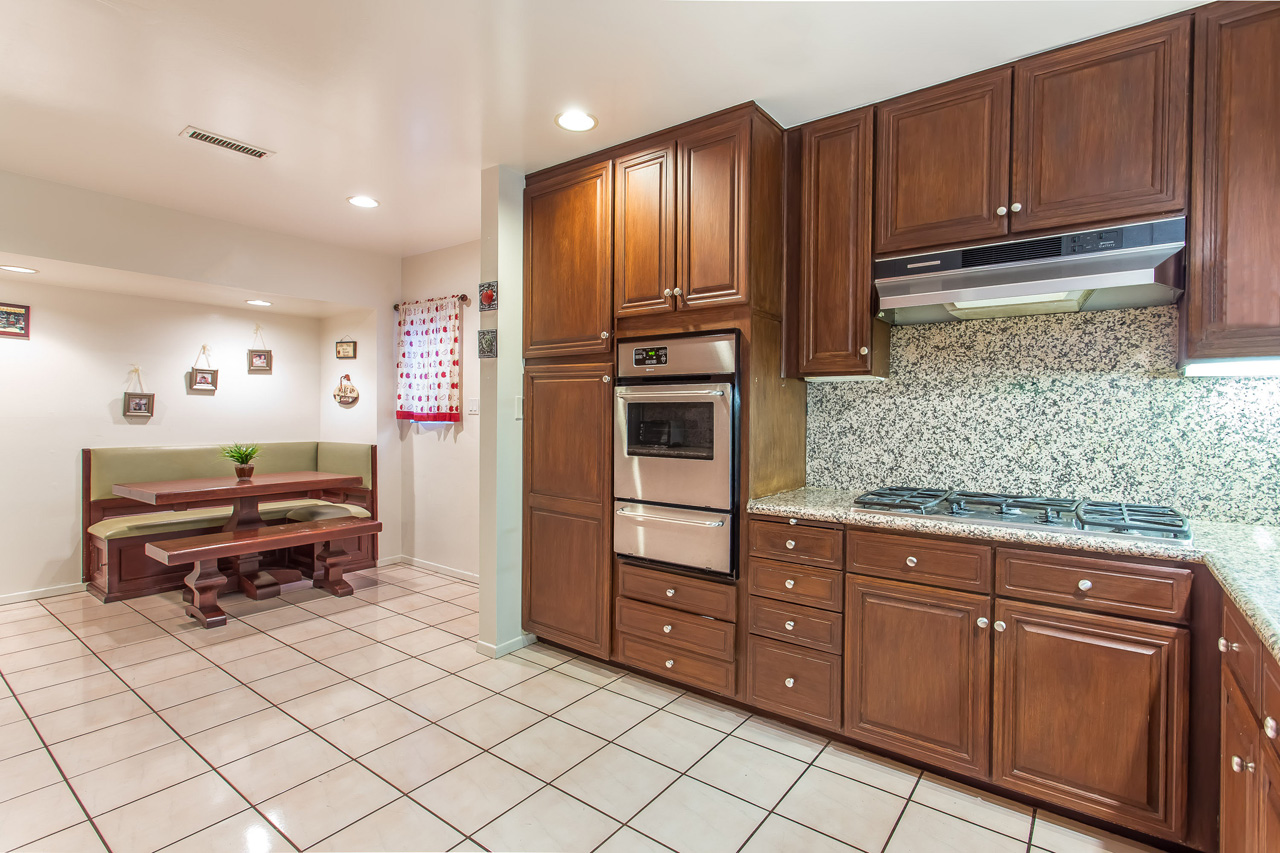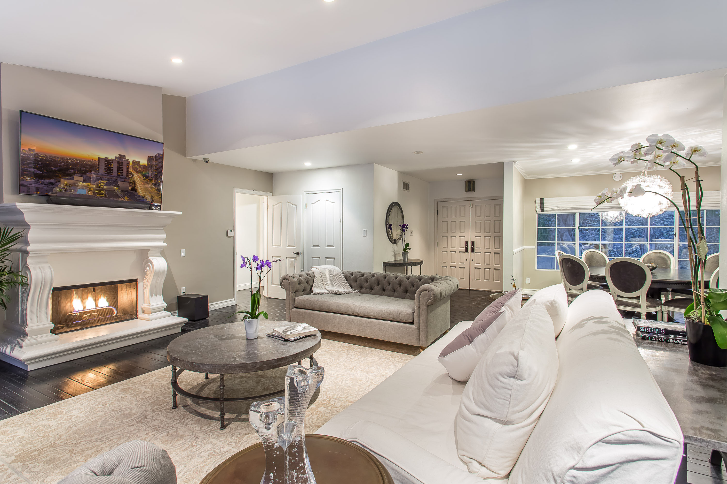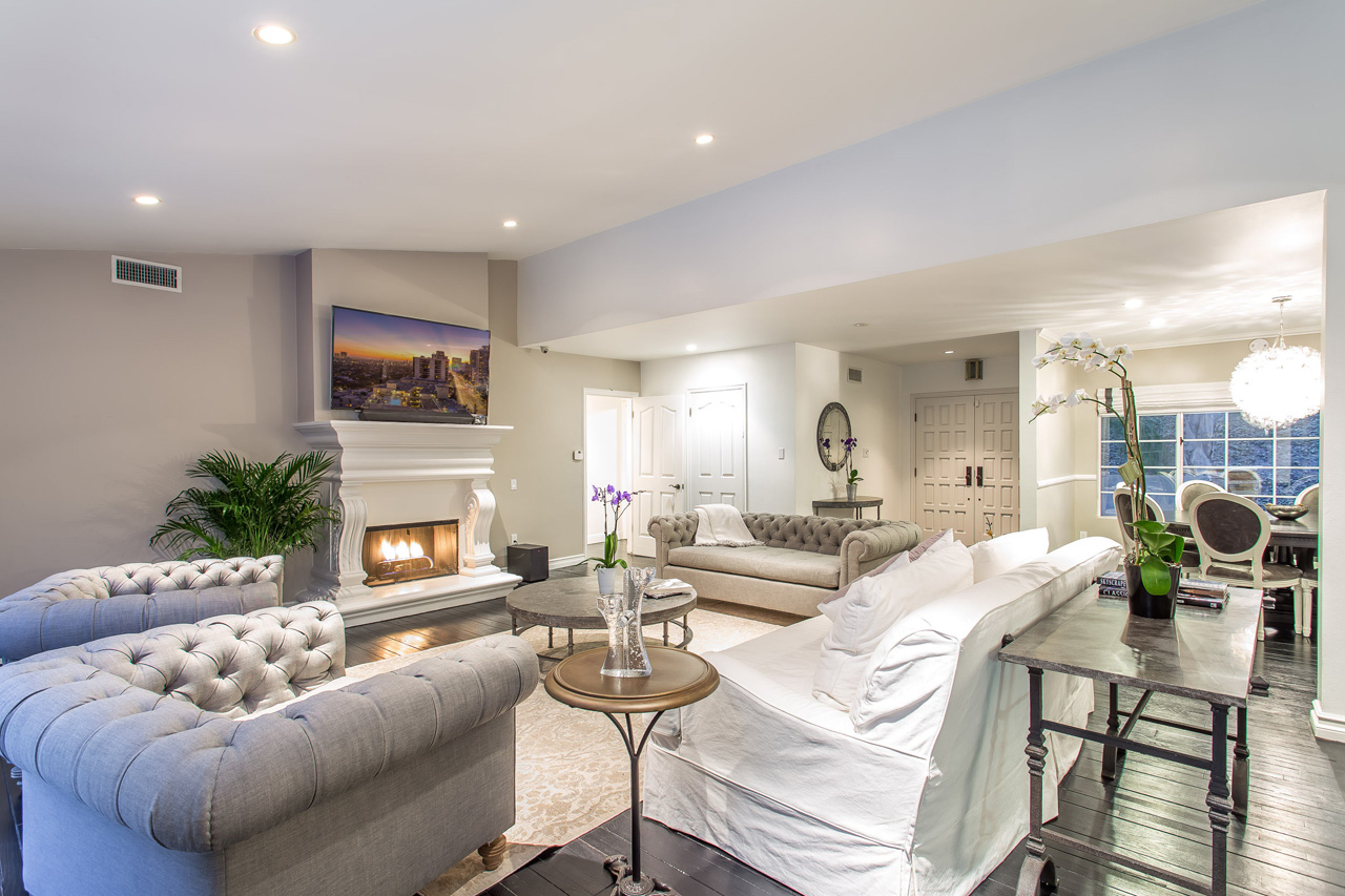 Chic and sophisticated mid-century contemporary designed to accentuate the warmth, functionality, and flow of Southern California indoor/outdoor living. Park in the 2-car garage or circular driveway and enter into an expansive open floor plan with soaring high ceilings, handsome dark hardwood floors, a cozy fireplace, and open living and dining areas, all while boasting 30 feet of wall-to-wall sliding glass doors that open to the backyard and sparkling pool. A gourmet kitchen, situated next to the living room, features granite countertops, stainless steel appliances, and an eat-in breakfast area. Four spacious bedrooms including a mater suite with two walk-in closets, a spa-like master bathroom with shower and bathtub, and a separate en-suite bedroom perfect for guests, an office, a family room, a play area, or a theater. Secluded outdoor entertaining area with pool and gazebo overlooking the generous private backyard. The home is finished with a surveillance system, 16-channel DVR, 9-color cameras, and ADP alarm system with radar and glass break protection. Enjoy the best 90210 has to offer.