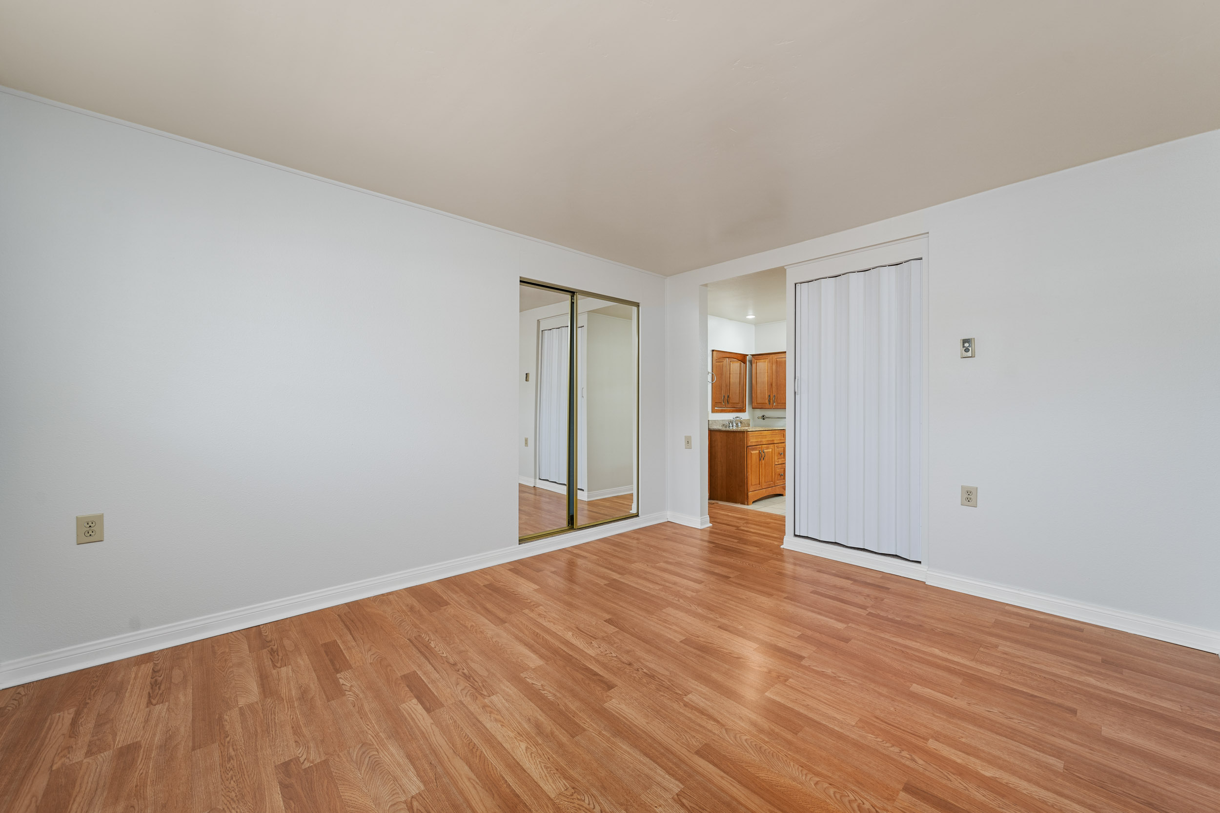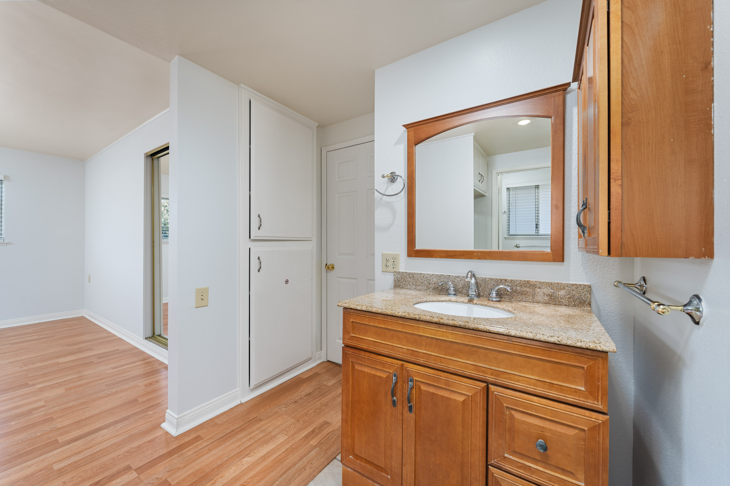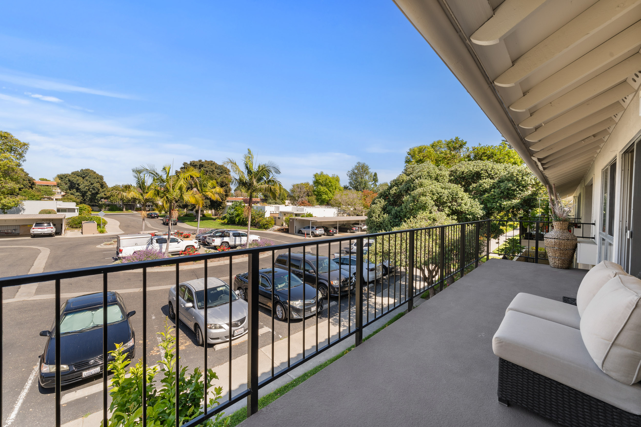 This charming 2-bedroom, 2-bath home is located on the second floor with no one above and features a spacious open layout, perfect for everyday comfort or entertaining. Step inside to find freshly painted walls, smooth ceilings, and rich laminate flooring with no carpet throughout. The fully remodeled kitchen has been thoughtfully opened up to the living area, creating a seamless flow. It features custom cabinetry with soft-close drawers, granite countertops, recessed lighting, stainless steel appliances, and stylish pendant lighting. The oversized front balcony is accessible from both the living room and guest bedroom—ideal for enjoying your morning coffee or unwinding with sunset views. The bathrooms have been updated with granite counters, tile floors, and modern fixtures. Additional upgrades include mirrored closet doors, an in-unit dishwasher, garbage disposal, and air conditioning. This condo also includes a covered carport with storage just steps from the unit, and there's ample guest parking right out front. Conveniently located in one of the quietest corners of the community, you’ll enjoy both privacy and accessibility. Community Highlights: Laguna Woods Village is a 55+ resort-style community offering an unmatched lifestyle with amenities that include a 27-hole championship golf course, 9-hole executive course, 5 pools, tennis and pickleball courts, gyms, horse stables, over 200 clubs, 7 clubhouses, and a performing arts theater. HOA dues include: water, trash, cable TV, bus transportation, fitness centers, golf, and more. Don’t miss your chance to own this turn-key home in one of Orange County’s most vibrant active adult communities!