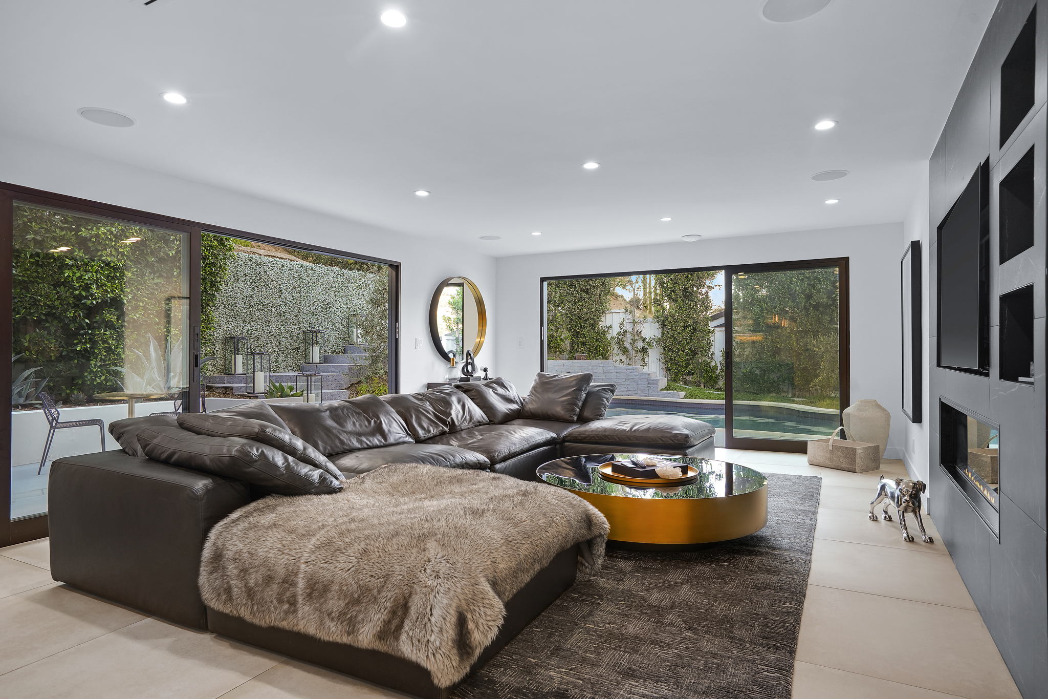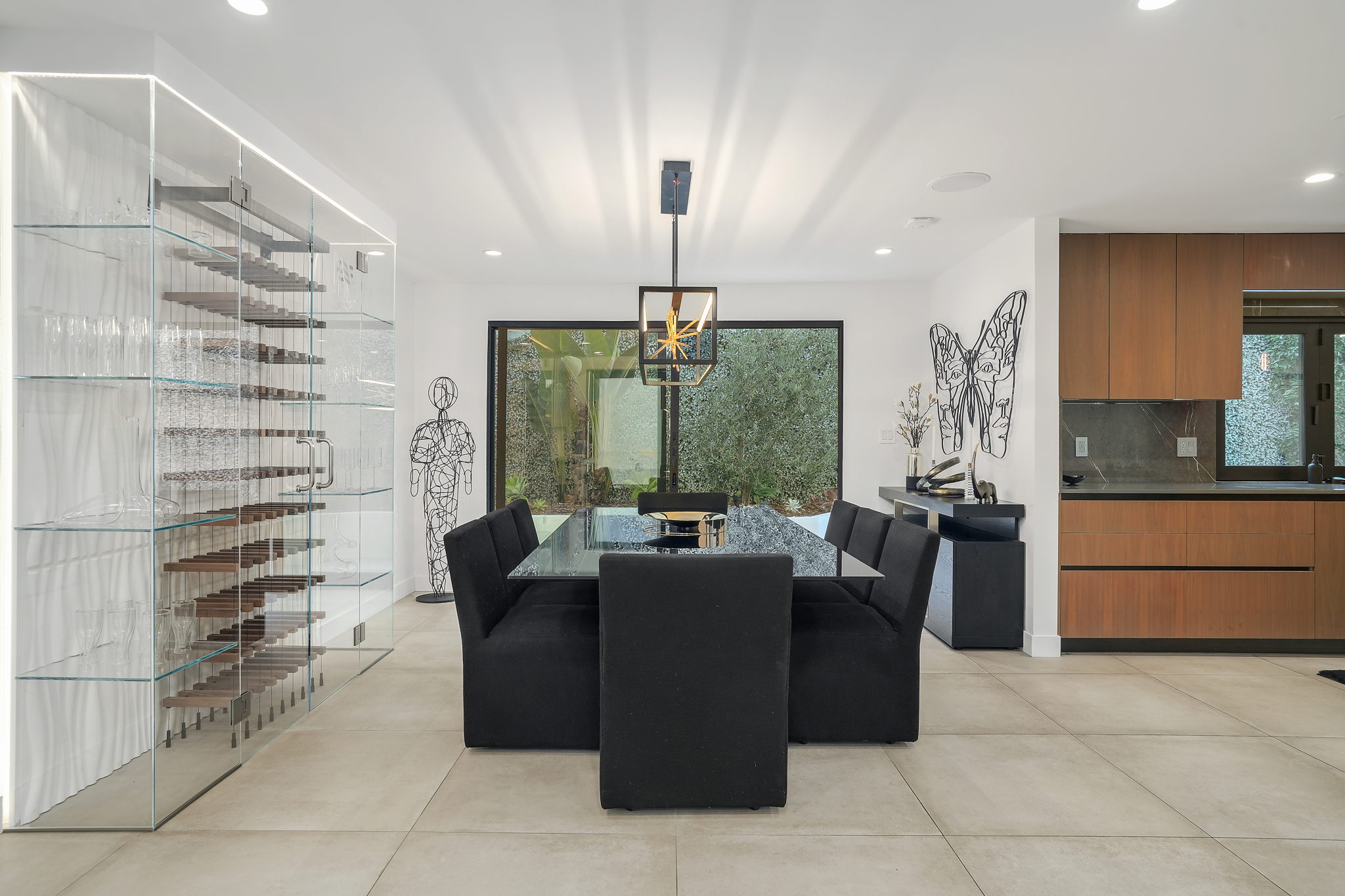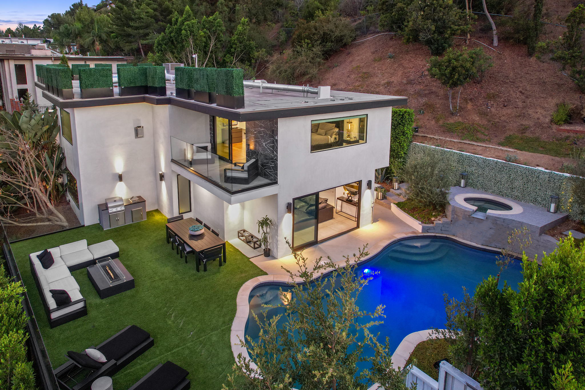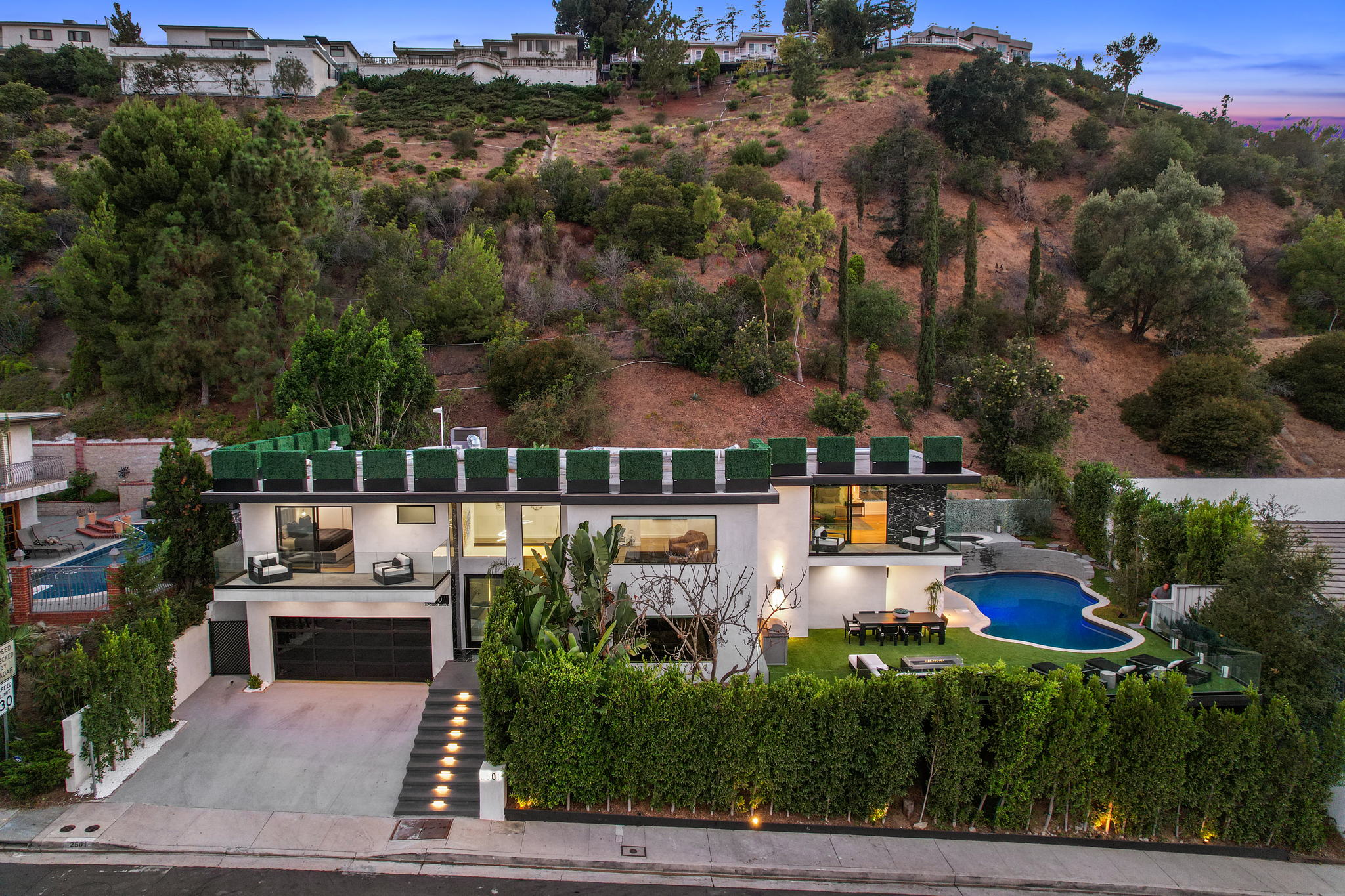 A recently renovated contemporary masterpiece in Mount Olympus with meticulous design and impeccable attention to detail. Past the private mature hedging, enter via the impressive oversized pivot door into the open dining, kitchen and living rooms. Sliding floor-to-ceiling glass doors allow an abundance of natural light and open to the sparkling pool and spa, spacious grassy yard, and stunning canyon views. The chef's kitchen is replete with Miele appliances, a custom 11 ft. slab countertop island, and walnut cabinetry. A gorgeous 4k movie theater completes the main level. Upstairs lies a massive 1,000+ sq. ft. primary suite retreat with a jaw-dropping designer bathroom, walk-in closet, private balcony, and separate private living area perfect for an office, nursery, or home gym. 3 additional bedrooms upstairs with one currently built-out as an additional luxurious walk-in closet. Indisputably one of the best opportunities for purchase in the Hollywood Hills considering its price, location, amenities, and finishes.