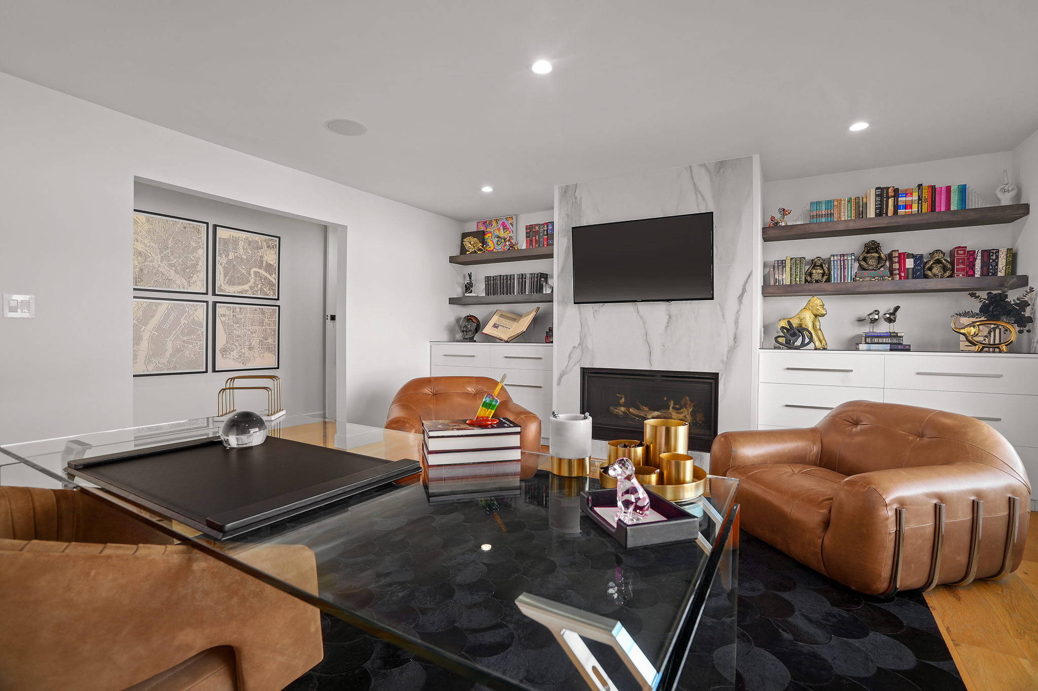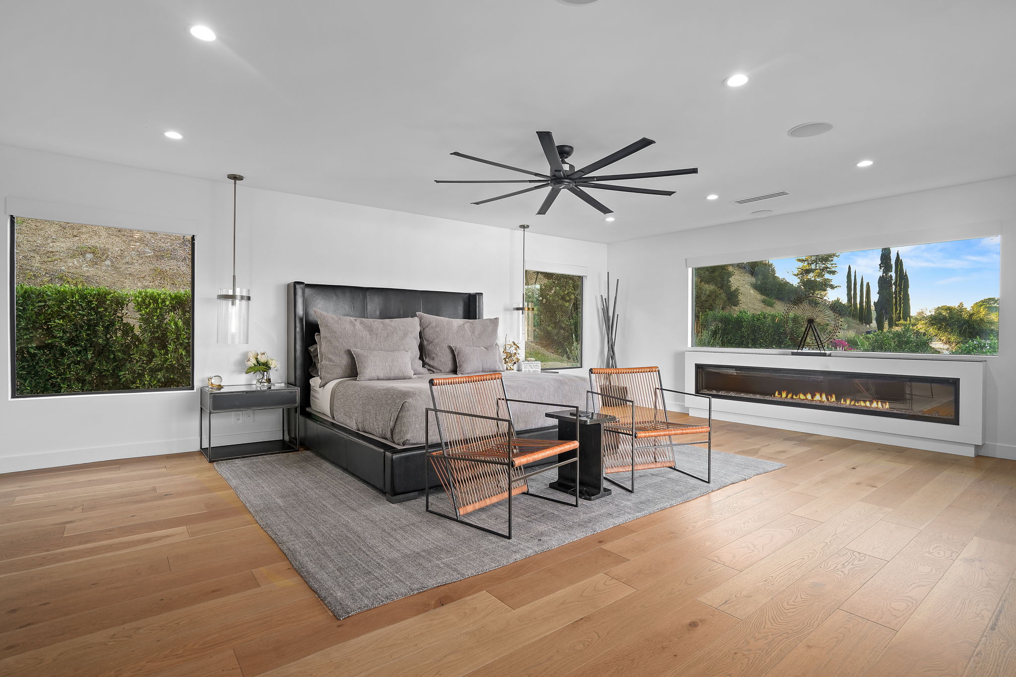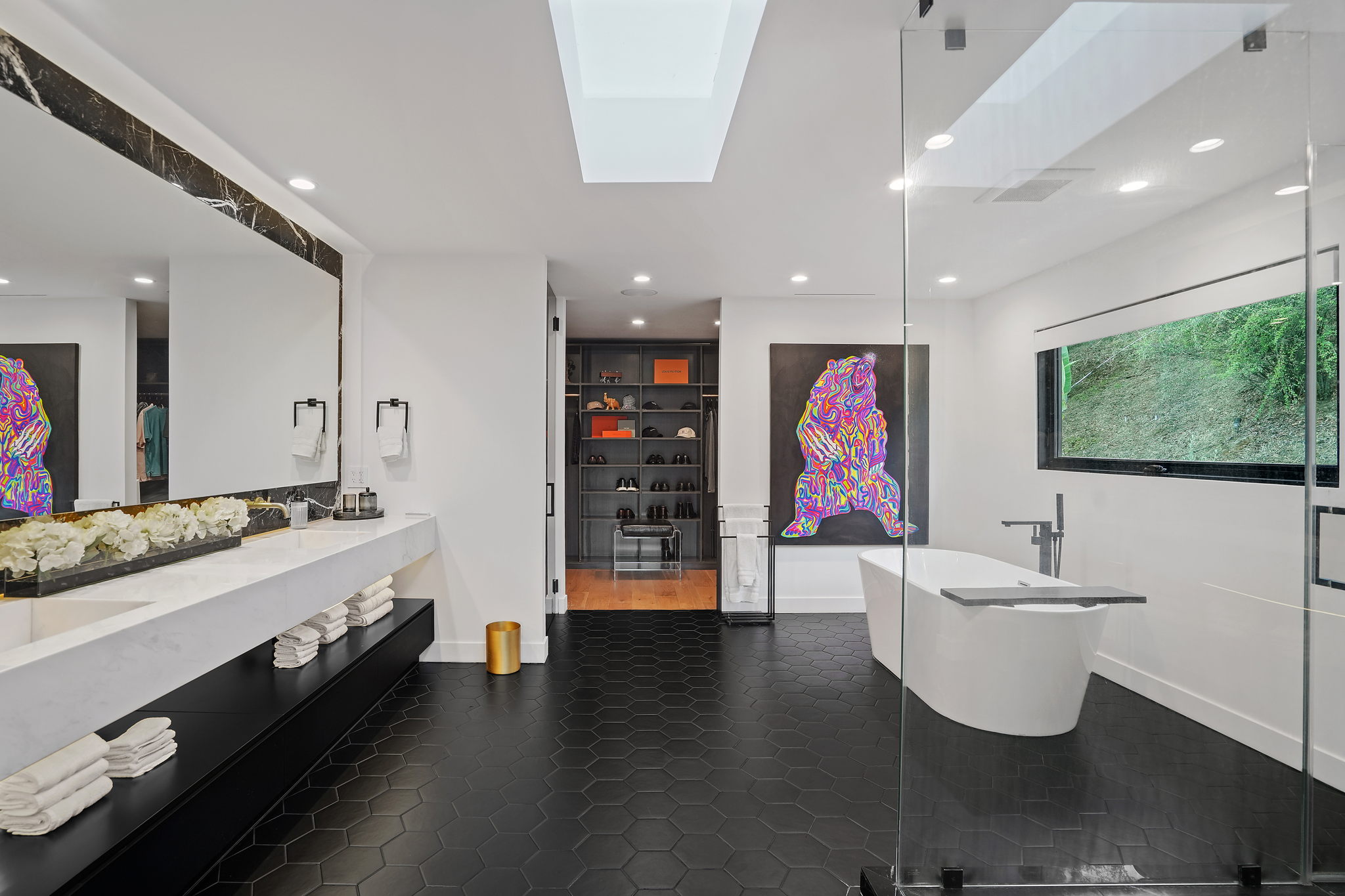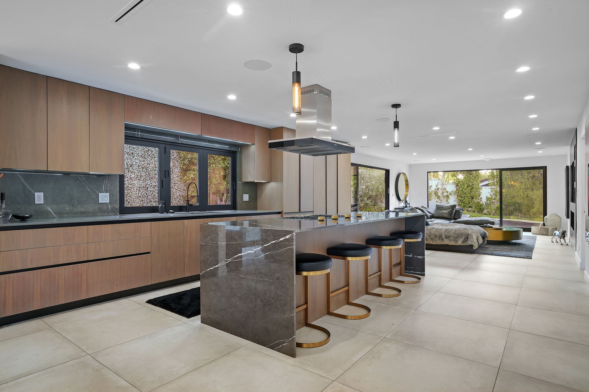A recently renovated contemporary masterpiece in Mount Olympus with meticulous design and impeccable attention to detail. Past the private mature hedging, enter via the impressive oversized pivot door into the open dining, kitchen and living rooms. Sliding floor-to-ceiling glass doors allow an abundance of natural light and open to the sparkling pool and spa, spacious grassy yard, and stunning canyon views. The chef's kitchen is replete with Miele appliances, a custom 11 ft. slab countertop island, and walnut cabinetry. A gorgeous 4k movie theater completes the main level. Upstairs lies a massive 1,000+ sq. ft. primary suite retreat with a jaw-dropping designer bathroom, walk-in closet, private balcony, and separate private living area perfect for an office, nursery, or home gym. 3 additional bedrooms upstairs with one currently built-out as an additional luxurious walk-in closet. Indisputably one of the best opportunities for purchase in the Hollywood Hills considering its price, location, amenities, and finishes.