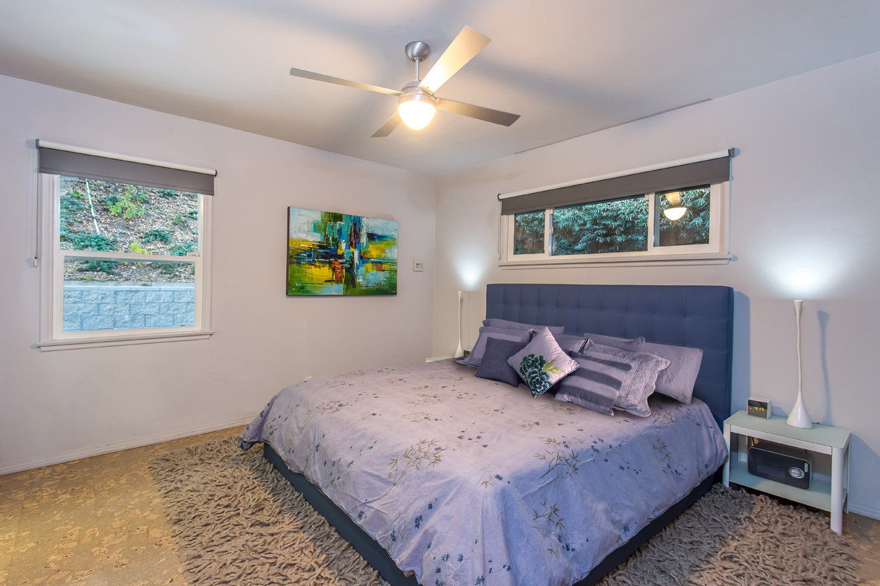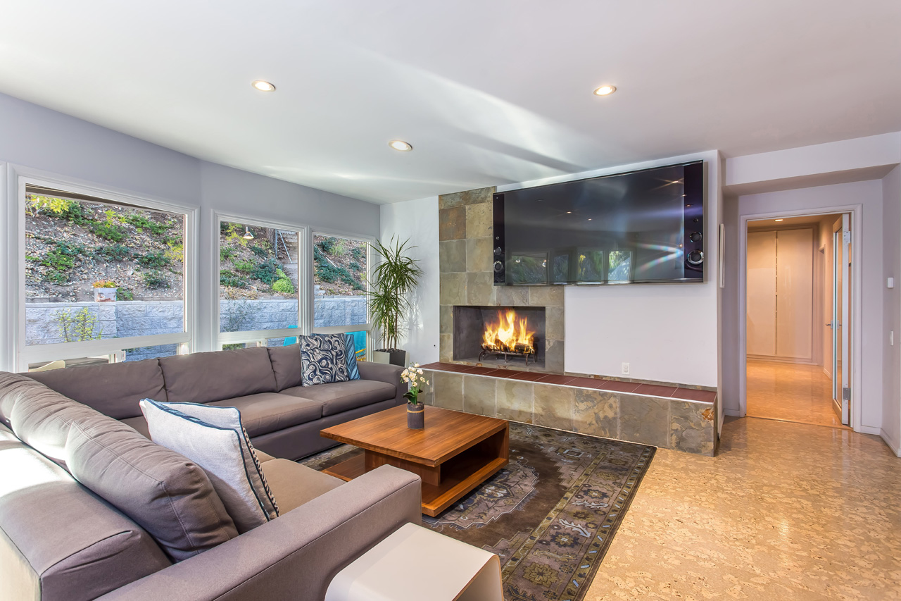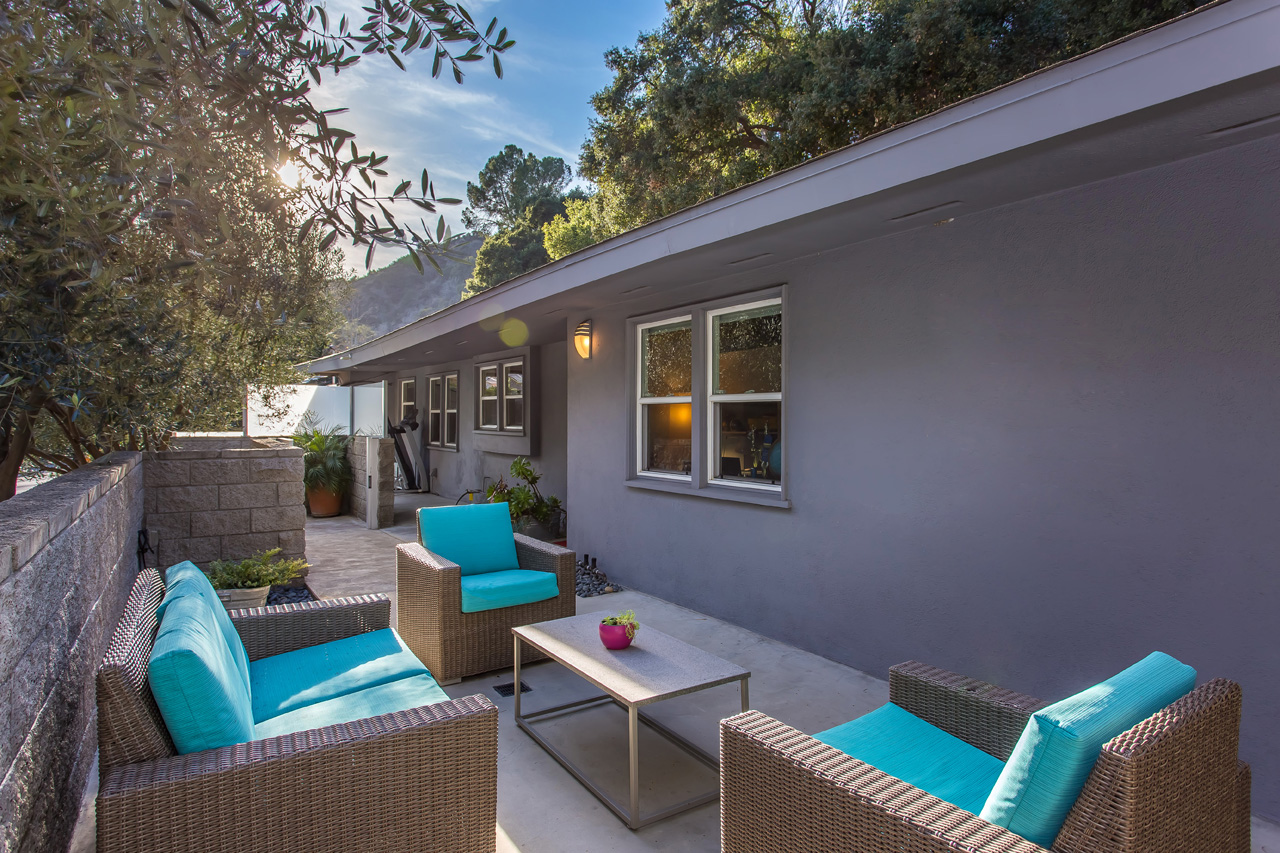 Sleek and sophisticated Mid-Century home located in one of the most prestigious areas of the Beverly Hills PO. Hidden behind the mature shrubbery of Oak and Olive trees, enter into a light-filled living room with wall-to-wall glass windows, complete with a cozy fireplace and dining area overlooking the backyard. Modern kitchen with GE Monogram chef-quality stainless steel applianced and imported Portuguese cork flooring, with detached bar area perfect for entertaining. Three bedrooms including a master suite with walk-in closet and spa-like bathroom. Serene, park-like backyard with private patios surrounded by greenery in both the front and back of the home, complete with a 2 car garage.