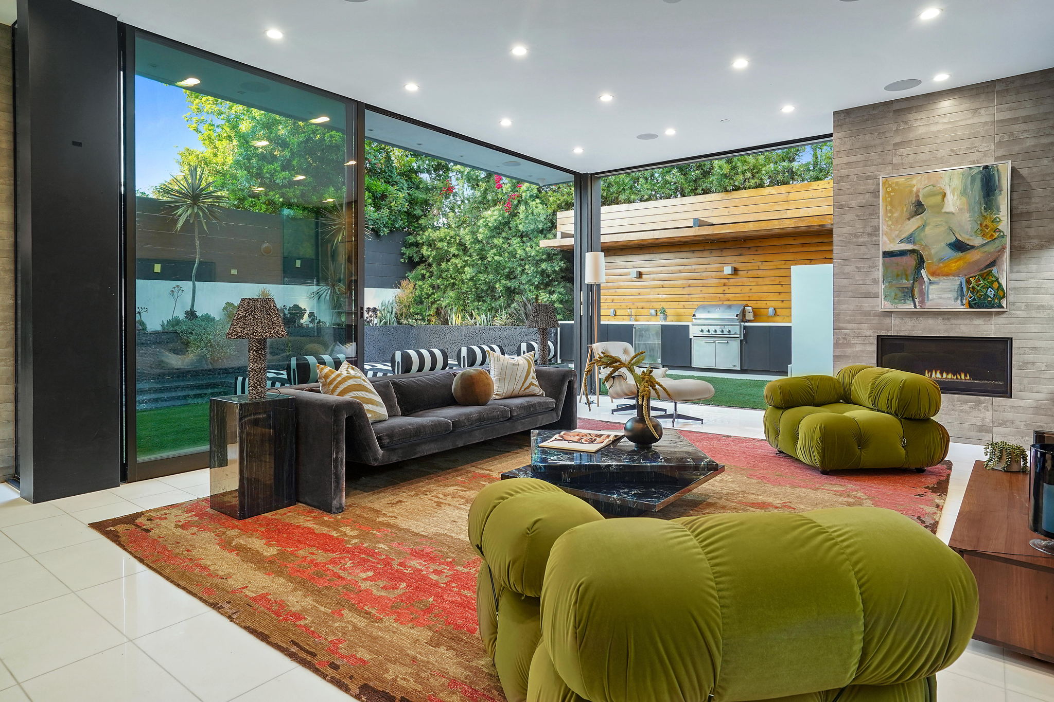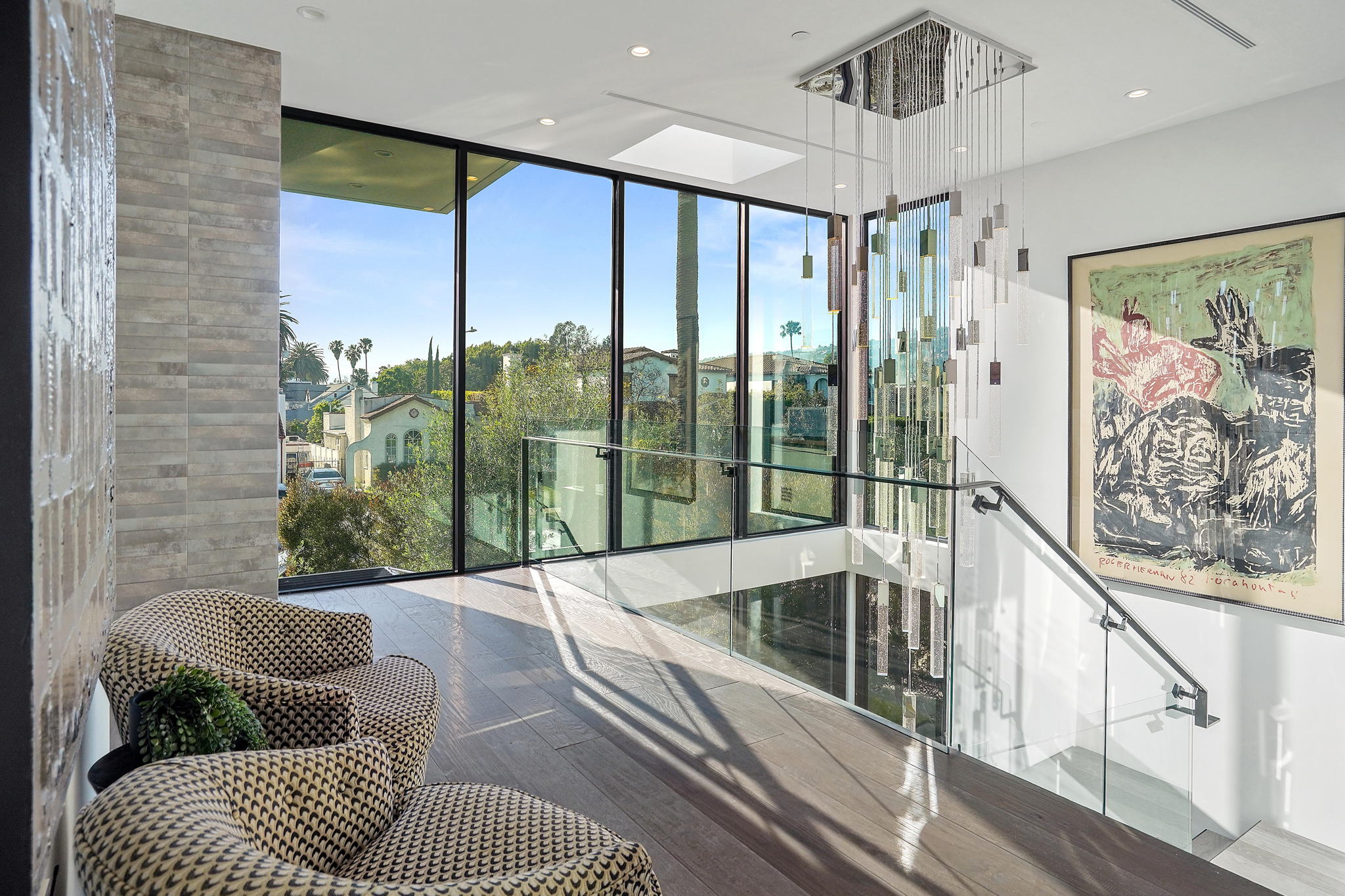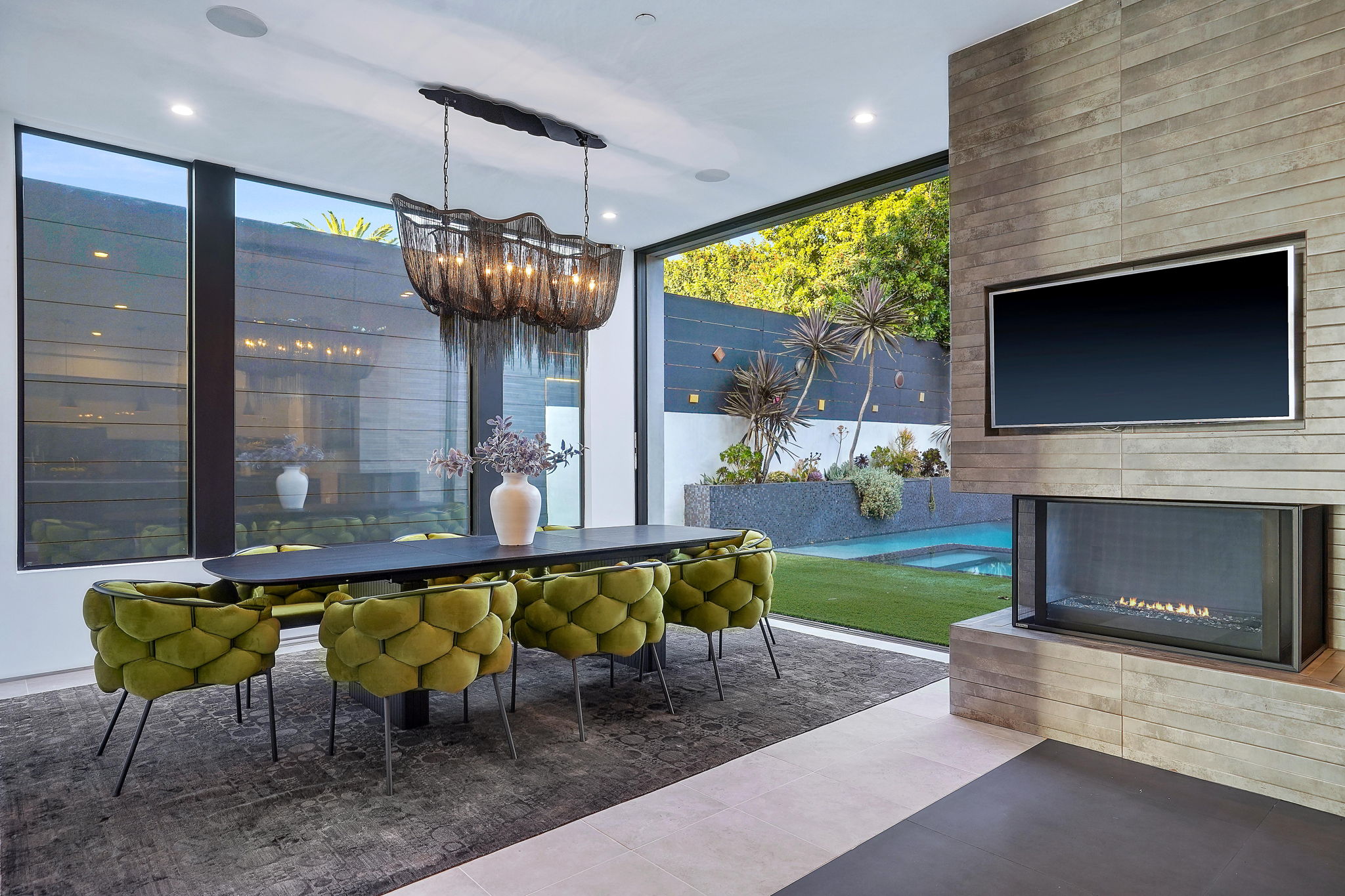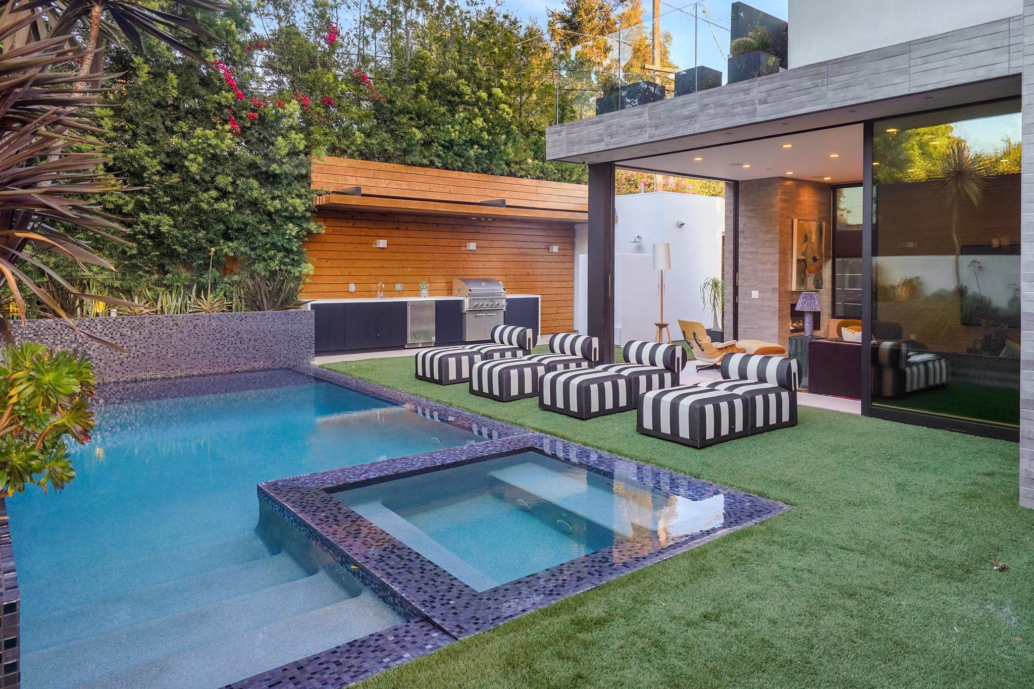 An exquisitely and meticulously crafted contemporary estate boasting 5 bedrooms and 5 bathrooms with unique state-of-the-art features and finishes. Enter through the grand foyer with high ceilings and floor-to-ceiling glass windows offering ample sunlight. The open chef's kitchen with top-of-the-line appliances includes Scavolini Italian cabinets and unique Italian glass "leather" counters. Fleetwood sliding doors provide quintessential California indoor/outdoor living, and open to the private backyard replete with a sparkling saltwater negative edge pool and spa, waterfalls, built-in BBQ area, and outdoor shower. Two fireplaces downstairs in living and dining areas. One bedroom with ensuite bathroom downstairs, and three bedrooms upstairs including a library/office with a spacious patio overlooking the front yard. The fully private upstairs primary suite contains a large walk-in closet, bathroom, fireplace, patio overlooking the backyard, and access to the rooftop. Enjoy the panoramic views of the city and hills from the rooftop deck which has a built-in motorized TV and wet bar/kitchen. Full smart home with Lutron System to control the pool, appliances, lights, surround sound music and TV, and AC by iPad or iPhone. The elevator provides access to the second floor and rooftop deck as well. Laundry room off of kitchen by the garage. Gated driveway and attached 2-car garage. Square footage likely includes rooftop deck.