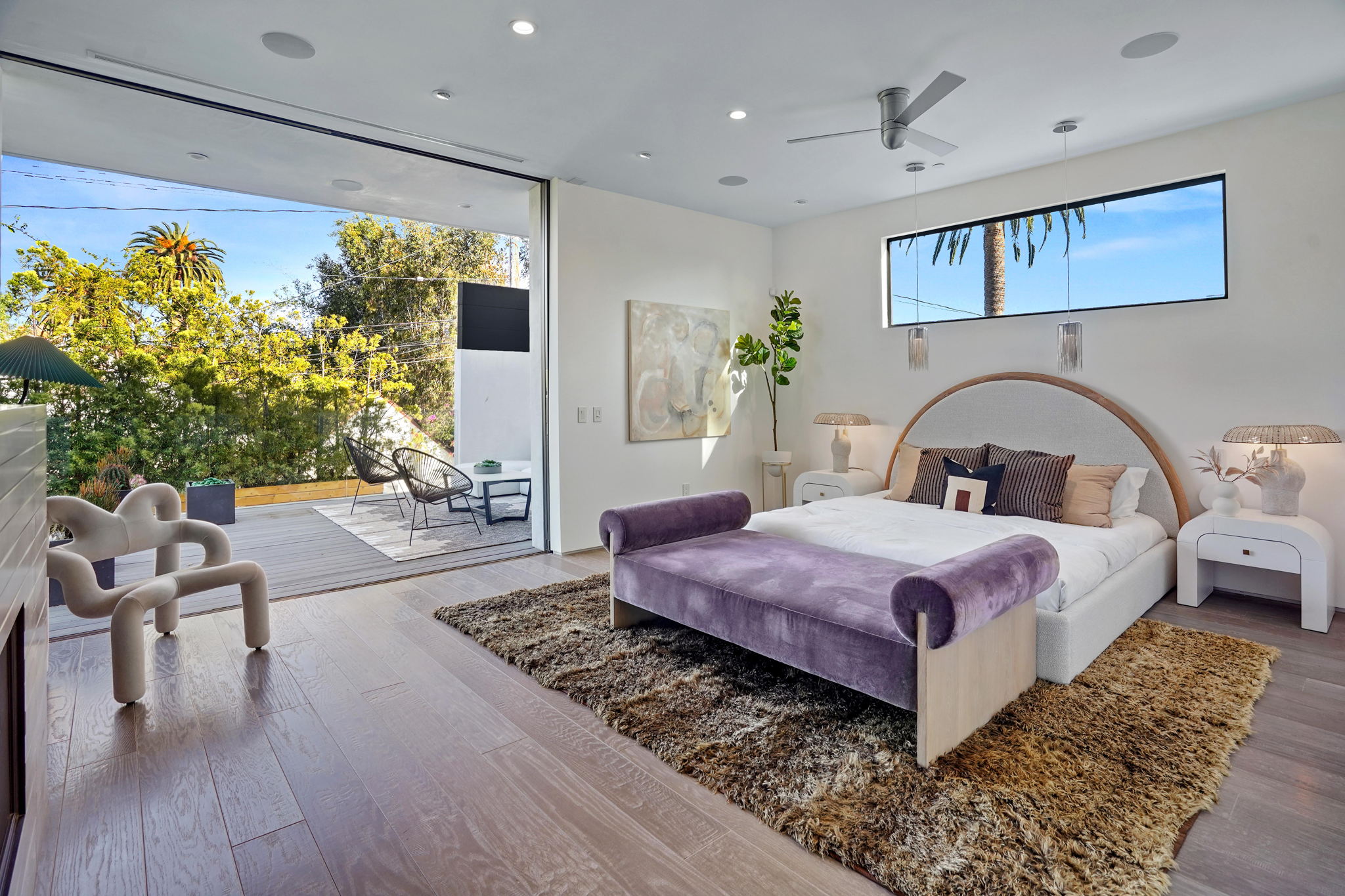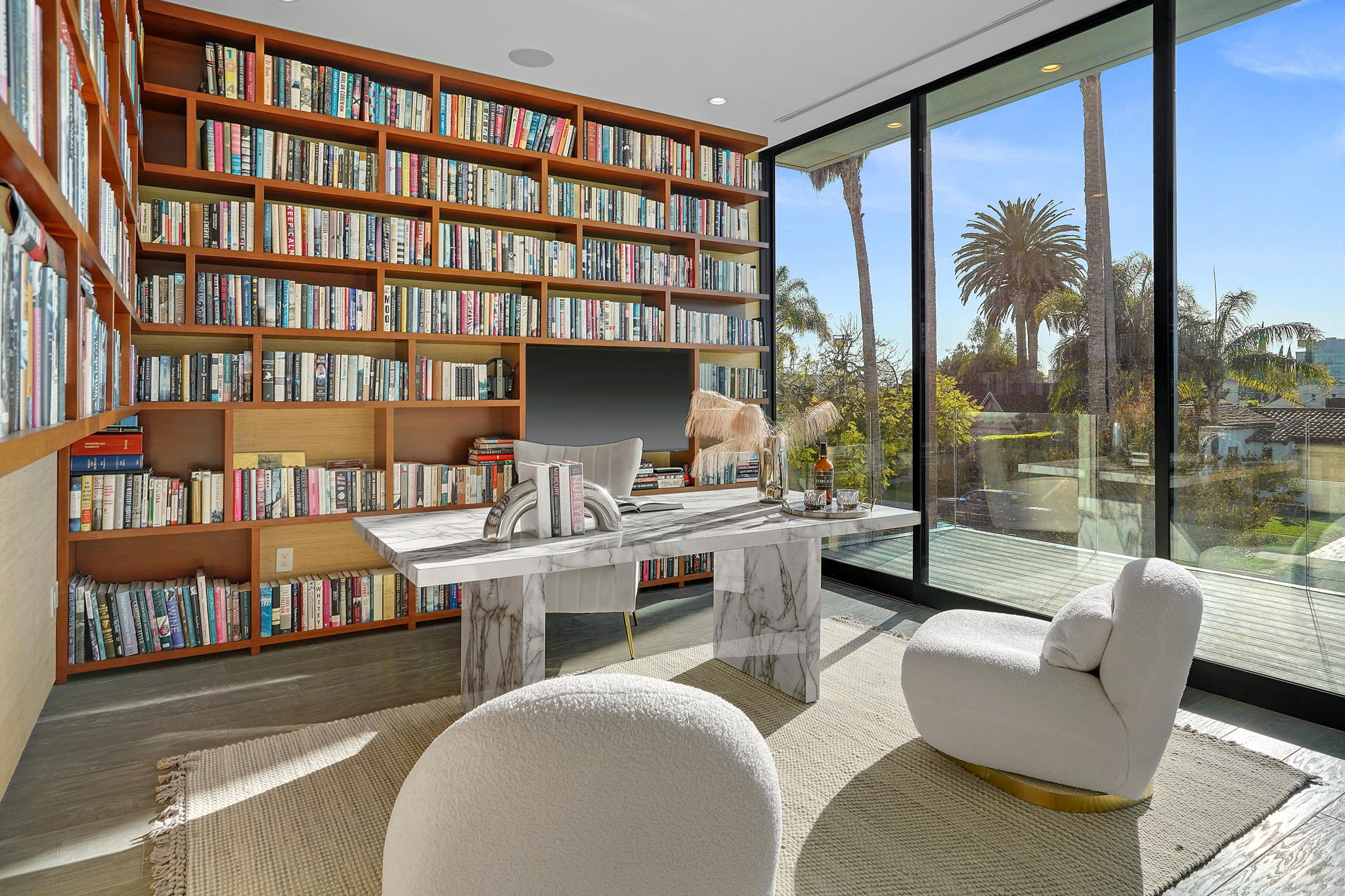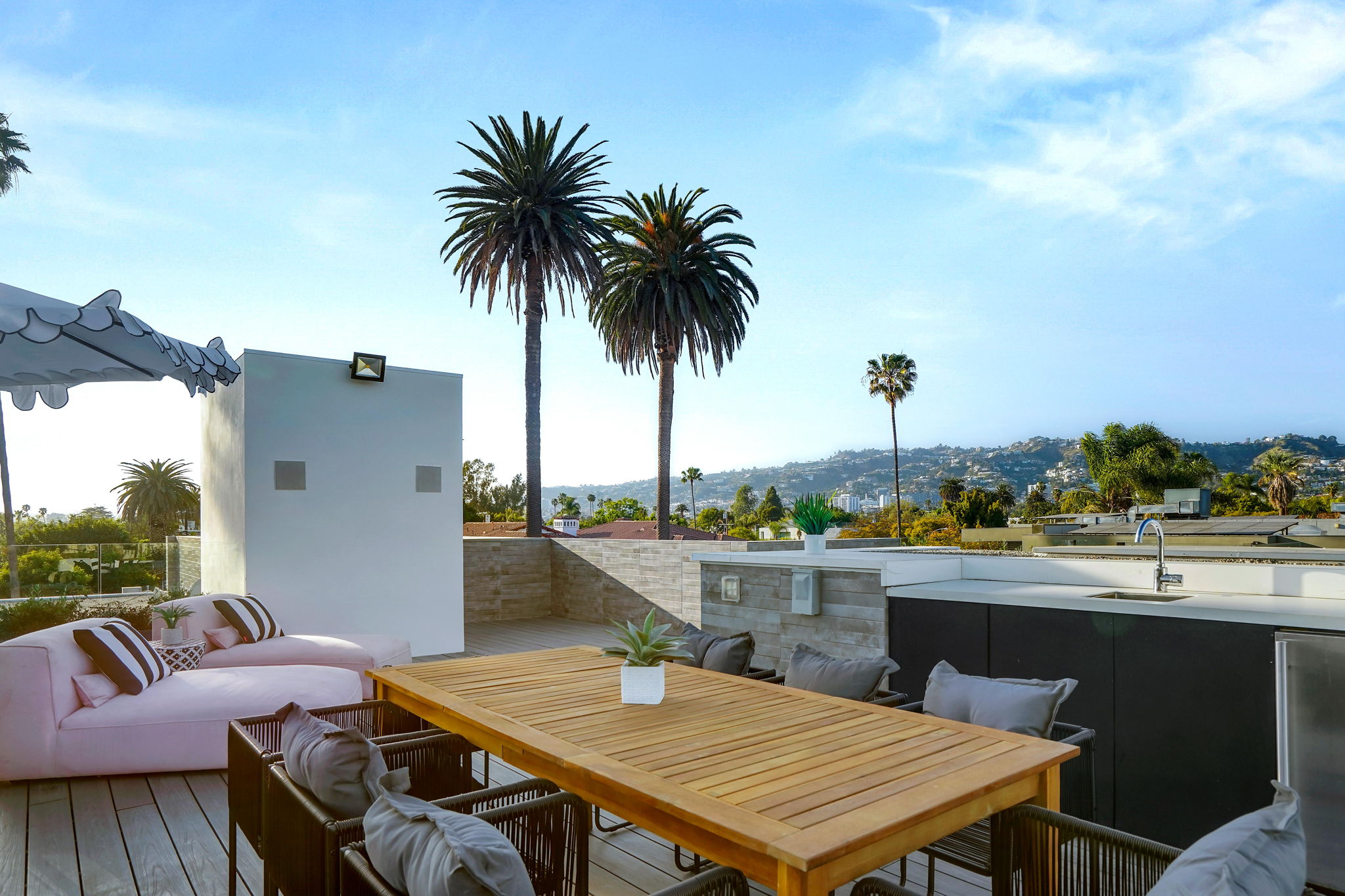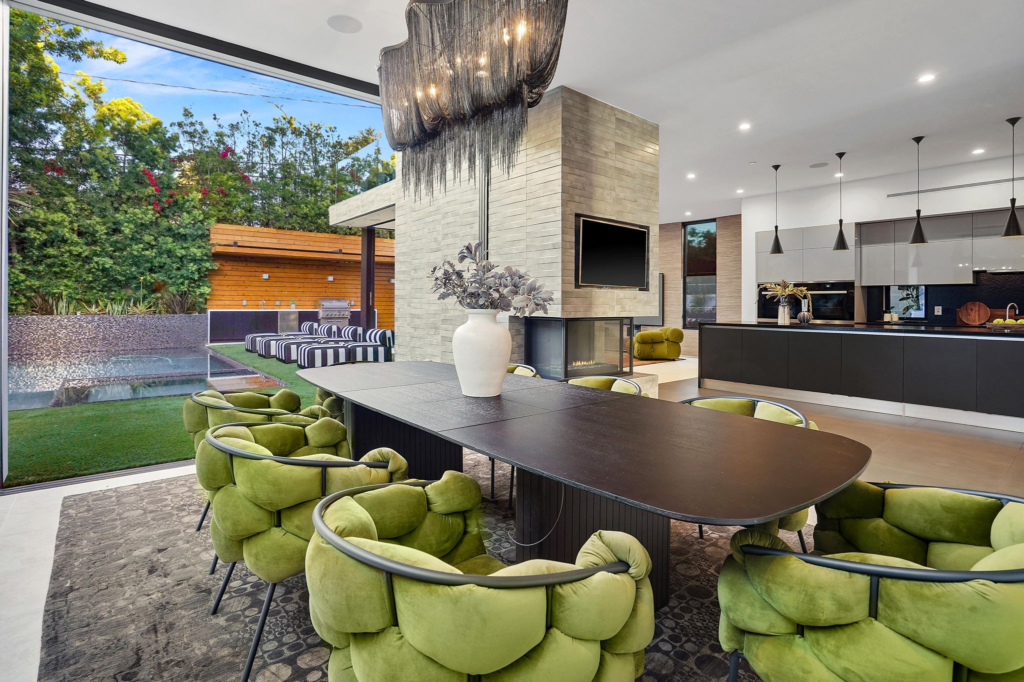 An exquisitely and meticulously crafted contemporary estate boasting 5 bedrooms and 5 bathrooms with unique state-of-the-art features and finishes. Enter through the grand foyer with high ceilings and floor-to-ceiling glass windows offering ample sunlight. The open chef's kitchen with top-of-the-line appliances includes Scavolini Italian cabinets and unique Italian glass "leather" counters. Fleetwood sliding doors provide quintessential California indoor/outdoor living, and open to the private backyard replete with a sparkling saltwater negative edge pool and spa, waterfalls, built-in BBQ area, and outdoor shower. Two fireplaces downstairs in living and dining areas. One bedroom with ensuite bathroom downstairs, and three bedrooms upstairs including a library/office with a spacious patio overlooking the front yard. The fully private upstairs primary suite contains a large walk-in closet, bathroom, fireplace, patio overlooking the backyard, and access to the rooftop. Enjoy the panoramic views of the city and hills from the rooftop deck which has a built-in motorized TV and wet bar/kitchen. Full smart home with Lutron System to control the pool, appliances, lights, surround sound music and TV, and AC by iPad or iPhone. The elevator provides access to the second floor and rooftop deck as well. Laundry room off of kitchen by the garage. Gated driveway and attached 2-car garage. Square footage likely includes rooftop deck.