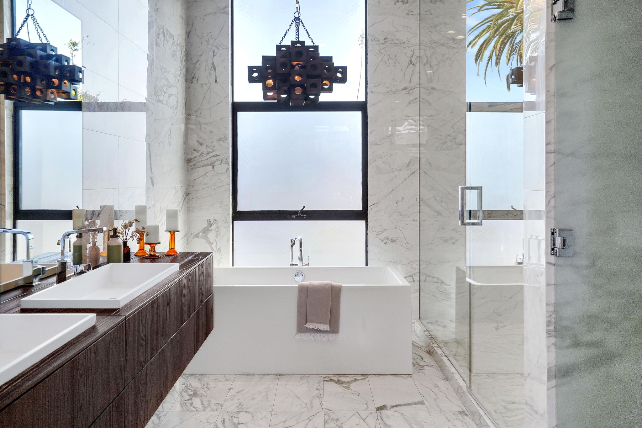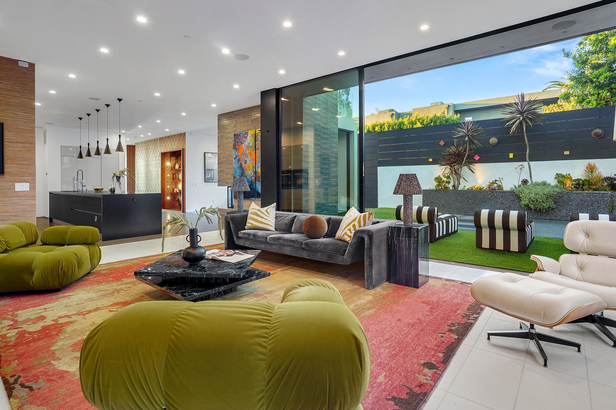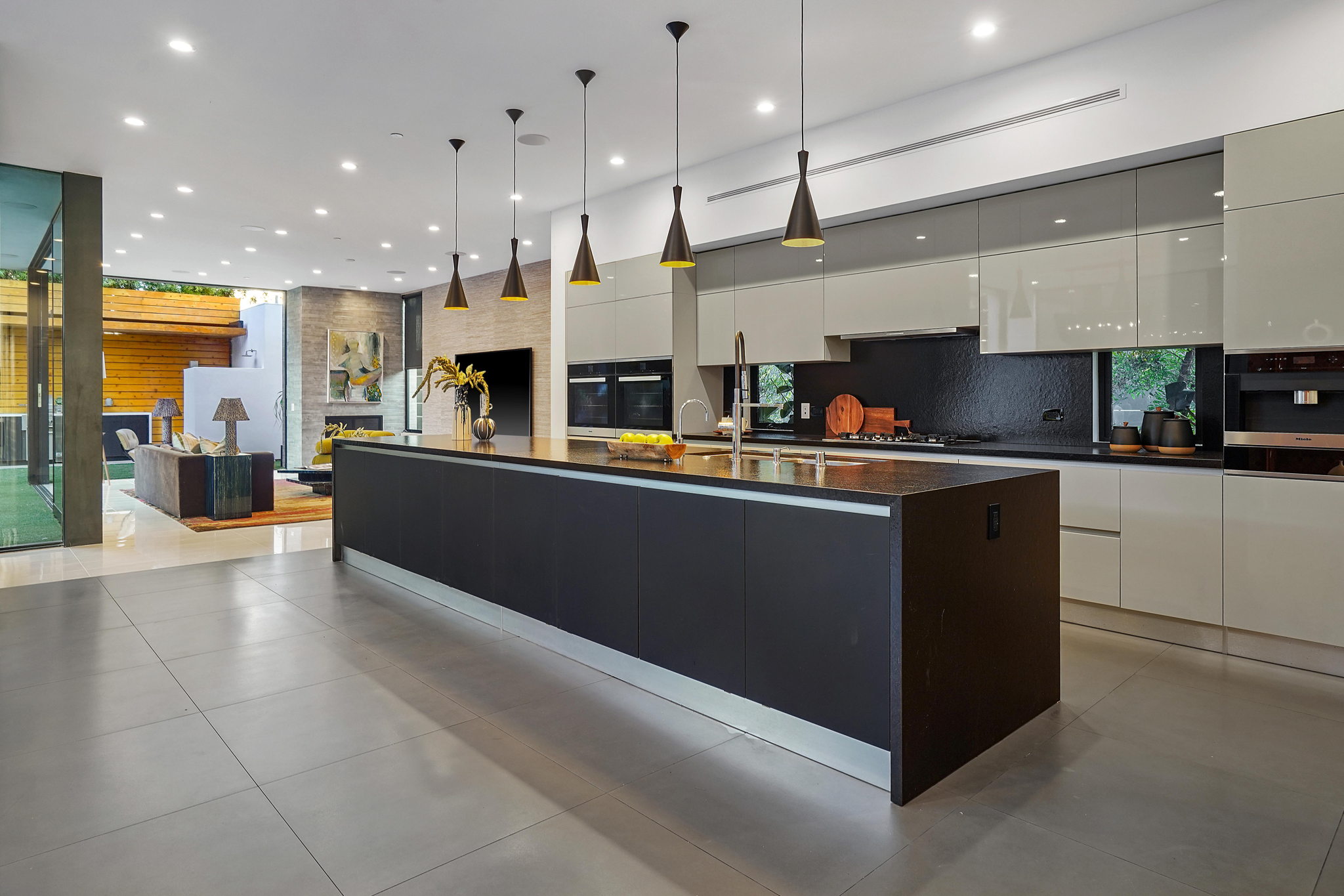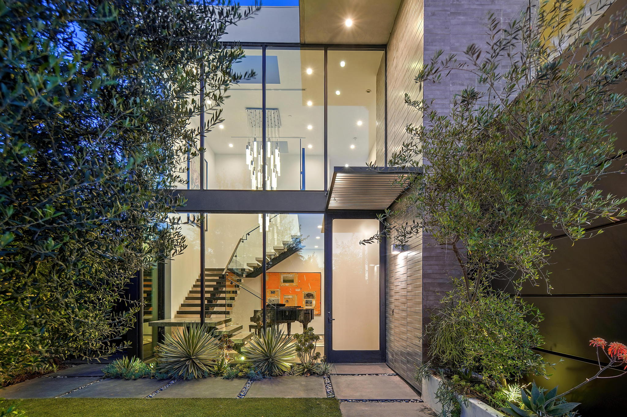 An exquisitely and meticulously crafted contemporary estate boasting 5 bedrooms and 5 bathrooms with unique state-of-the-art features and finishes. Enter through the grand foyer with high ceilings and floor-to-ceiling glass windows offering ample sunlight. The open chef's kitchen with top-of-the-line appliances includes Scavolini Italian cabinets and unique Italian glass "leather" counters. Fleetwood sliding doors provide quintessential California indoor/outdoor living, and open to the private backyard replete with a sparkling saltwater negative edge pool and spa, waterfalls, built-in BBQ area, and outdoor shower. Two fireplaces downstairs in living and dining areas. One bedroom with ensuite bathroom downstairs, and three bedrooms upstairs including a library/office with a spacious patio overlooking the front yard. The fully private upstairs primary suite contains a large walk-in closet, bathroom, fireplace, patio overlooking the backyard, and access to the rooftop. Enjoy the panoramic views of the city and hills from the rooftop deck which has a built-in motorized TV and wet bar/kitchen. Full smart home with Lutron System to control the pool, appliances, lights, surround sound music and TV, and AC by iPad or iPhone. The elevator provides access to the second floor and rooftop deck as well. Laundry room off of kitchen by the garage. Gated driveway and attached 2-car garage. Square footage likely includes rooftop deck.