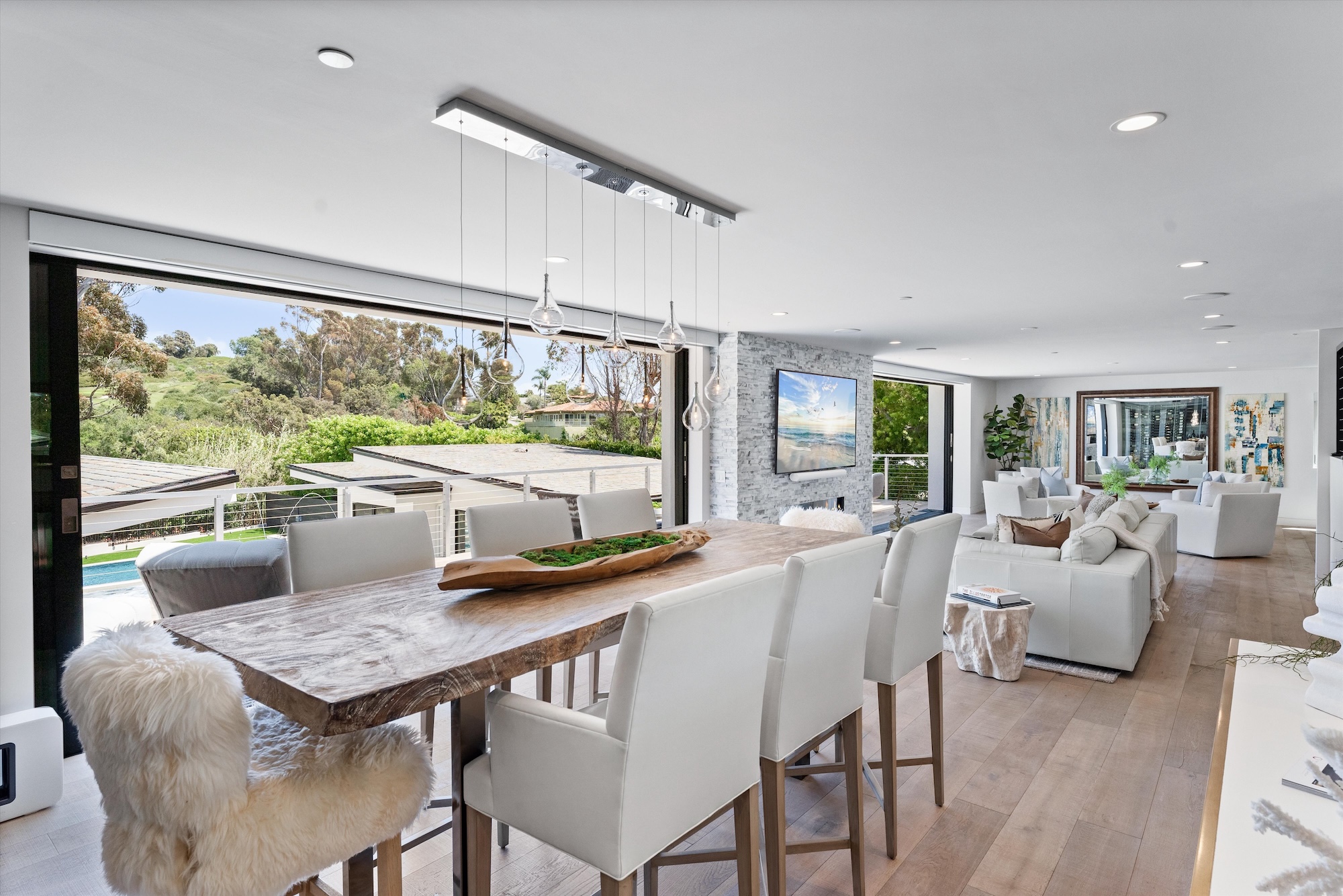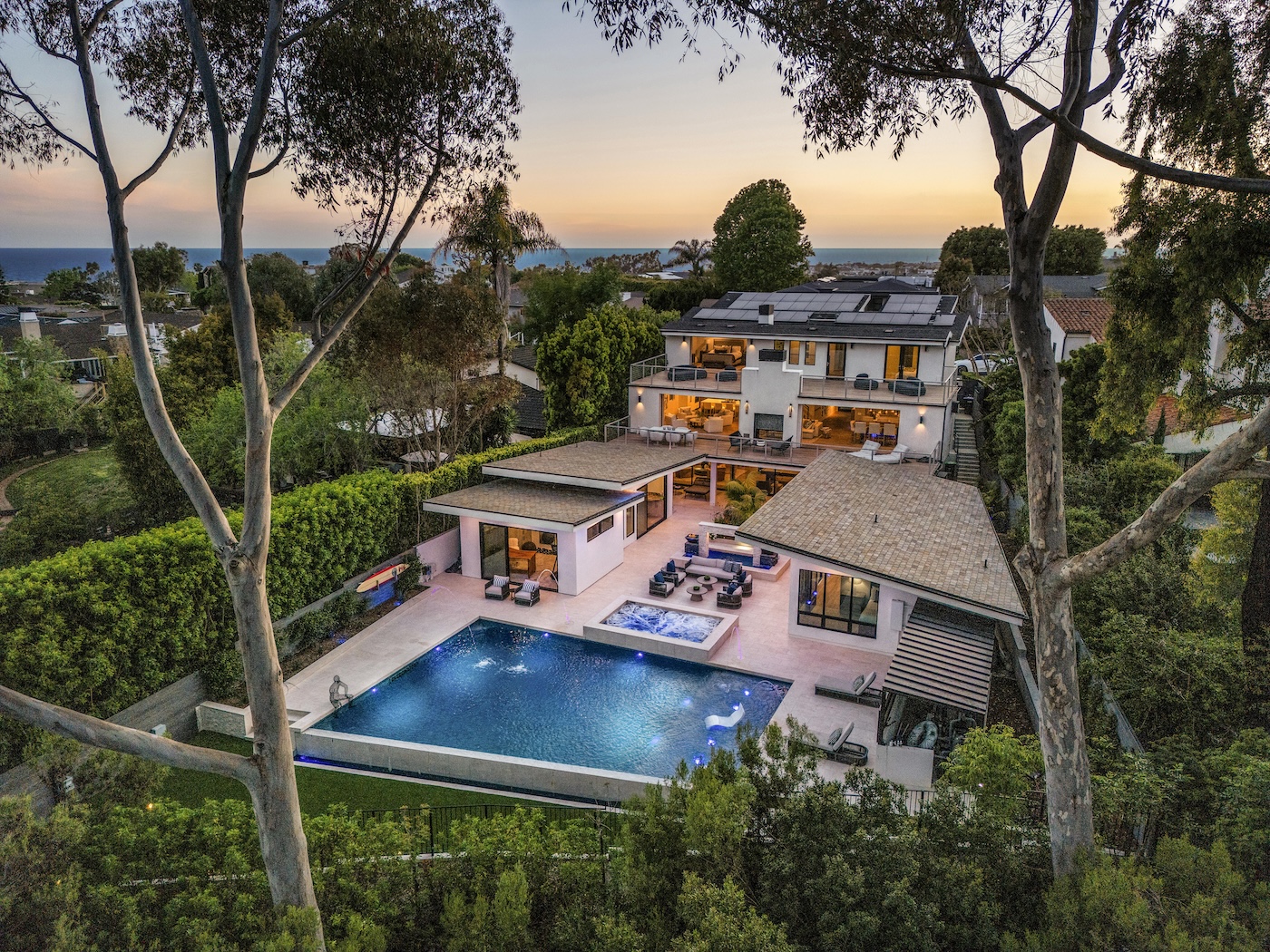 Introducing a 2018-built contemporary masterpiece nestled in the coveted neighborhood of Corona Highlands, right in the heart of Corona del Mar. Wake up to breathtaking sunrises and panoramic views overlooking the iconic Pelican Hill Golf Course. As you step through the oversized glass pivot door, you're immediately met with a captivating arrival. The main level is designed for seamless indoor-outdoor living, with floor-to-ceiling Fleetwood sliding doors that open to a spectacular pool and spa, fire features, and endless views of the golf course. The main floor also includes a guest suite with a full bathroom, a striking temperature-controlled glass wine cellar that holds over 600 bottles, and an open-concept living room centered around a sleek double-sided fireplace. The chef’s kitchen is outfitted with stainless steel Thermador appliances, a walk-in pantry, quartz countertops, and opens to a spacious balcony ideal for outdoor dining or lounging. Upstairs, your private sanctuary awaits. The primary suite offers a cozy fireplace, dual oversized walk-in closets, and a spa-like bath featuring brushed marble floors, a soaking tub, dual vanities, and a stunning all-glass shower. Floor-to-ceiling sliding doors open to a private terrace—perfect for taking in the serenity of nature and the golf course views in complete privacy. Two additional en-suite bedrooms and a spacious laundry room complete the upper level. Downstairs is an entertainer’s paradise, featuring a custom movie theater with a 120” screen, a game room, and a full bar equipped with beverage fridges, an ice maker, and ample seating. A whole-home surround sound system enhances the ambiance both inside and out. What truly sets this home apart is the one-of-a-kind, $3M custom-designed backyard. Designed to feel like your own private resort, it boasts a show-stopping pool and spa with fire bowls and water features, lush landscaping, an outdoor kitchen and BBQ, dining space, and two expansive detached ADUs—perfect for guests or multi-generational living. A luxurious steam room completes the experience. In Addition, fully owned solar. This home feels like a permanent vacation—where every day is elevated by luxury, design, and unforgettable views. With a generous three-car garage, there’s plenty of room for your cars, golf cart, or weekend toys—rounding out the ultimate coastal lifestyle. Just minutes from Corona del Mar Village, this home is conveniently close to top-tier restaurants, shops, and breathtaking beaches.