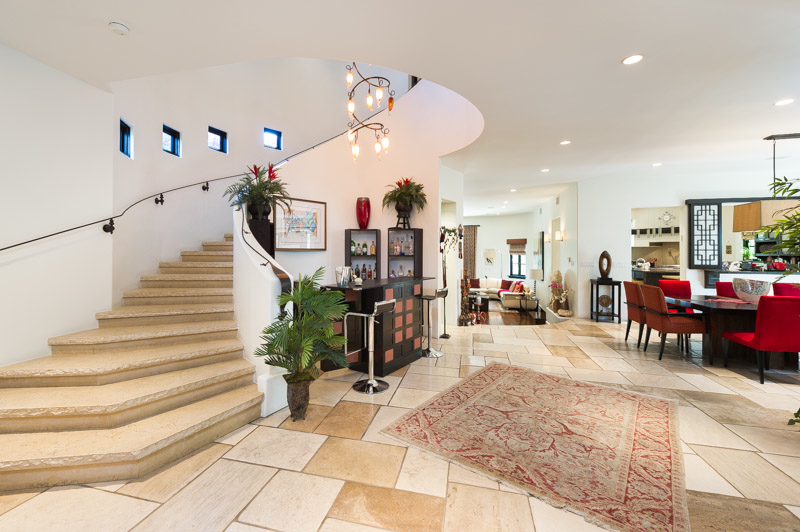 An immaculate Spanish-contemporary set behind lush hedges and a private driveway, with every convenience just minutes away. Meticulously crafted, this home boasts soaring ceilings, a grand staircase, bar area, large formal-dining area, and a step-down-living room that leads outside to a limestone patio, veranda and fire pit. Dark wood beams accentuate the second story ceiling, a fabulous focal point surrounded by 4 upstairs bedrooms, 3 bathrooms, and multiple balconies. A superb home on a tranquil street just minutes away from The Grove, Beverly Center, Beverly Hills, West Hollywood, Melrose shopping and restaurants.