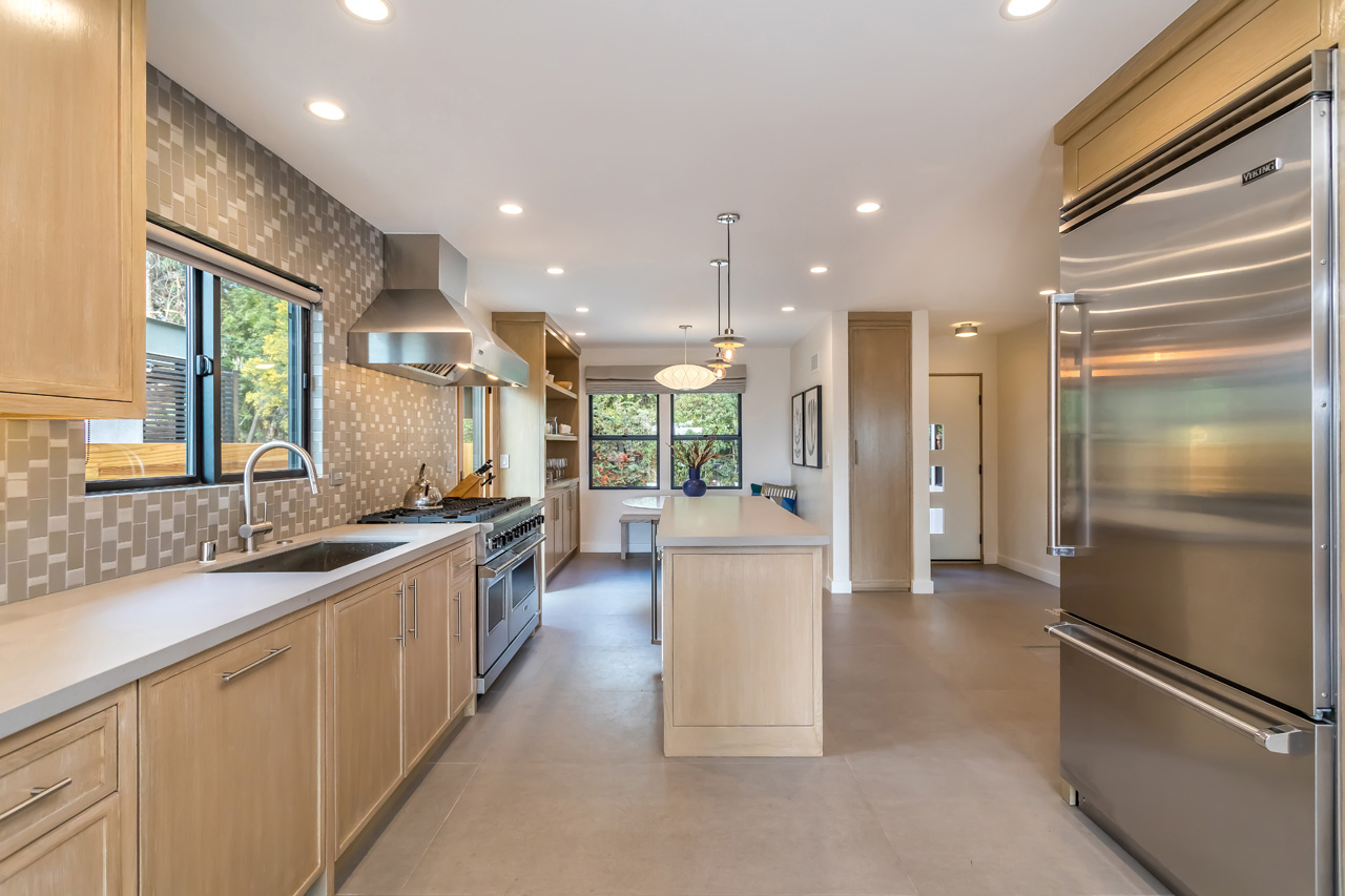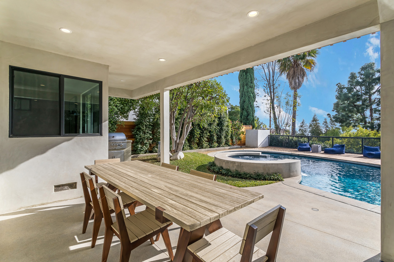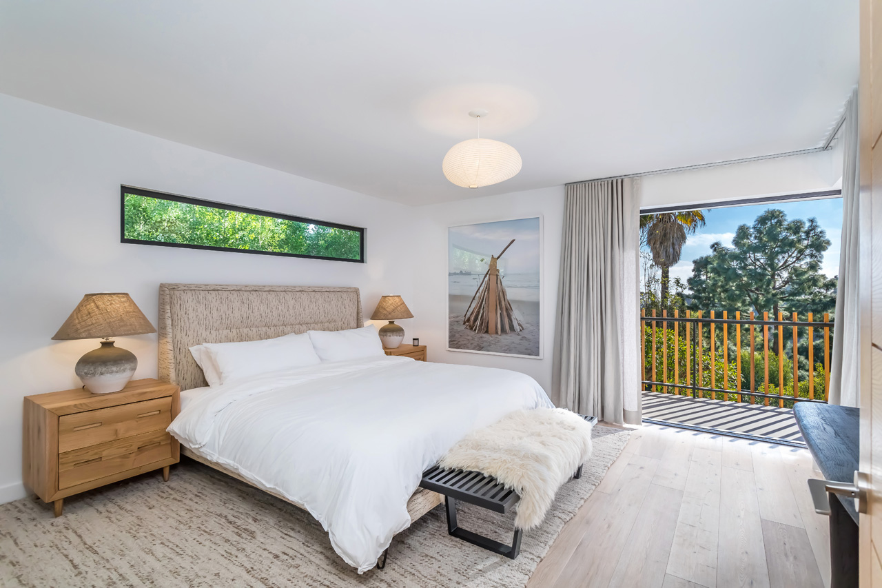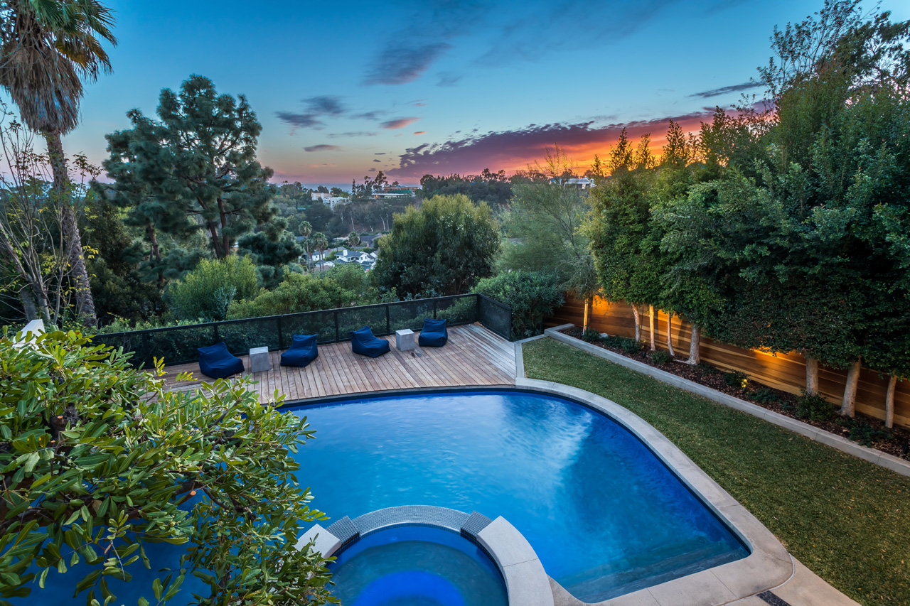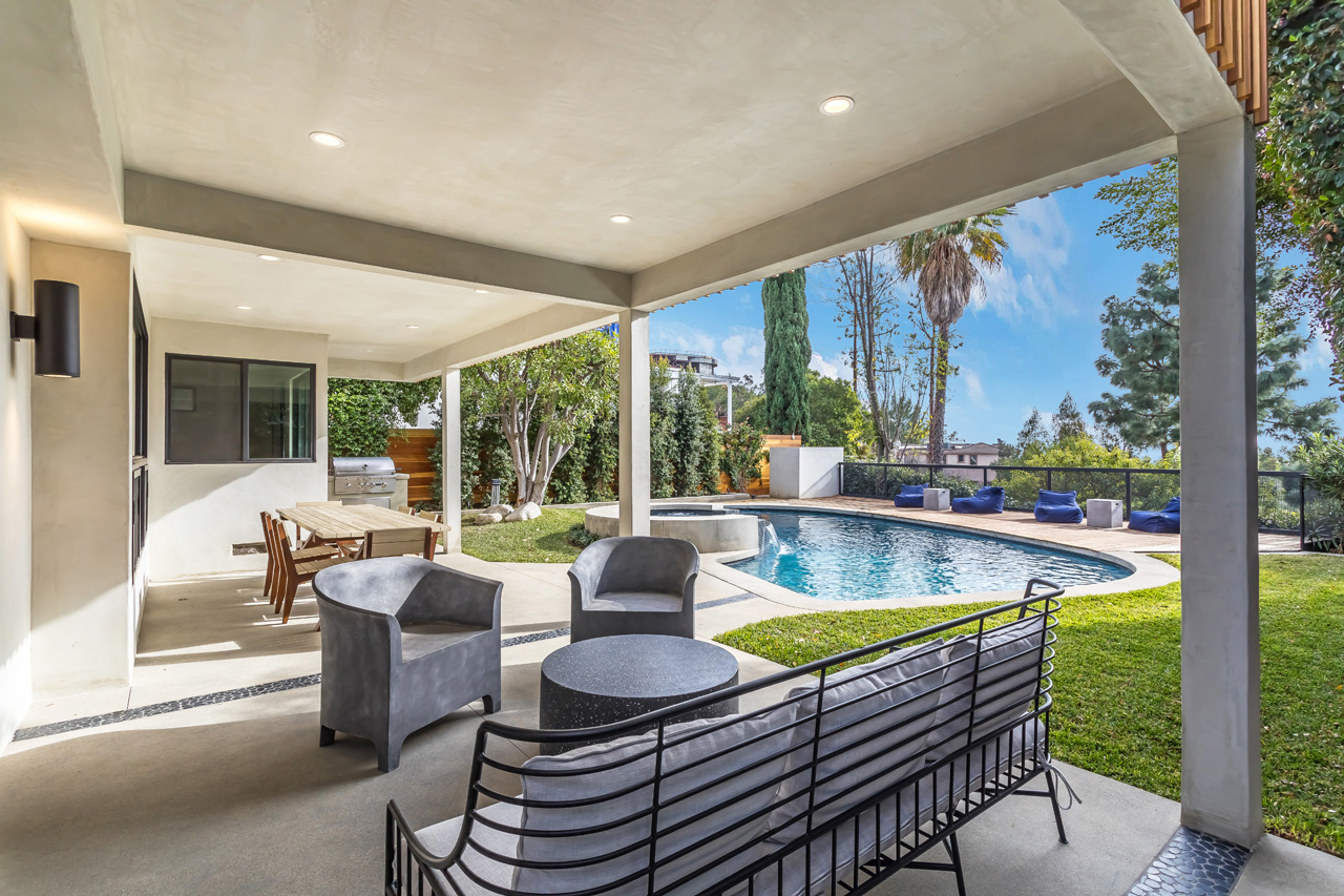 This stunning mid-century modern home on a quiet cul-de-sac just above the heart of Brentwood has been completely upgraded throughout with meticulous attention to design and detail, with every finish and texture selected for high-end form and function. Featuring four bedrooms and three baths, the open floor plan incorporates living and dining spaces with a chef's kitchen with custom backsplash tilework, Caesarstone Concrete Quartz countertops, and top-of-the-line Viking and Miele appliances, all adjacent to a sleek family room overlooking the pool and spa. The luxurious owner's suite occupies the entire second level, boasting jet-liner views, a well-appointed walk-in closet, and a spa-like bathroom with an over-sized shower, two shower heads, a bench, and a custom wrought-iron door. The seamless indoor-outdoor flow creates inviting spaces for entertaining, while expansive windows maximize sweeping City and Ocean views as well as lush, serene canyon vistas.