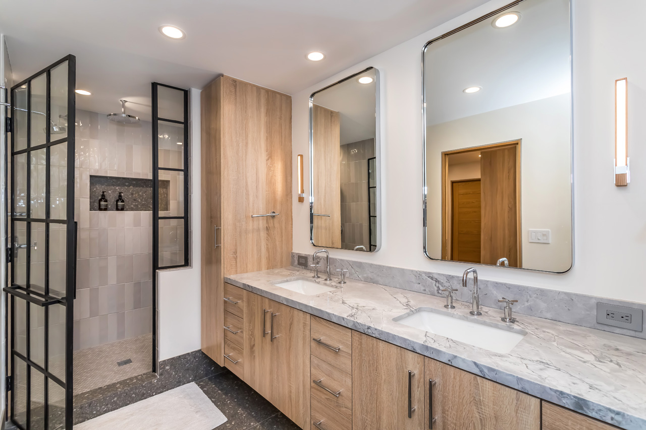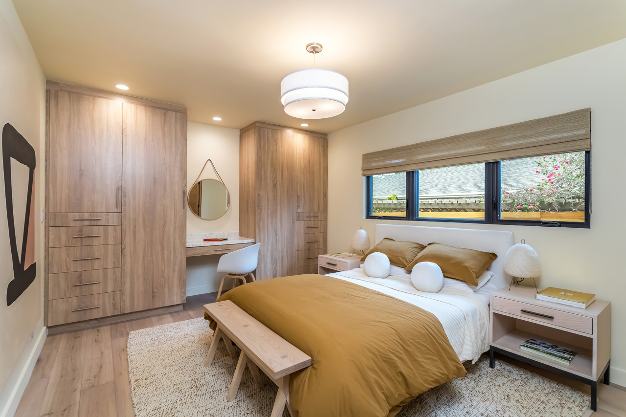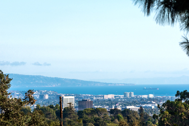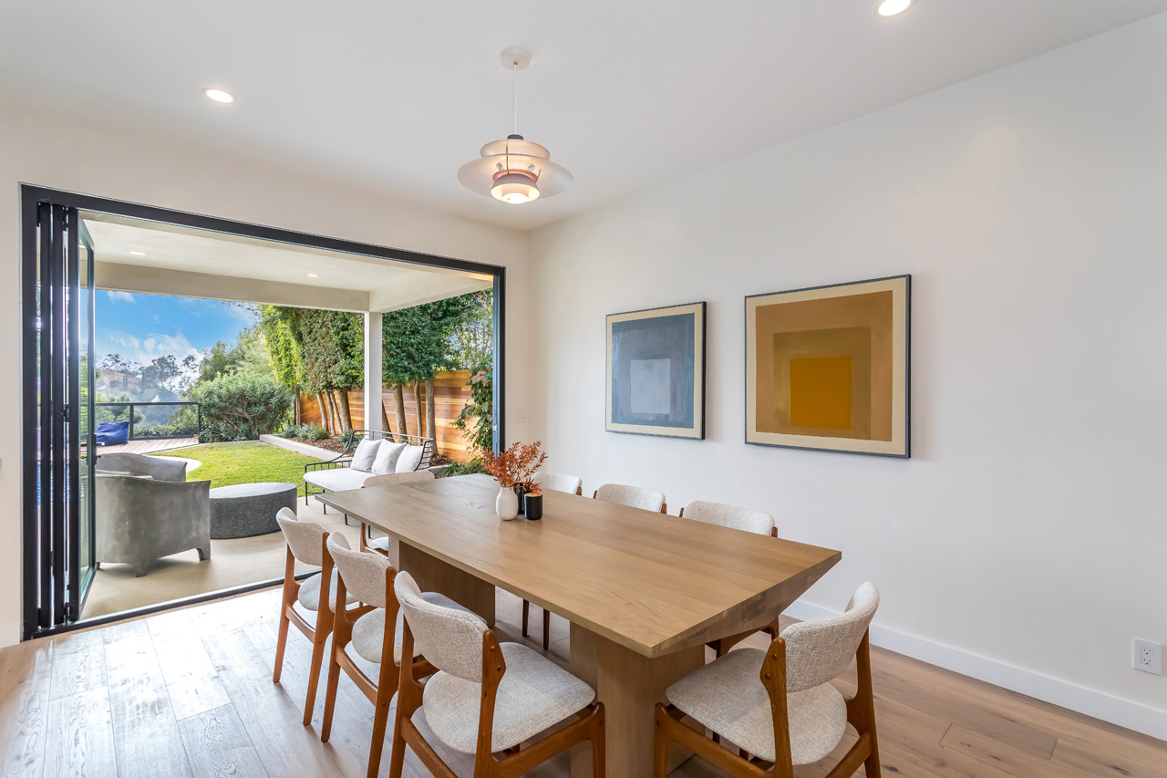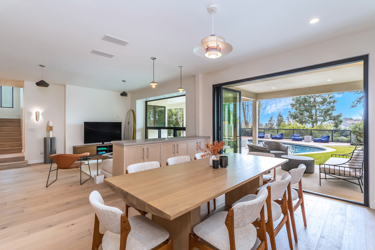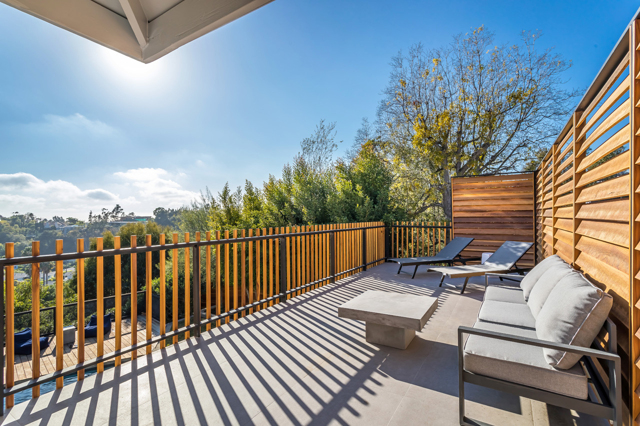 This stunning mid-century modern home on a quiet cul-de-sac just above the heart of Brentwood has been completely upgraded throughout with meticulous attention to design and detail, with every finish and texture selected for high-end form and function. Featuring four bedrooms and three baths, the open floor plan incorporates living and dining spaces with a chef's kitchen with custom backsplash tilework, Caesarstone Concrete Quartz countertops, and top-of-the-line Viking and Miele appliances, all adjacent to a sleek family room overlooking the pool and spa. The luxurious owner's suite occupies the entire second level, boasting jet-liner views, a well-appointed walk-in closet, and a spa-like bathroom with an over-sized shower, two shower heads, a bench, and a custom wrought-iron door. The seamless indoor-outdoor flow creates inviting spaces for entertaining, while expansive windows maximize sweeping City and Ocean views as well as lush, serene canyon vistas.
