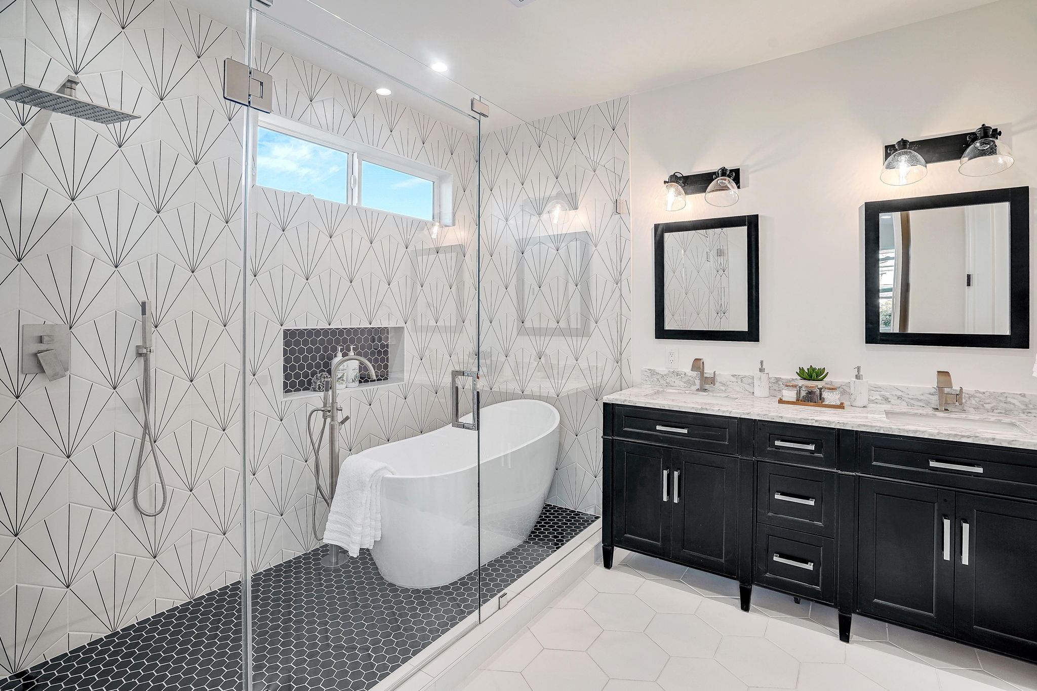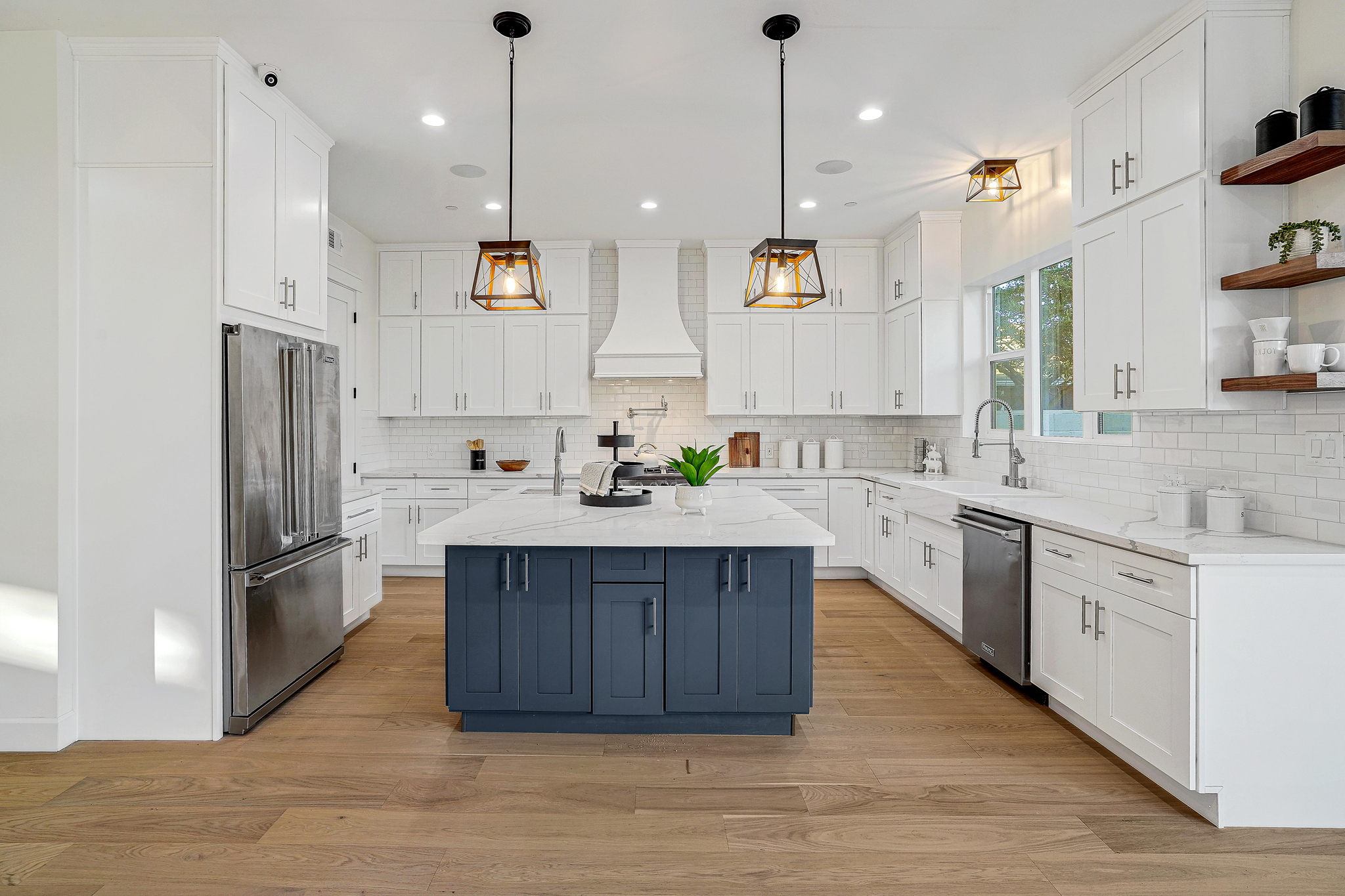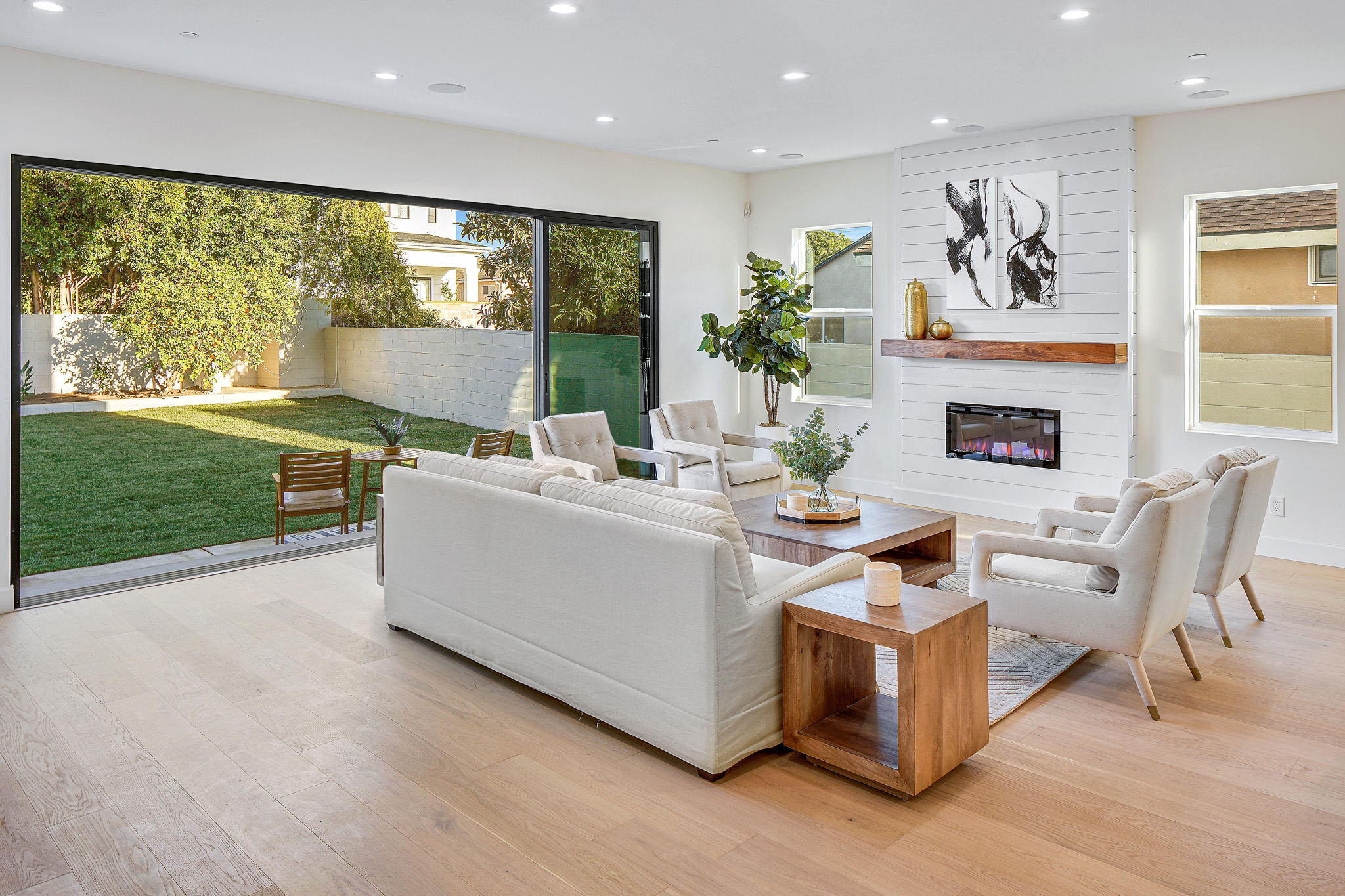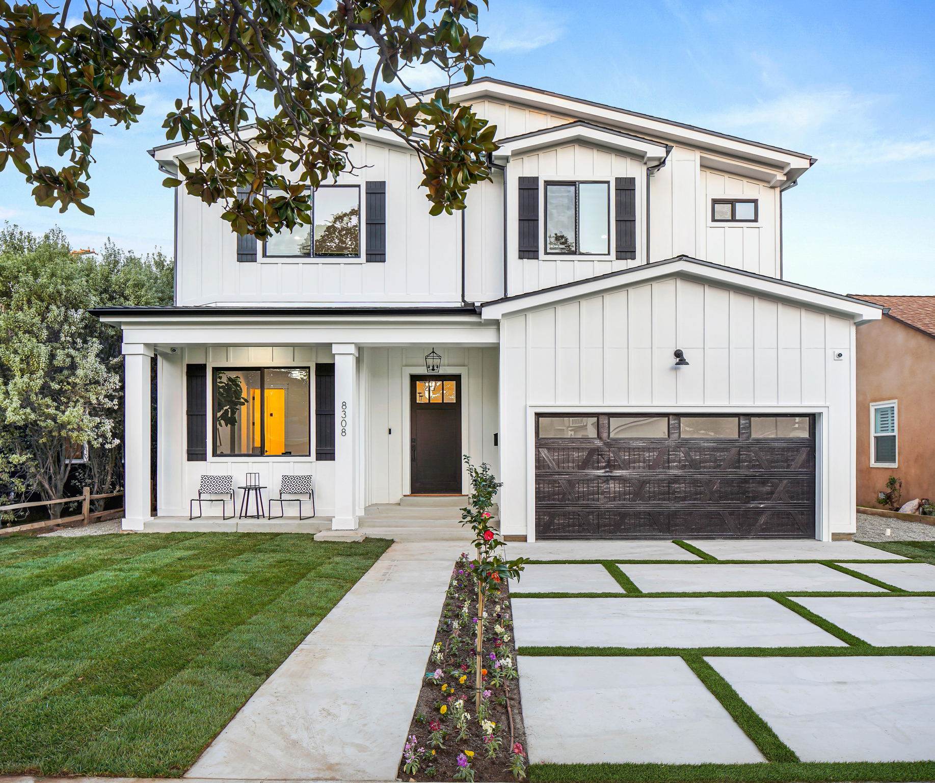 A stunning brand-new contemporary farmhouse nestled on one of the best tree-lined streets in Kentwood area of Westchester. With no expenses spared, this gorgeous 5 bed and 4.5 bath home boasts top-of-the line amenities for modern-day living while maintaining charm and warmth throughout. Enter to an open floor-plan with high ceilings, wide-plank European White Oak hardwood flooring, and large wall to wall sliding glass stacking doors that open to the spacious, grassy yard. The living room features a beautiful shiplap cladded electric fireplace with floating Walnut mantle, and a separate dry bar with double wide wine fridge off the dining room. A gorgeous chef's kitchen is replete with Viking appliances, an oversized island with Quartz countertops, prep sink with built-in cutting board, wall-mounted pot filler and custom hood for all your family gatherings. Upstairs is the spacious owner's suite with private patio, his/her walk-in closets, double vanity sinks with marble countertops, and a spa-like freestanding soaker tub in the shower room. Smart home systems include keyless entry, Control4 lighting, surround sound system, security cameras, and video doorbell. 2-car garage with electric car plug.