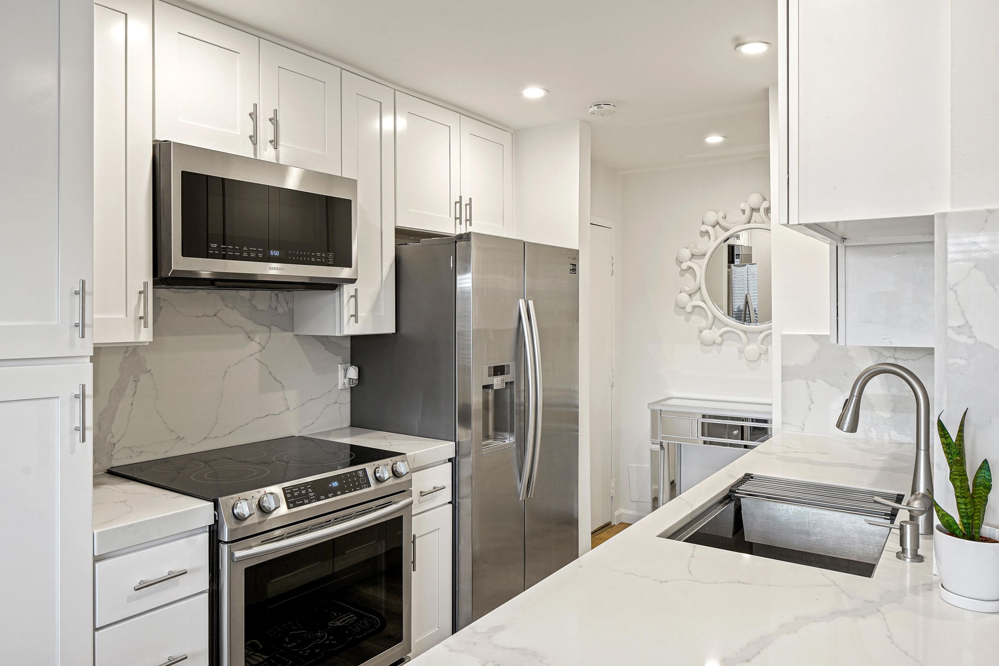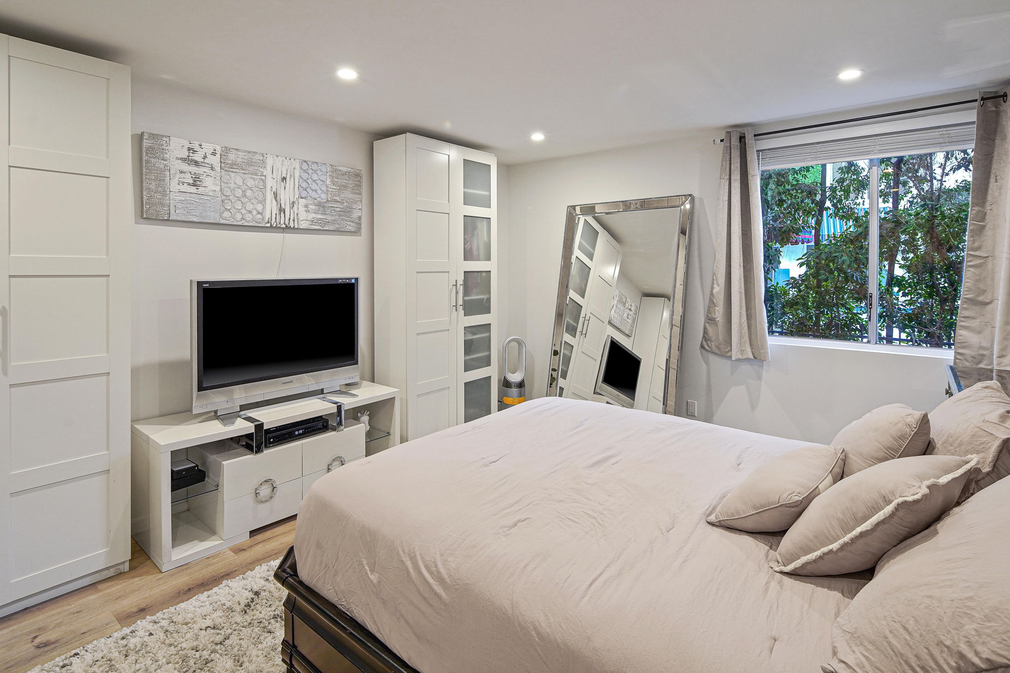 One-of-a-kind corner unit in West Hollywood's most desirable location. Situated on a beautiful tree-lined street, a short distance from dining, shopping, and nightlife on Santa Monica Boulevard. The unit features a modern kitchen with stunning quartz countertops, recessed lighting, and the latest appliances. The spacious living area enjoys a cozy fireplace flanked by two versatile nooks - perfect for a bar and a home office - and a private balcony shaded by mature greenery. The owner's suite boasts a walk-in closet and gorgeous en-suite bathroom with a beautiful vanity mirror. The gated underground parking spot is easily accessible from the unit. Building amenities include a pool and dry sauna. HOA fees include earthquake insurance, and rules permit hardwood floor installation and a washer-dryer in unit.