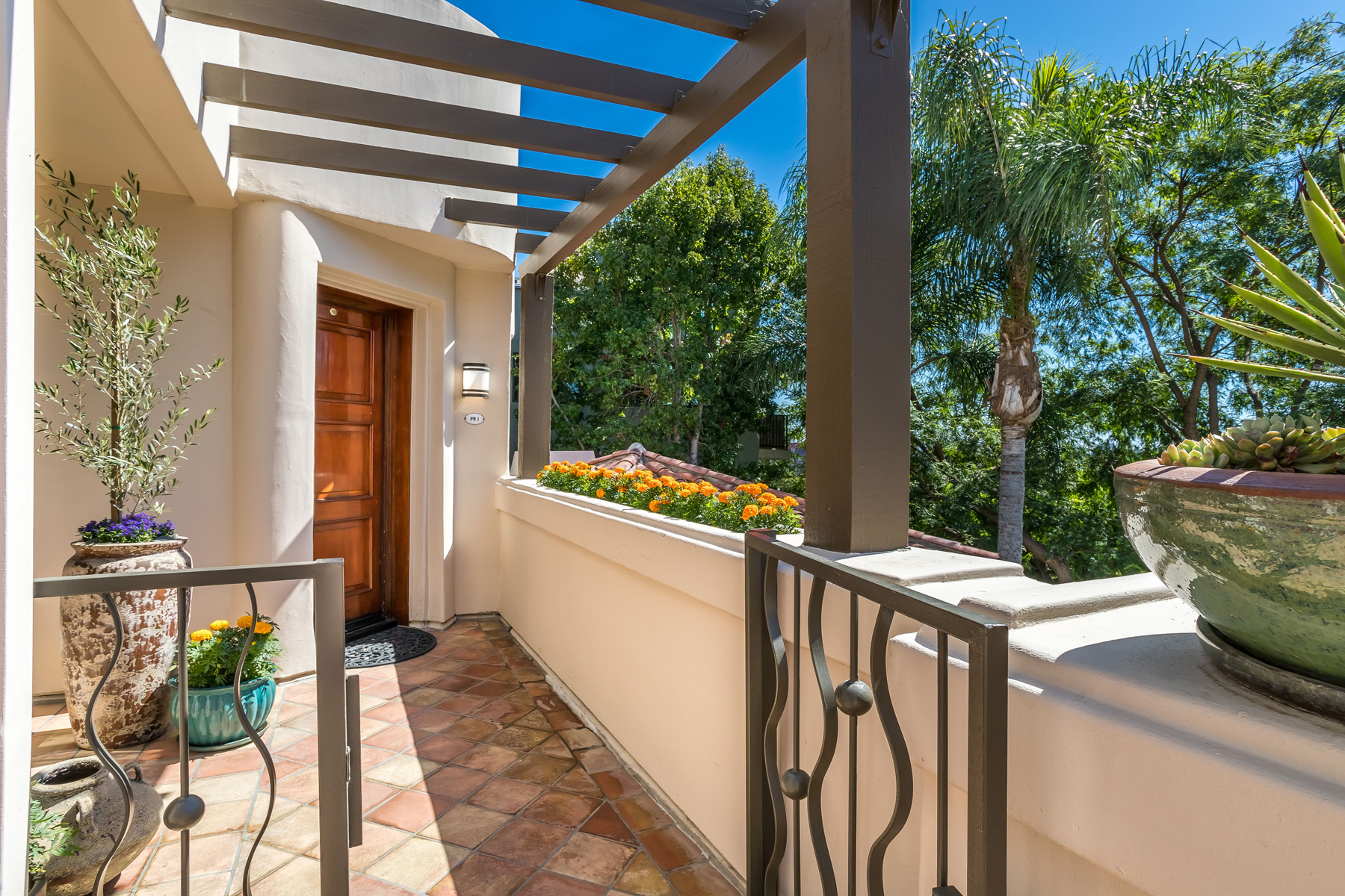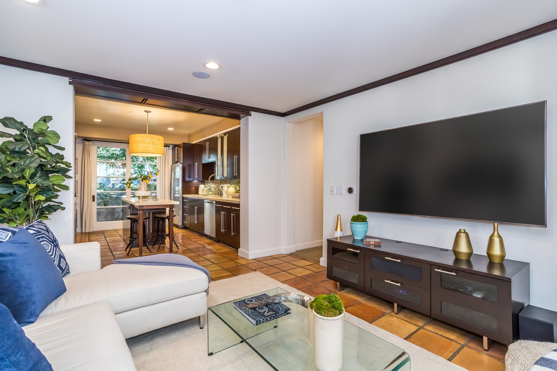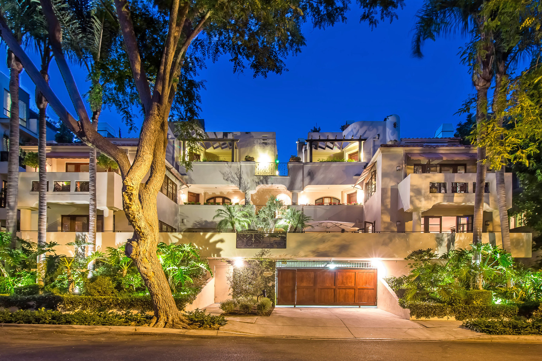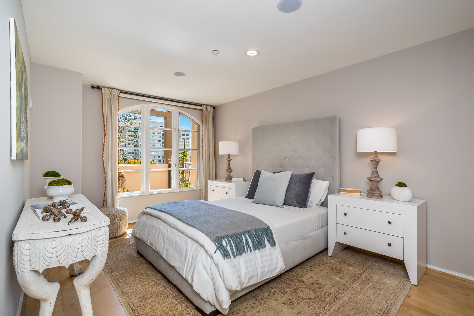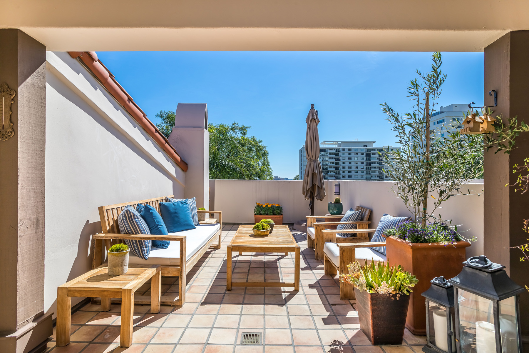 Inside one of the most sought-after condo developments in WeHo awaits this rare offering of the absolutely exquisite Penthouse. Accented by elegant Montecito-style designer finishes, this sophisticated townhouse is light, bright, and ultra-spacious, with privacy to match. This 2-story Penthouse boasts 2 bedrooms, 3 baths, and a formal living room with high vaulted ceilings that fill the space with natural light - all this giving this property a single-family feel. The open den off the cook's kitchen provides the perfect flow for entertaining and the second en-suite bedroom on the main level is ideal for overnight visitors. The stunning primary suite features solid white oak flooring, walk-in closet, and a resort-style bathroom with Carrara marble shower, double vanity sinks, and a spa-like bathtub. From the primary suite, French doors open to a large private rooftop patio with South facing views. Side-by-side parking and dedicated storage room at the garage level, with only 12 homes in the development. Villa Cynthia is a classic Old Hollywood-style building with a fountain courtyard and pristine landscaping - a truly spectacular find in one of LA's most desirable neighborhoods.