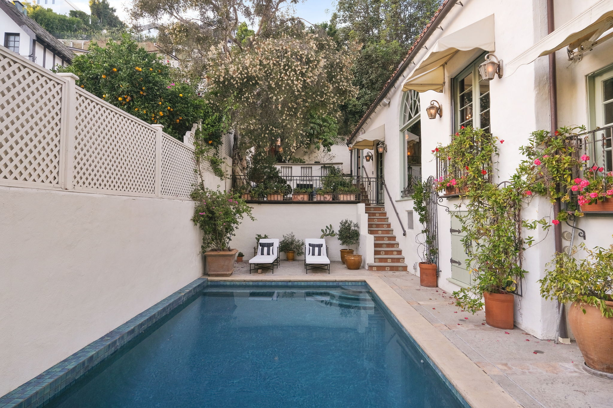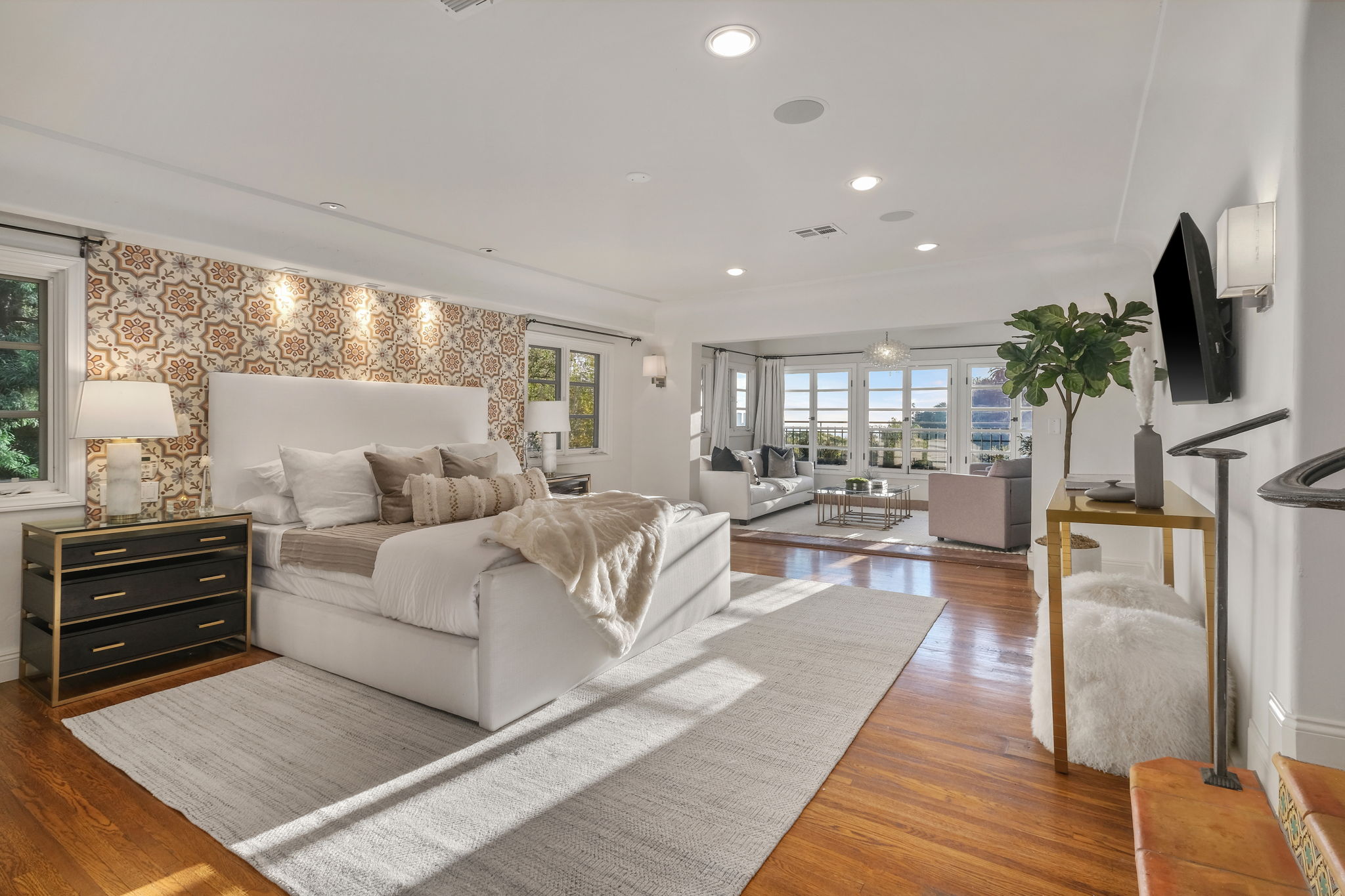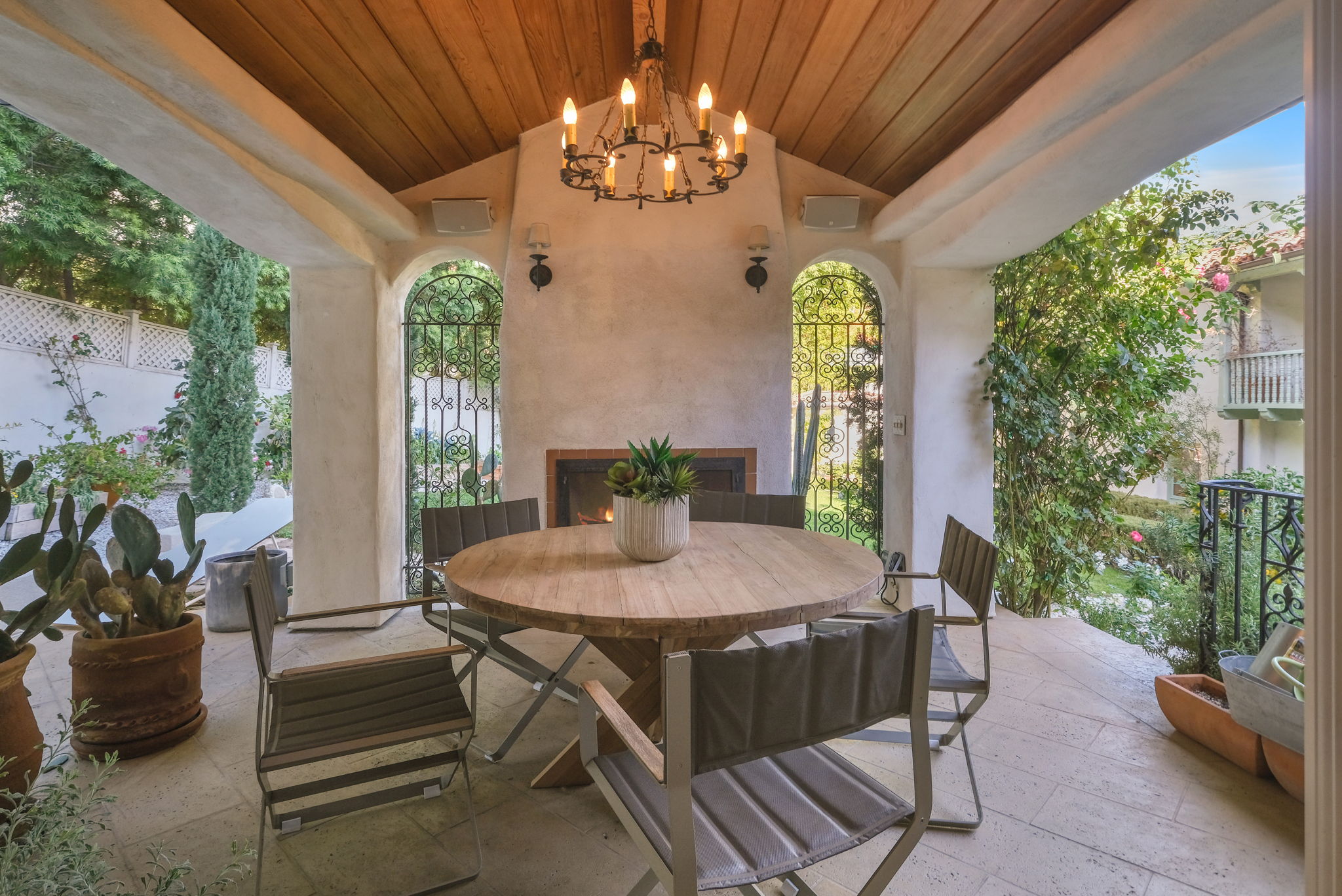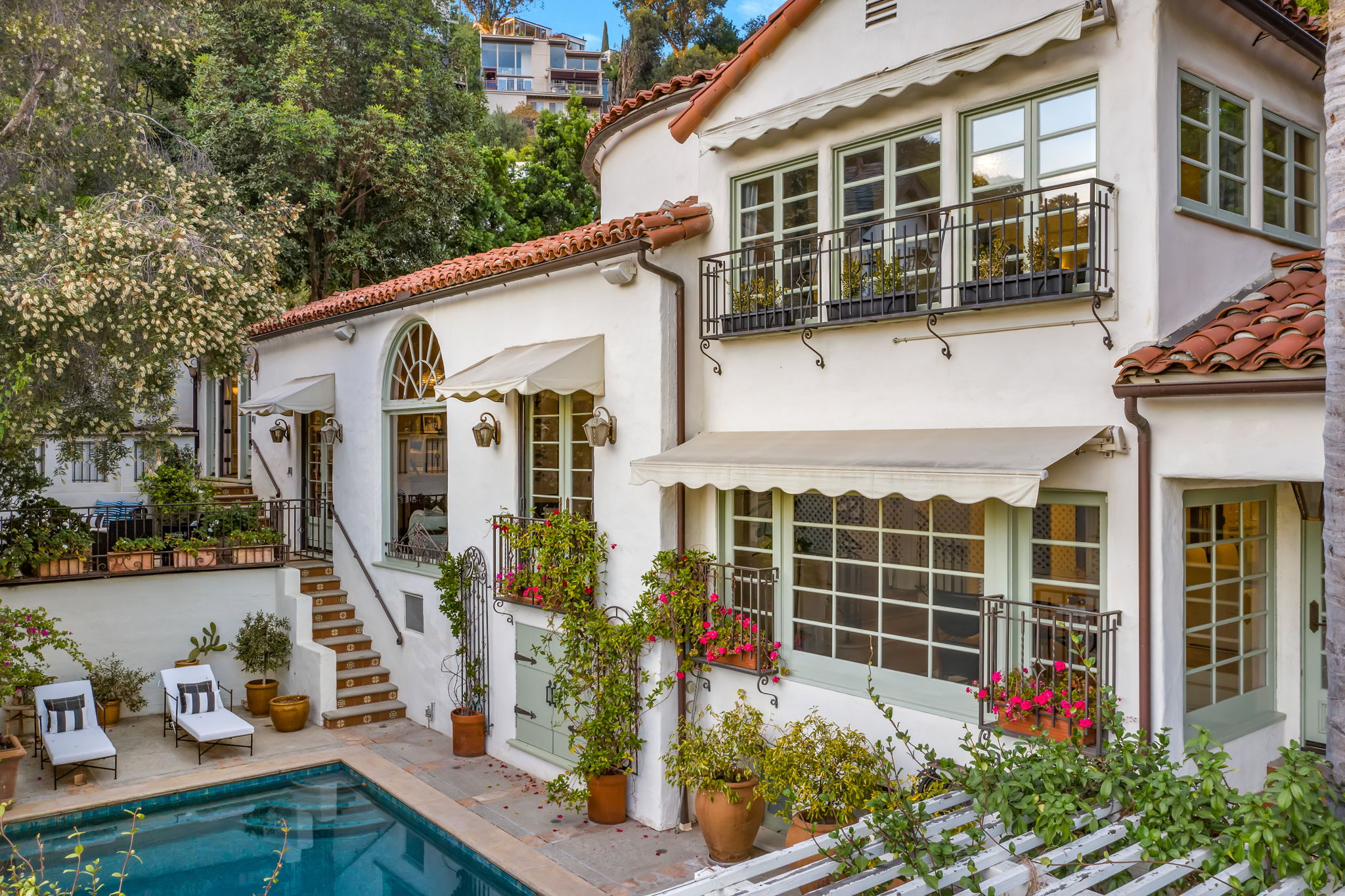 This Spanish Revival estate, known as Casa de Seis Palmas, has a storied Hollywood past and offers utmost seclusion and privacy behind lush landscaping. This luxurious celebrity hideaway has been home to actress Marion Davis, record mogul Ahmet Ertegun, and supermodel Tyra Banks. The home boasts an abundance of light and beautiful details like travertine stone and wood-planked floors throughout. The spacious living room is framed by a majestic vaulted wood-beamed ceiling, French doors, and grand floor-to-ceiling windows. A chef's kitchen comes replete with custom cabinetry, large center island, and top-of-the-line stainless steel appliances. The grand owner's suite features a sitting room, enchanting city views, and walk-in closets with gorgeous Spanish tile. An entertainer's paradise, the patio opens to a full outdoor kitchen, casita, fire pit, and pool. A library, sunroom, formal dining room, guest suite/media room with private entrance and full bath complete this one-of-a-kind home.