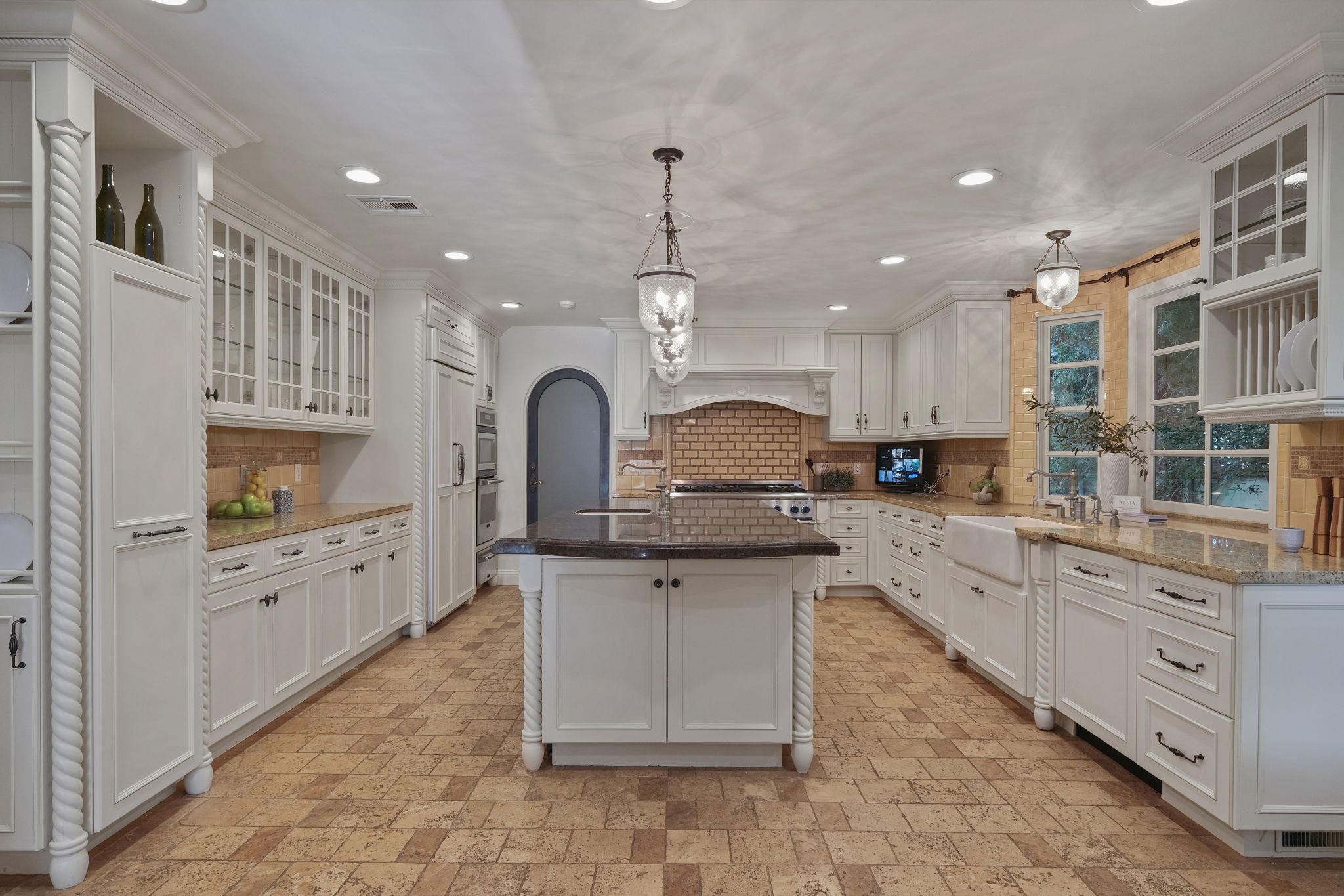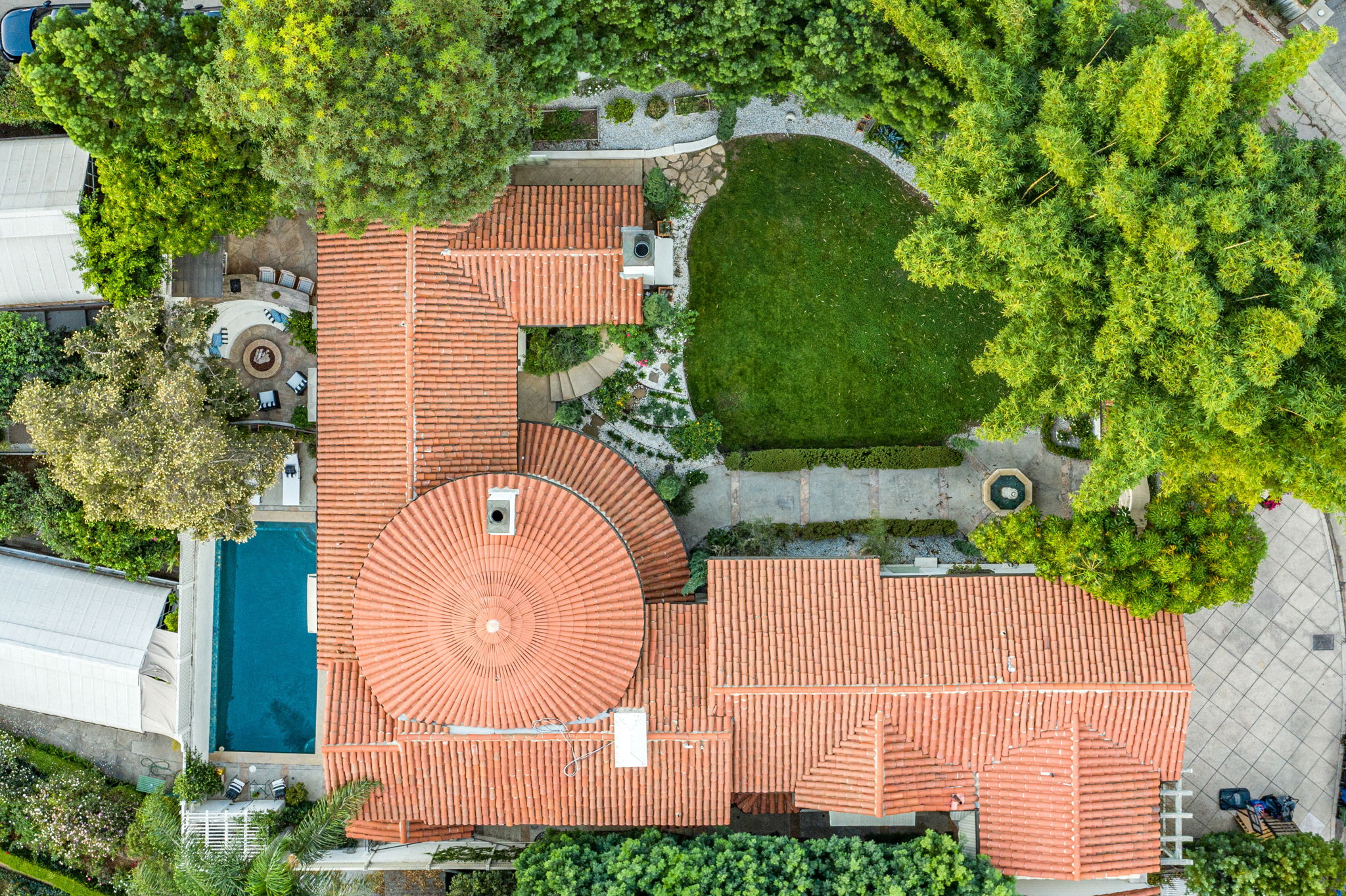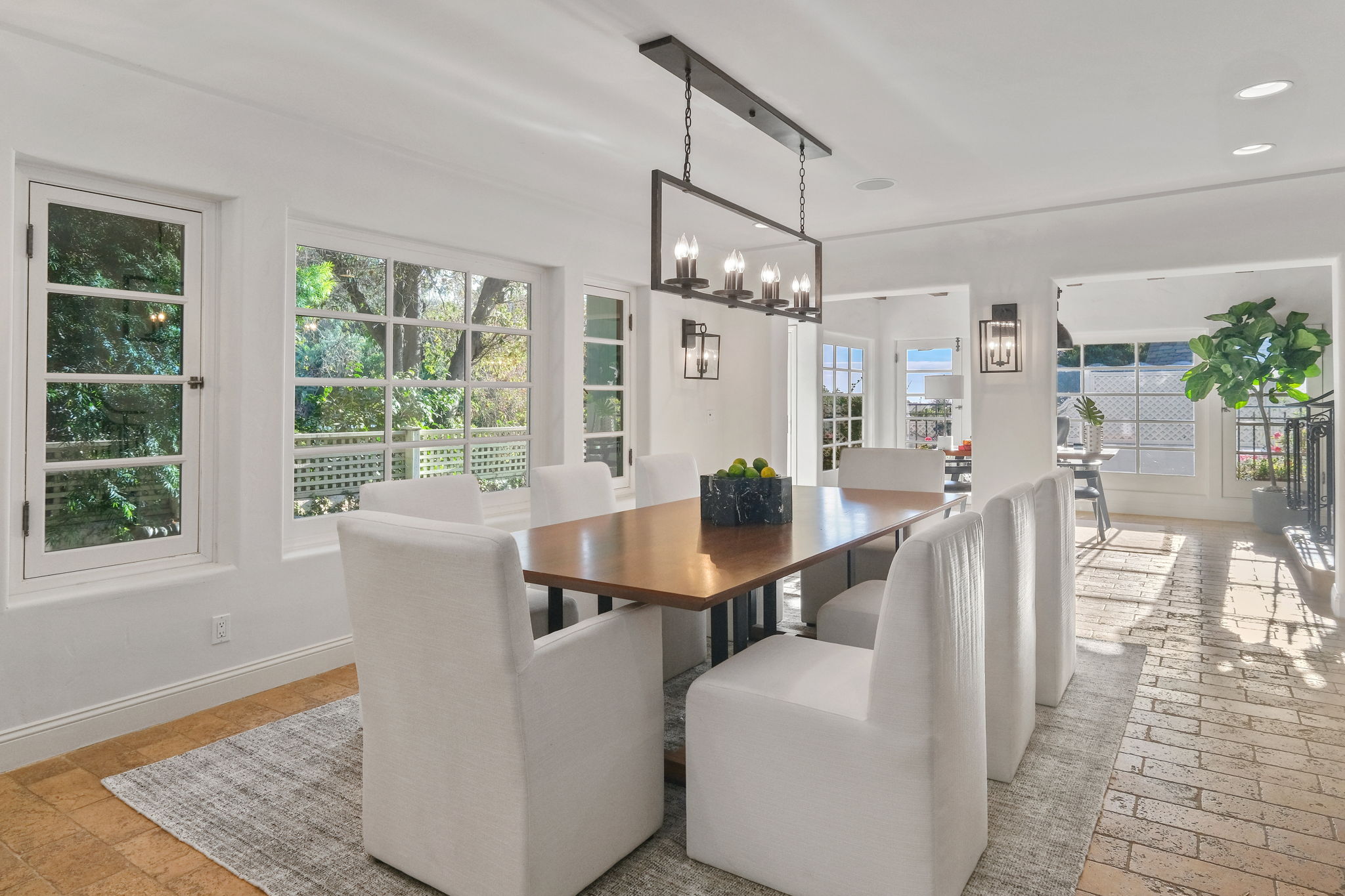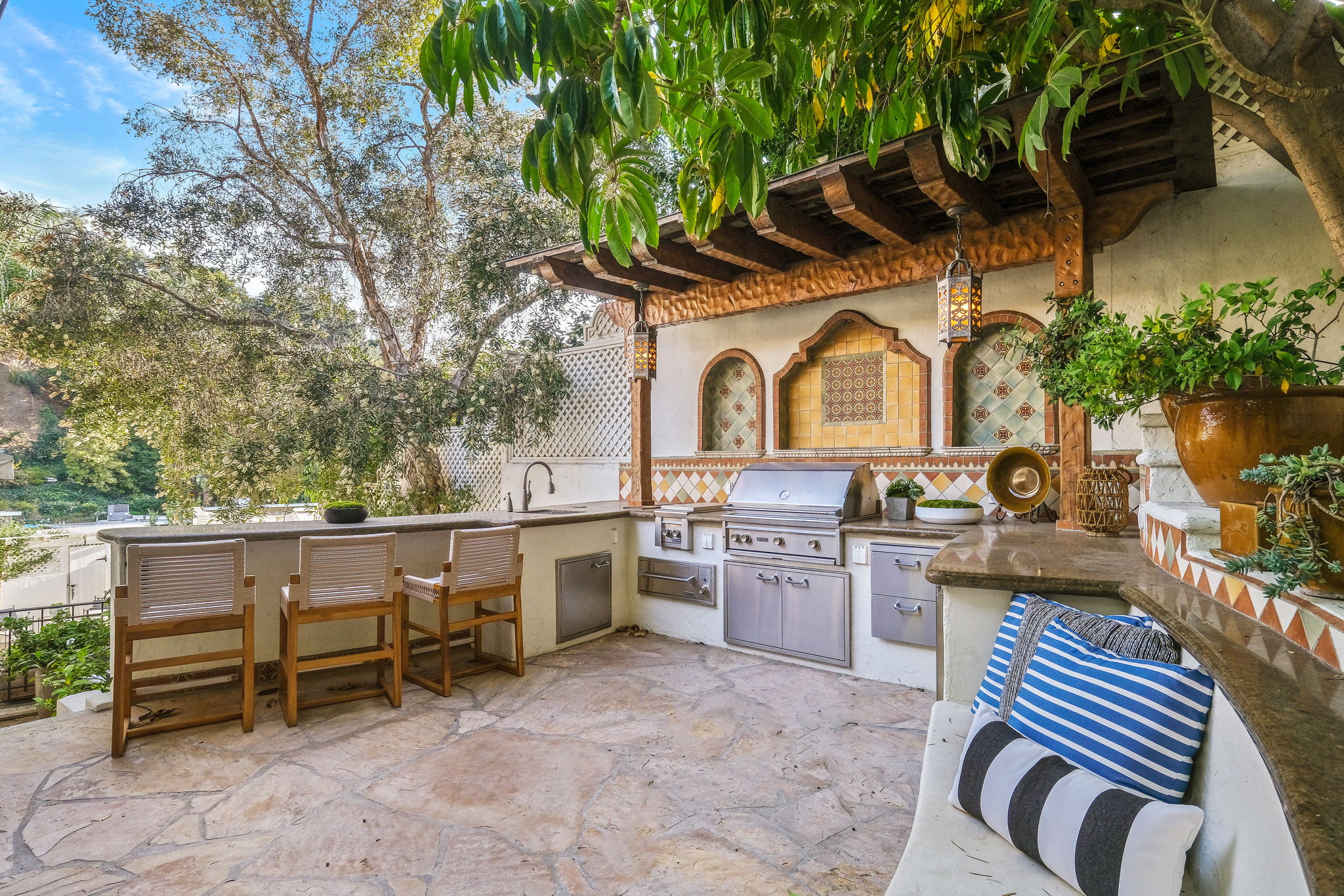 This Spanish Revival estate, known as Casa de Seis Palmas, has a storied Hollywood past and offers utmost seclusion and privacy behind lush landscaping. This luxurious celebrity hideaway has been home to actress Marion Davis, record mogul Ahmet Ertegun, and supermodel Tyra Banks. The home boasts an abundance of light and beautiful details like travertine stone and wood-planked floors throughout. The spacious living room is framed by a majestic vaulted wood-beamed ceiling, French doors, and grand floor-to-ceiling windows. A chef's kitchen comes replete with custom cabinetry, large center island, and top-of-the-line stainless steel appliances. The grand owner's suite features a sitting room, enchanting city views, and walk-in closets with gorgeous Spanish tile. An entertainer's paradise, the patio opens to a full outdoor kitchen, casita, fire pit, and pool. A library, sunroom, formal dining room, guest suite/media room with private entrance and full bath complete this one-of-a-kind home.